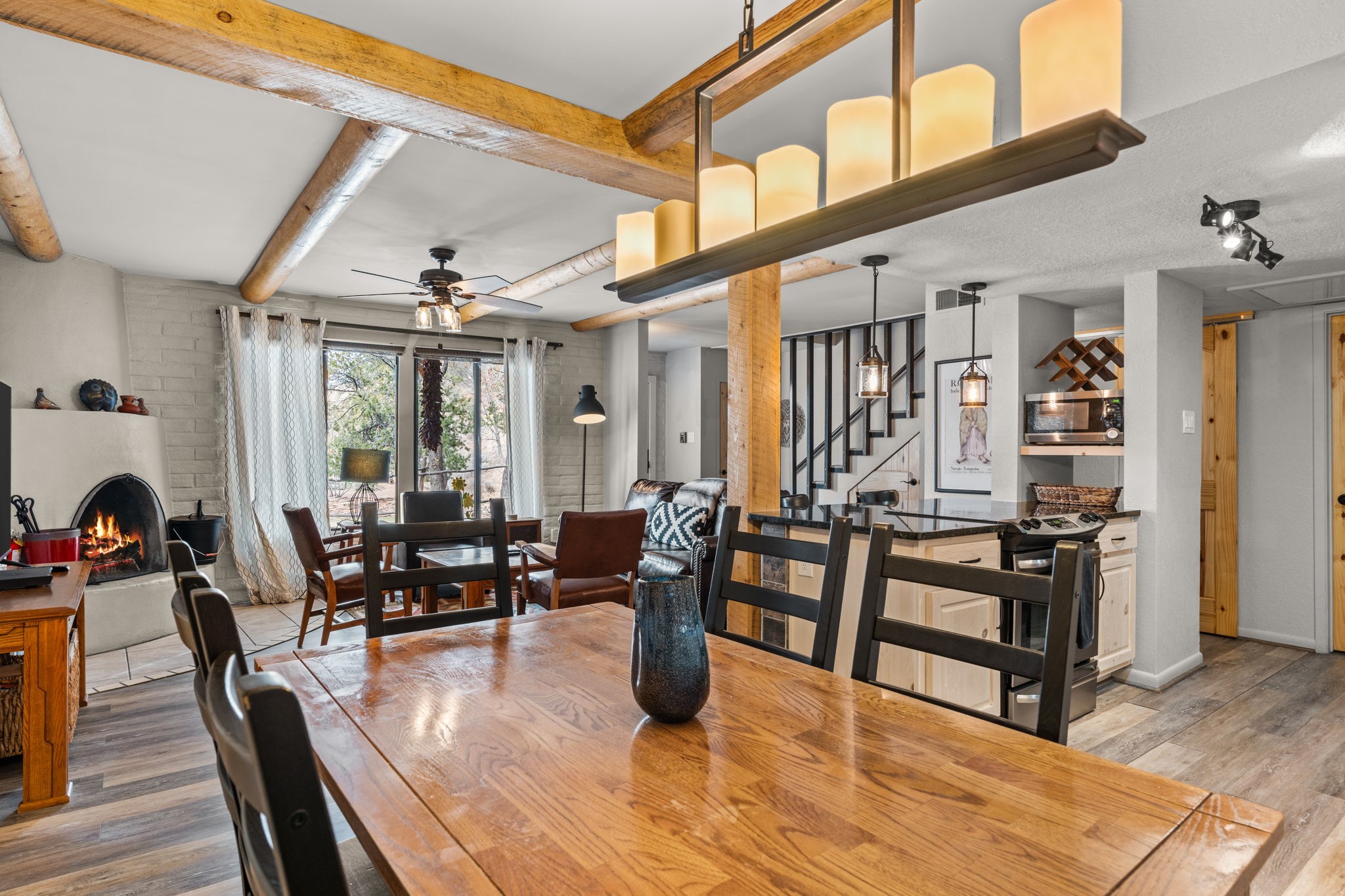 Just minutes from the Historic Santa Fe Plaza, this beautifully maintained 2-bedroom, 2-bath Fort Marcy condo offers the perfect blend of comfort, convenience, and investment potential. The residence features a contemporary feel with an updated kitchen and bathrooms, abundant natural light from extra windows, and wonderful views of the grassy gazebo in a forest-like setting where deer are often seen. Access is simple, with parking close by and just a couple steps to the front door. A cozy kiva fireplace adds authentic Santa Fe charm. This turn-key property is being sold fully furnished--including appliances, housewares, electronics, linens, and dcor--making it move-in ready for a full-time residence, part-time retreat, or short-term rental. The condo is already enrolled in the onsite, nightly rental program, and the existing VRBO and Airbnb listings and future reservations can transfer to the buyer if desired, making it an effortless investment opportunity. Recent community updates include a brand-new 20-year roof and HVAC system adding confidence for years to come. Fort Marcy amenities include an indoor pool, hot tub, clubhouse, landscaped grounds, and on-site management. HOA dues cover exterior building and roof maintenance, water/sewer/refuse, cable, internet, snow removal, and groundskeeping. This property checks all the boxes: location, views, convenience, updates, and income potential. Don't miss this exceptional opportunity to own one of the best units at Fort Marcy!