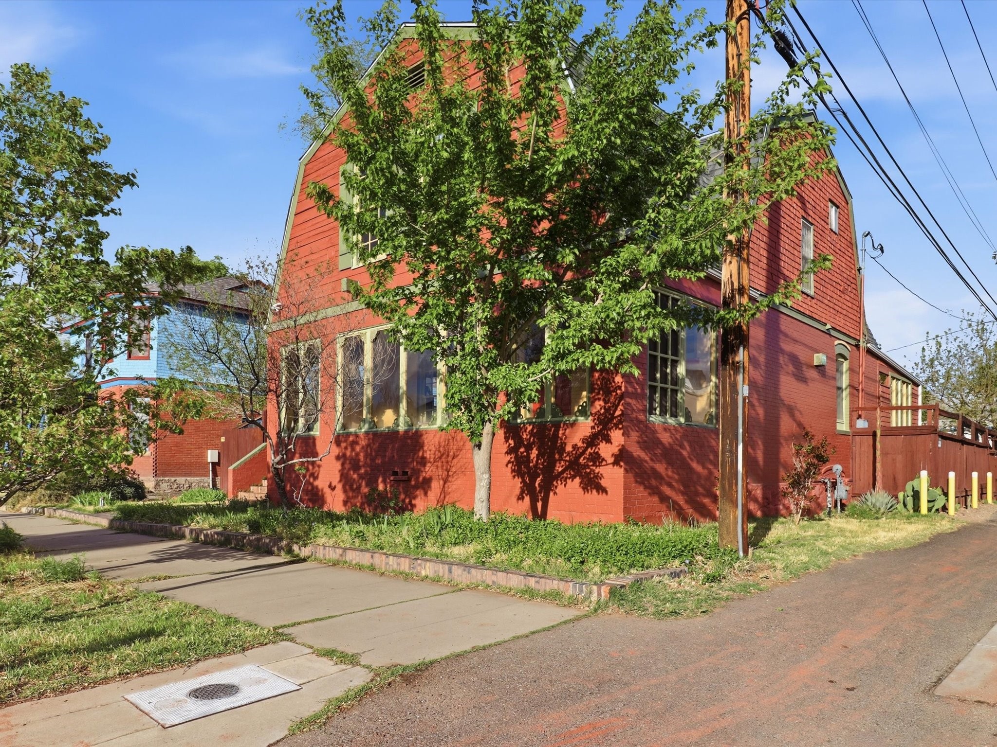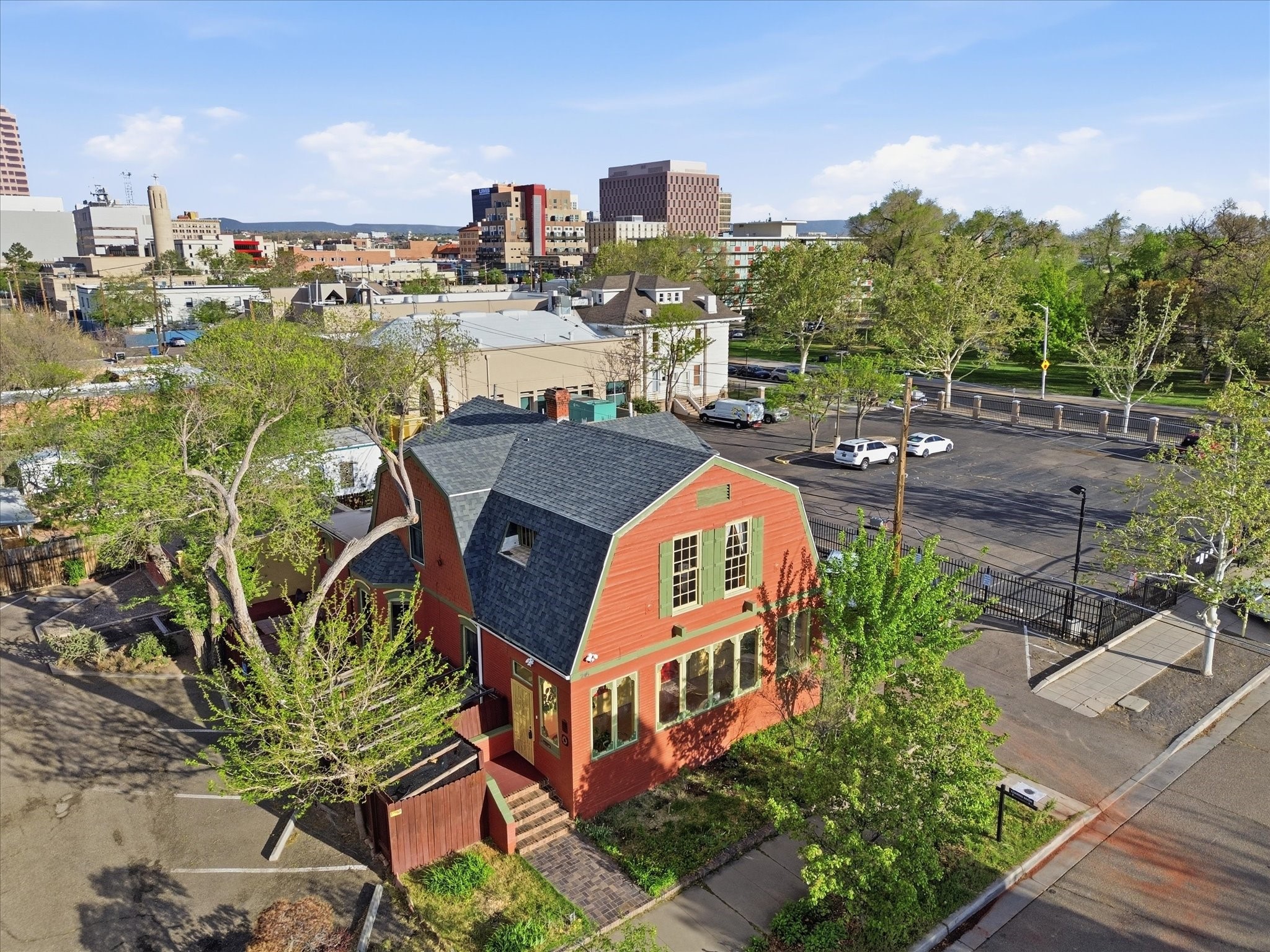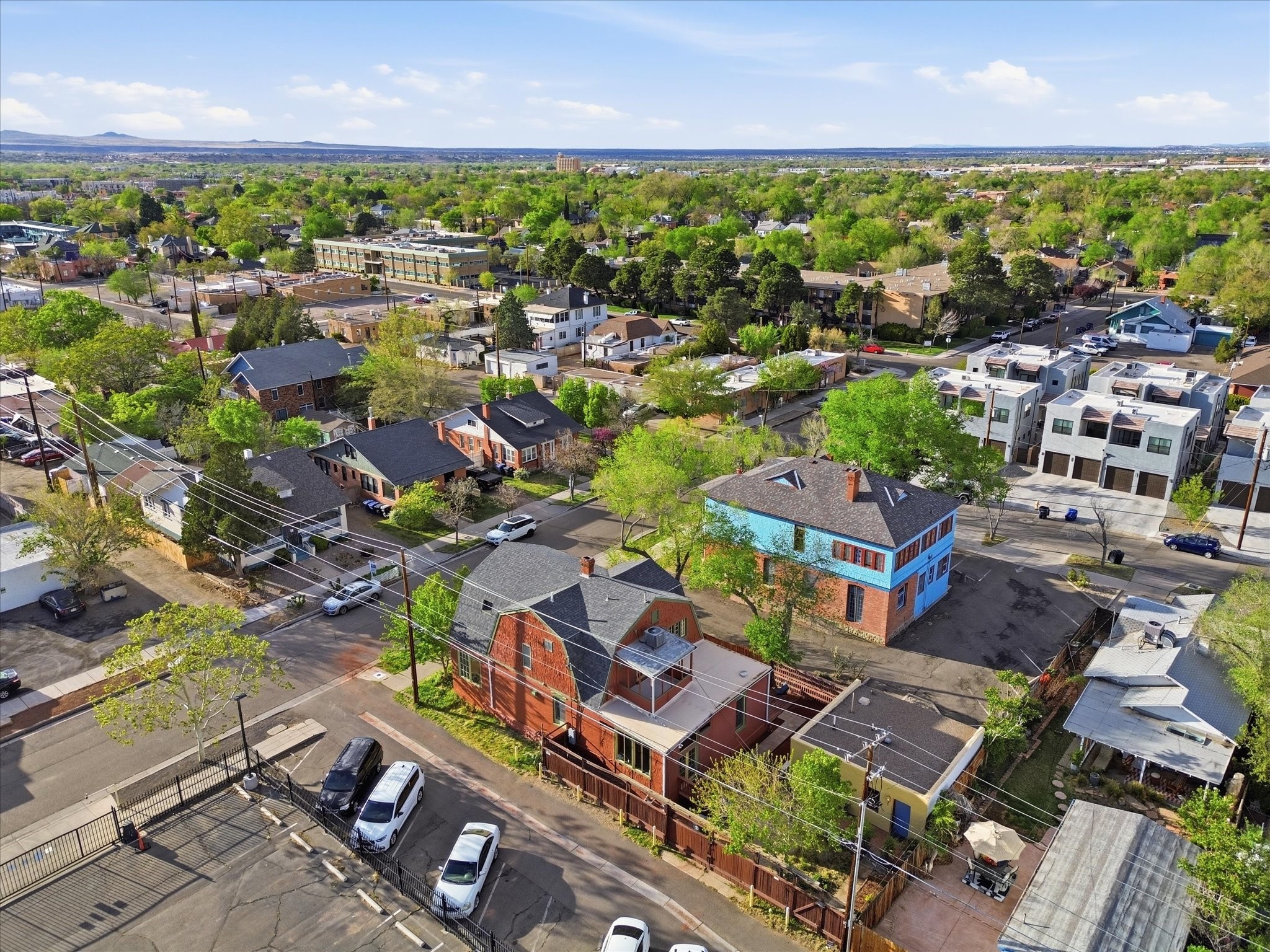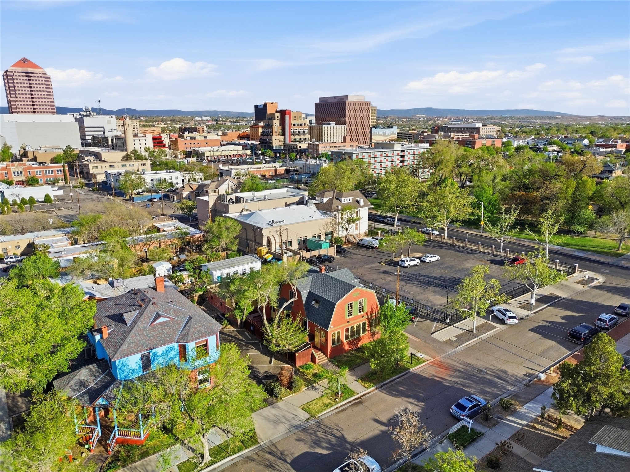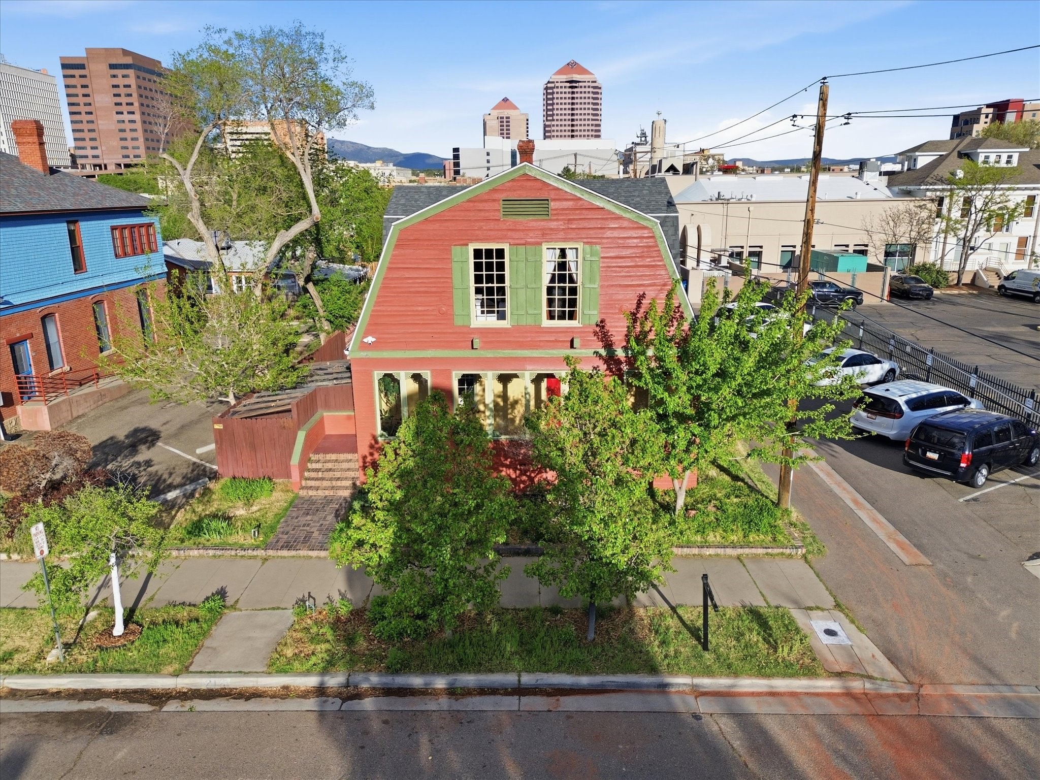 Step into Albuquerque history with the iconic J.E. Saint House, a rare 1907 Dutch Colonial Revival residence in the heart of Downtown. This architecturally significant home features brick construction, river rock foundation, distinctive gambrel rooflines, and rich character. Thoughtfully updated with modern heating and cooling, the property blends historic charm with everyday comfort. Kitchen includes Viking stovetop and range with bain-marie, bar sink and new dishwasher. Two enclosed porches and upstairs covered patio provide options to enjoy the home during different times of the day. A separate heated and cooled carriage house with kitchenette and bath offers exceptional flexibility- ideal for guest space, studio, or income potential. Natural wildflowers and flowering trees line home.10 ft ceilings and oak flooring in the main house. Finished bedroom, bathroom and laundry in basement are not included in sq ft. Balcony overlooks Downtown. Bedrooms are spacious with original hard wood floors, large closets with two full baths. 574 sq ft Guest house (not included in sq ft) has a tin ceiling, full bath, pellet stove and exposed brick interior and concrete floors. Zoned residential or commercial. The earliest resident of the home, JE Saint, was the first mayor of Albuquerque after it incorporated as a city. Home is included in the National Register of Historic Places (NRHP), and the New Mexico, Historical Society of New Mexico series lists