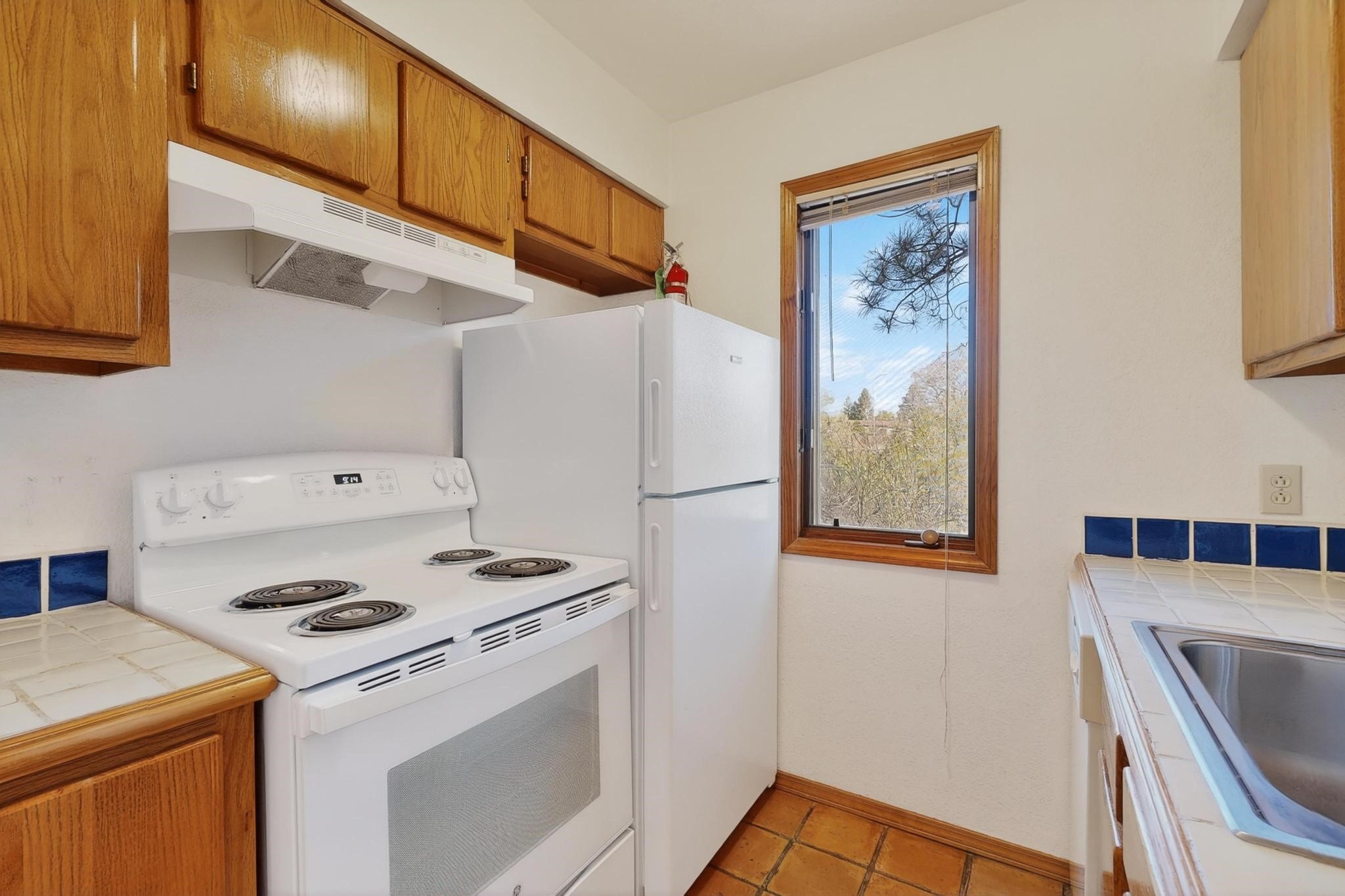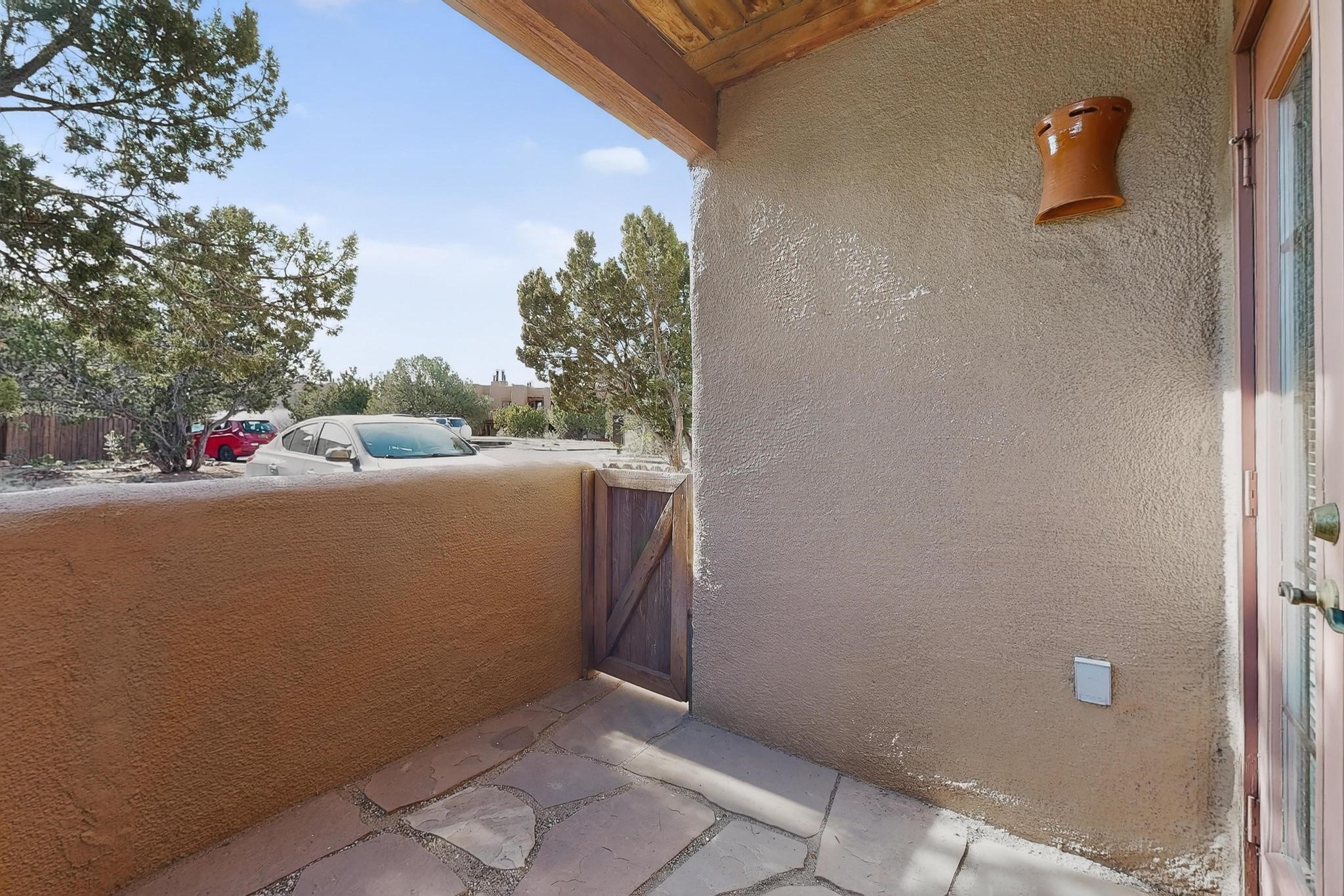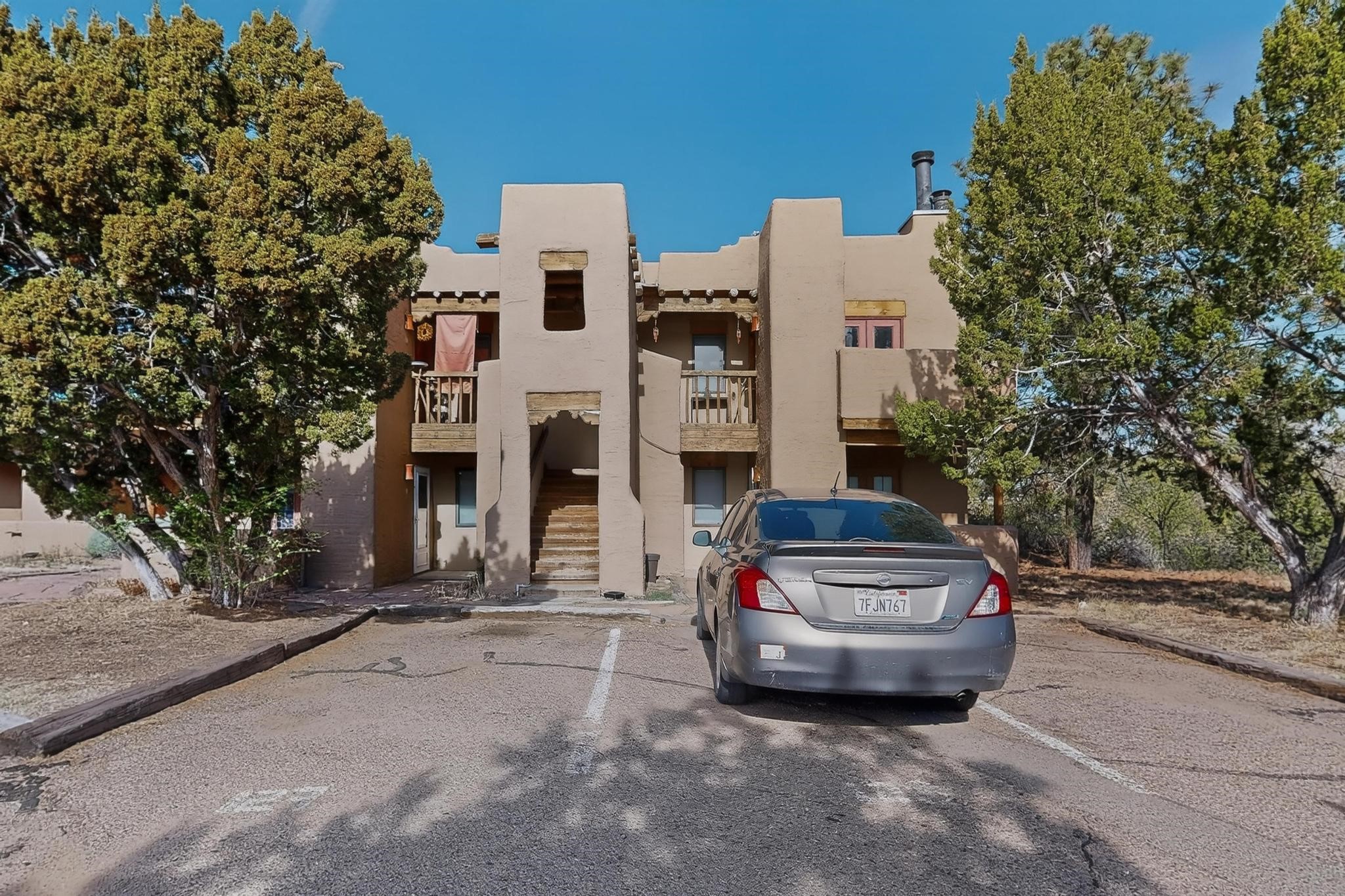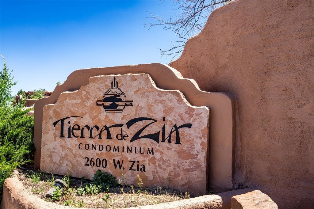 Tierra de Zia ground-floor condo. The living room with a Kiva fireplace leads you into the dining area and a galley kitchen. The bedroom is en-suite with, bathroom, tub/shower. Designated parking spot. Tierra De Zia is a gated community on 13.5 acres of native trees, plants, arroyos, fish ponds, and wooden bridges along walking trails. Seasonal swimming pool with sauna, clubhouse, outdoor grills, and a laundry facility, all in a park-like setting. Beautiful grounds with ponds, fountains and walking trails through a natural setting. On-site management. Convenient to so many amenities, restaurants, shopping, and schools.