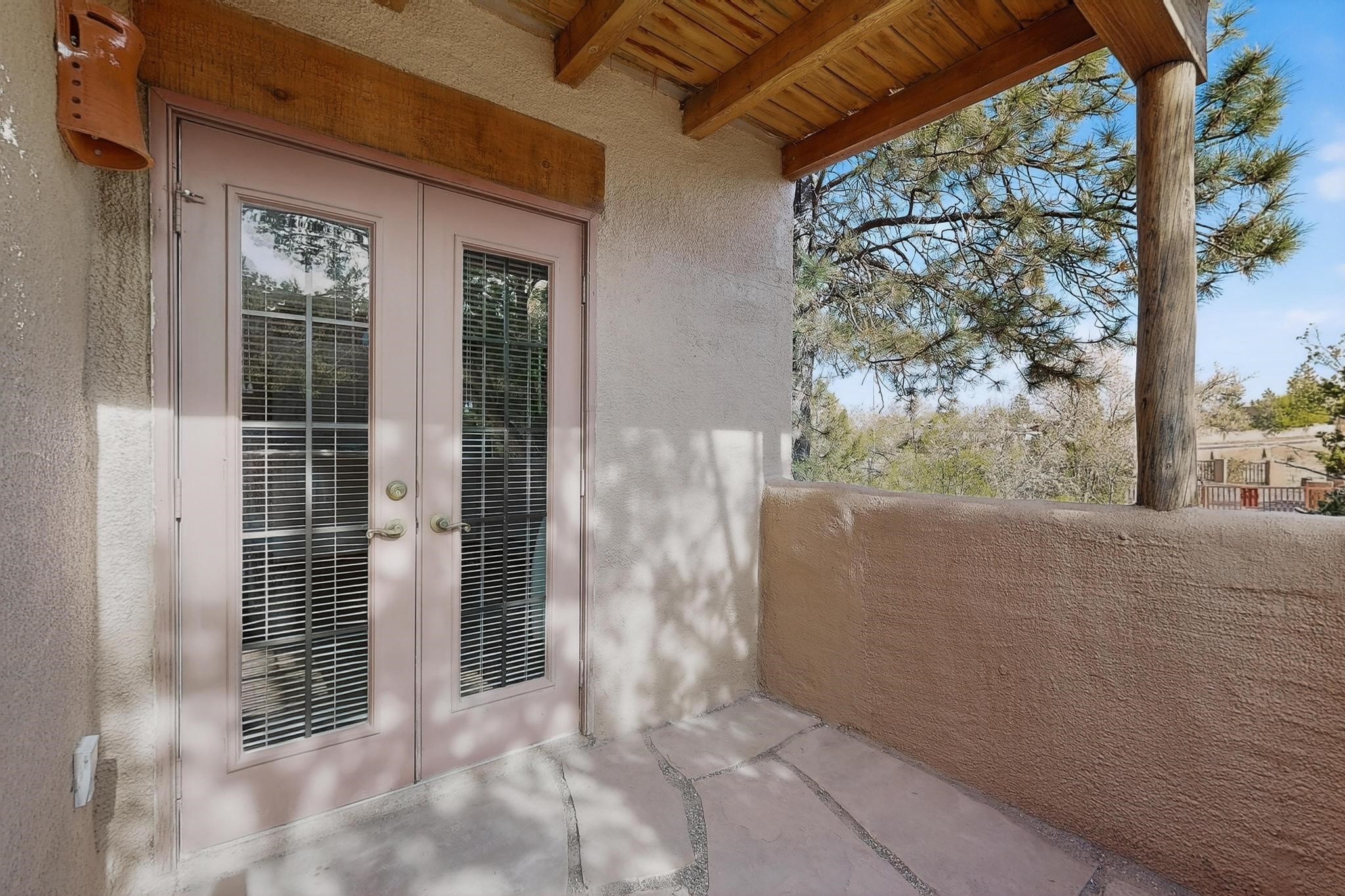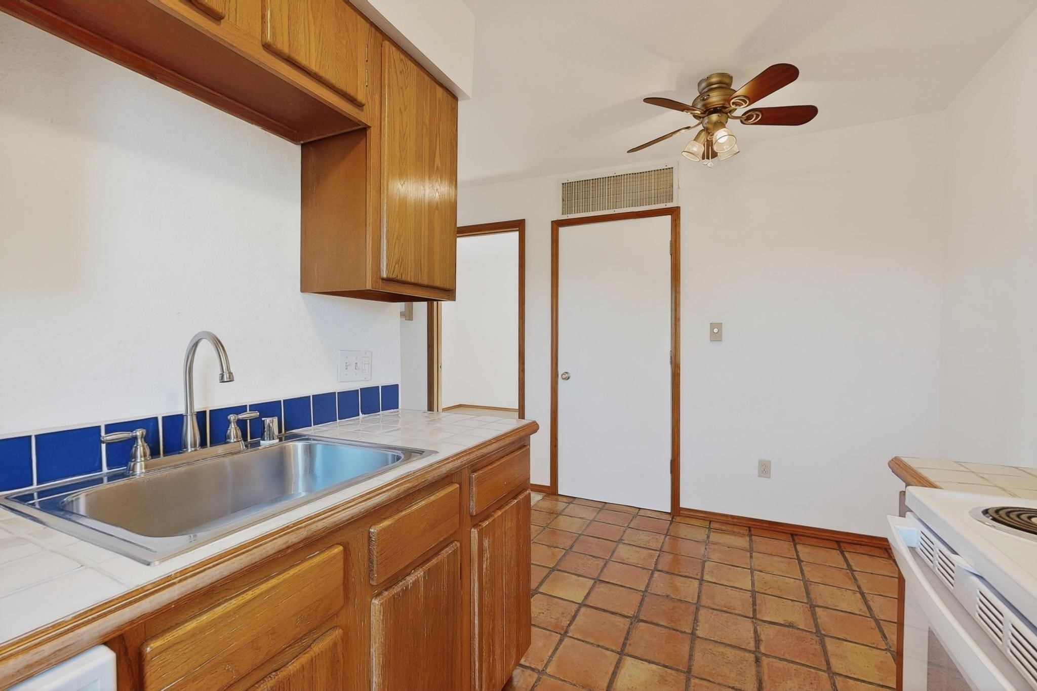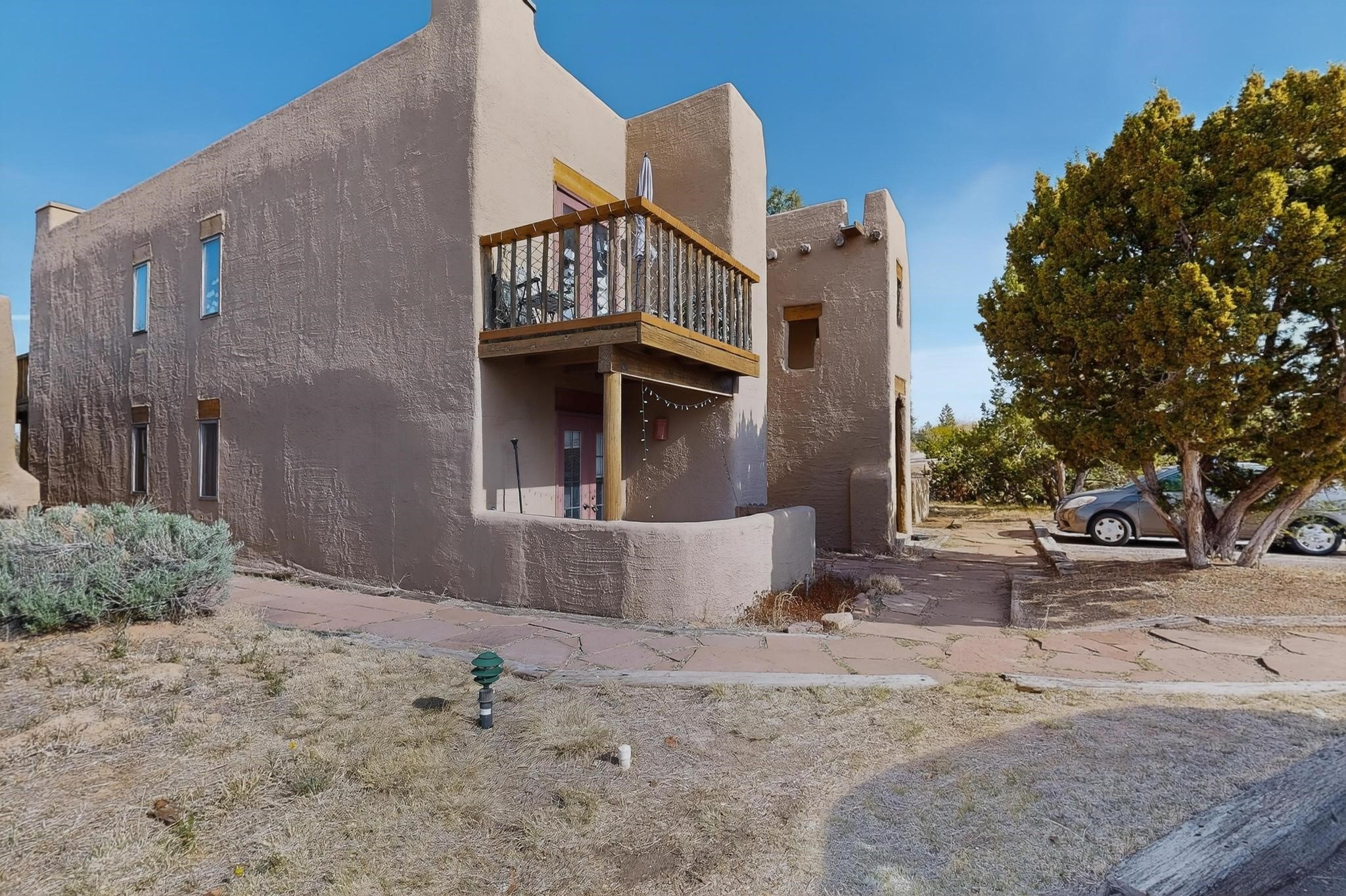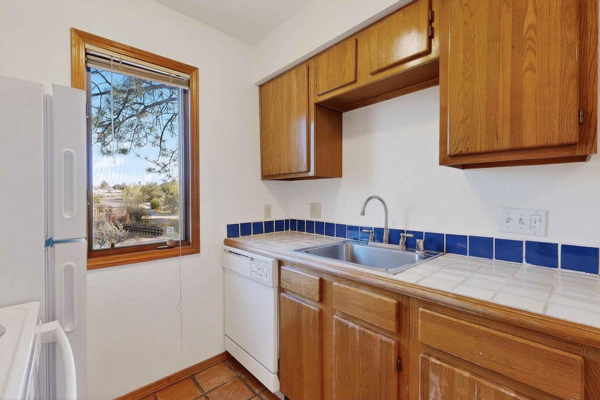 Tierra de Zia ground-floor condo. The living room with a Kiva fireplace leads you into the dining area and a galley kitchen. The bedroom is en-suite with, bathroom, tub/shower. Designated parking spot. Tierra De Zia is a gated community on 13.5 acres of native trees, plants, arroyos, fish ponds, and wooden bridges along walking trails. Seasonal swimming pool with sauna, clubhouse, outdoor grills, and a laundry facility, all in a park-like setting. Beautiful grounds with ponds, fountains and walking trails through a natural setting. On-site management. Convenient to so many amenities, restaurants, shopping, and schools.