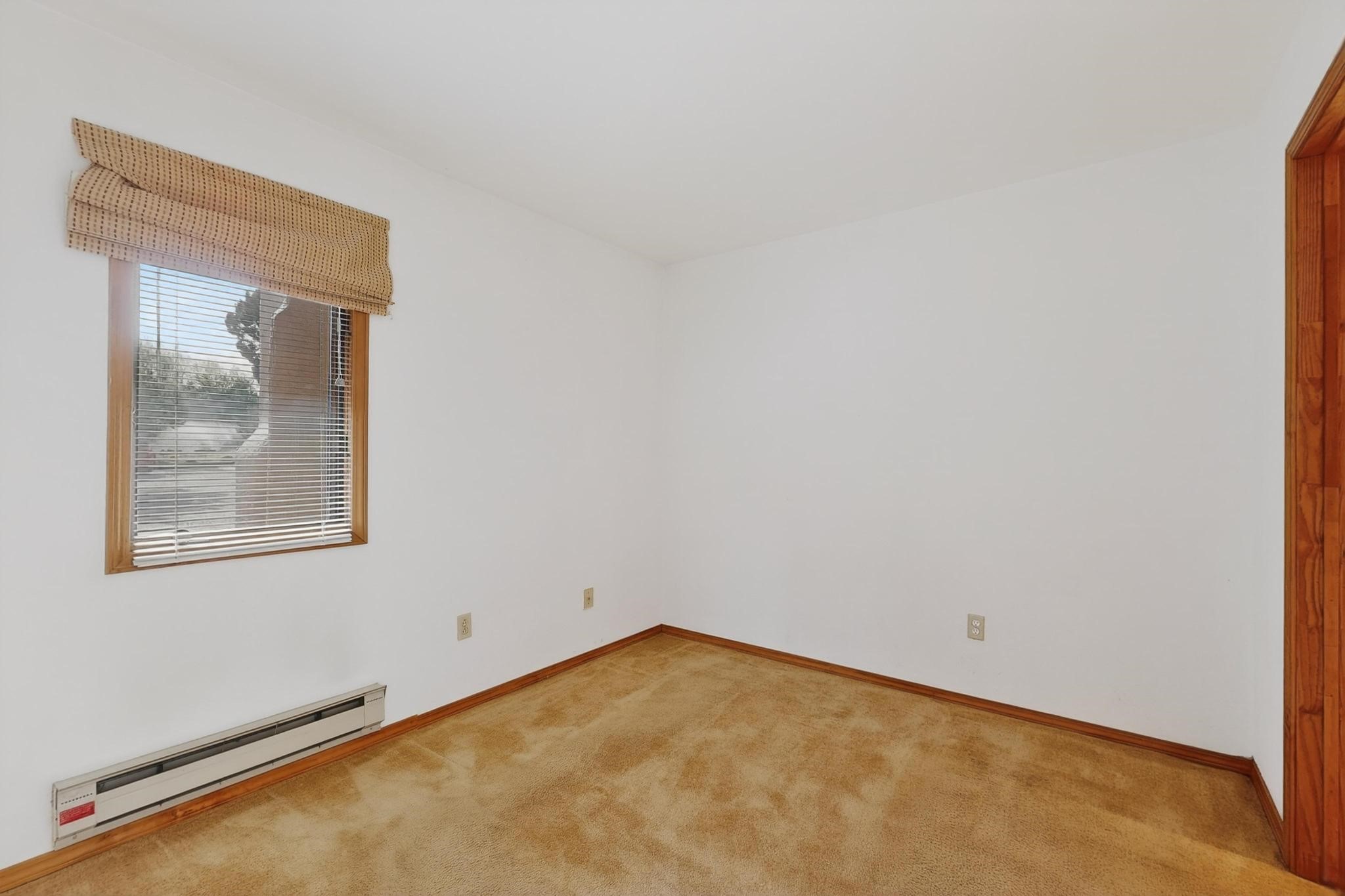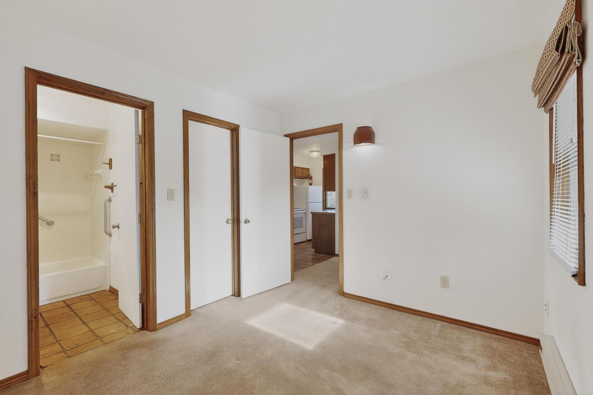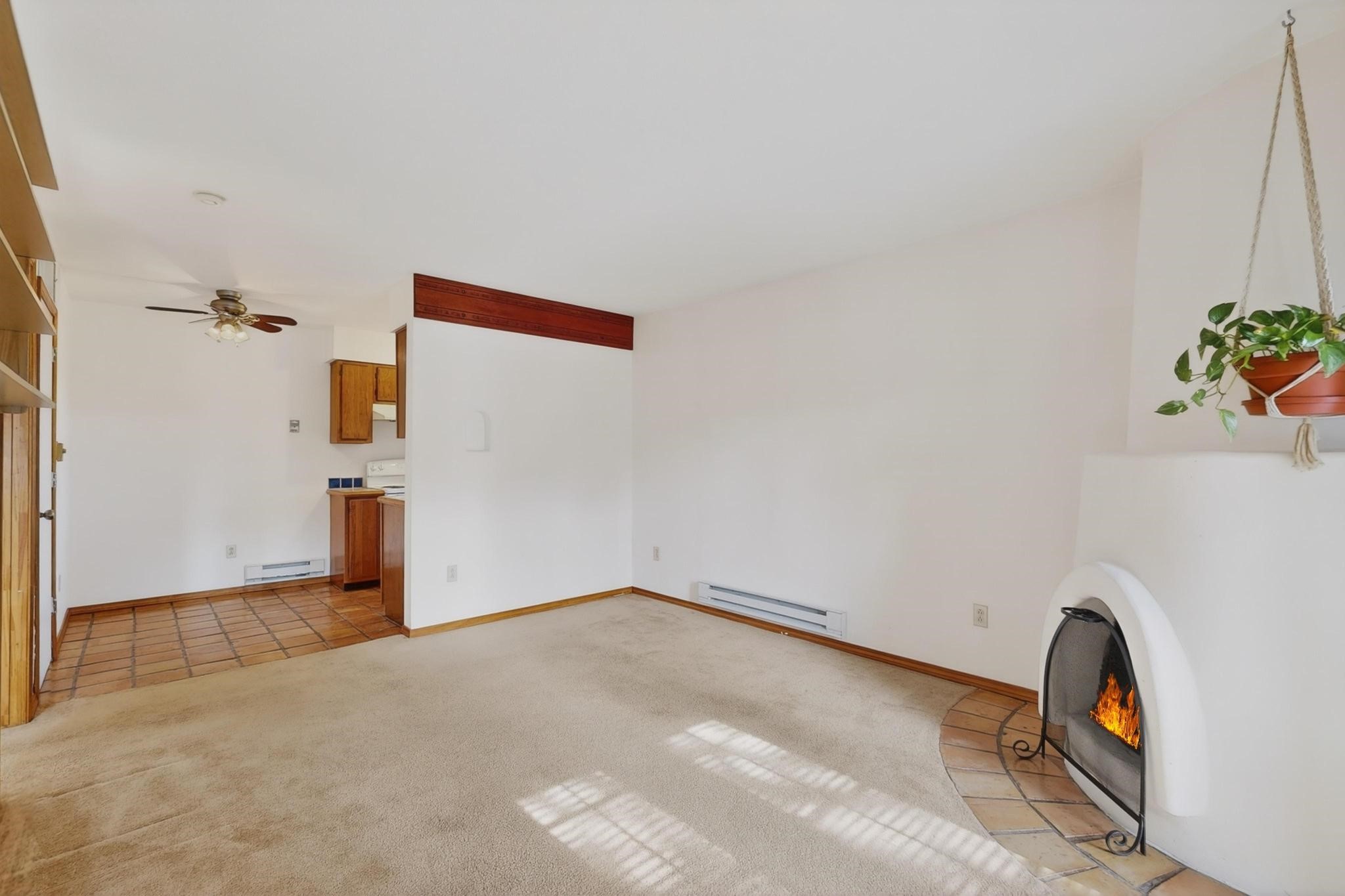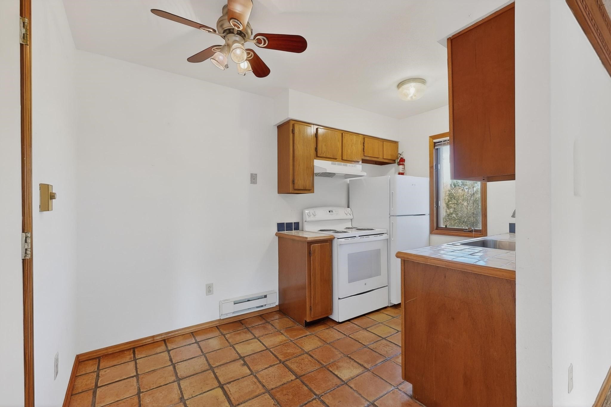Tierra de Zia ground-floor condo. The living room with a Kiva fireplace leads you into the dining area and a galley kitchen. The bedroom is en-suite with, bathroom, tub/shower. Designated parking spot. Tierra De Zia is a gated community on 13.5 acres of native trees, plants, arroyos, fish ponds, and wooden bridges along walking trails. Seasonal swimming pool with sauna, clubhouse, outdoor grills, and a laundry facility, all in a park-like setting. Beautiful grounds with ponds, fountains and walking trails through a natural setting. On-site management. Convenient to so many amenities, restaurants, shopping, and schools.