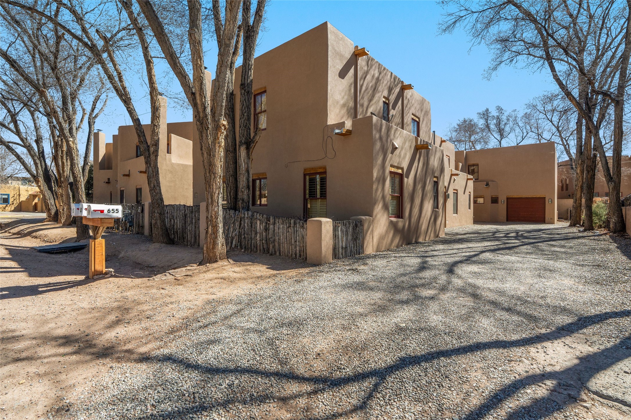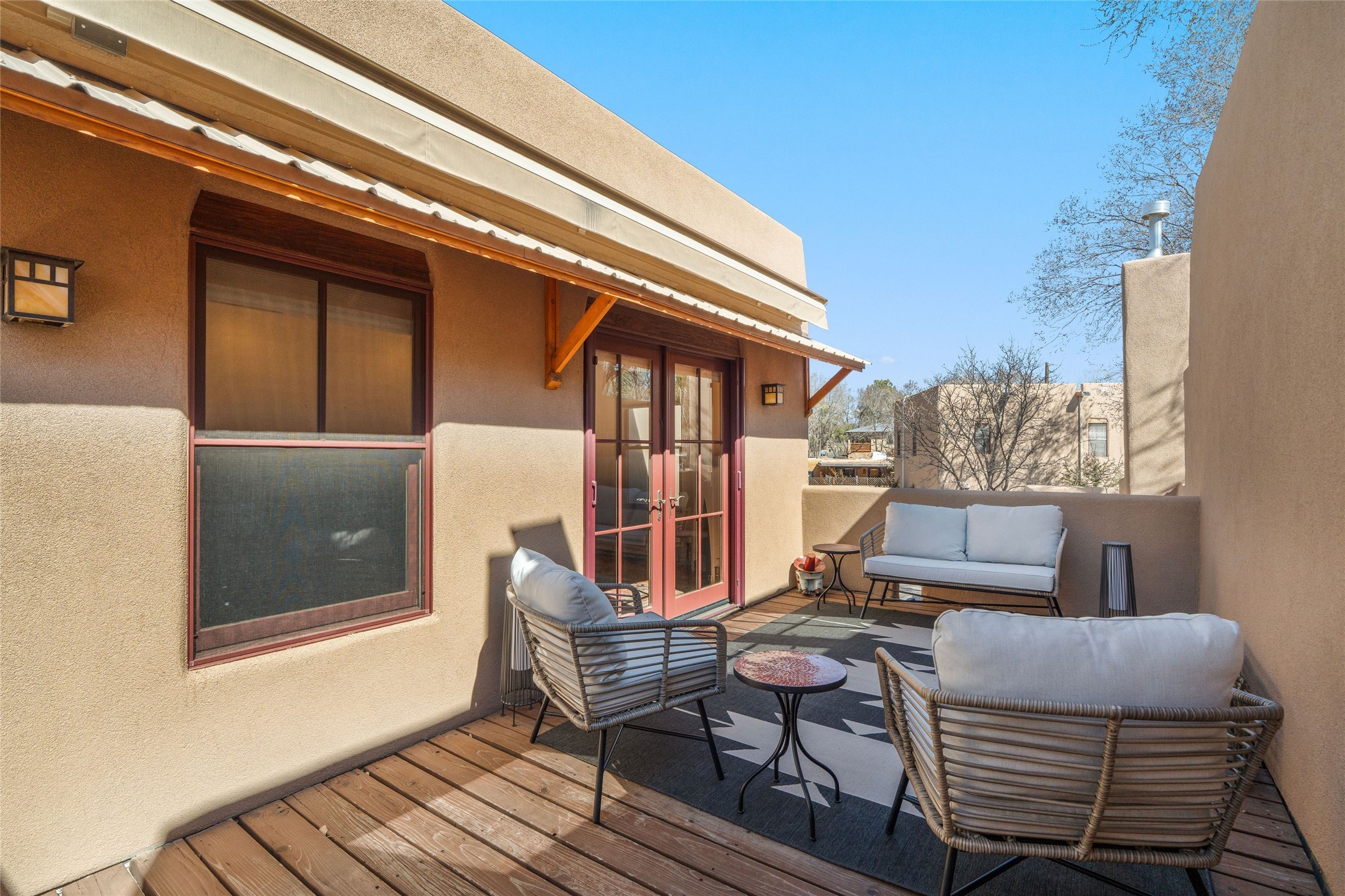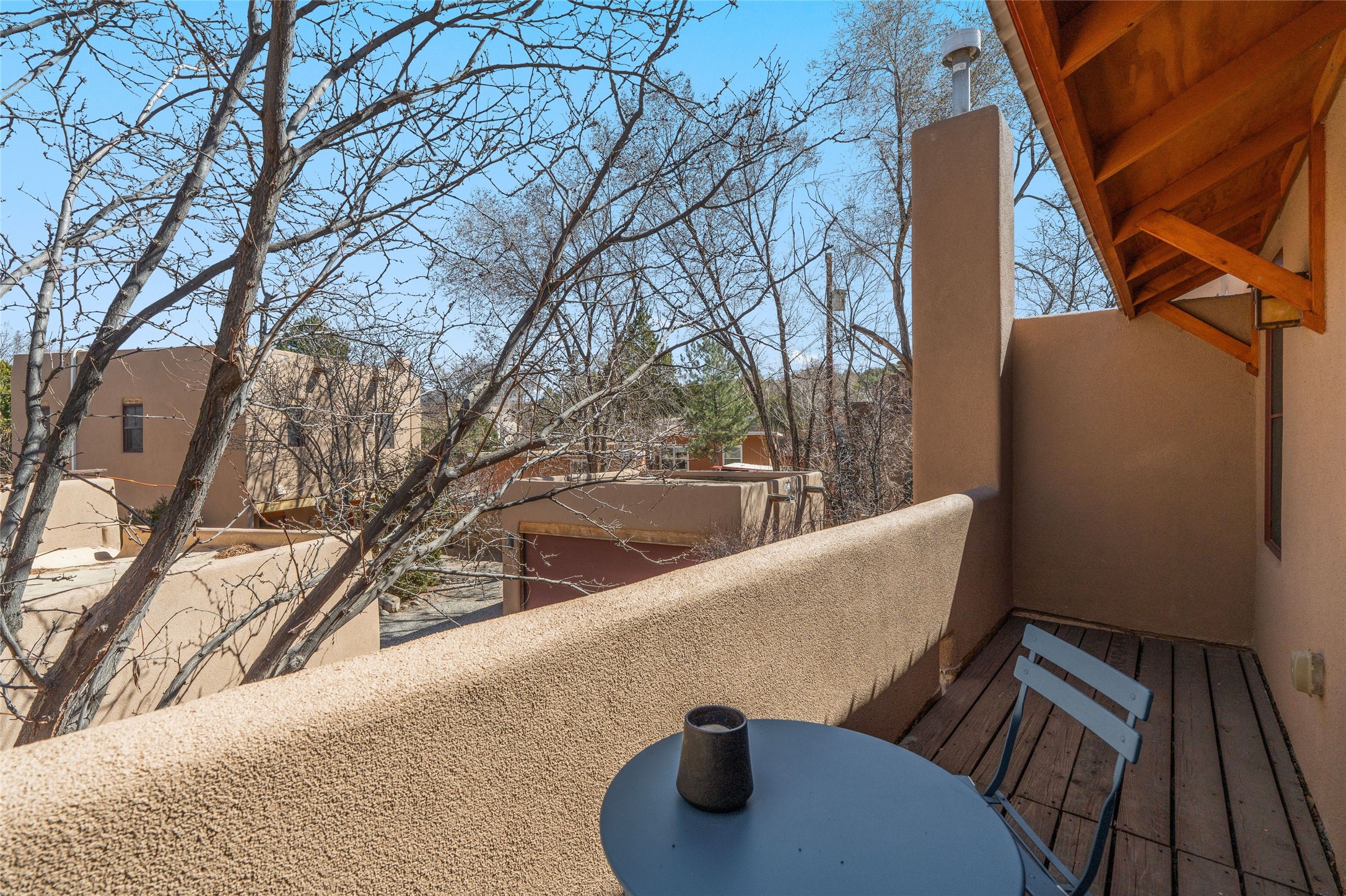 Beautifully updated and ideally located just a short walk to the Plaza, this light-filled two-bedroom, two-bath condo offers the perfect blend of comfort, style, and convenience in one of Santa Fe's most sought-after locations. With approximately 1,140 square feet, the home features high beamed ceilings, an open and airy floor plan, and abundant natural light throughout.The main level includes a well-appointed bedroom and bath, while the spacious owner's suite occupies the upper level, creating a private retreat. A versatile second-floor office or studio opens to a generous, secluded deck--perfect for relaxing or entertaining under the Santa Fe sky. Two fireplaces add warmth and charm, enhancing the inviting living spaces.Recent improvements provide both peace of mind and enhanced livability, including full re-stucco, roof updates, a resealed deck, upgraded alarm system, new circulating pump, updated hot water heater piping, fresh interior paint in the primary and guest bedrooms, and new stairwell carpeting.Additional features include an attached oversized two-car garage, a separate walled BBQ area, and a quiet, tucked-back setting off Bishops Lodge Road. Directly across from Ft. Marcy Park and Recreation Center, and ideally positioned for both downtown living and easy access to skiing, this property offers exceptional versatility as a full-time residence or Santa Fe retreat.Beautifully presented and easy to show. Short-term rentals are not permitted.