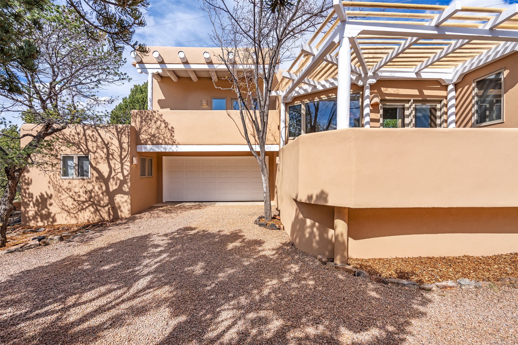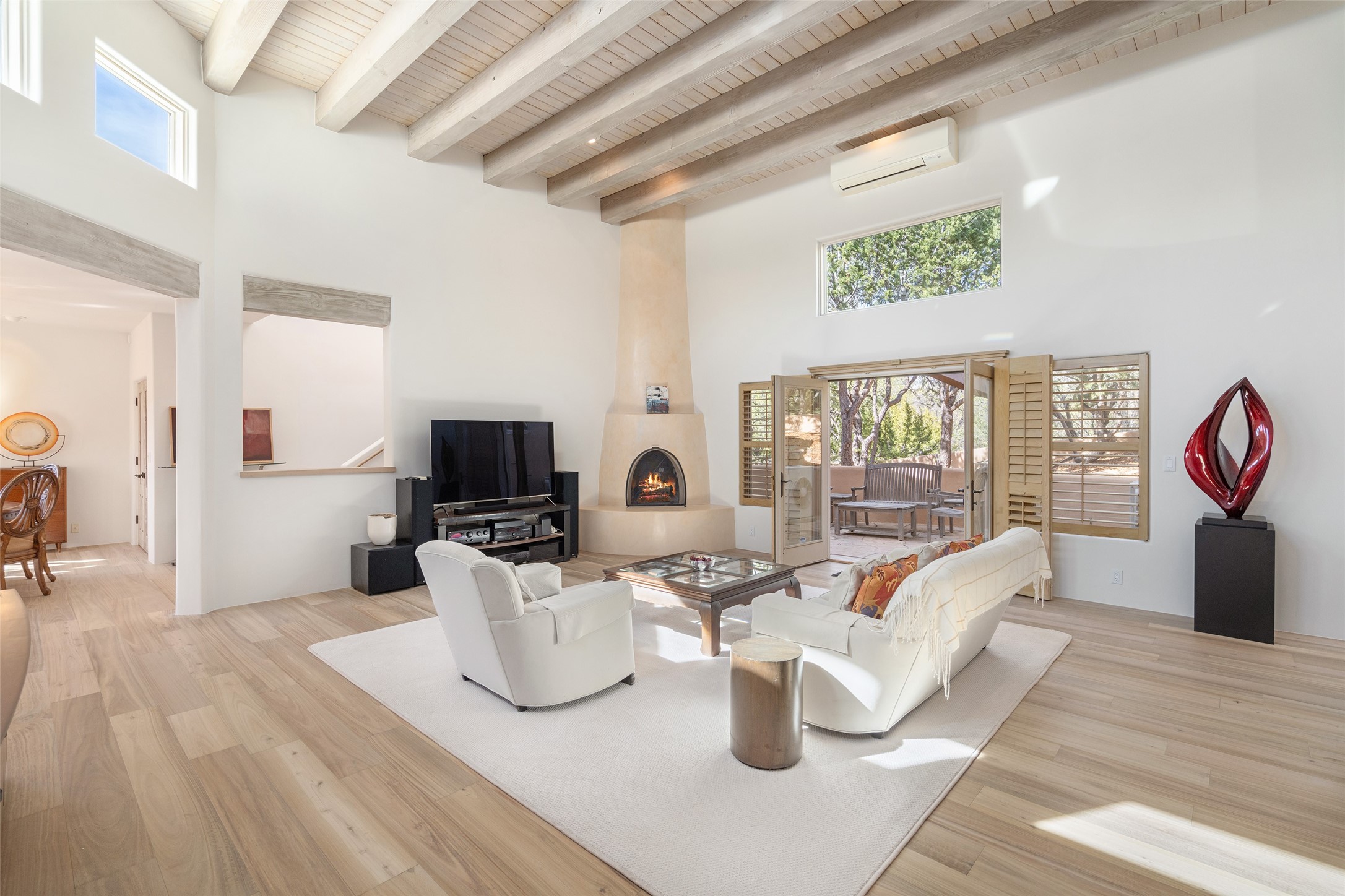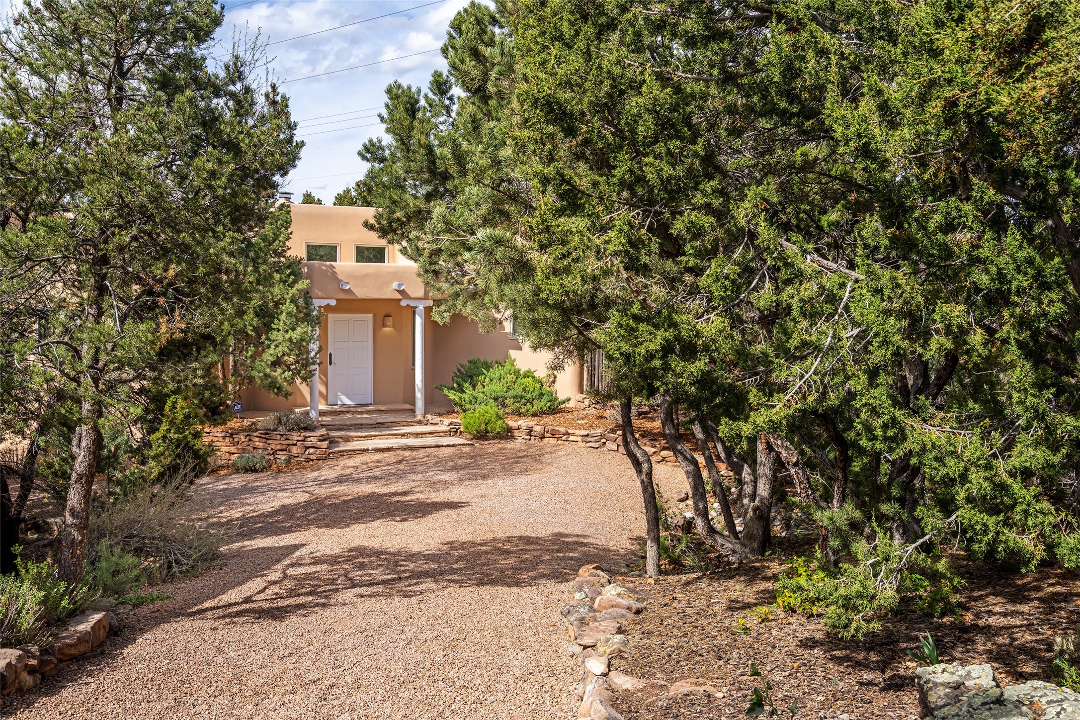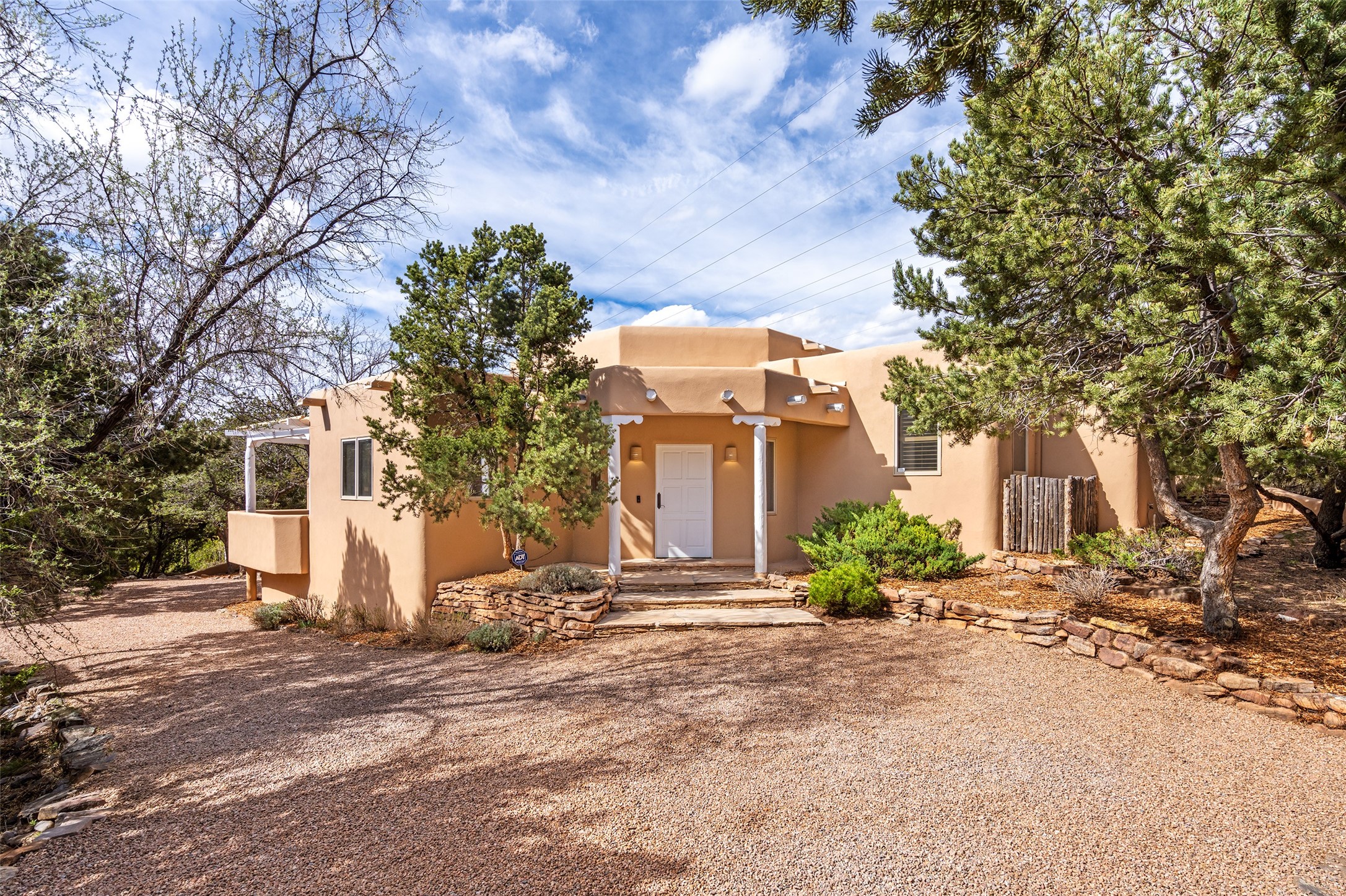 Situated on a beautifully private half-acre lot in the highly desirable Estancia Primera neighborhood, this thoughtfully updated home offers the perfect blend of Santa Fe charm and modern ease. Recent structural upgrades--including a brand new roof with transferable warranty and all-new stucco--provide peace of mind, while a newly built deck off the dining room invites morning coffee or sunset evenings beneath the trees. Inside, the home has been refreshed with brand new Engineered European Walnut wood flooring and a freshly painted interior, creating a clean, contemporary backdrop. The spacious living room is anchored by soaring ceilings with beams and a classic wood-burning kiva fireplace, offering warmth and timeless character. French doors open to a serene outdoor space, where mature trees create a sense of privacy and connection to nature. The kitchen is both functional and inviting, featuring granite countertops, stainless steel appliances, and abundant cabinetry and storage. The primary suite is a true retreat, complete with dual closets--including a cedar-lined closet--an en suite bath, and a private balcony ideal for quiet moments. On the opposite side of the home, two additional bedrooms and a guest bath provide comfortable separation for family or guests. A standout feature is the studio space just off the garage, complete with a sink--perfect for artists, hobbyists, or flexible use. Additional highlights include mini-splits throughout, new skylights and clerestory windows, plantation shutters, and a powder room. The home may also be offered essentially turnkey, with furnishings available making this an easy second home acquisition. Located just off Hyde Park Road, only minutes from the historic Plaza, Estancia Primera residents enjoy access to tennis courts, a seasonal pool, and scenic walking trails--offering a rare combination of convenience, community, and natural beauty.