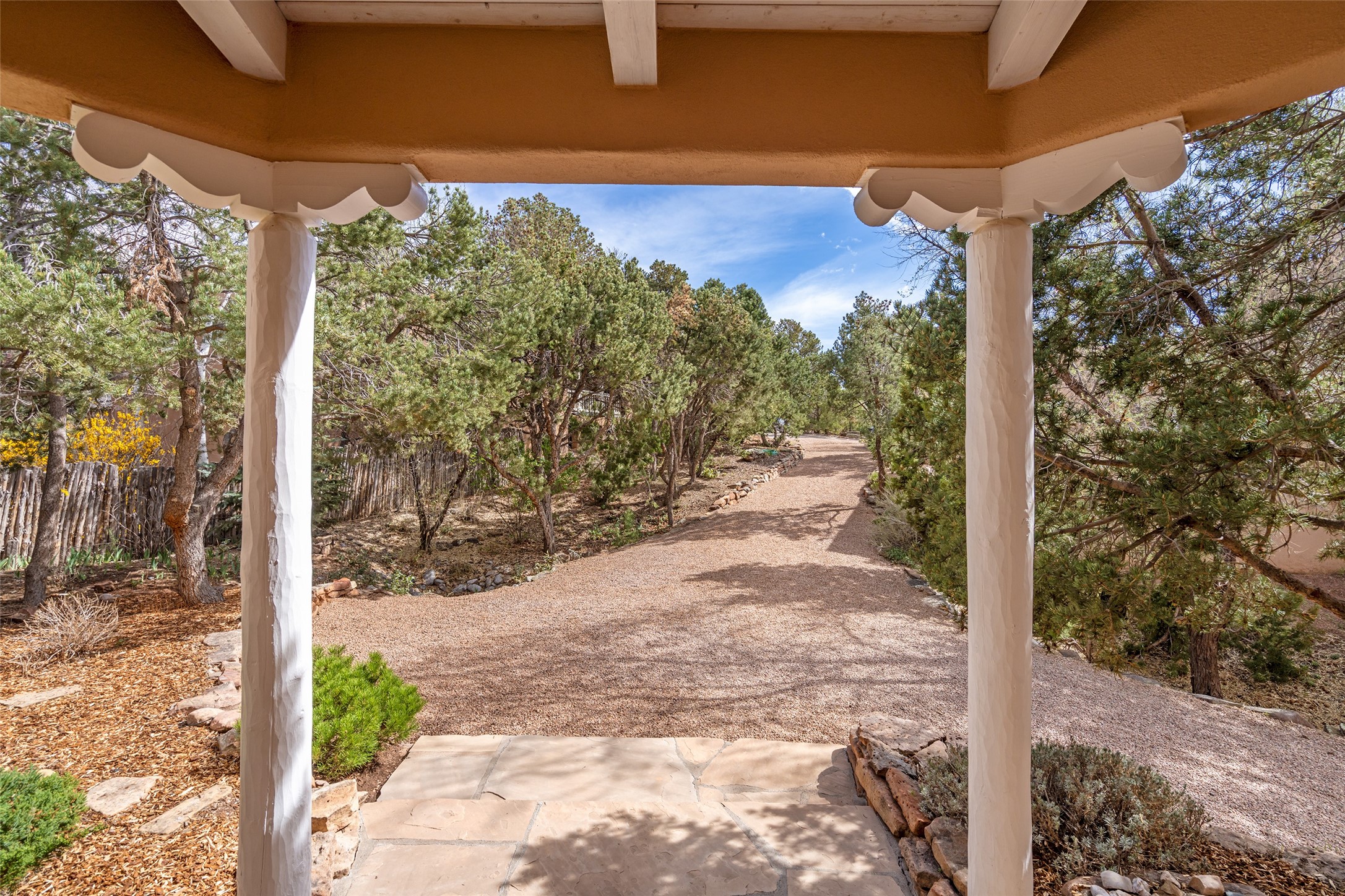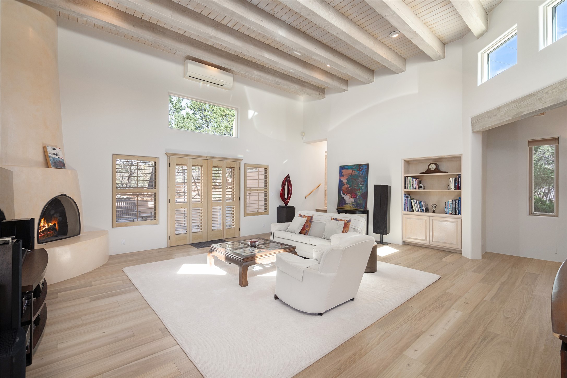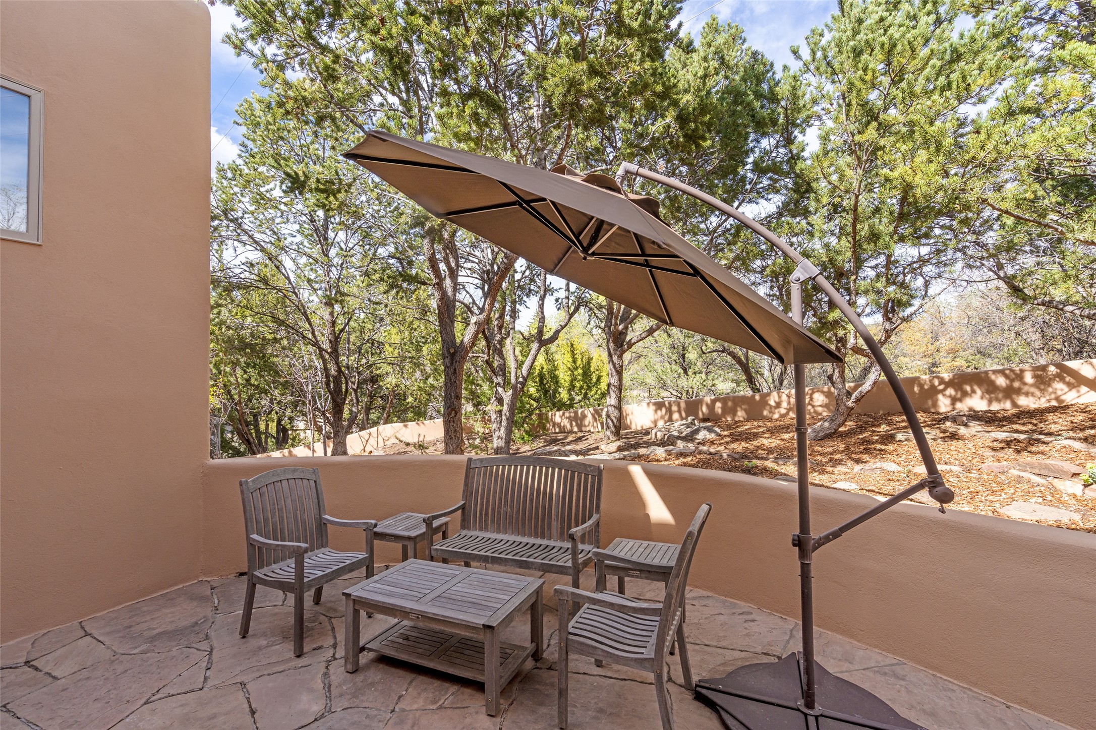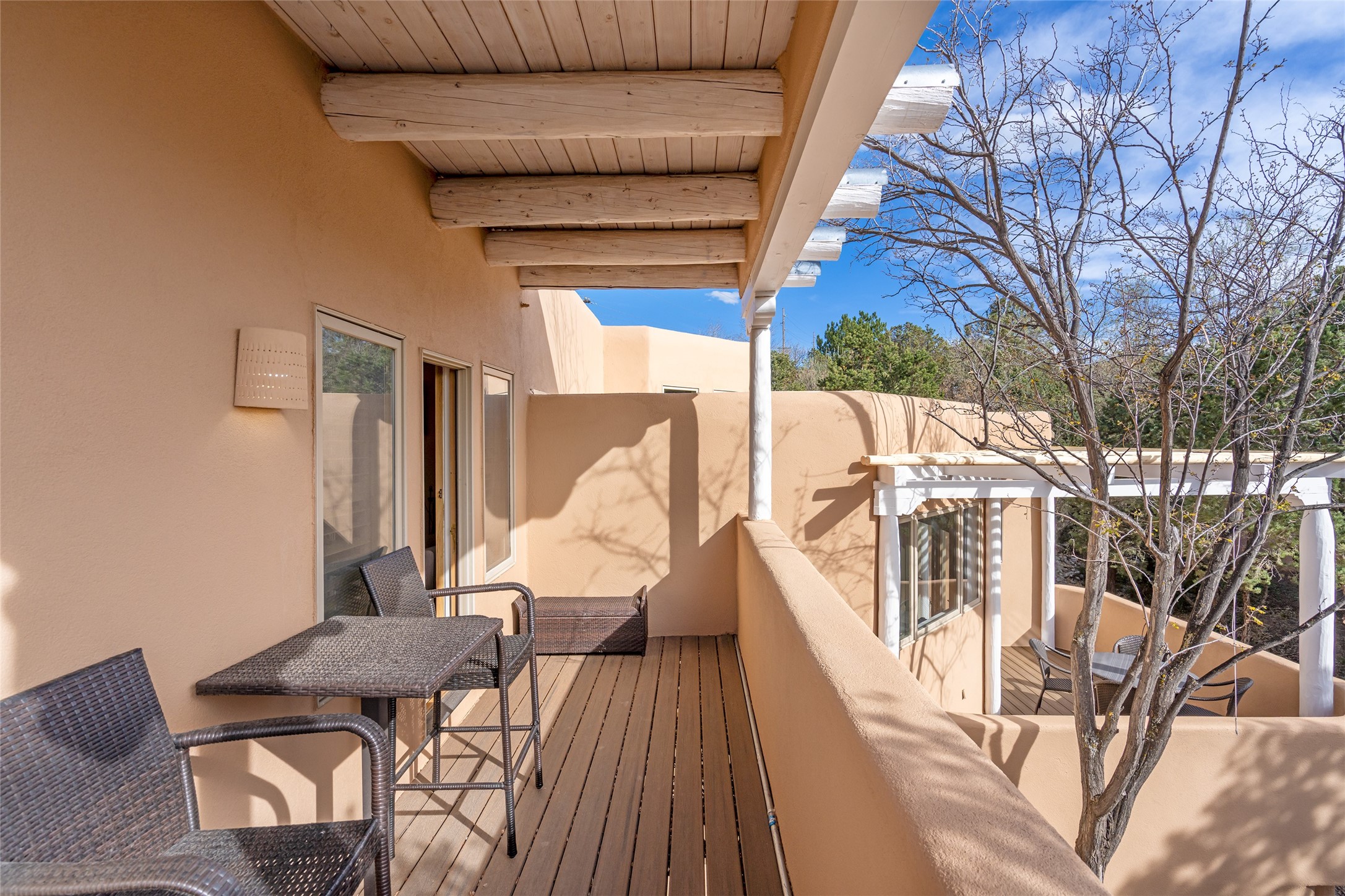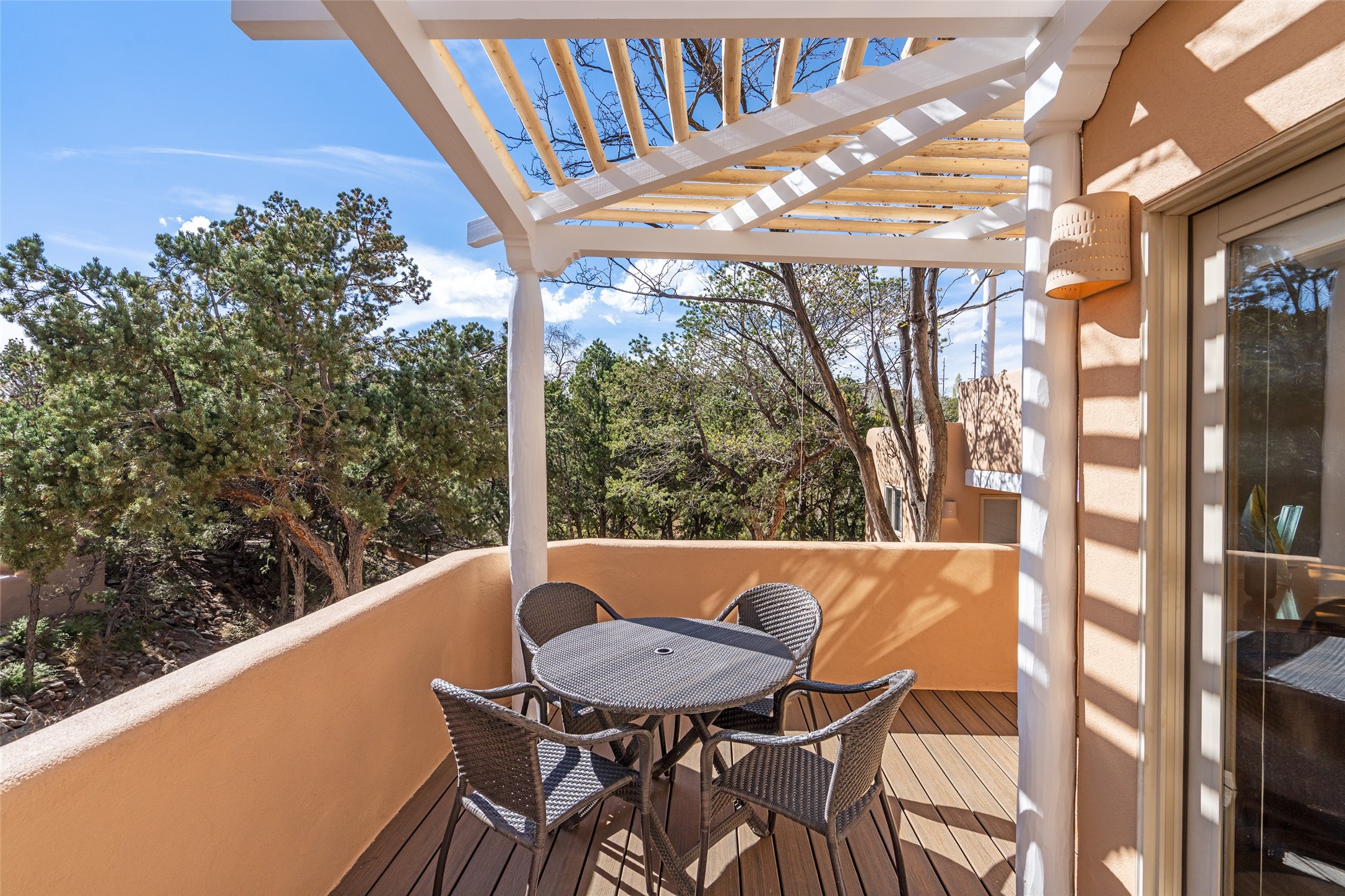 Situated on a beautifully private half-acre lot in the highly desirable Estancia Primera neighborhood, this thoughtfully updated home offers the perfect blend of Santa Fe charm and modern ease. Recent structural upgrades--including a brand new roof with transferable warranty and all-new stucco--provide peace of mind, while a newly built deck off the dining room invites morning coffee or sunset evenings beneath the trees. Inside, the home has been refreshed with brand new Engineered European Walnut wood flooring and a freshly painted interior, creating a clean, contemporary backdrop. The spacious living room is anchored by soaring ceilings with beams and a classic wood-burning kiva fireplace, offering warmth and timeless character. French doors open to a serene outdoor space, where mature trees create a sense of privacy and connection to nature. The kitchen is both functional and inviting, featuring granite countertops, stainless steel appliances, and abundant cabinetry and storage. The primary suite is a true retreat, complete with dual closets--including a cedar-lined closet--an en suite bath, and a private balcony ideal for quiet moments. On the opposite side of the home, two additional bedrooms and a guest bath provide comfortable separation for family or guests. A standout feature is the studio space just off the garage, complete with a sink--perfect for artists, hobbyists, or flexible use. Additional highlights include mini-splits throughout, new skylights and clerestory windows, plantation shutters, and a powder room. The home may also be offered essentially turnkey, with furnishings available making this an easy second home acquisition. Located just off Hyde Park Road, only minutes from the historic Plaza, Estancia Primera residents enjoy access to tennis courts, a seasonal pool, and scenic walking trails--offering a rare combination of convenience, community, and natural beauty.