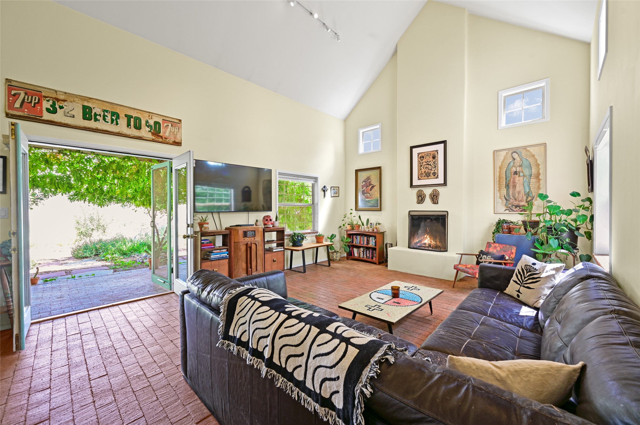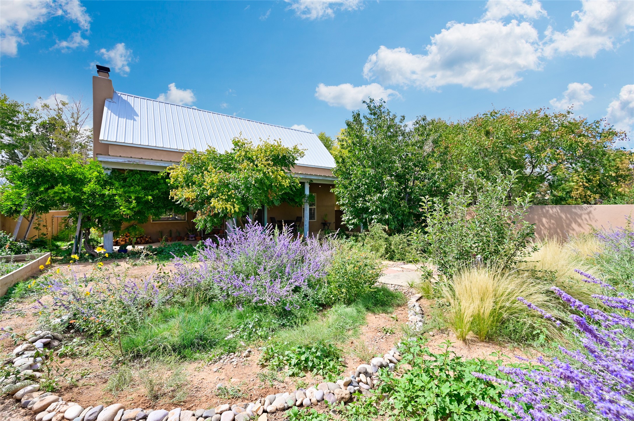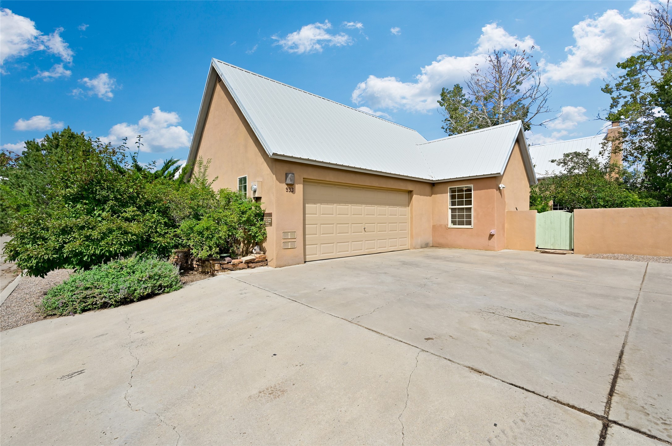 Welcome to your Northern New Mexico style home! This inviting 3 bedroom, 2 bath residence combines convenience and comfort. Enjoy an open floor plan in the living and kitchen areas, featuring a high pitched ceiling, fireplace and lots of natural light. Step out to the backyard with a charming portal and mature trees - perfect for outdoor dining and entertaining. The home includes radiant heat, a modern kitchen and a direct entry 2 car garage. At the end of the street, you'll find the Acequia Bike Trail leading into the Railyard and a lush, green city park. Your new home awaits. (Short Term Rentals are not allowed)