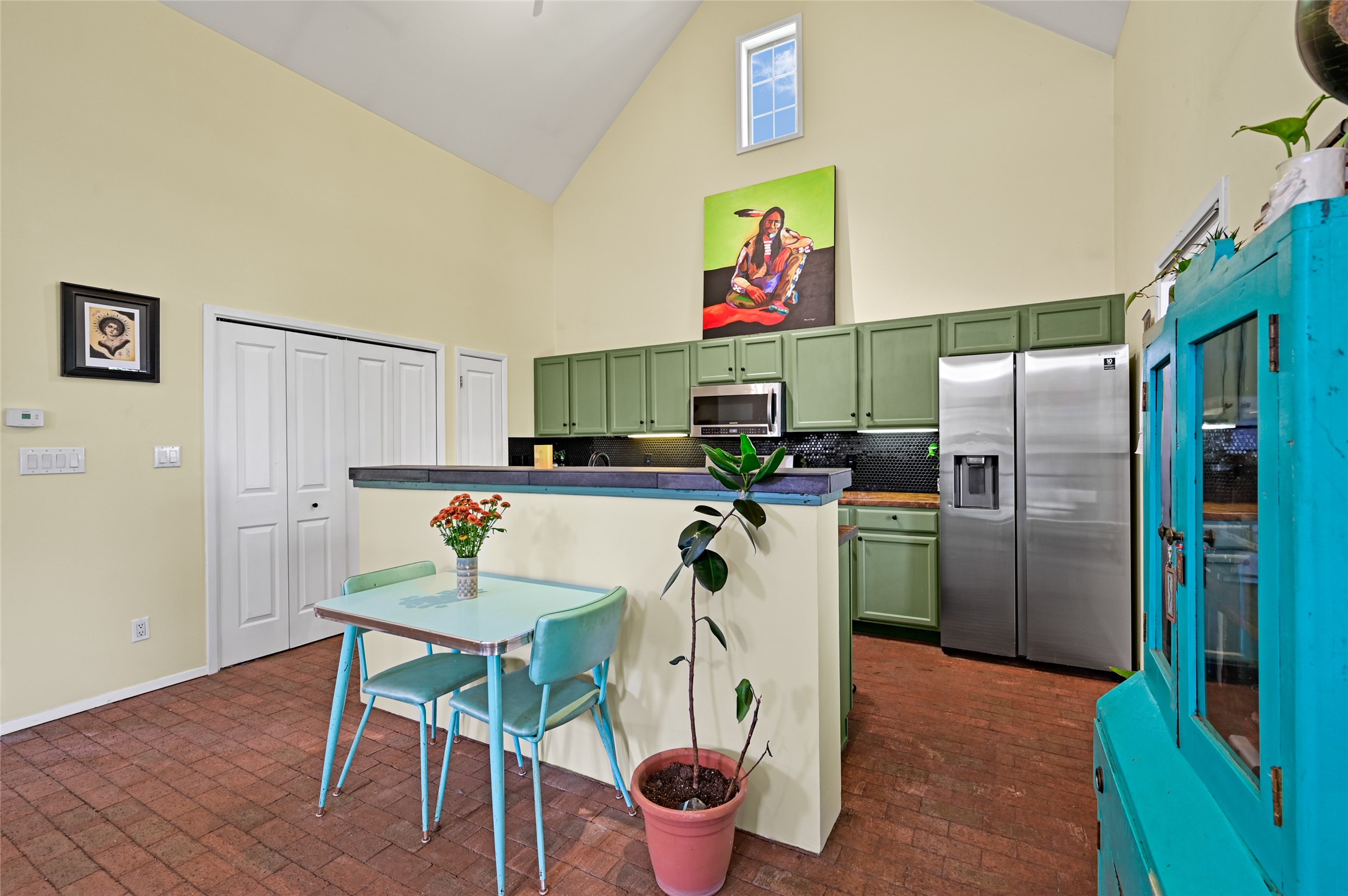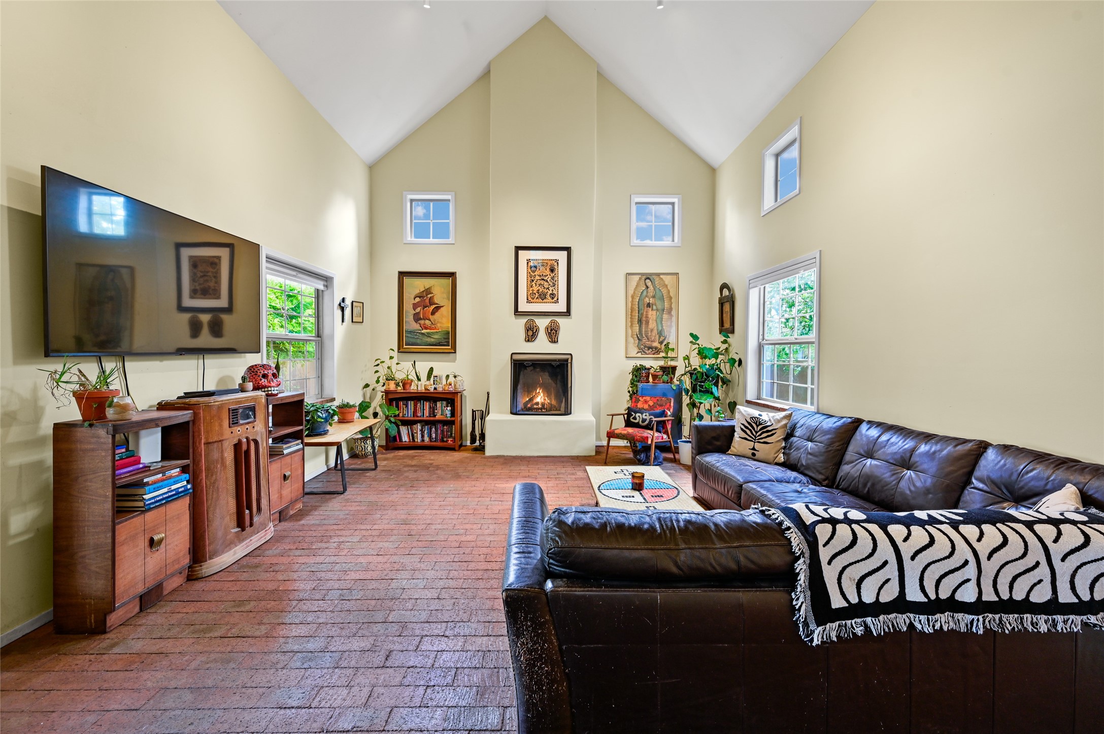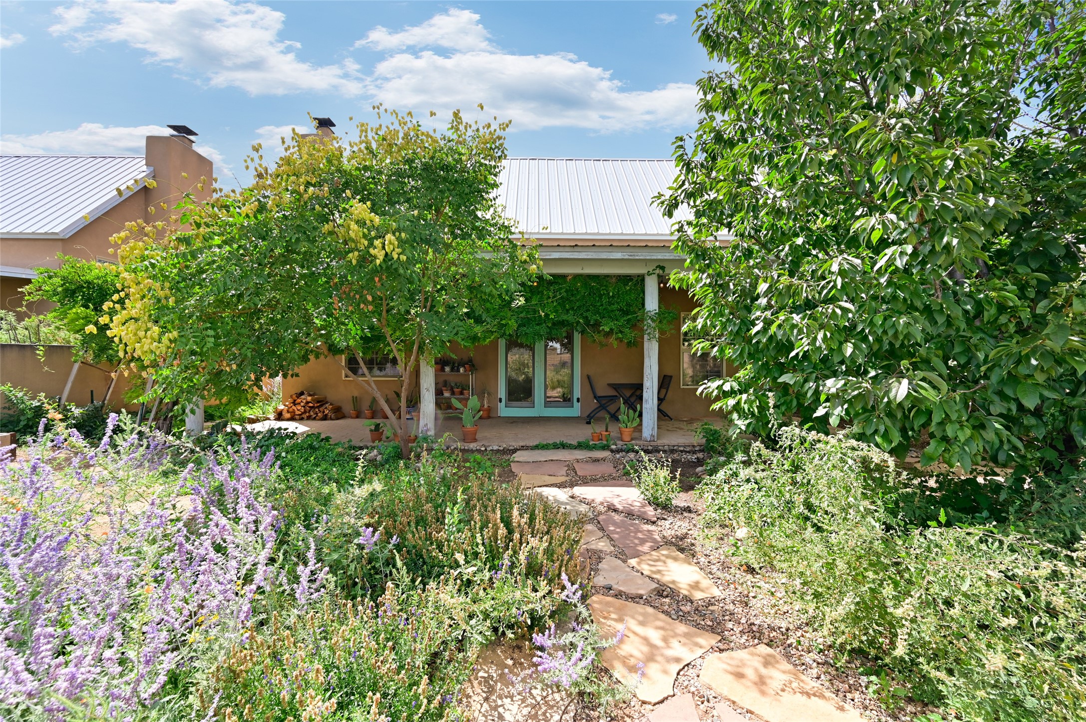 Welcome to your Northern New Mexico style home! This inviting 3 bedroom, 2 bath residence combines convenience and comfort. Enjoy an open floor plan in the living and kitchen areas, featuring a high pitched ceiling, fireplace and lots of natural light. Step out to the backyard with a charming portal and mature trees - perfect for outdoor dining and entertaining. The home includes radiant heat, a modern kitchen and a direct entry 2 car garage. At the end of the street, you'll find the Acequia Bike Trail leading into the Railyard and a lush, green city park. Your new home awaits. (Short Term Rentals are not allowed)