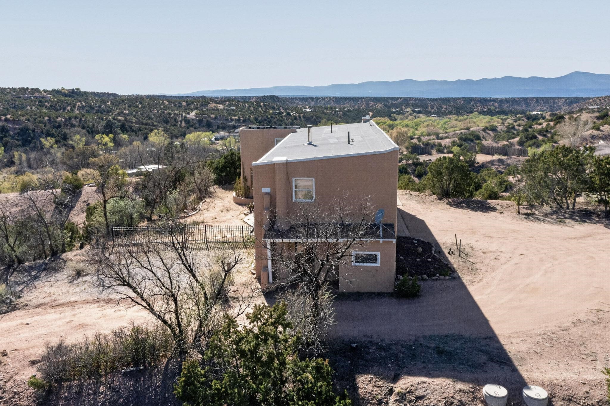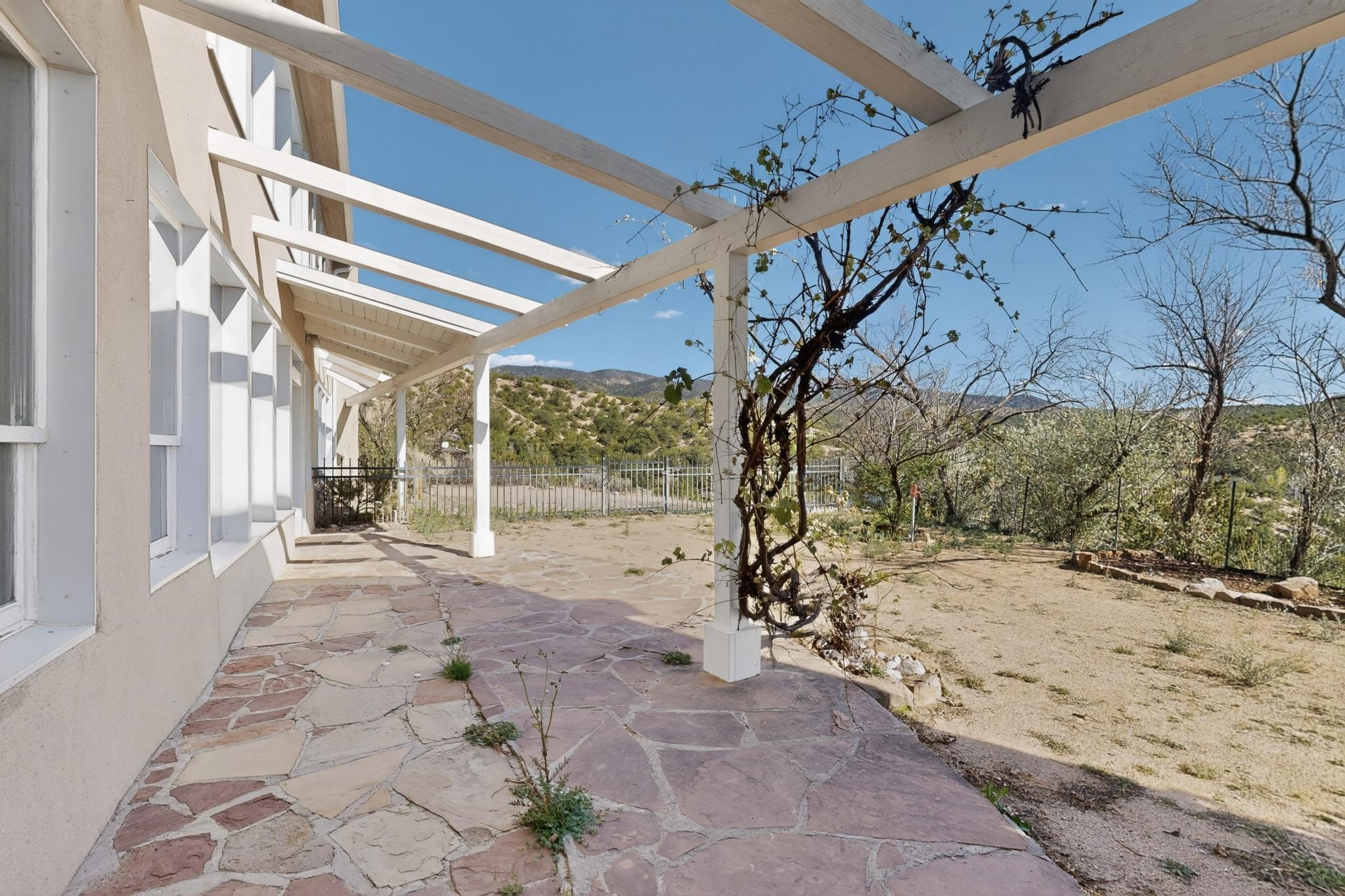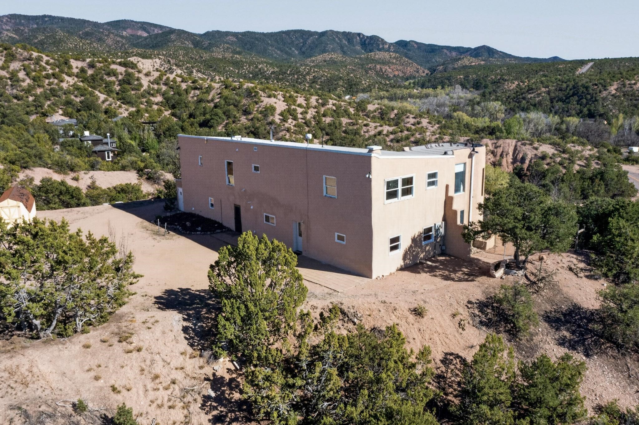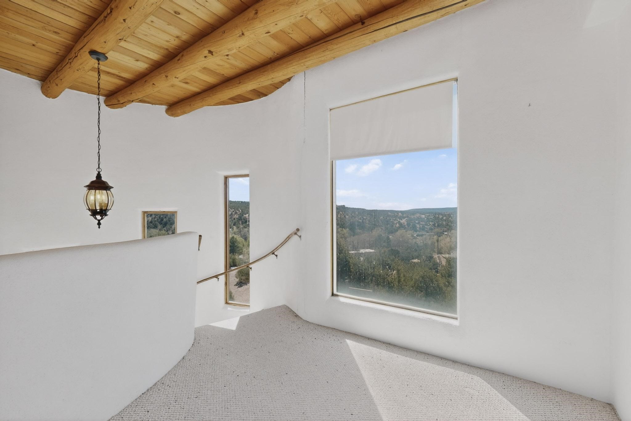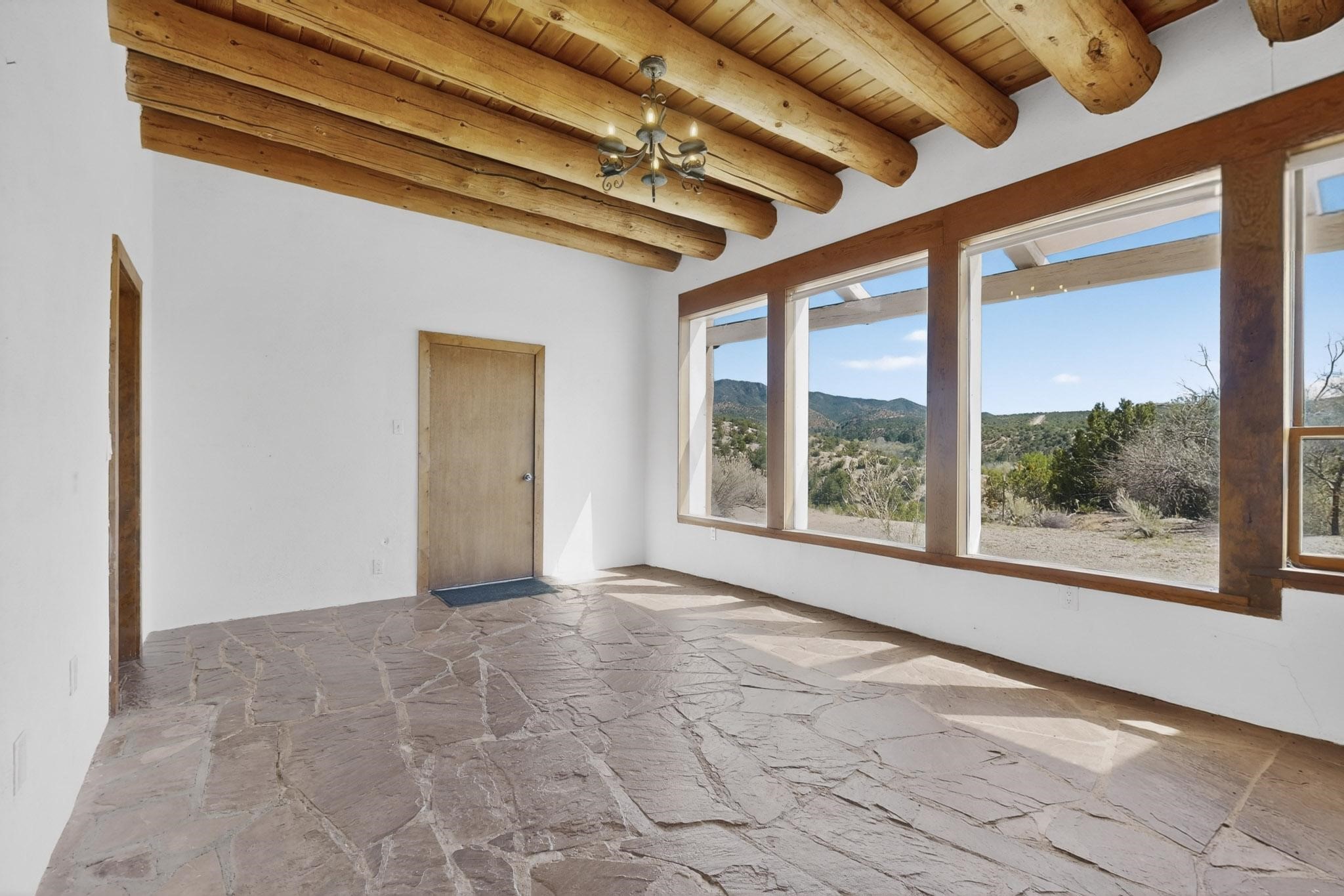 Nestled on 5 acres in the enchanting foothills near Tesuque Village, this uniquely styled home captures the essence of Northern New Mexico living. Located in the quintessential village of Chupadero, the property blends timeless Southwestern charm with breathtaking natural surroundings. Inside, you'll find over 3,100 square feet of thoughtfully designed living space, highlighted by bold vigas, warm flagstone flooring throughout the first floor, and soaring ceilings that extend to the second level. The expansive kitchen and dining area is filled with natural light from dramatic floor-to-ceiling windows, offering both stunning views and passive solar efficiency. The home features two separate living rooms--one on each floor--providing flexibility for entertaining or quiet retreat. With 3 bedrooms and 3 bathrooms, including a convenient ground-floor bedroom, the layout is ideal for multigenerational living or guest accommodations. Step outside and immerse yourself in the beauty of Northern New Mexico. Enjoy direct access to mountain trails right from your backyard, along with sweeping views of the Jemez Mountains and moonrises over the Sangre de Cristo Mountains. At night, the unobstructed skies reveal a dazzling display of stars from every window. Despite its serene setting, the home is just 22 minutes from the historic Santa Fe Plaza and only 5-10 minutes from beloved local destinations like Terra, El Nido, and Tesuque Village Market.