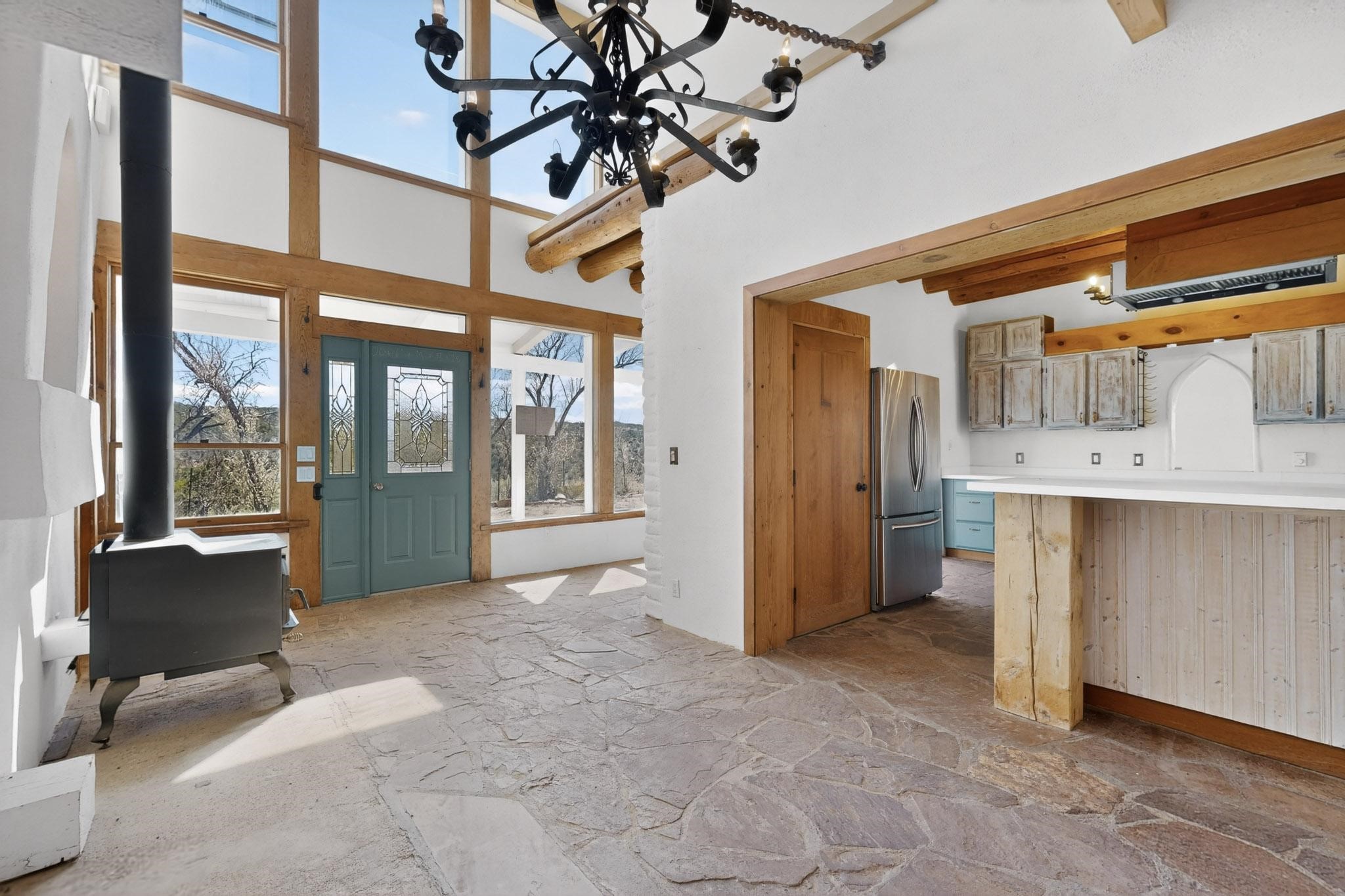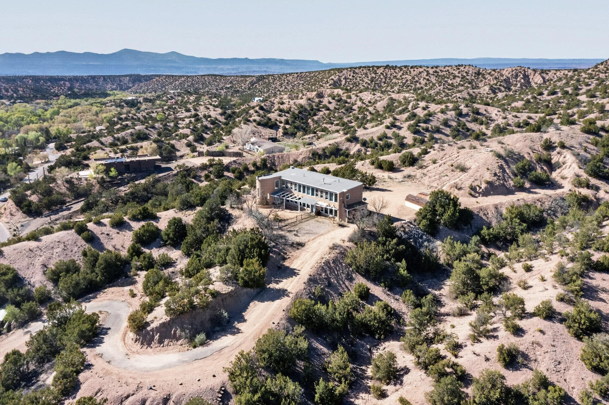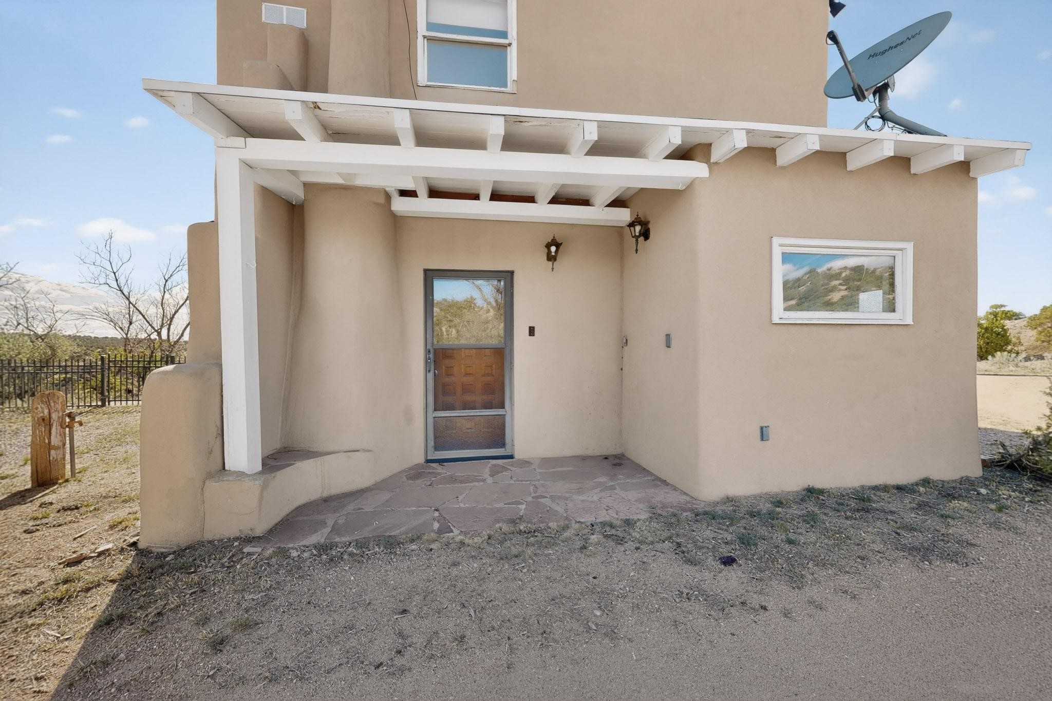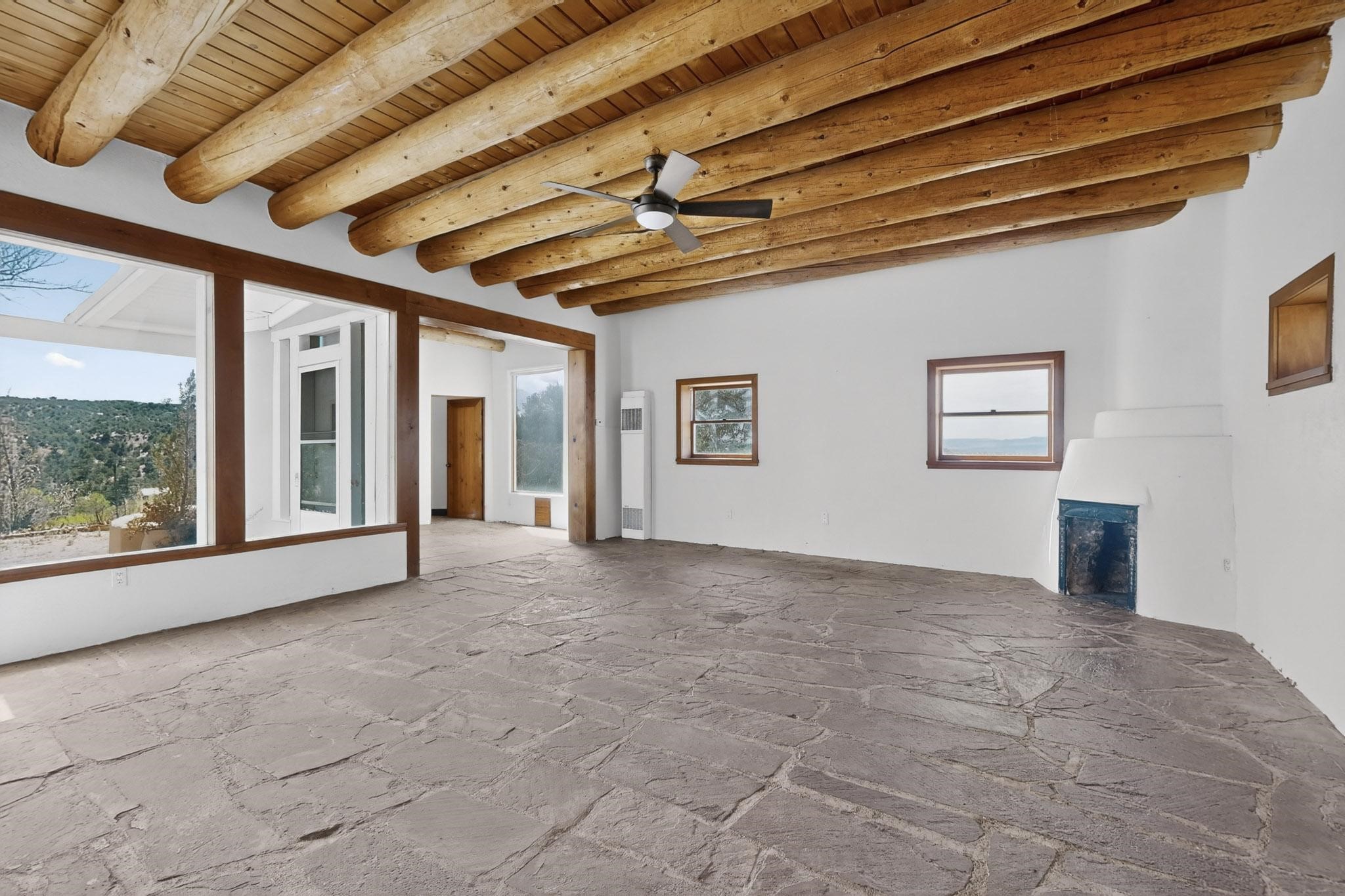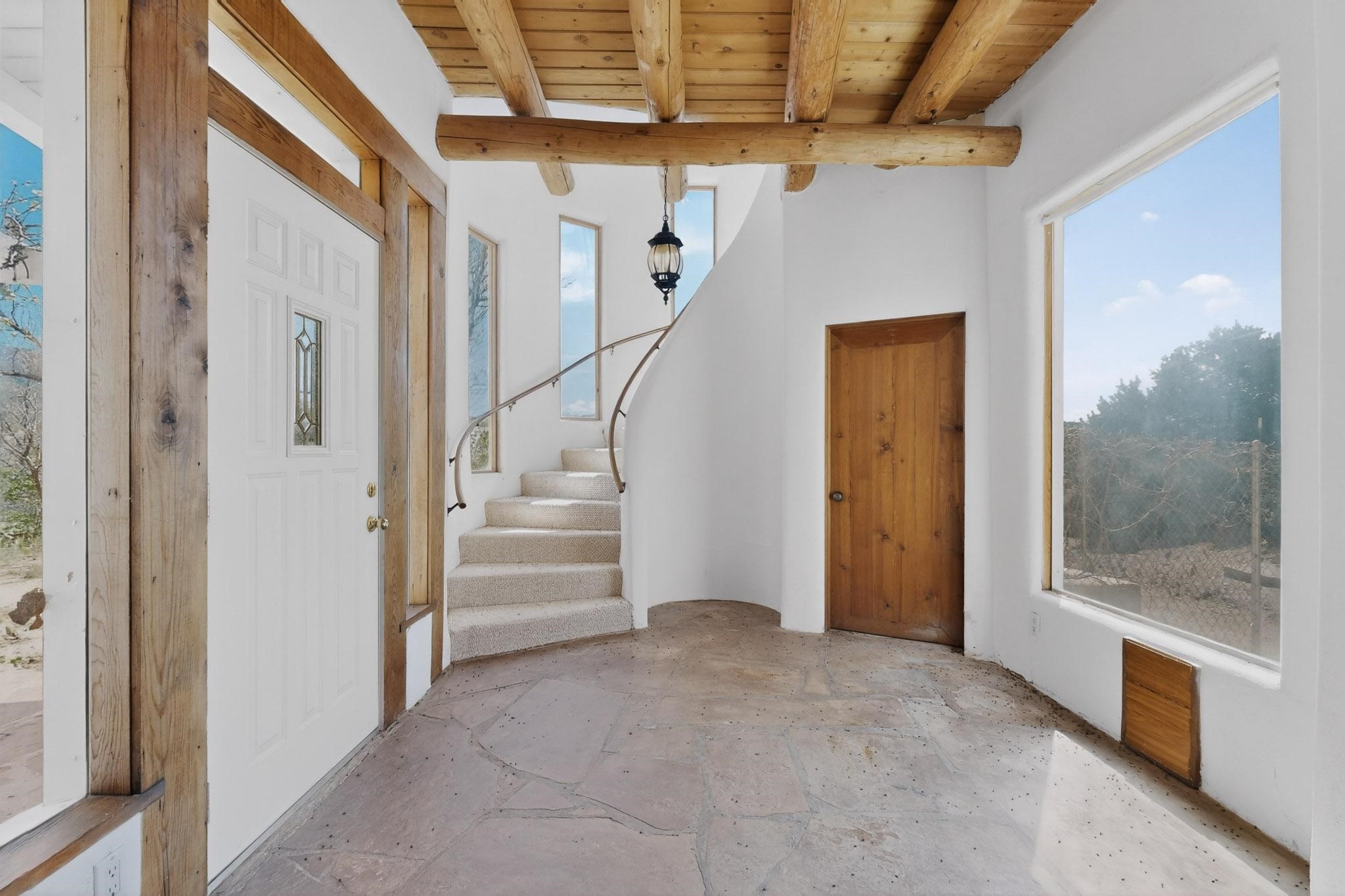 Nestled on 5 acres in the enchanting foothills near Tesuque Village, this uniquely styled home captures the essence of Northern New Mexico living. Located in the quintessential village of Chupadero, the property blends timeless Southwestern charm with breathtaking natural surroundings. Inside, you'll find over 3,100 square feet of thoughtfully designed living space, highlighted by bold vigas, warm flagstone flooring throughout the first floor, and soaring ceilings that extend to the second level. The expansive kitchen and dining area is filled with natural light from dramatic floor-to-ceiling windows, offering both stunning views and passive solar efficiency. The home features two separate living rooms--one on each floor--providing flexibility for entertaining or quiet retreat. With 3 bedrooms and 3 bathrooms, including a convenient ground-floor bedroom, the layout is ideal for multigenerational living or guest accommodations. Step outside and immerse yourself in the beauty of Northern New Mexico. Enjoy direct access to mountain trails right from your backyard, along with sweeping views of the Jemez Mountains and moonrises over the Sangre de Cristo Mountains. At night, the unobstructed skies reveal a dazzling display of stars from every window. Despite its serene setting, the home is just 22 minutes from the historic Santa Fe Plaza and only 5-10 minutes from beloved local destinations like Terra, El Nido, and Tesuque Village Market.