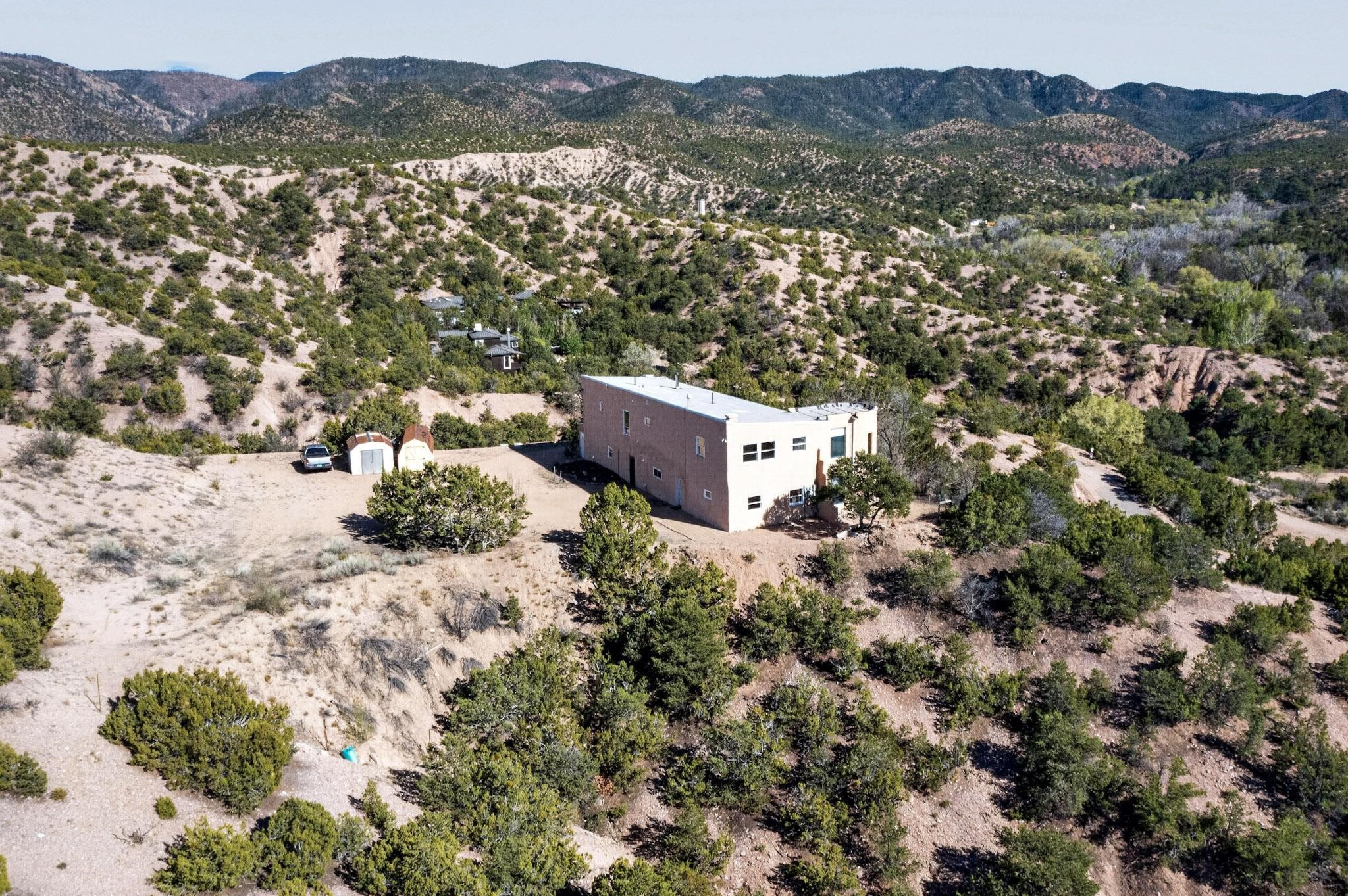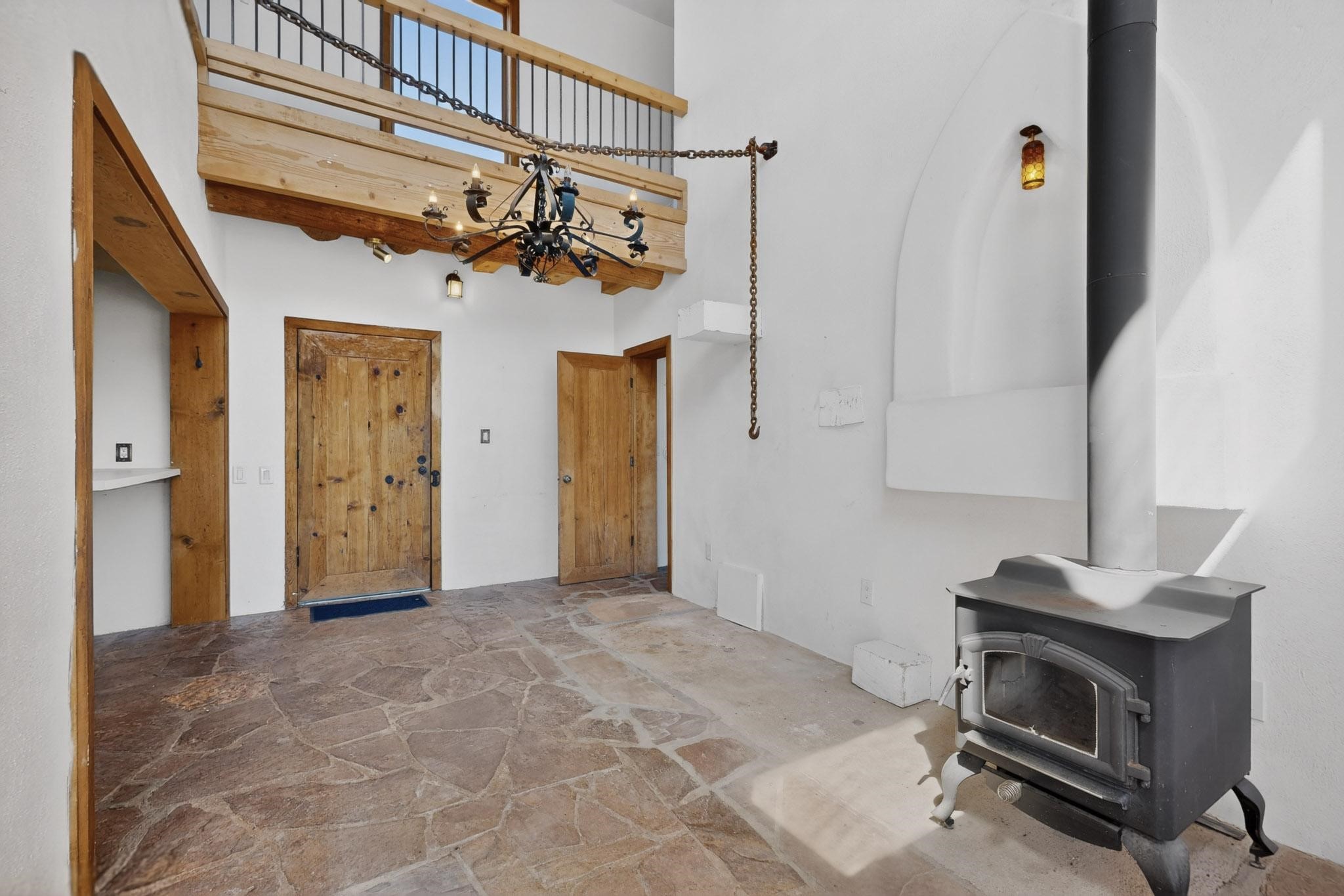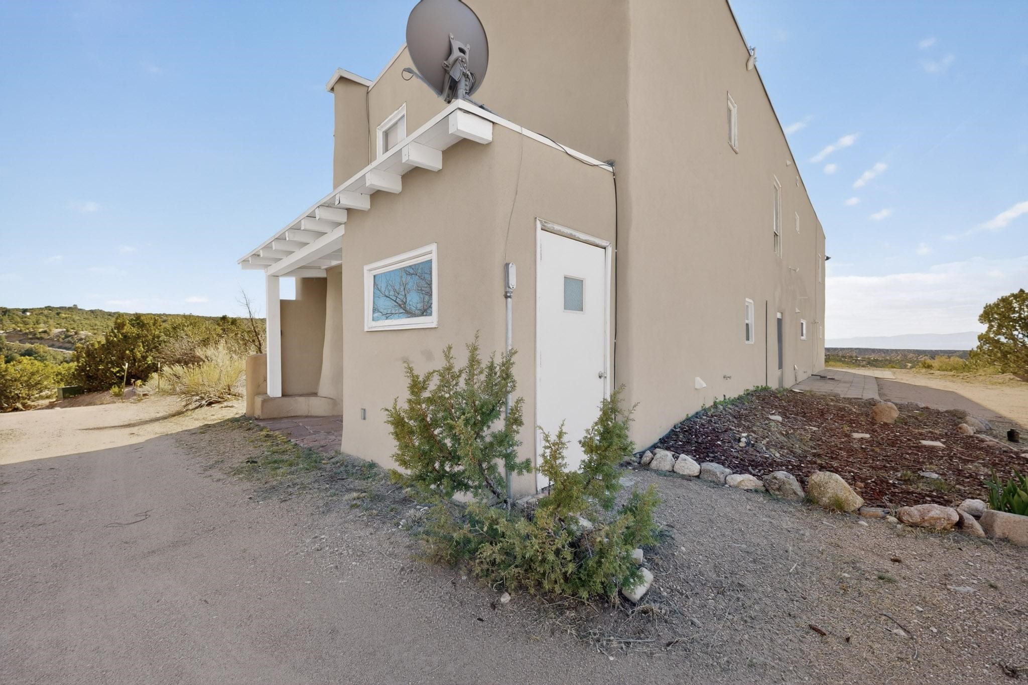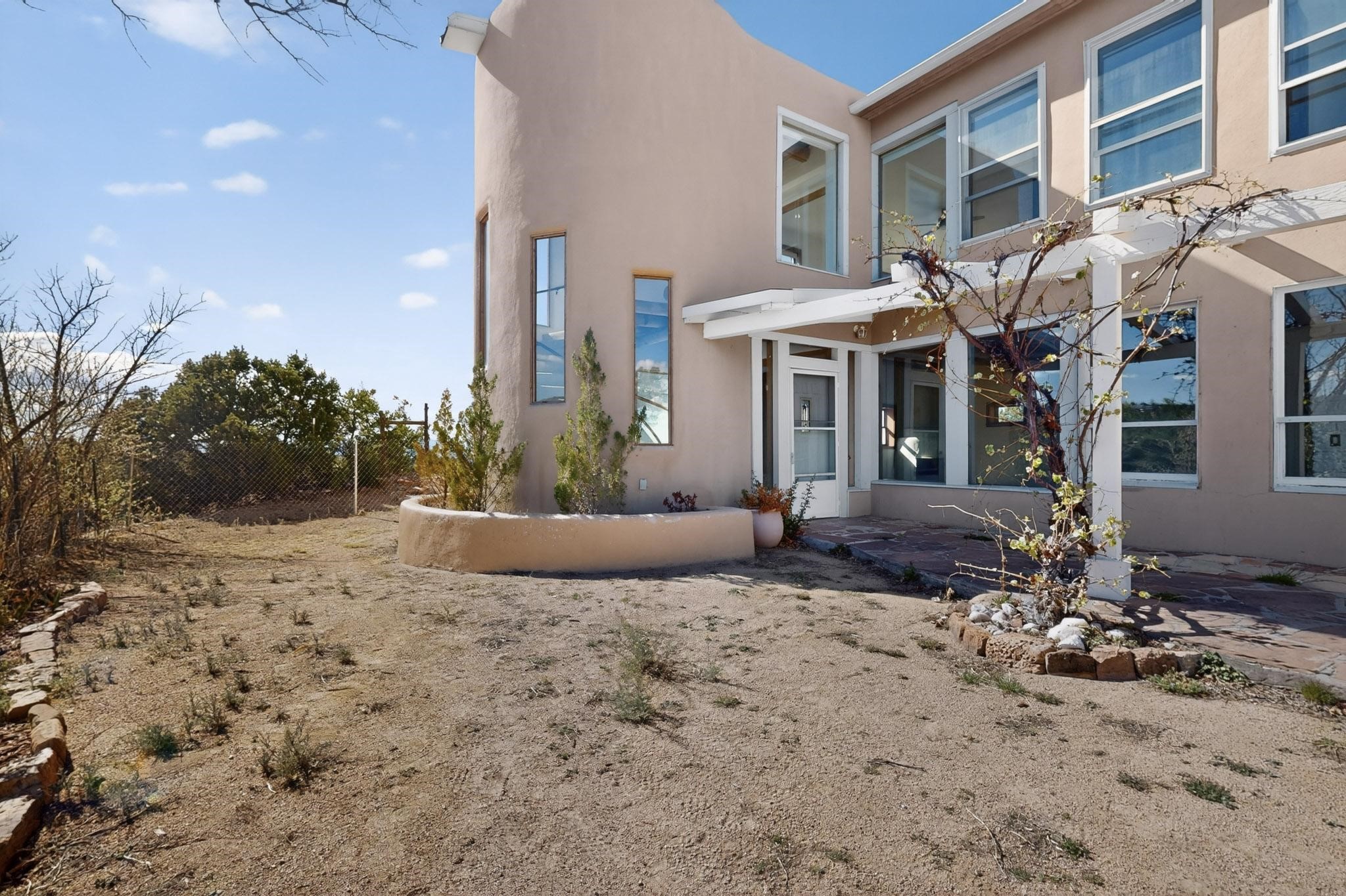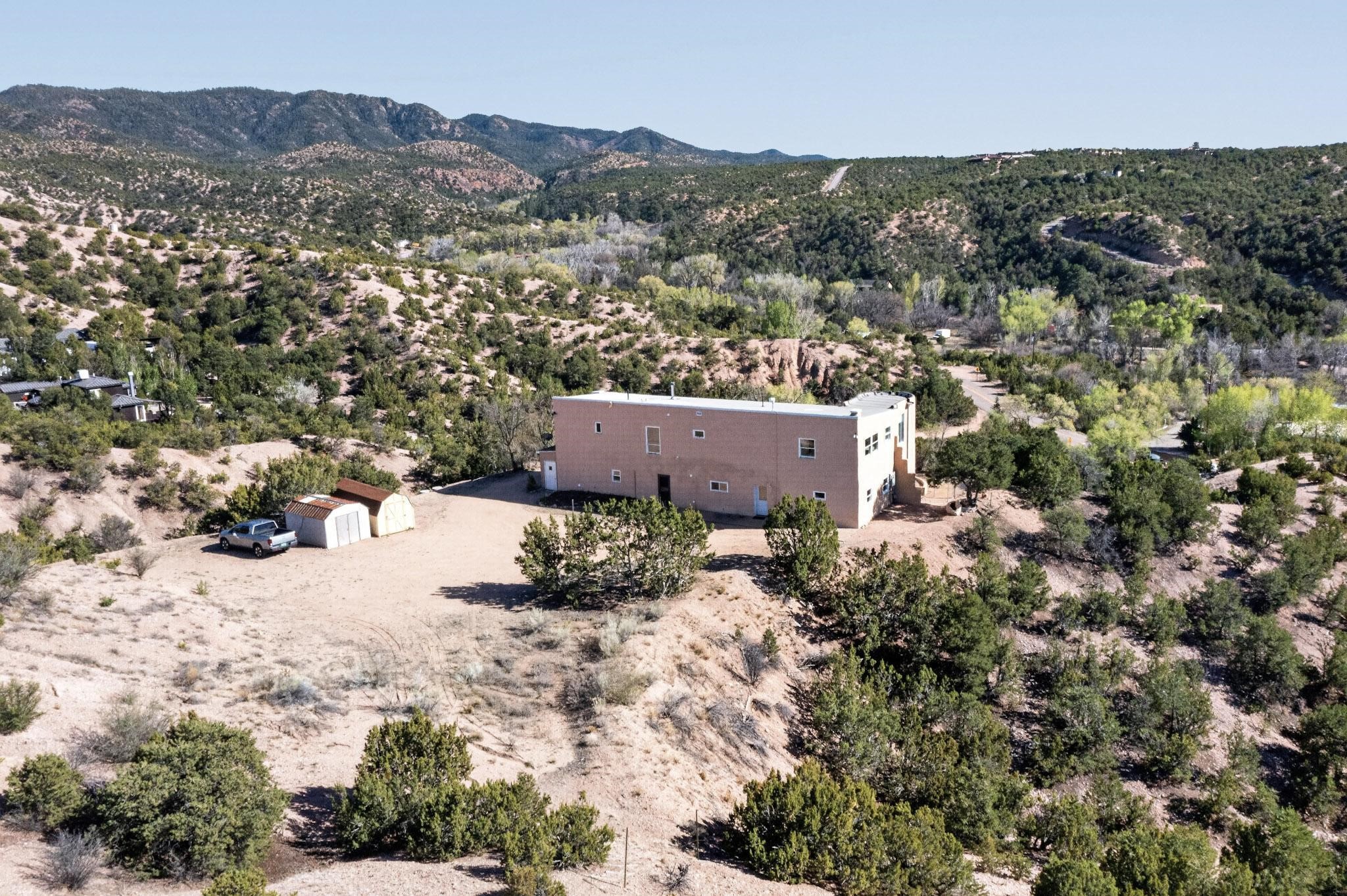 Nestled on 5 acres in the enchanting foothills near Tesuque Village, this uniquely styled home captures the essence of Northern New Mexico living. Located in the quintessential village of Chupadero, the property blends timeless Southwestern charm with breathtaking natural surroundings. Inside, you'll find over 3,100 square feet of thoughtfully designed living space, highlighted by bold vigas, warm flagstone flooring throughout the first floor, and soaring ceilings that extend to the second level. The expansive kitchen and dining area is filled with natural light from dramatic floor-to-ceiling windows, offering both stunning views and passive solar efficiency. The home features two separate living rooms--one on each floor--providing flexibility for entertaining or quiet retreat. With 3 bedrooms and 3 bathrooms, including a convenient ground-floor bedroom, the layout is ideal for multigenerational living or guest accommodations. Step outside and immerse yourself in the beauty of Northern New Mexico. Enjoy direct access to mountain trails right from your backyard, along with sweeping views of the Jemez Mountains and moonrises over the Sangre de Cristo Mountains. At night, the unobstructed skies reveal a dazzling display of stars from every window. Despite its serene setting, the home is just 22 minutes from the historic Santa Fe Plaza and only 5-10 minutes from beloved local destinations like Terra, El Nido, and Tesuque Village Market.