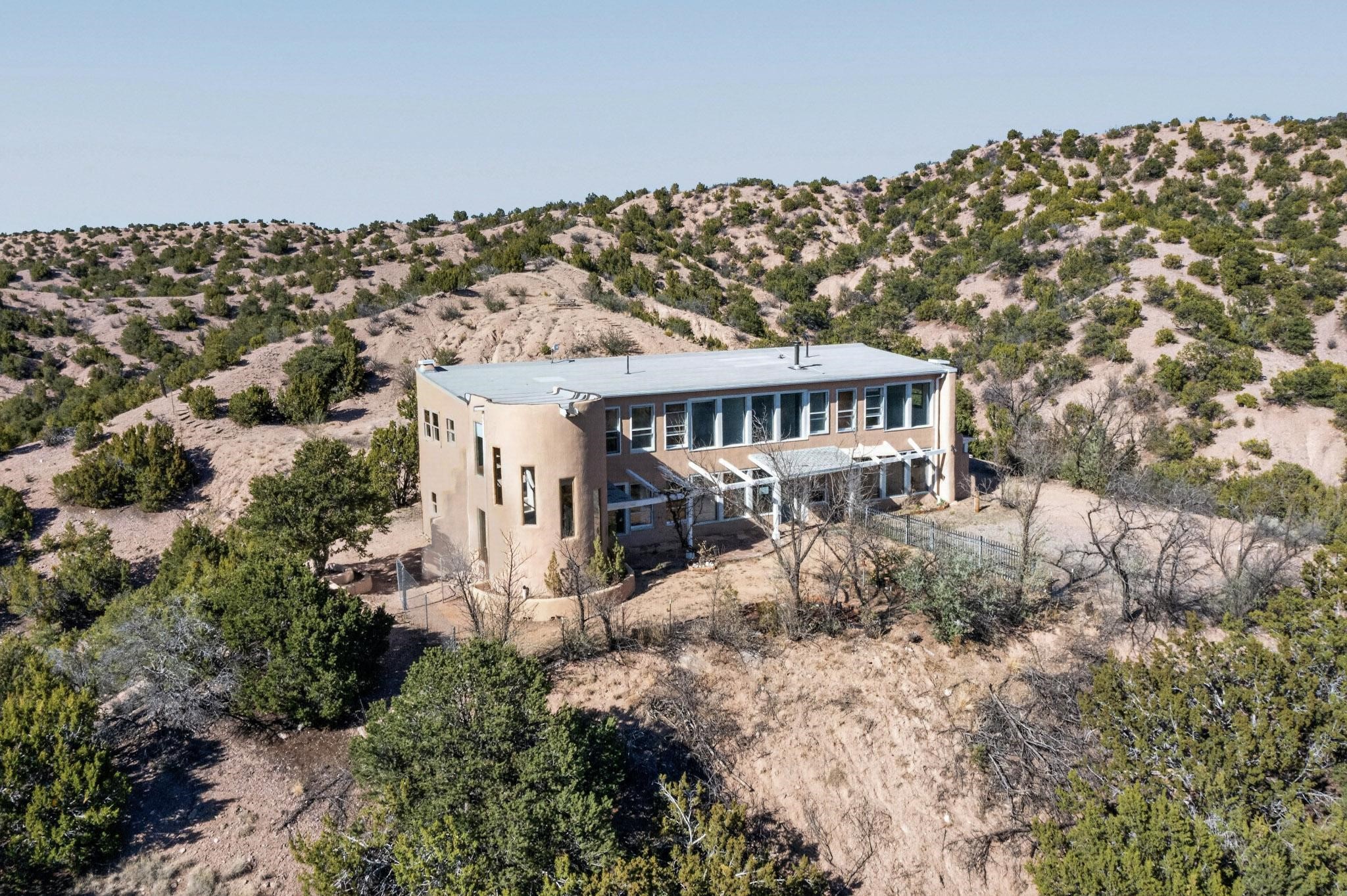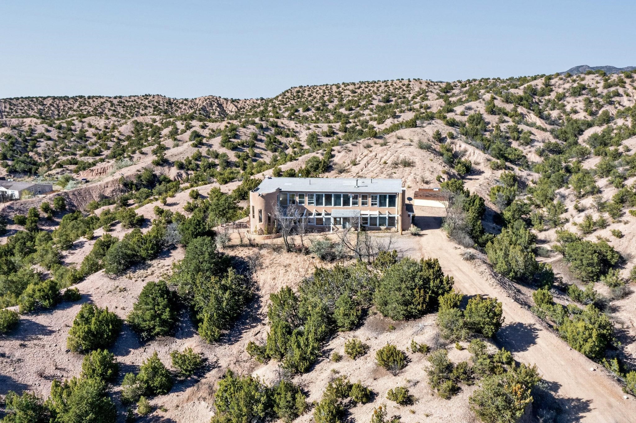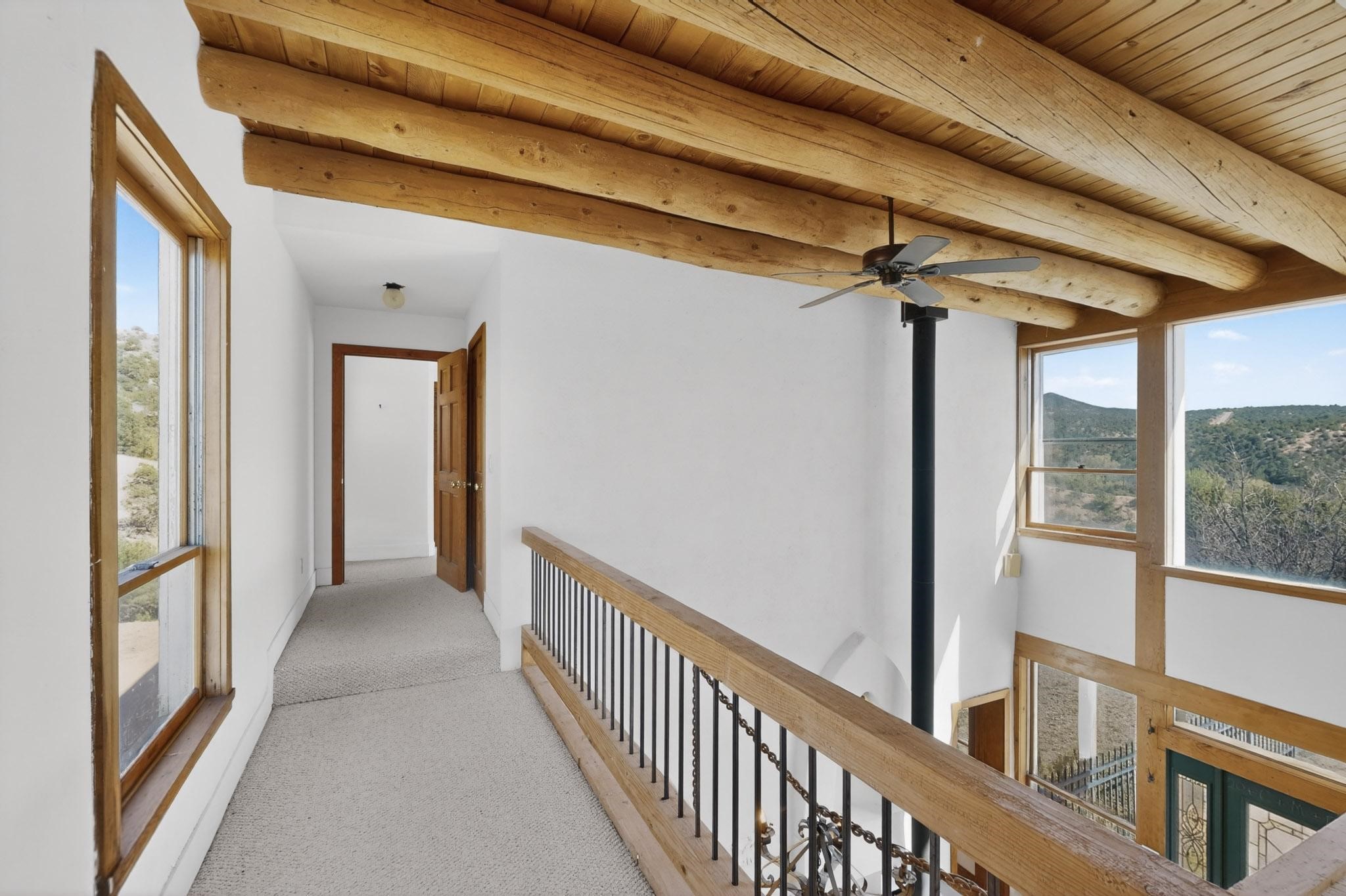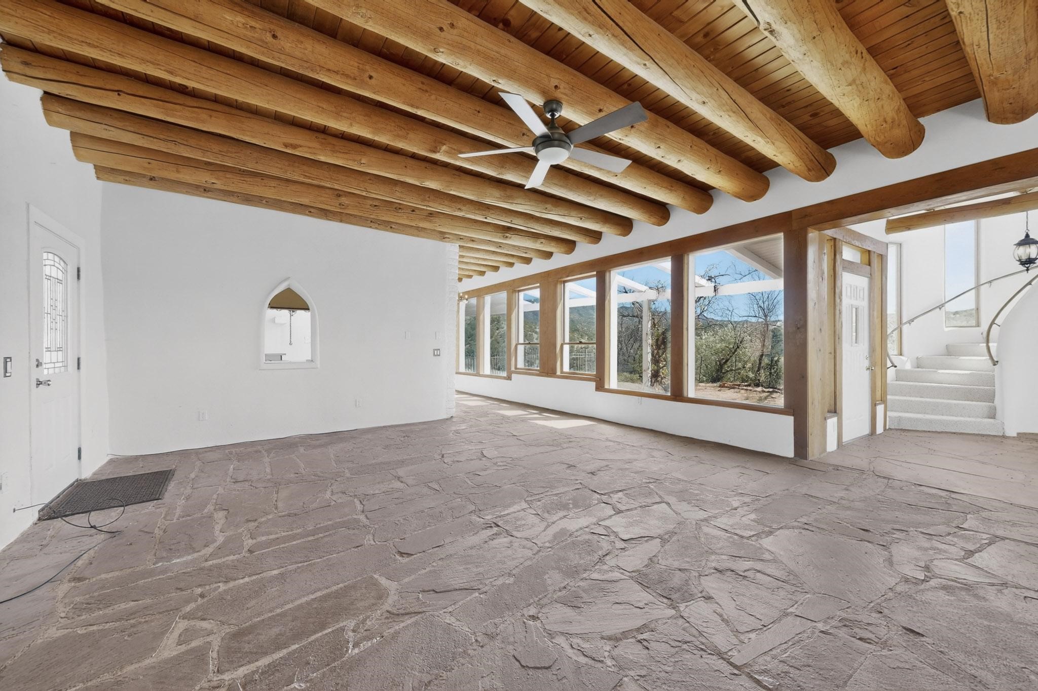Nestled on 5 acres in the enchanting foothills near Tesuque Village, this uniquely styled home captures the essence of Northern New Mexico living. Located in the quintessential village of Chupadero, the property blends timeless Southwestern charm with breathtaking natural surroundings. Inside, you'll find over 3,100 square feet of thoughtfully designed living space, highlighted by bold vigas, warm flagstone flooring throughout the first floor, and soaring ceilings that extend to the second level. The expansive kitchen and dining area is filled with natural light from dramatic floor-to-ceiling windows, offering both stunning views and passive solar efficiency. The home features two separate living rooms--one on each floor--providing flexibility for entertaining or quiet retreat. With 3 bedrooms and 3 bathrooms, including a convenient ground-floor bedroom, the layout is ideal for multigenerational living or guest accommodations. Step outside and immerse yourself in the beauty of Northern New Mexico. Enjoy direct access to mountain trails right from your backyard, along with sweeping views of the Jemez Mountains and moonrises over the Sangre de Cristo Mountains. At night, the unobstructed skies reveal a dazzling display of stars from every window. Despite its serene setting, the home is just 22 minutes from the historic Santa Fe Plaza and only 5-10 minutes from beloved local destinations like Terra, El Nido, and Tesuque Village Market.