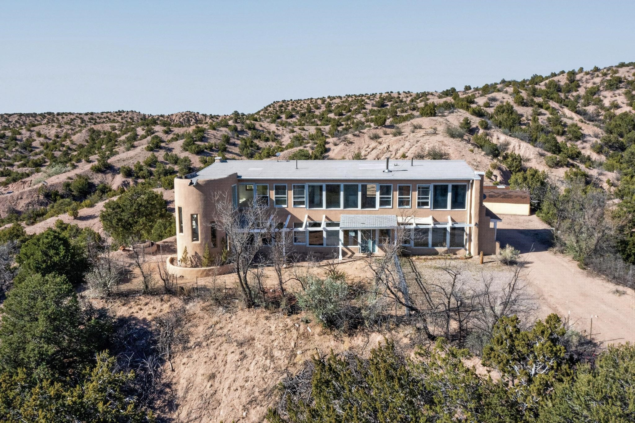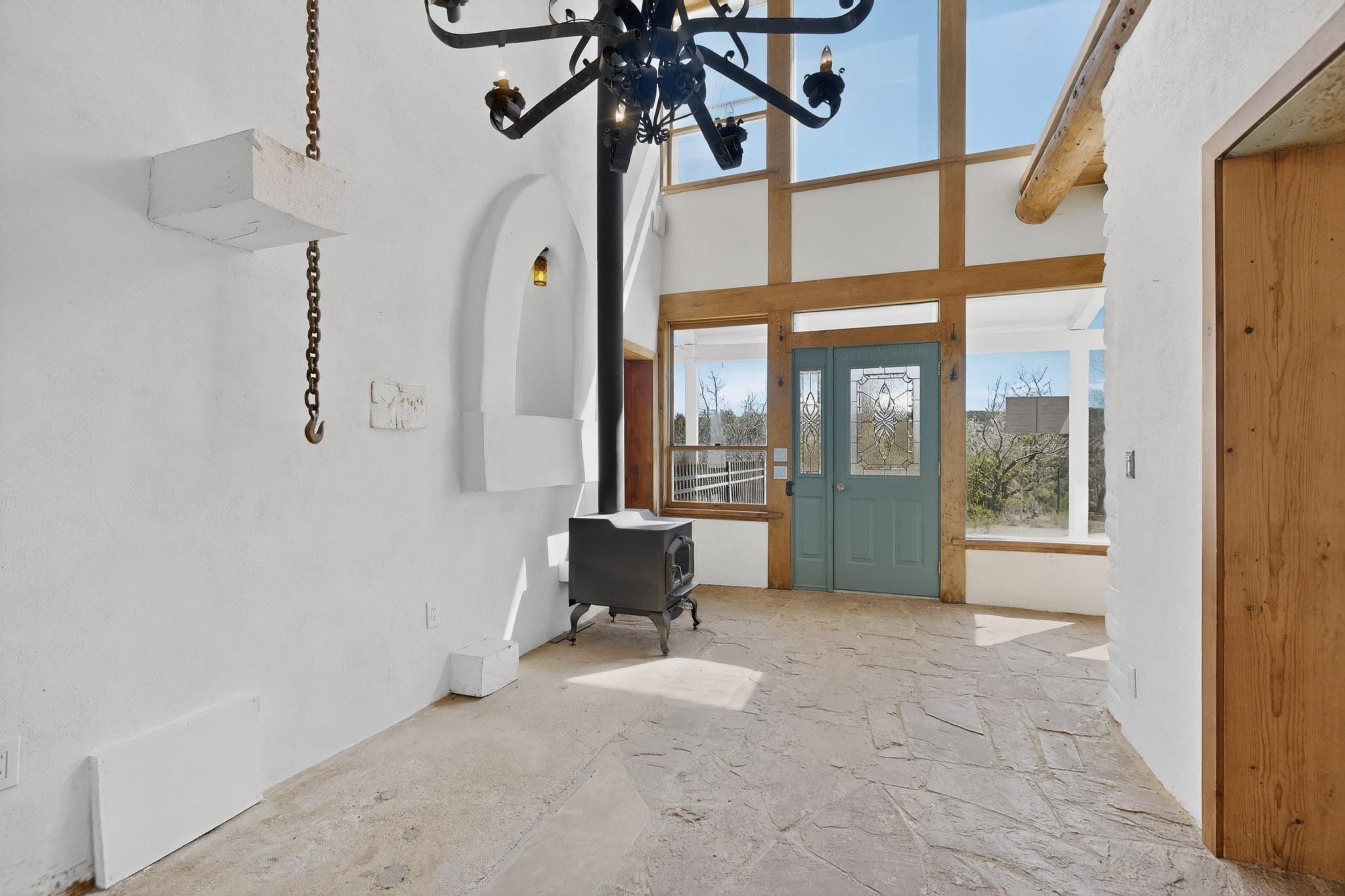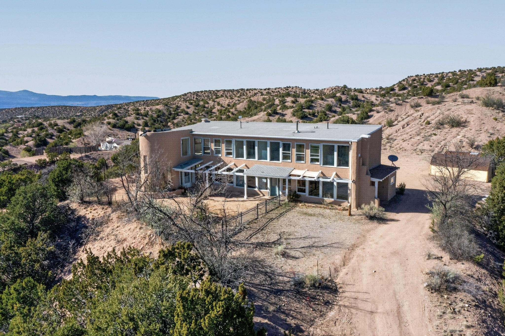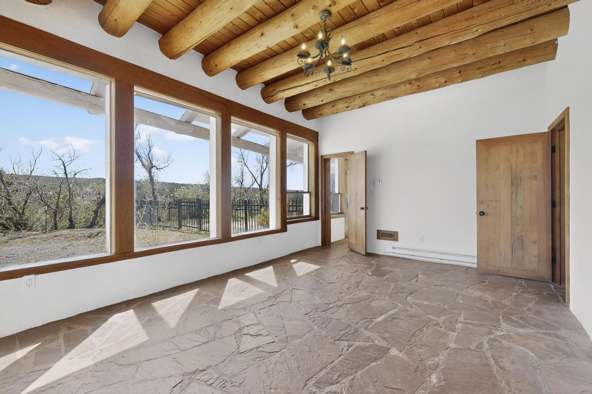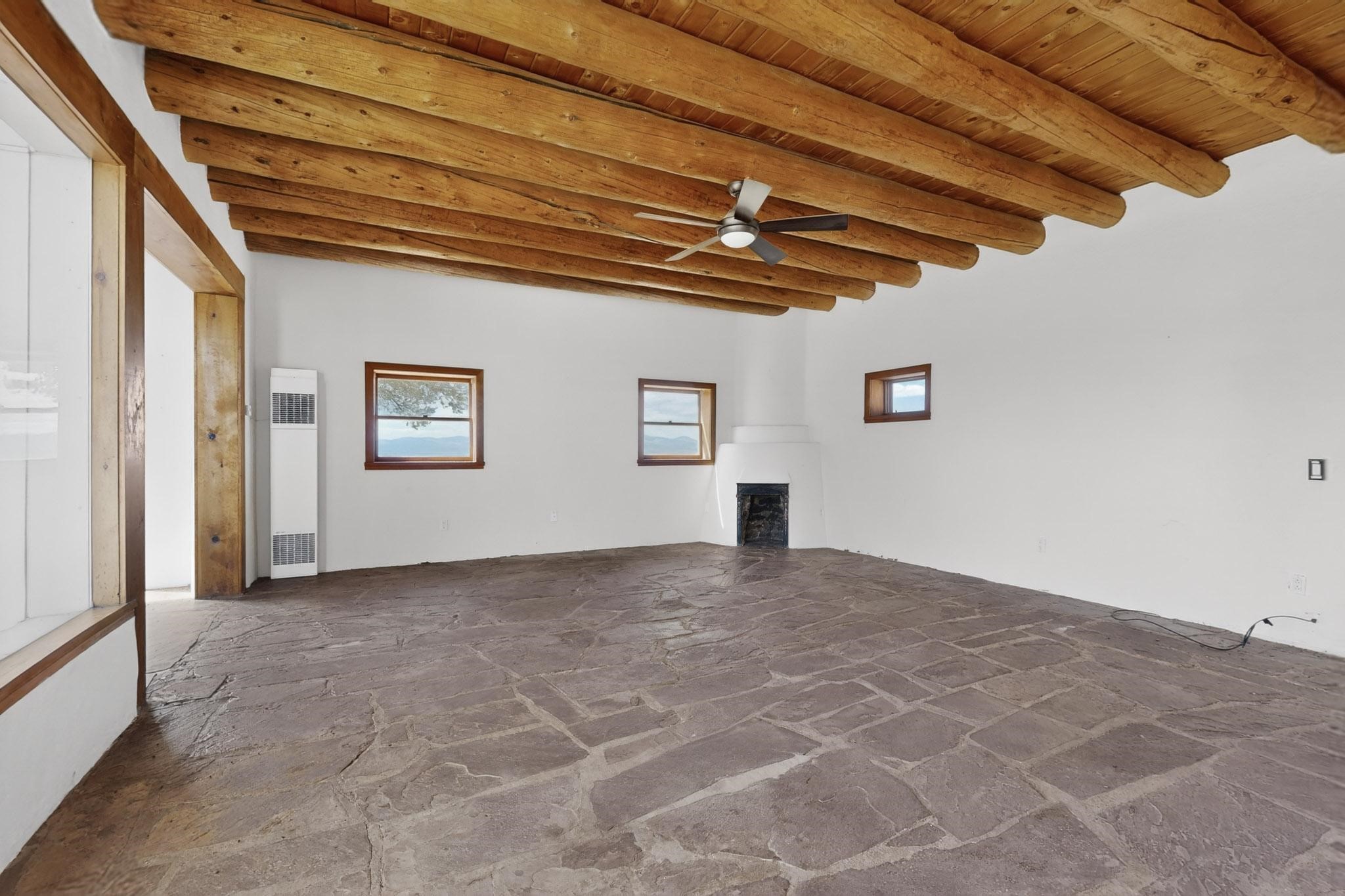 Nestled on 5 acres in the enchanting foothills near Tesuque Village, this uniquely styled home captures the essence of Northern New Mexico living. Located in the quintessential village of Chupadero, the property blends timeless Southwestern charm with breathtaking natural surroundings. Inside, you'll find over 3,100 square feet of thoughtfully designed living space, highlighted by bold vigas, warm flagstone flooring throughout the first floor, and soaring ceilings that extend to the second level. The expansive kitchen and dining area is filled with natural light from dramatic floor-to-ceiling windows, offering both stunning views and passive solar efficiency. The home features two separate living rooms--one on each floor--providing flexibility for entertaining or quiet retreat. With 3 bedrooms and 3 bathrooms, including a convenient ground-floor bedroom, the layout is ideal for multigenerational living or guest accommodations. Step outside and immerse yourself in the beauty of Northern New Mexico. Enjoy direct access to mountain trails right from your backyard, along with sweeping views of the Jemez Mountains and moonrises over the Sangre de Cristo Mountains. At night, the unobstructed skies reveal a dazzling display of stars from every window. Despite its serene setting, the home is just 22 minutes from the historic Santa Fe Plaza and only 5-10 minutes from beloved local destinations like Terra, El Nido, and Tesuque Village Market.