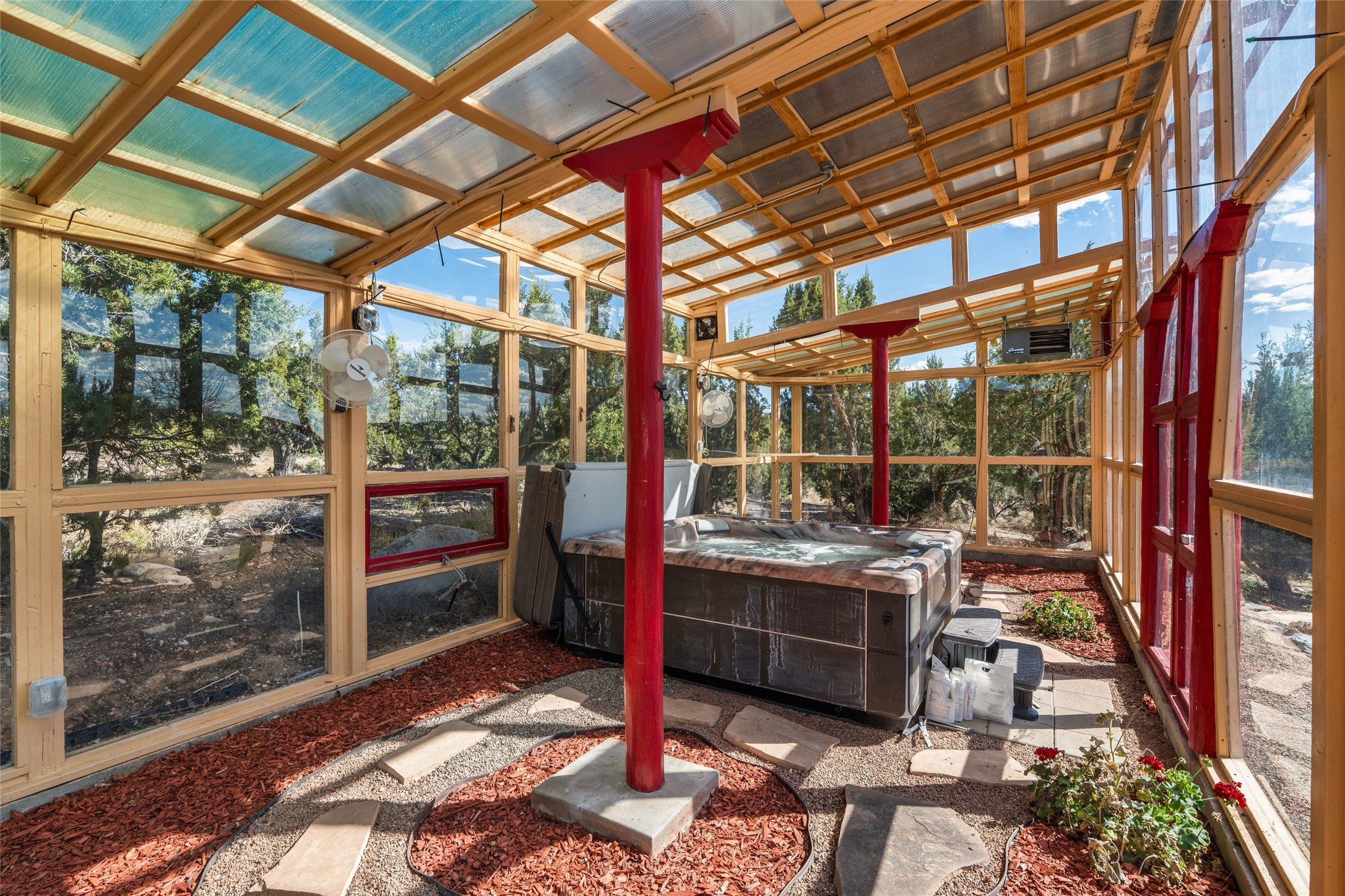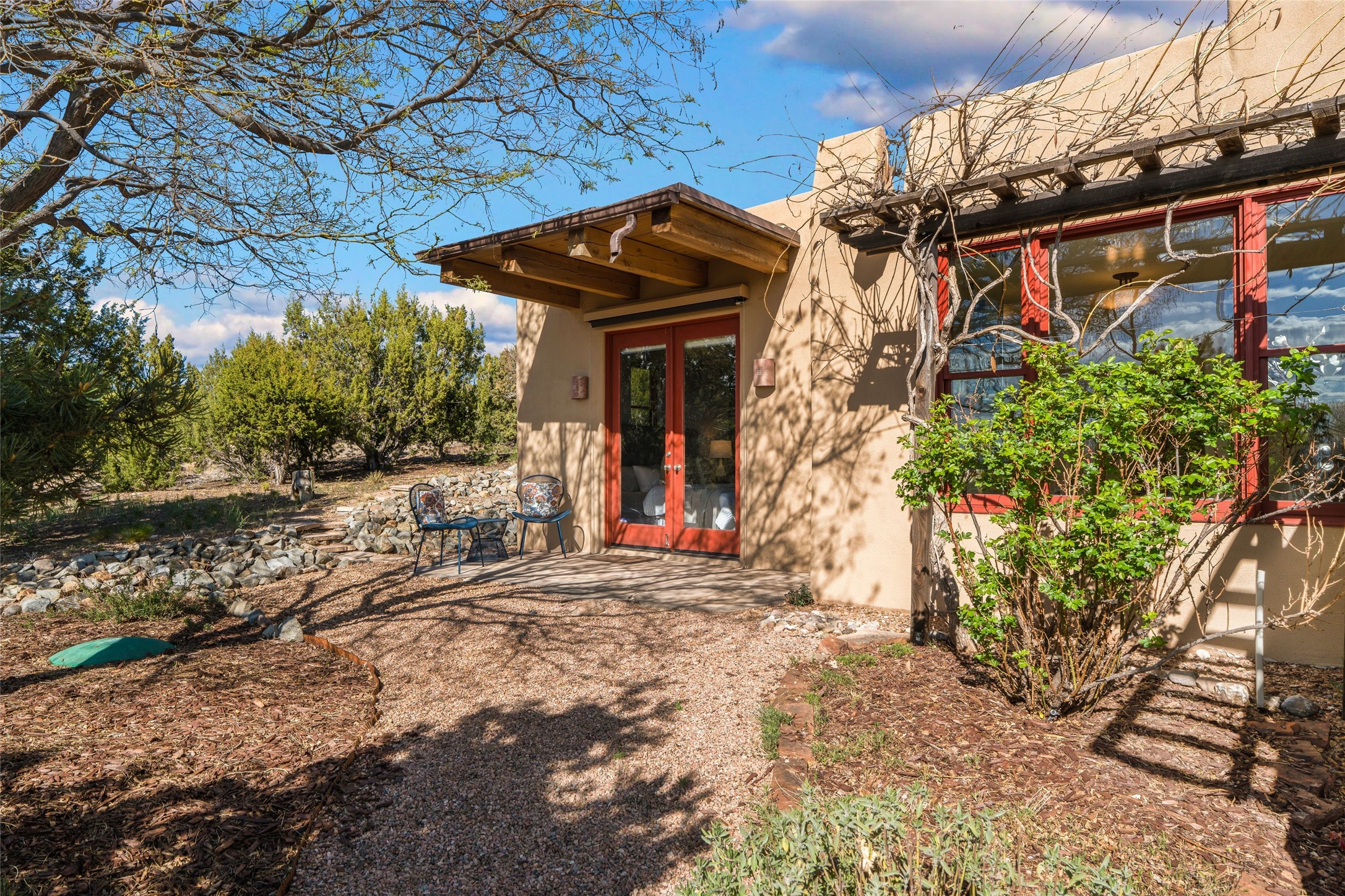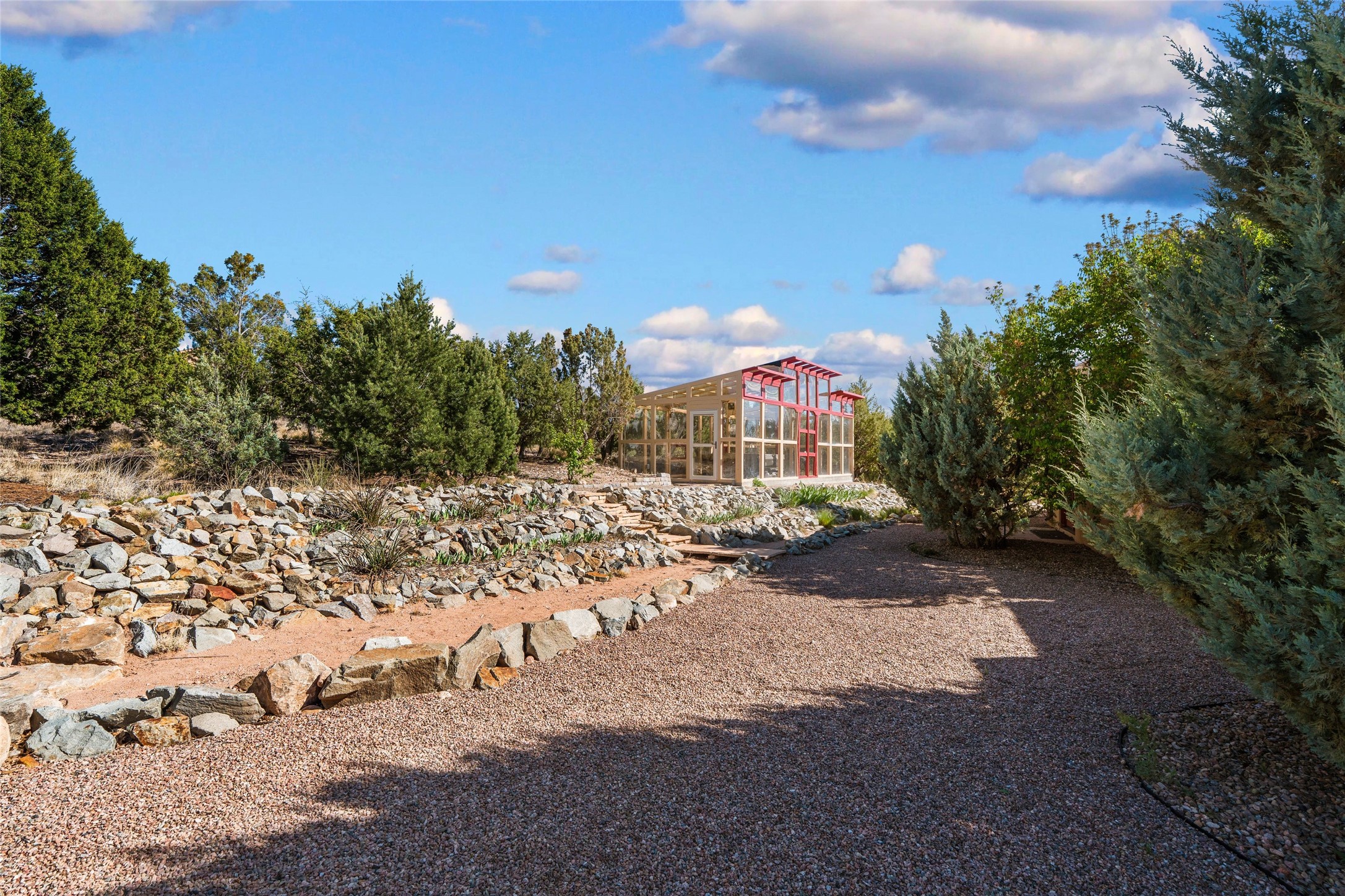 A sanctuary in nature while only minutes from town. Beautiful landscape, big views and custom finishes create this 2.7 acre dream. Inside the home showcases soaring ceilings and timeless natural finishes cultivating earthy elegance throughout. This space invites connection to nature at every turn: prepare meals while taking in glowing sunsets, unwind in the bath feeling surrounded by nature or find your creativity in the studio tucked into a private natural spot. Hone your skills in the large workshop or fine tune your gardening talents in the greenhouse. With a hot tub to relax and enjoy views, multiple patios to bring living outside, fruit trees and grape vines to partake of, solar to keep costs down and full irrigation, this is a haven, a refuge. Expansive grounds, tranquil atmosphere and big country feel-yet just minutes from town-this one-of-a-kind property offers the perfect balance of seclusion, beauty and convenience. Well maintained with many tasteful updates. Come and experience.