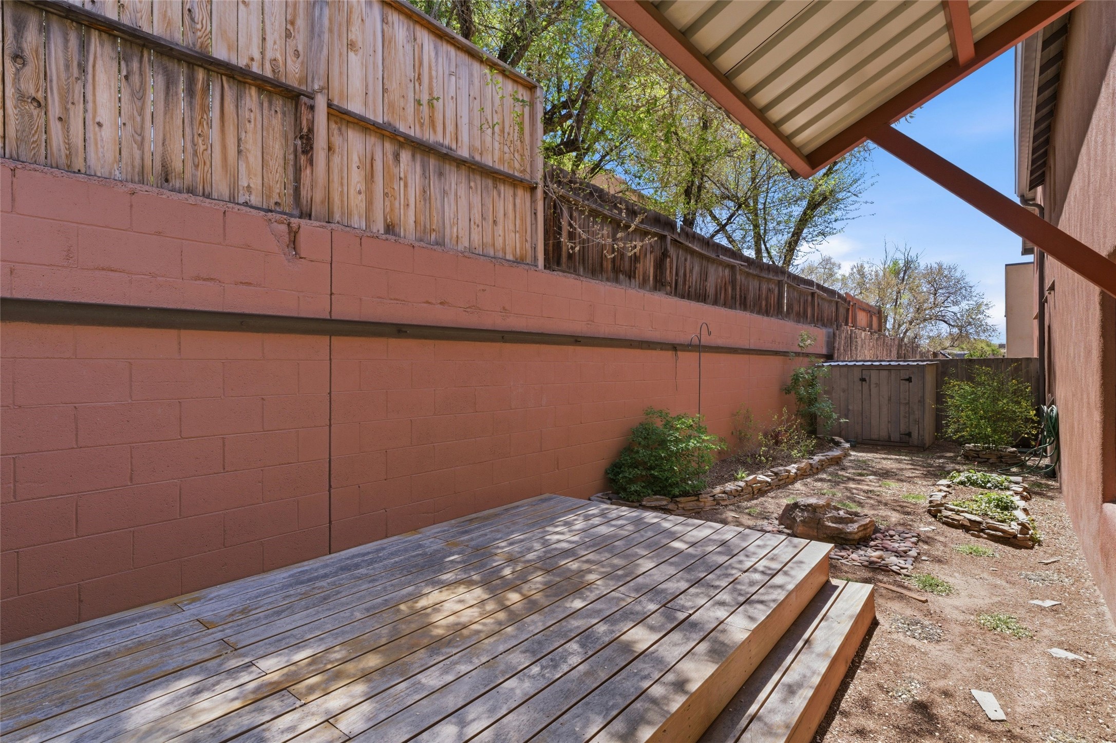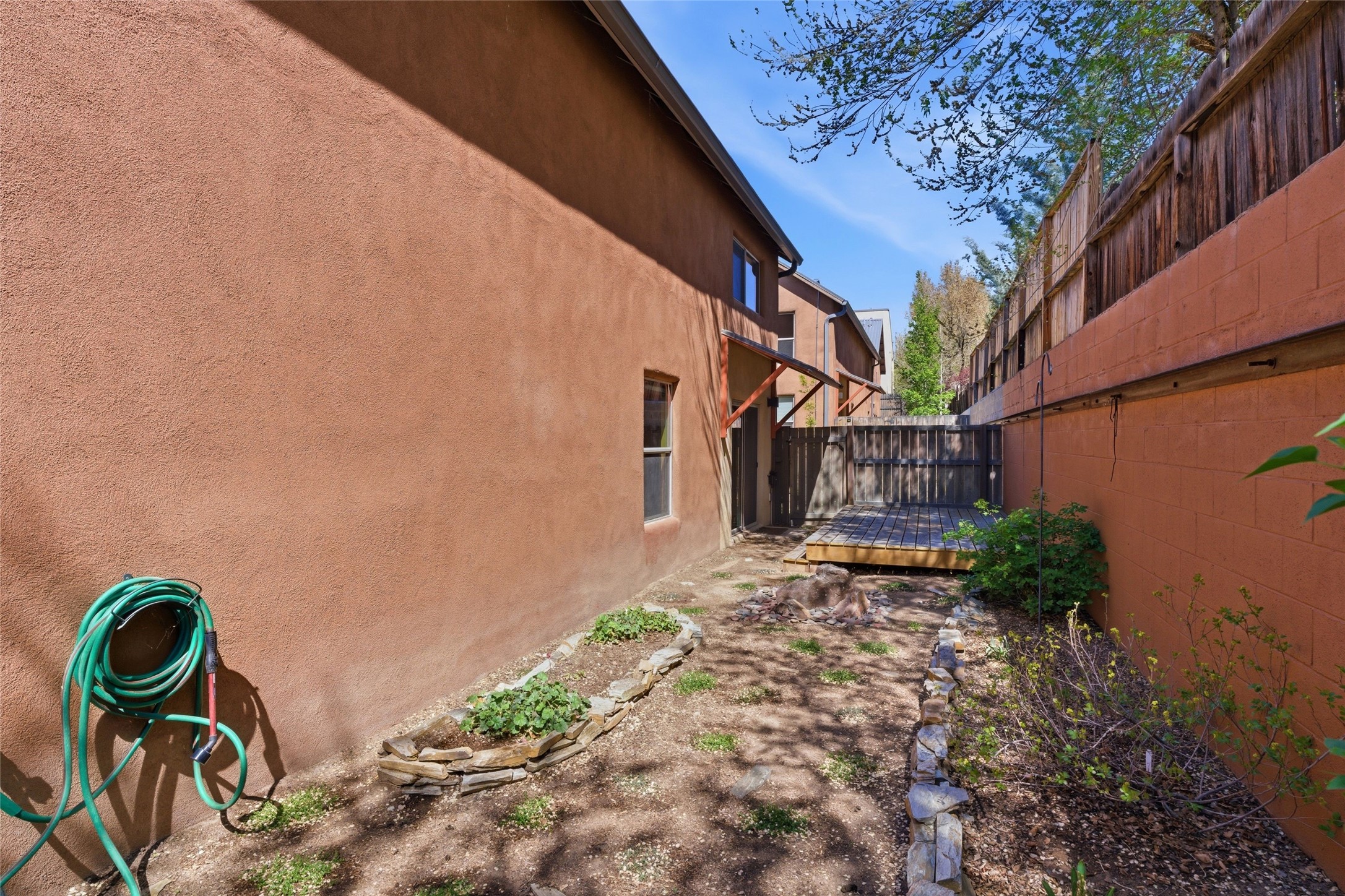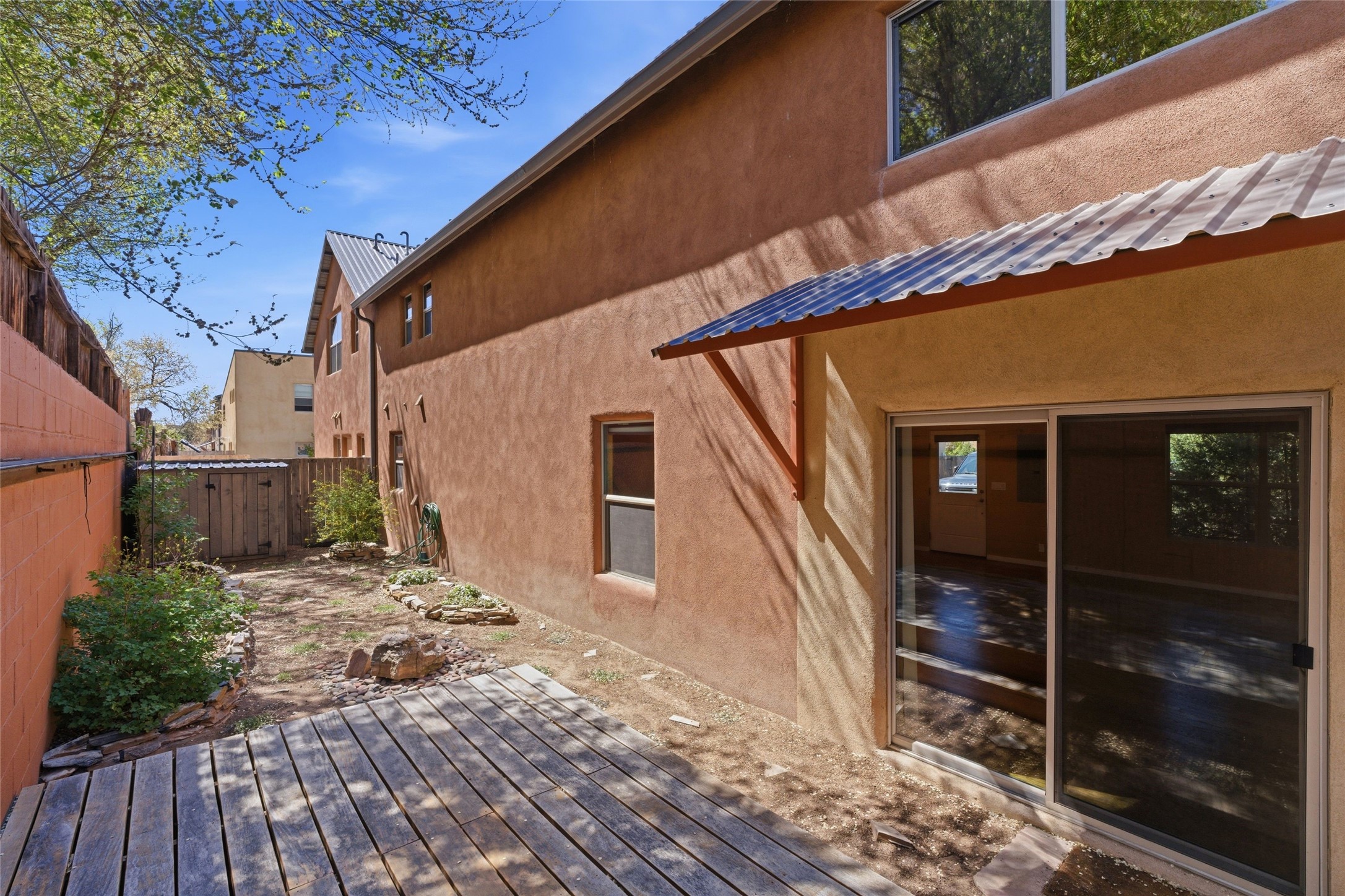 Located in the desirable River Trail Lofts community, 2180 W Alameda Unit 14 offers a rare blend of comfort, understated luxury, and a peaceful yet convenient Santa Fe location. This beautifully maintained four-bedroom, two-bath residence provides approximately 1,877 square feet of thoughtfully designed living space across a bright and functional two-story floor plan, with direct access to the Santa Fe River Trail just outside the front door. The interior showcases quality finishes and refined details, including radiant in-floor heating, real red oak flooring, high and vaulted ceilings, generous closet space, upgraded kitchen appliances, ceiling fans, and top-down bottom-up cellular blinds throughout. The kitchen and bathrooms feature padded gym flooring for added comfort, while the laundry room is finished with tile for durability and ease of maintenance. The private backyard has been transformed into a serene outdoor retreat, complete with a custom hardwood deck, fountain, custom storage shed, flower beds, shrubs, new ground coverings, and automated irrigation. This inviting outdoor living space feels like a natural extension of the home and is ideal for outdoor dining, entertaining, or quiet relaxation. River Trail Lofts is tucked below Alameda on a no-through street, offering a quiet, private setting with minimal traffic while remaining just minutes from downtown Santa Fe, the Railyard District, shopping, dining, and the airport. This property presents a unique opportunity to enjoy comfort, privacy, trail access, and low-maintenance luxury living in one of Santa Fe's most convenient locations.
