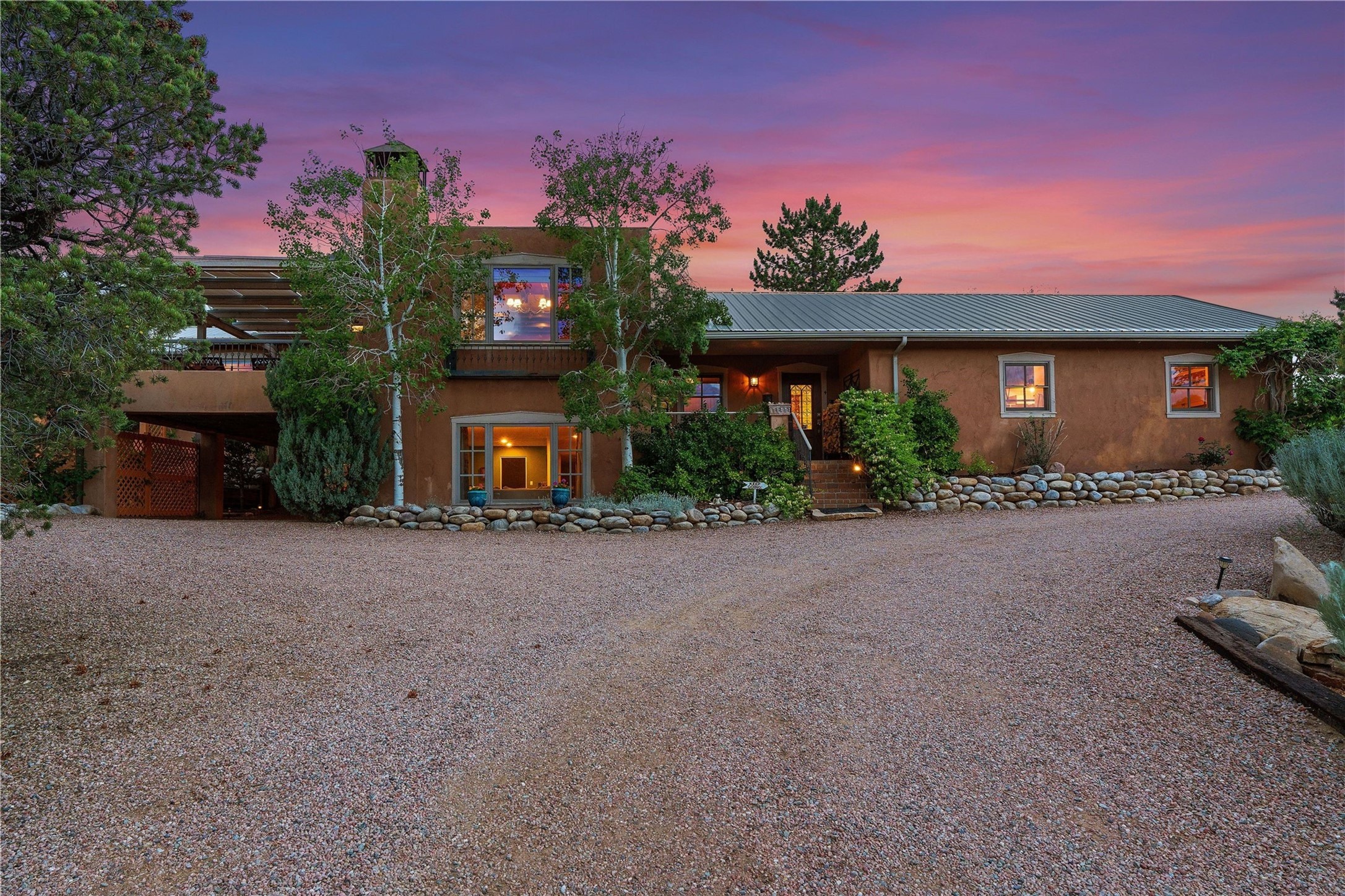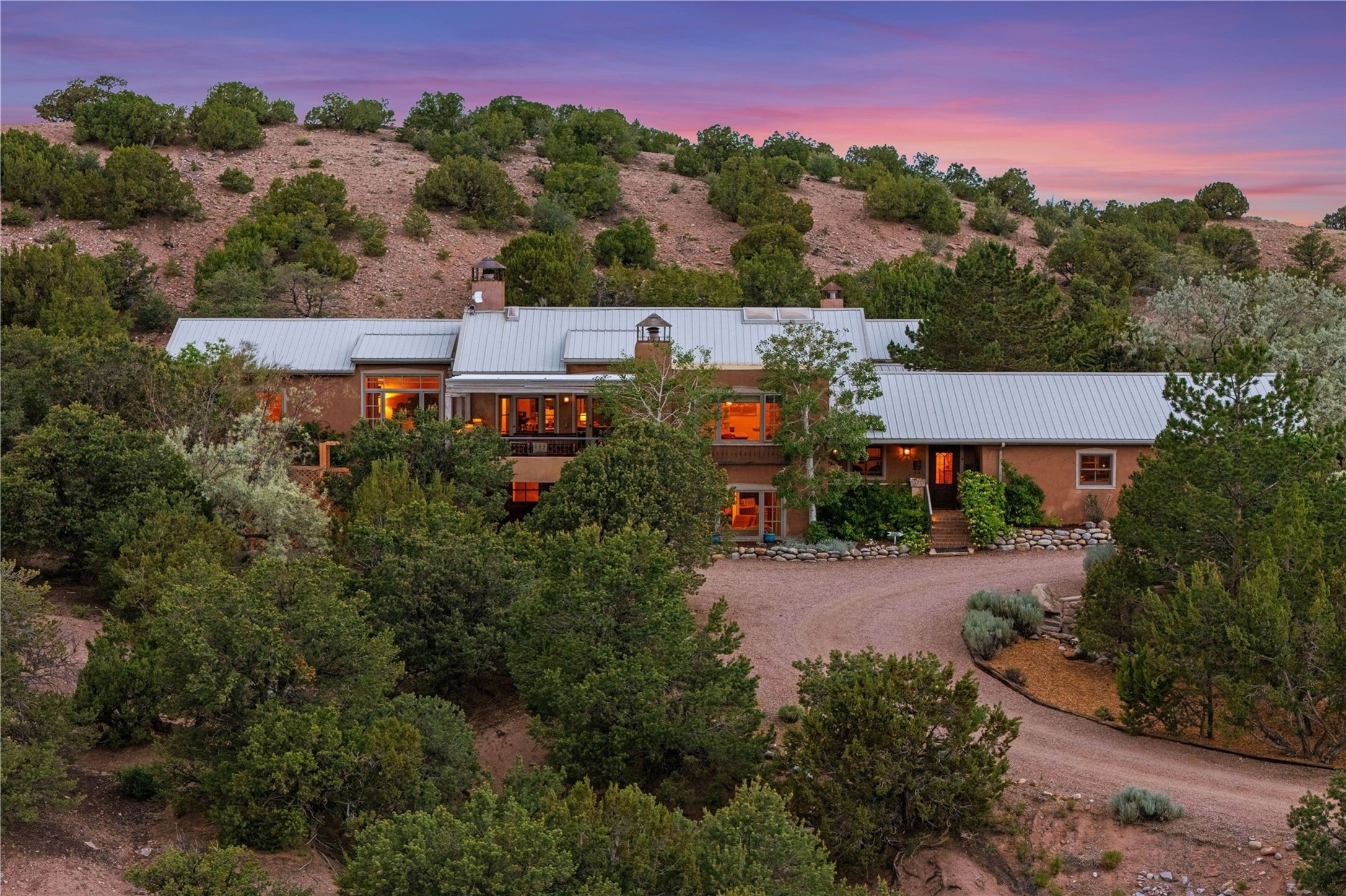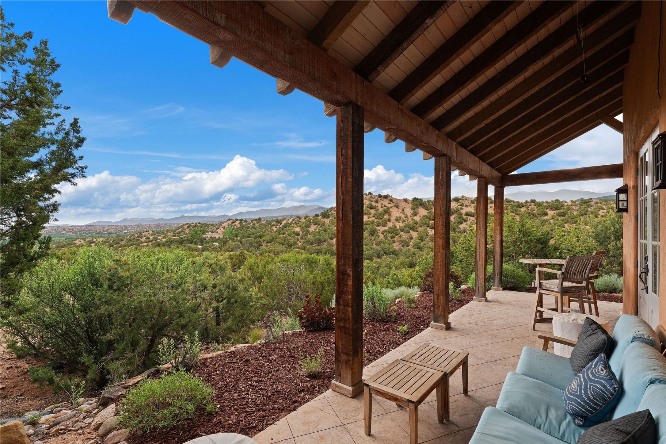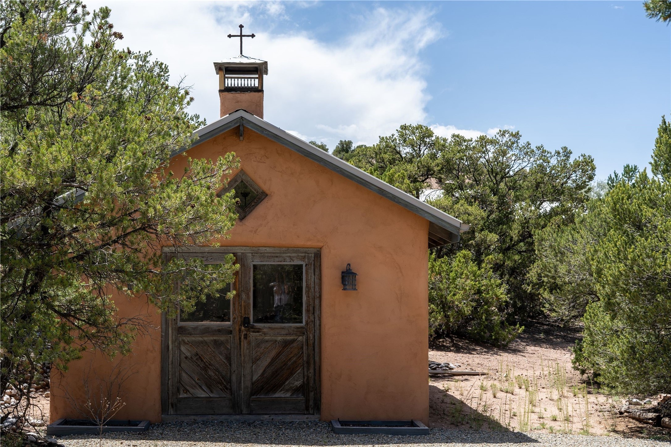 A magnificent European inspired estate sited on a hilltop, with breathtaking views of the Sangre de Cristo Mountains, and spanning 7.7 acres of lush sanctuary. This property features a stunning main house, charming detached casita, and chapel that has been transformed into an artist/musician's studio. The main house, adorned with bespoke decor, offers 3 bedrooms, 3 full and 2 half baths, library and an office. Showcasing hand-painted 18th century French ceiling beams, arched stone columns, and a blend of wood and stone floors. Antique doors, stained glass skylights, and custom built-ins enhance the expansive living spaces. The spacious master suite includes a sitting area with majestic mountain views and a hand painted clawfoot soaking tub. The lower level offers comfortable guest or caretaker quarters with two distinct living areas, a full kitchen, an office, as well as private entrance through covered parking for privacy and convenience. The detached casita is complete with a kitchen, bedroom, bath, and a charming front porch with a breathtaking view to Taos. Recent upgrades include modern heating and cooling systems for both the main house and casita, along with new kitchens featuring updated counters and cabinetry and new septic (2026). Experience total outdoor serenity from the oversized deck to the rose and vegetable gardens, just 8 minutes from downtown Santa Fe!