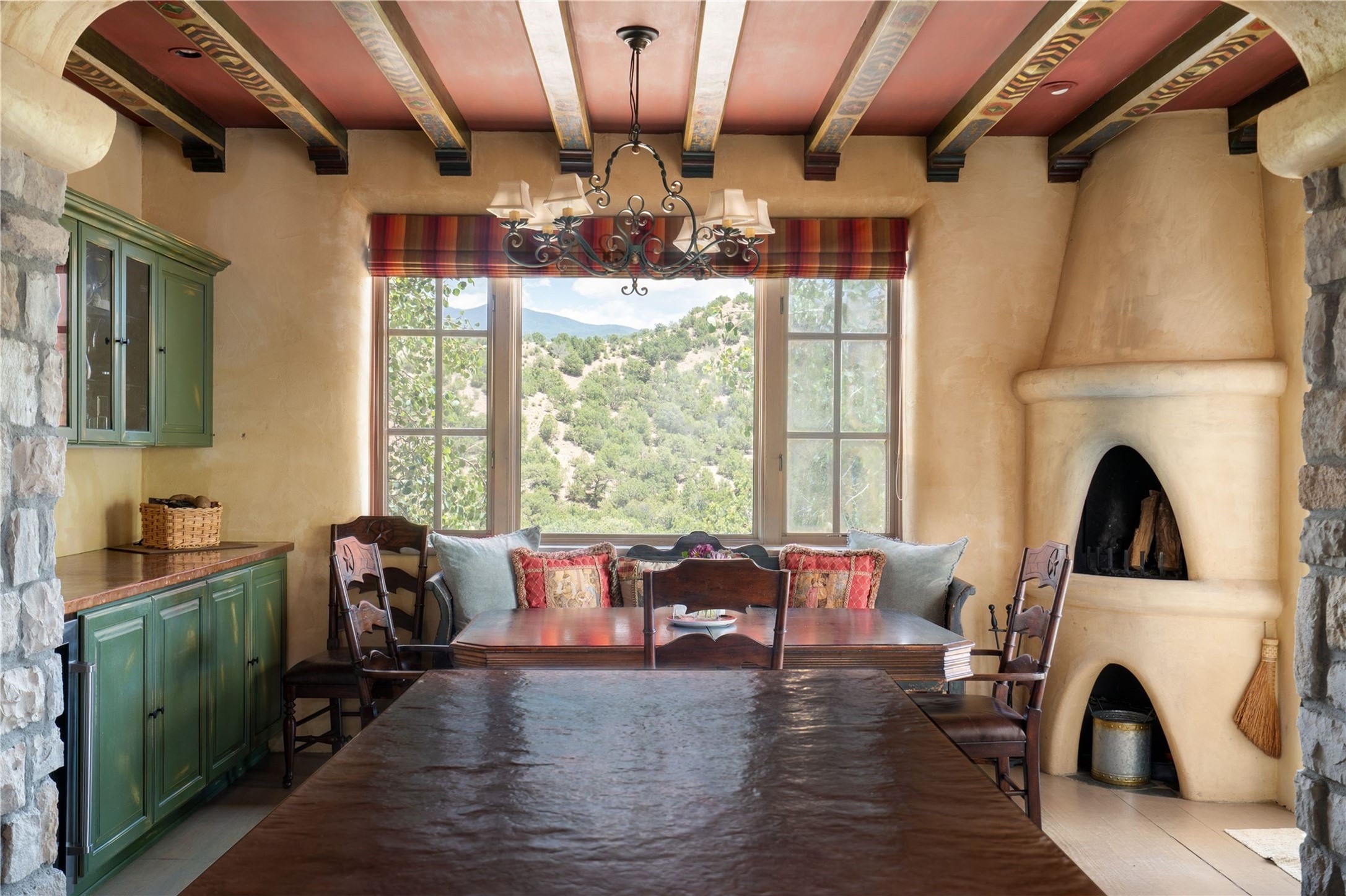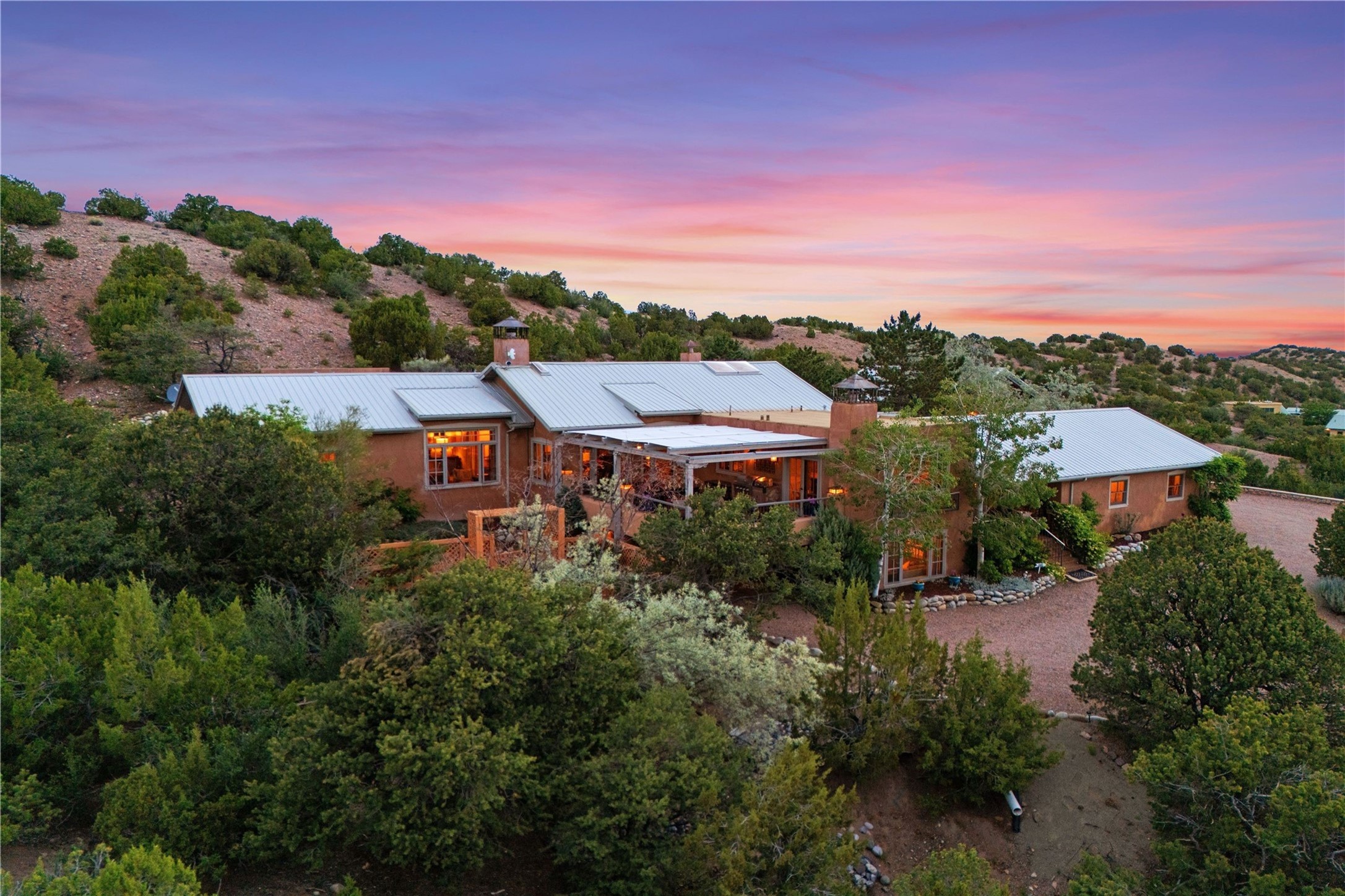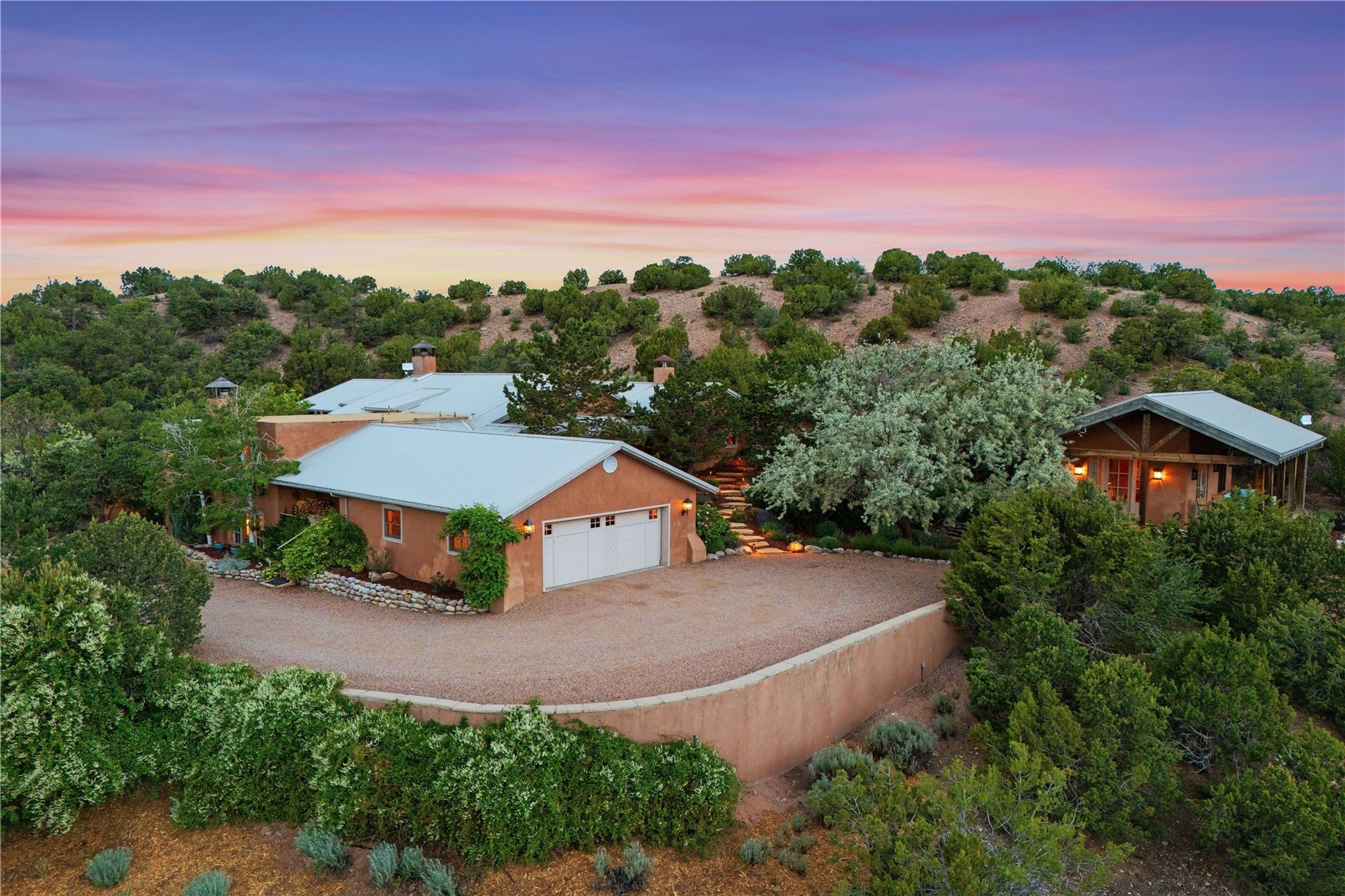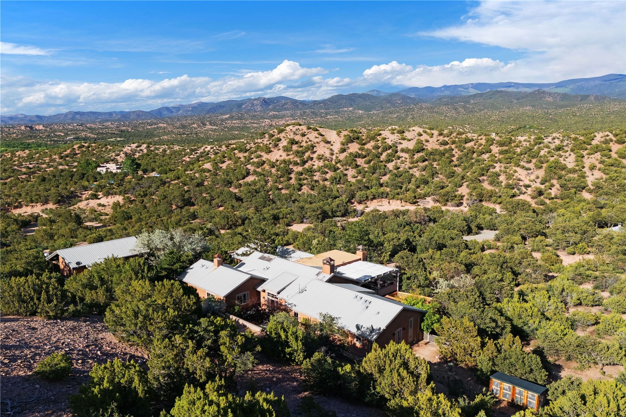 A magnificent European inspired estate sited on a hilltop, with breathtaking views of the Sangre de Cristo Mountains, and spanning 7.7 acres of lush sanctuary. This property features a stunning main house, charming detached casita, and chapel that has been transformed into an artist/musician's studio. The main house, adorned with bespoke decor, offers 3 bedrooms, 3 full and 2 half baths, library and an office. Showcasing hand-painted 18th century French ceiling beams, arched stone columns, and a blend of wood and stone floors. Antique doors, stained glass skylights, and custom built-ins enhance the expansive living spaces. The spacious master suite includes a sitting area with majestic mountain views and a hand painted clawfoot soaking tub. The lower level offers comfortable guest or caretaker quarters with two distinct living areas, a full kitchen, an office, as well as private entrance through covered parking for privacy and convenience. The detached casita is complete with a kitchen, bedroom, bath, and a charming front porch with a breathtaking view to Taos. Recent upgrades include modern heating and cooling systems for both the main house and casita, along with new kitchens featuring updated counters and cabinetry and new septic (2026). Experience total outdoor serenity from the oversized deck to the rose and vegetable gardens, just 8 minutes from downtown Santa Fe!