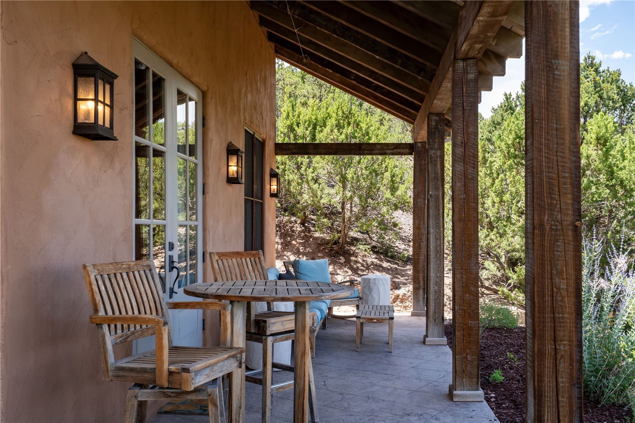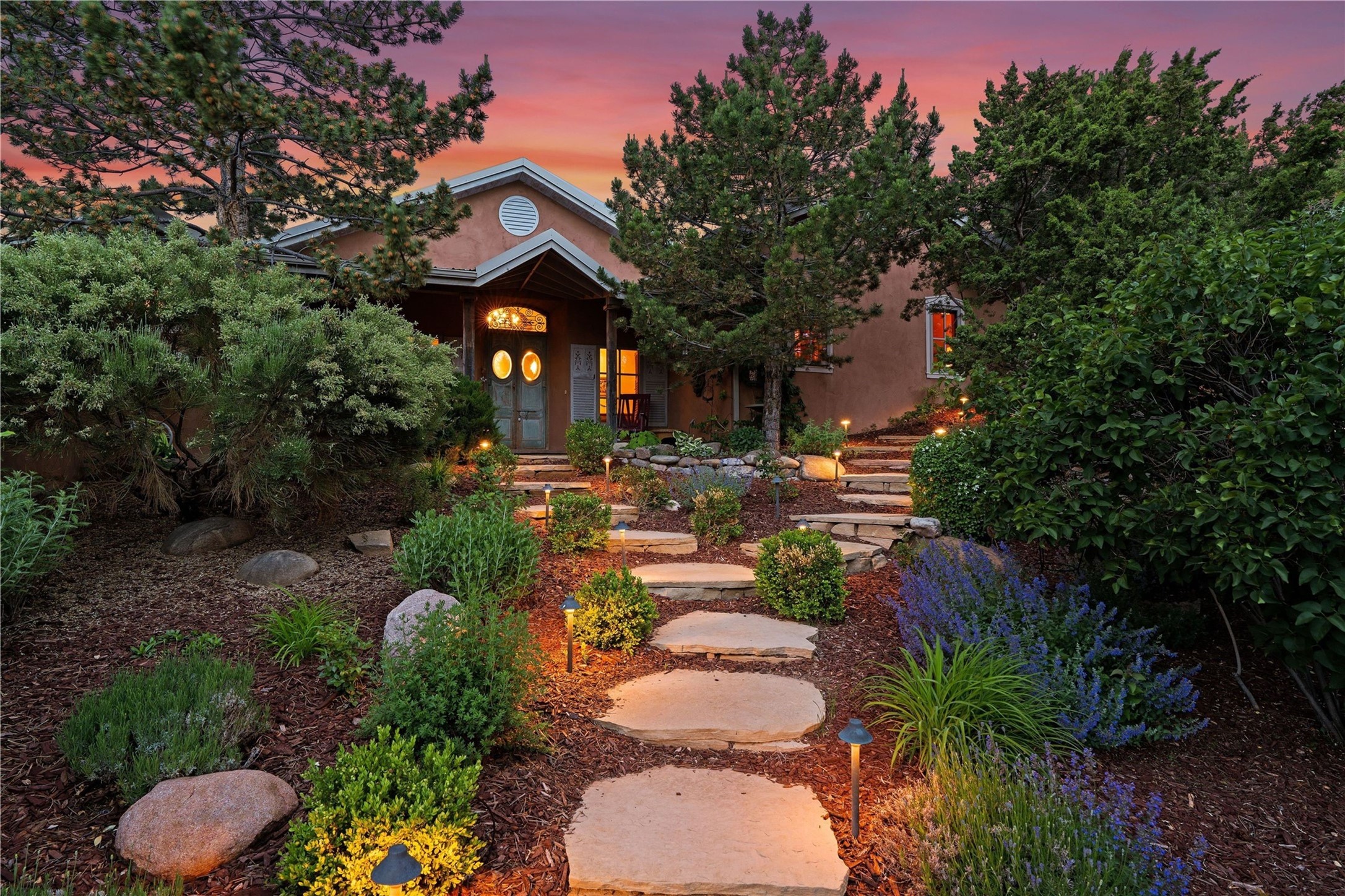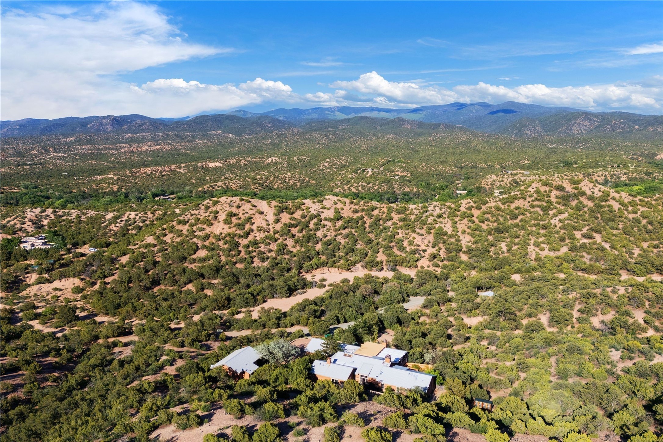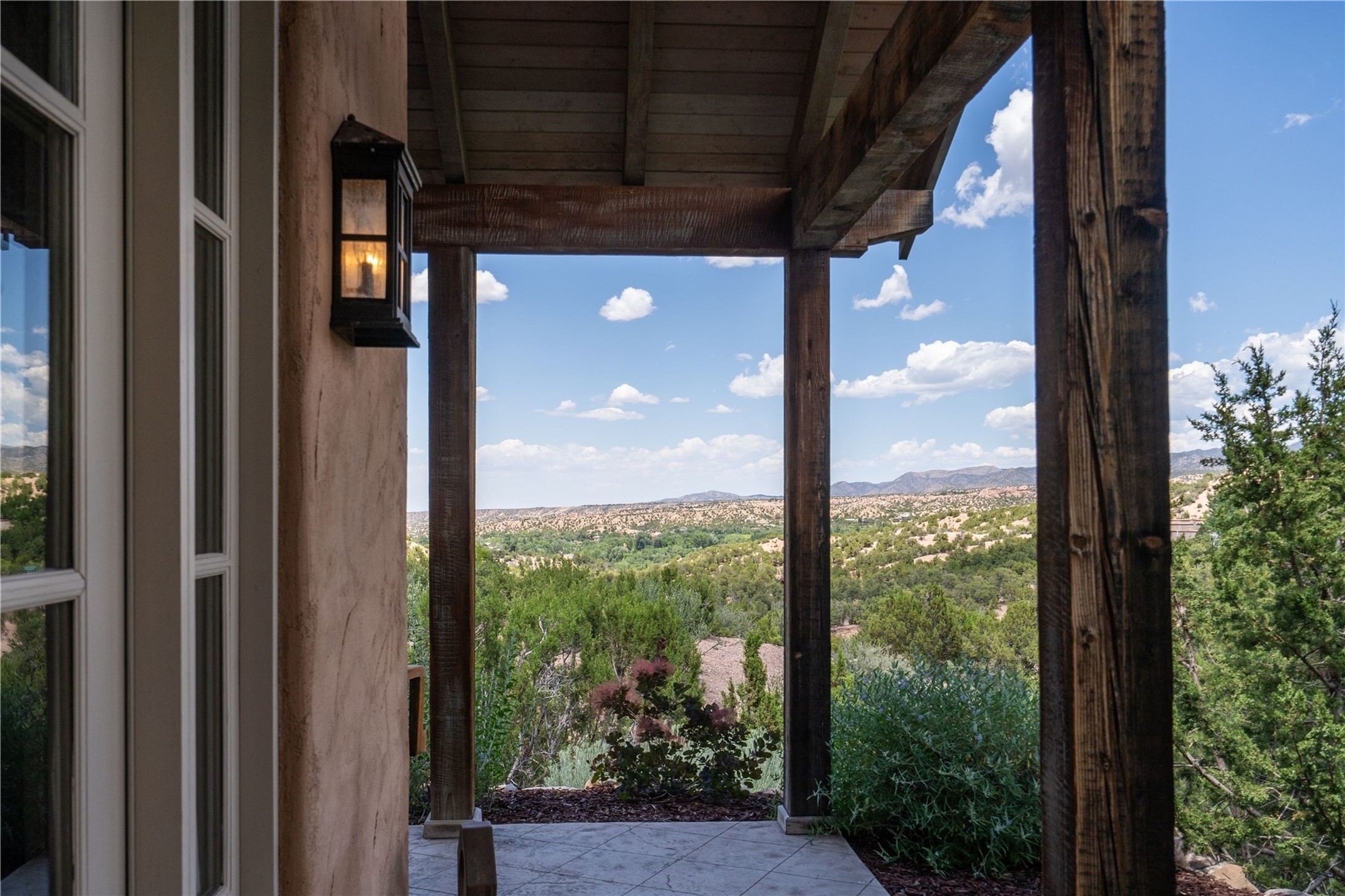 A magnificent European inspired estate sited on a hilltop, with breathtaking views of the Sangre de Cristo Mountains, and spanning 7.7 acres of lush sanctuary. This property features a stunning main house, charming detached casita, and chapel that has been transformed into an artist/musician's studio. The main house, adorned with bespoke decor, offers 3 bedrooms, 3 full and 2 half baths, library and an office. Showcasing hand-painted 18th century French ceiling beams, arched stone columns, and a blend of wood and stone floors. Antique doors, stained glass skylights, and custom built-ins enhance the expansive living spaces. The spacious master suite includes a sitting area with majestic mountain views and a hand painted clawfoot soaking tub. The lower level offers comfortable guest or caretaker quarters with two distinct living areas, a full kitchen, an office, as well as private entrance through covered parking for privacy and convenience. The detached casita is complete with a kitchen, bedroom, bath, and a charming front porch with a breathtaking view to Taos. Recent upgrades include modern heating and cooling systems for both the main house and casita, along with new kitchens featuring updated counters and cabinetry and new septic (2026). Experience total outdoor serenity from the oversized deck to the rose and vegetable gardens, just 8 minutes from downtown Santa Fe!