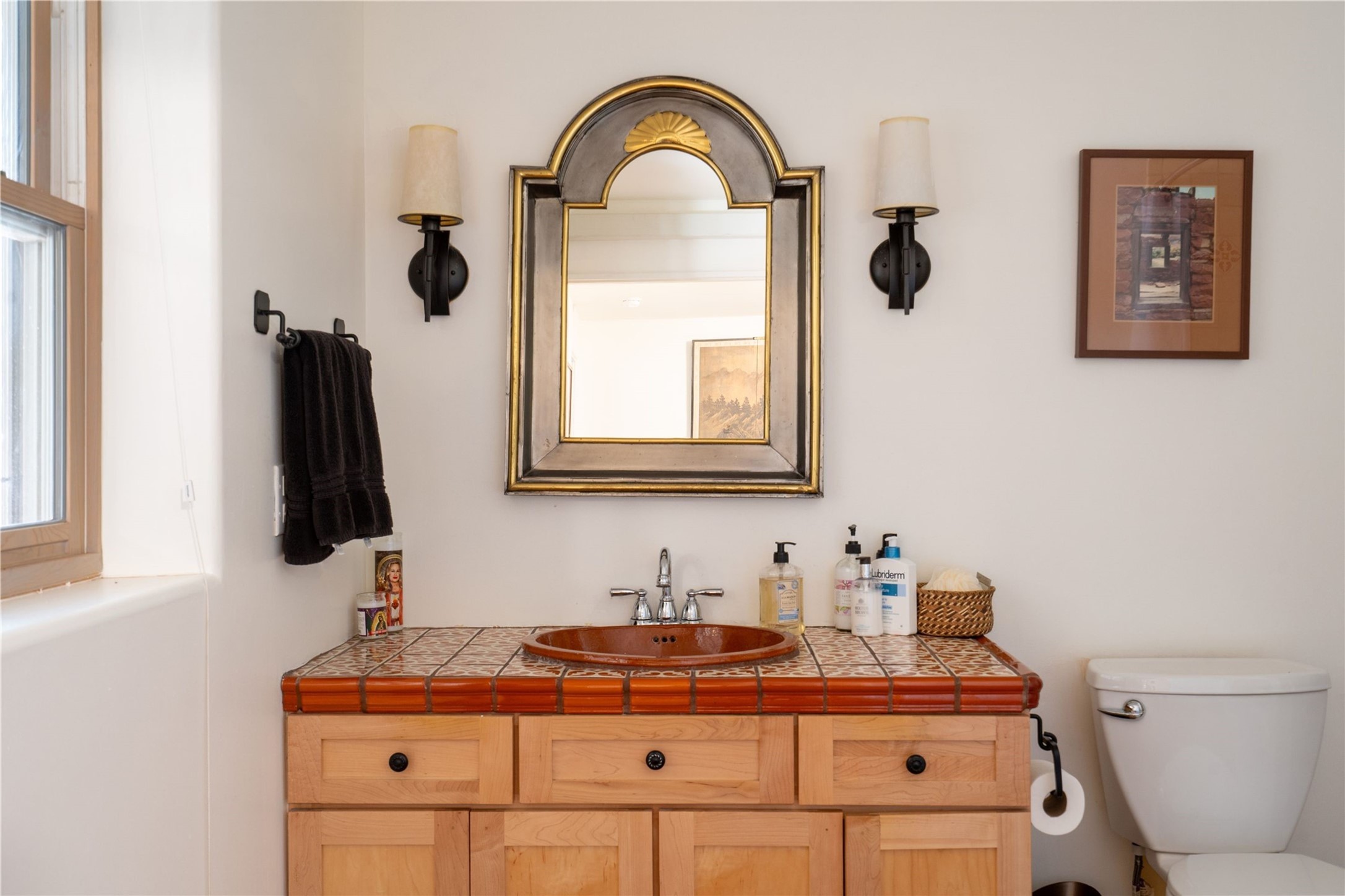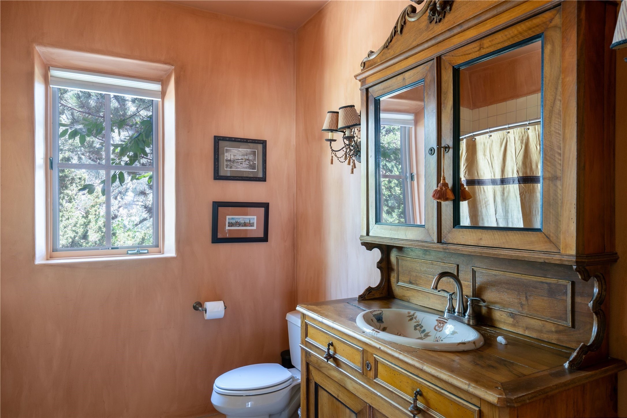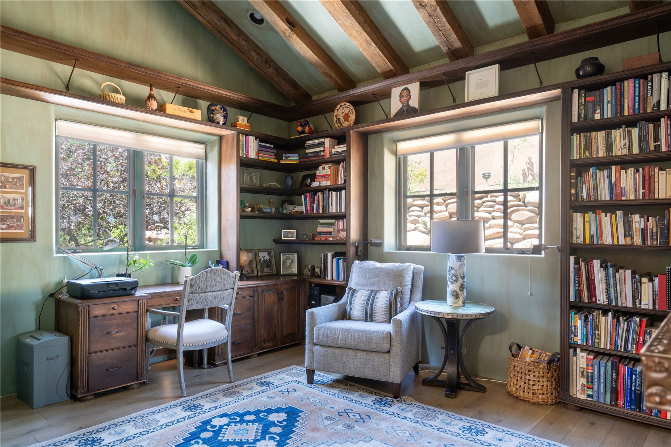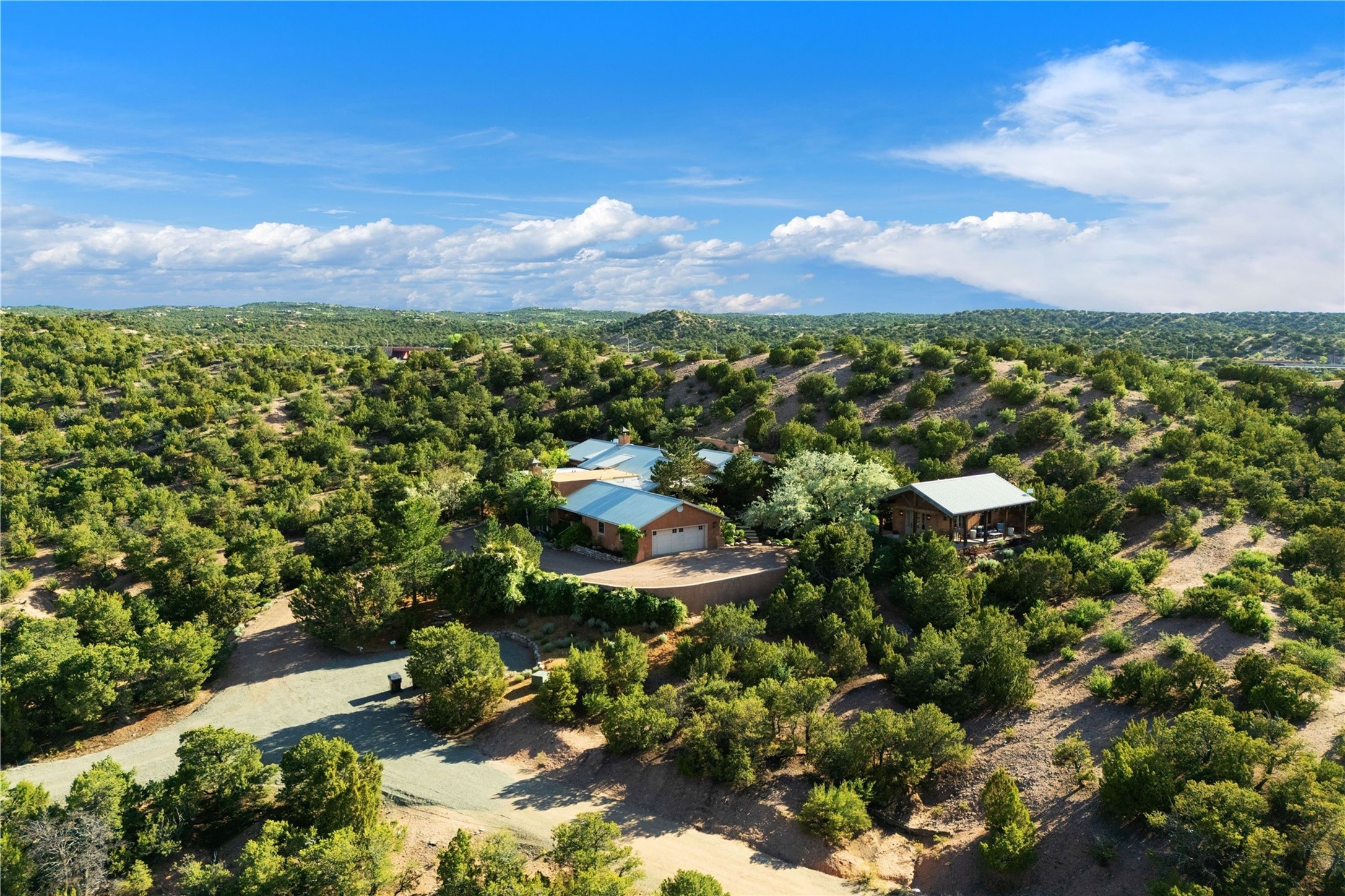A magnificent European inspired estate sited on a hilltop, with breathtaking views of the Sangre de Cristo Mountains, and spanning 7.7 acres of lush sanctuary. This property features a stunning main house, charming detached casita, and chapel that has been transformed into an artist/musician's studio. The main house, adorned with bespoke decor, offers 3 bedrooms, 3 full and 2 half baths, library and an office. Showcasing hand-painted 18th century French ceiling beams, arched stone columns, and a blend of wood and stone floors. Antique doors, stained glass skylights, and custom built-ins enhance the expansive living spaces. The spacious master suite includes a sitting area with majestic mountain views and a hand painted clawfoot soaking tub. The lower level offers comfortable guest or caretaker quarters with two distinct living areas, a full kitchen, an office, as well as private entrance through covered parking for privacy and convenience. The detached casita is complete with a kitchen, bedroom, bath, and a charming front porch with a breathtaking view to Taos. Recent upgrades include modern heating and cooling systems for both the main house and casita, along with new kitchens featuring updated counters and cabinetry and new septic (2026). Experience total outdoor serenity from the oversized deck to the rose and vegetable gardens, just 8 minutes from downtown Santa Fe!