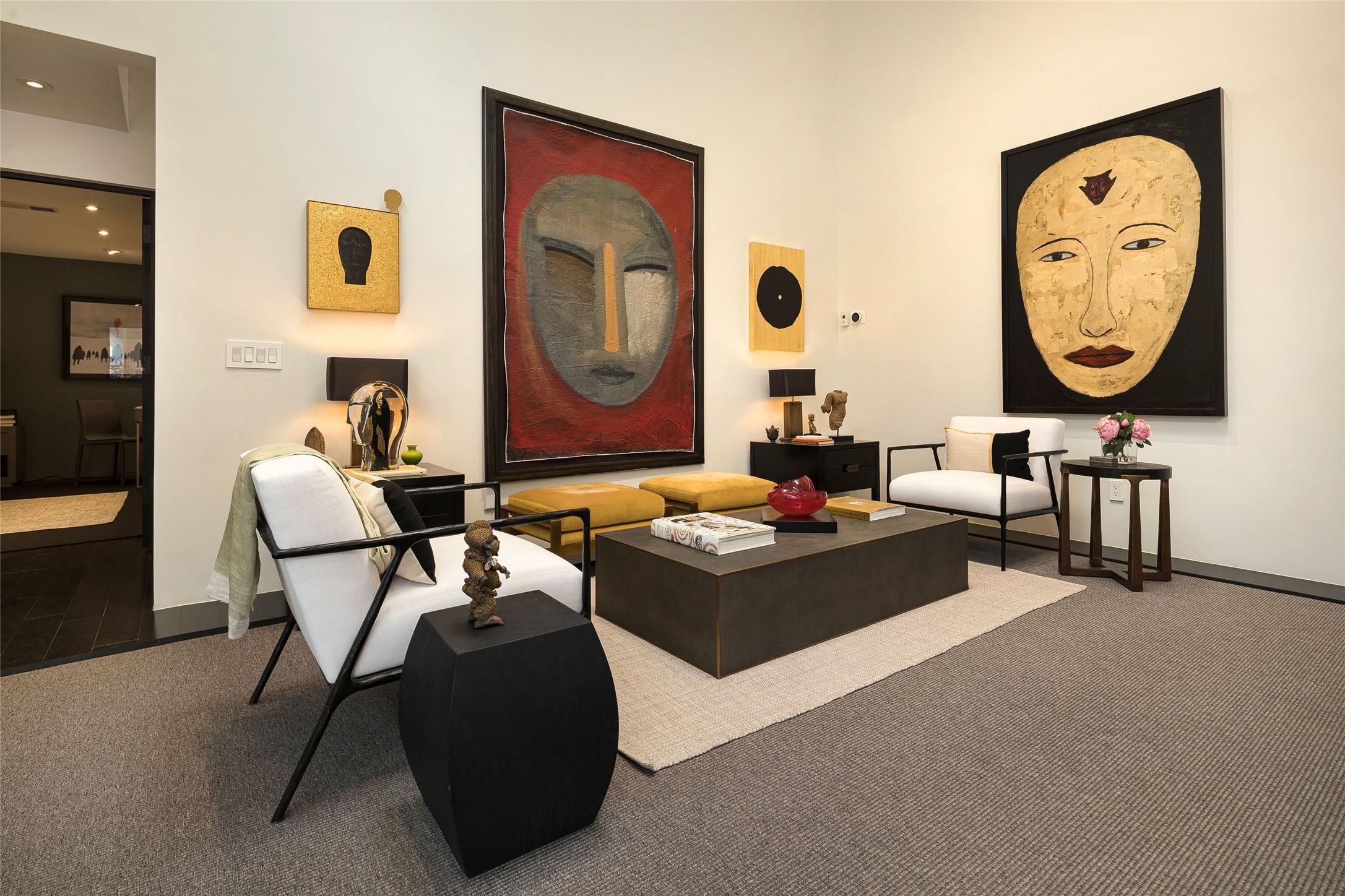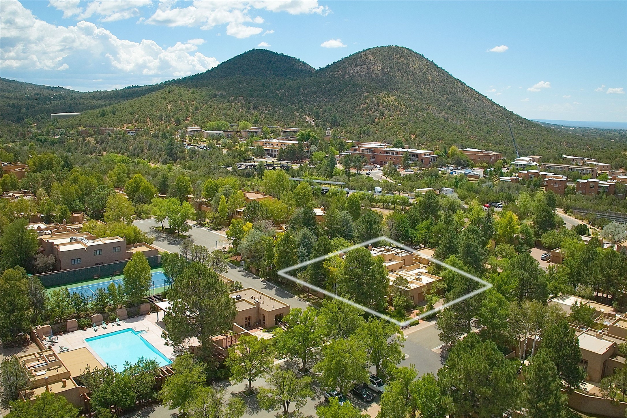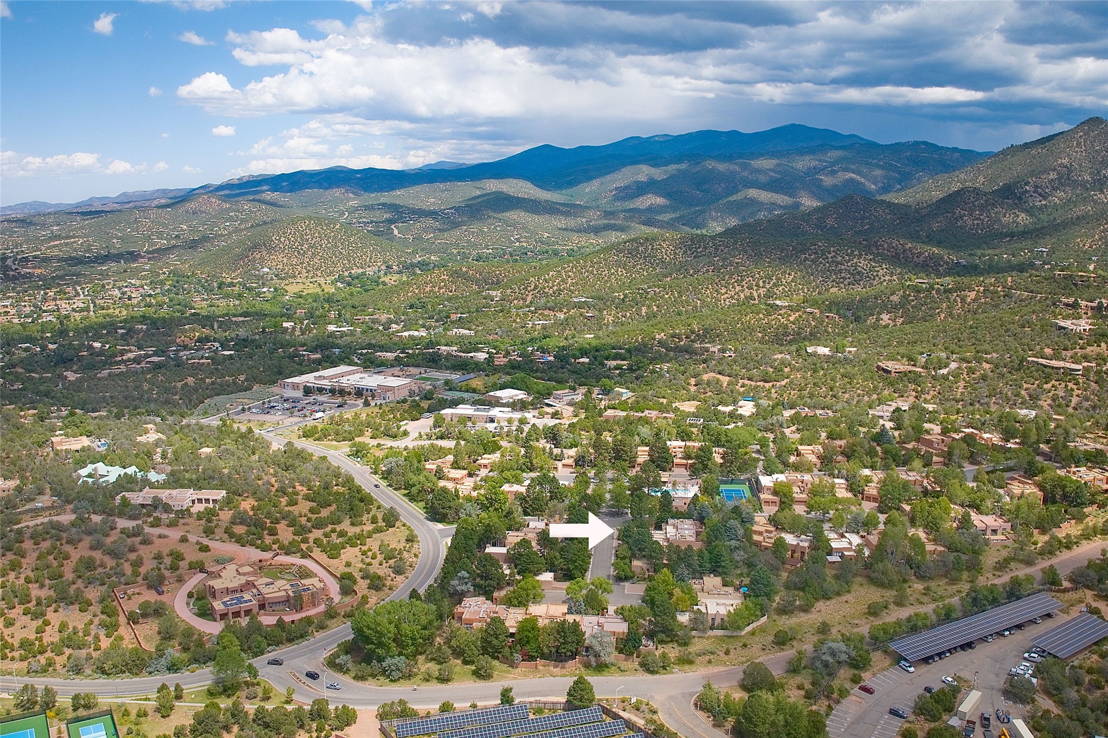 Exquisite Los Miradores 4-bedroom, 4.5-bath condo, where modern elegance meets artistic finesse. This stunning residence was reimagined and remodeled in 2020-2021, showcasing a balanced blend of wood, steel, glass, and stone that appeals to the most discerning tastes. As you enter, you'll be greeted by an impressive entry gallery with a clerestory window that bathes the space in natural light. The formal dining room, complemented by a wet bar, invites you to host dinner parties and soirees. Two-story grand living room includes sliding glass doors flanked by sidelights connecting to an entertainment patio complete with a gas fire pit and a contemporary steel pergola, ideal for alfresco dining under the New Mexican skies. Deluxe gourmet kitchen, featuring custom cabinetry, elegant quartz countertops, and top-of-the-line appliances, including a Wolf six-burner cooktop with griddle, Wolf wall oven, and Sub-Zero side-by-side refrigerator/freezer. Expansive center island and large breakfast area make this kitchen a culinary gathering area. The luxurious owner's suite, designed as a private sanctuary with a spa-like bath promises relaxation and tranquility. A guest suite is conveniently located on the ground floor, alongside a dedicated office and media room. Upper level, with two additional suites, each with en-suite baths, provide privacy for family or guests. High-walled patios and beautifully landscaped gardens. An oversized two-car garage ensures ample space for your vehicles and storage needs. The gated community of Los Miradores offers many amenities, including a seasonal pool, workout facility, tennis court and security patrol.