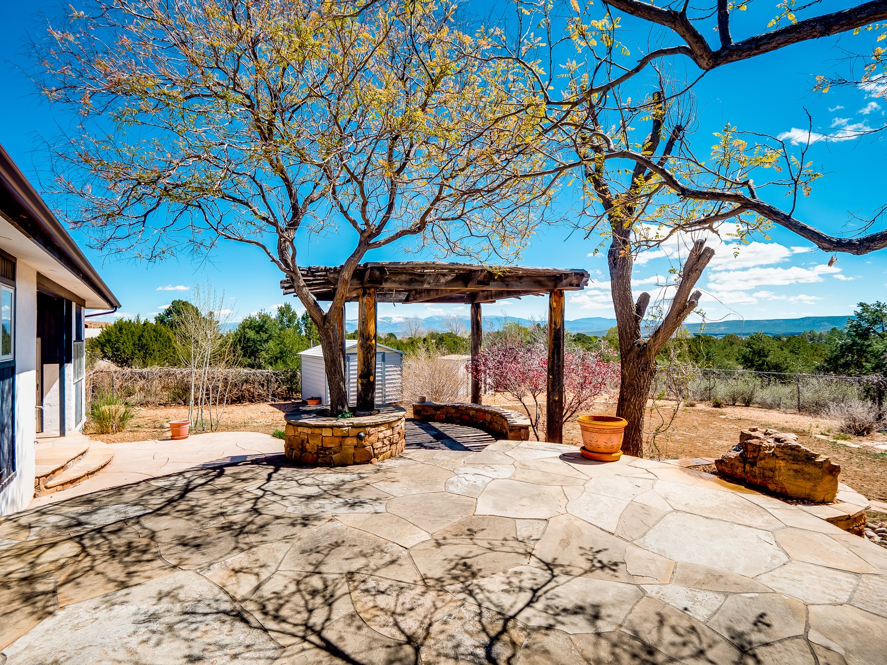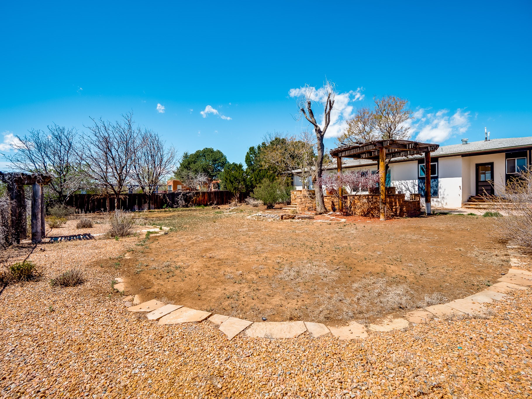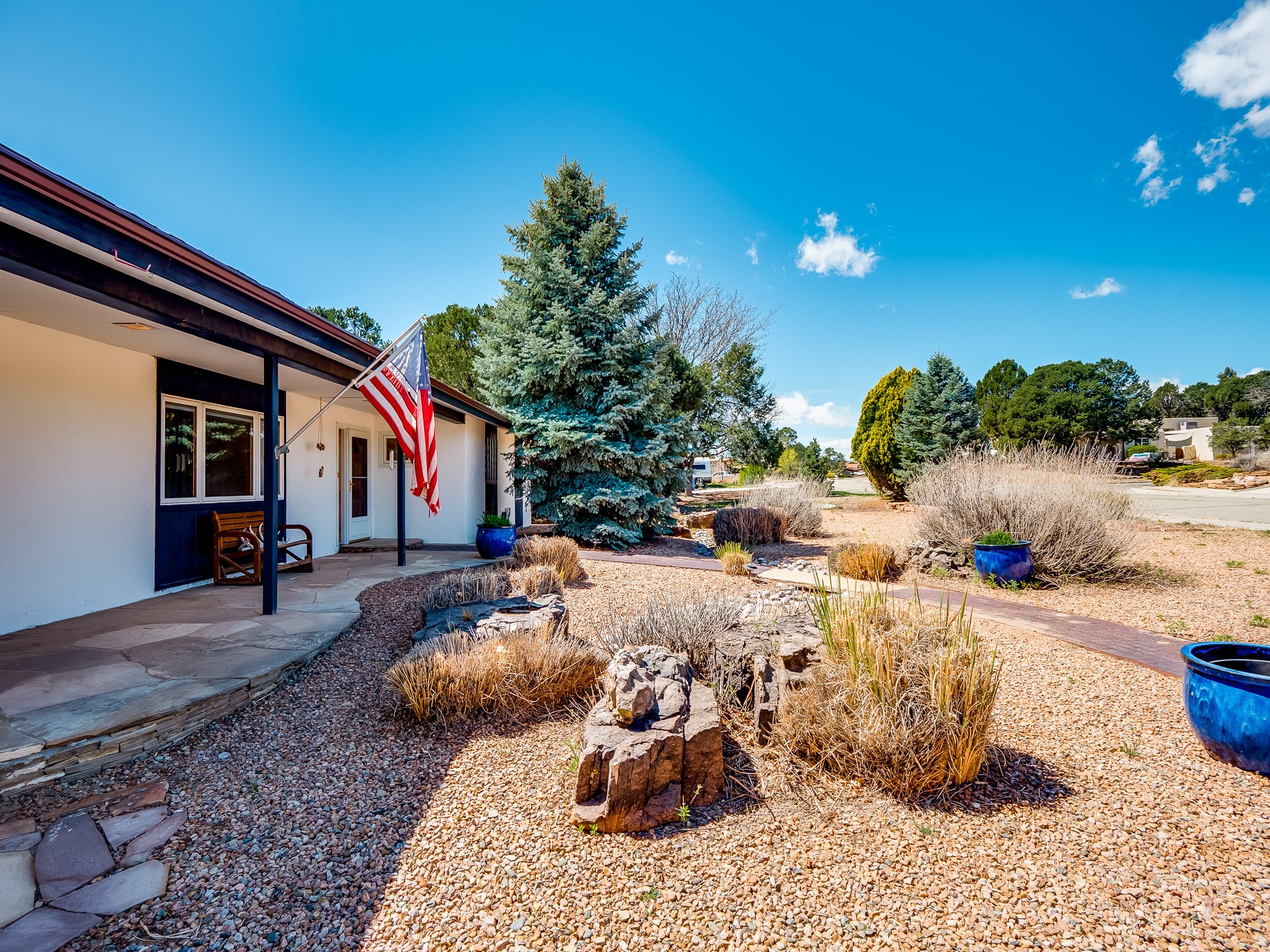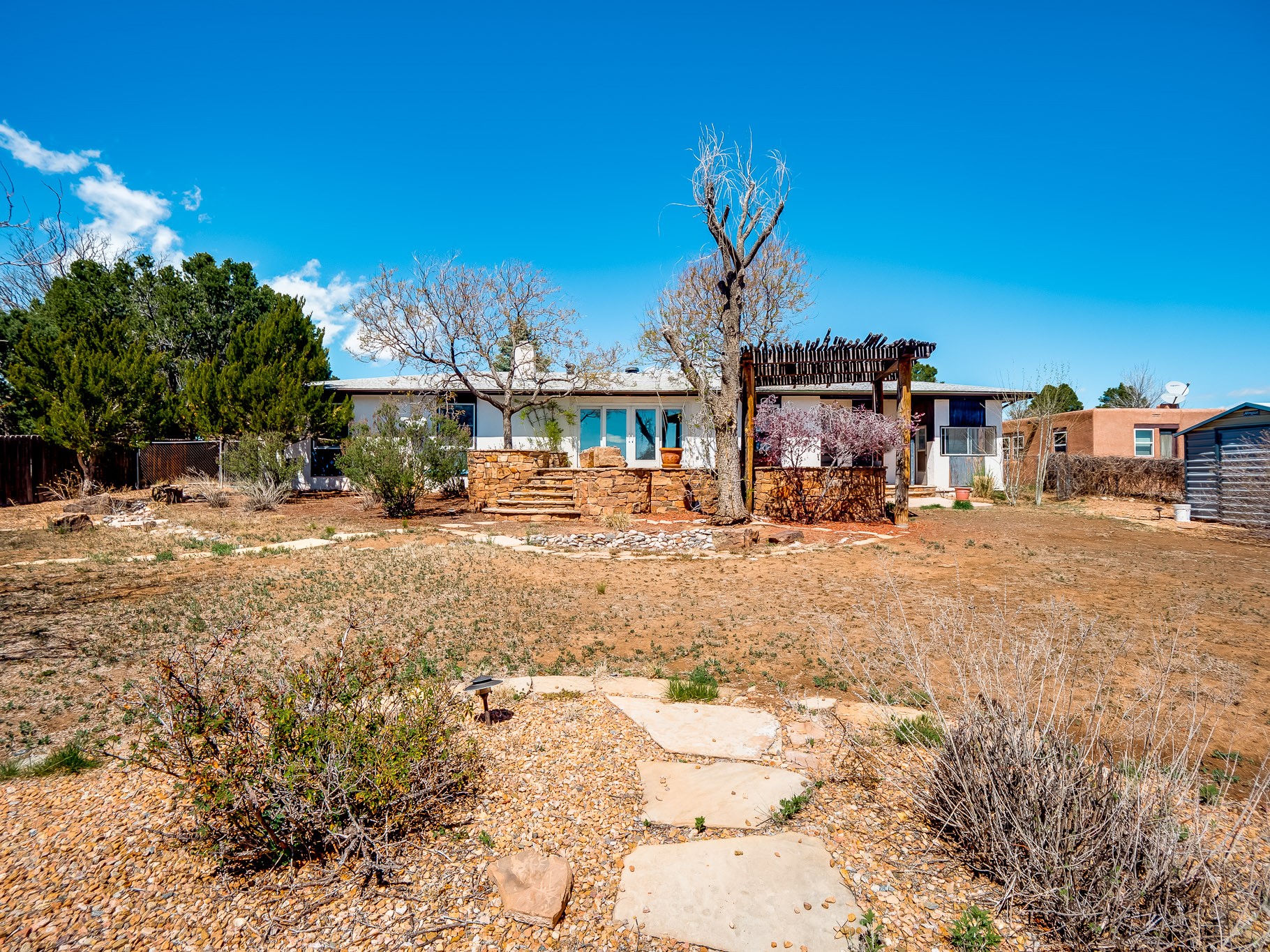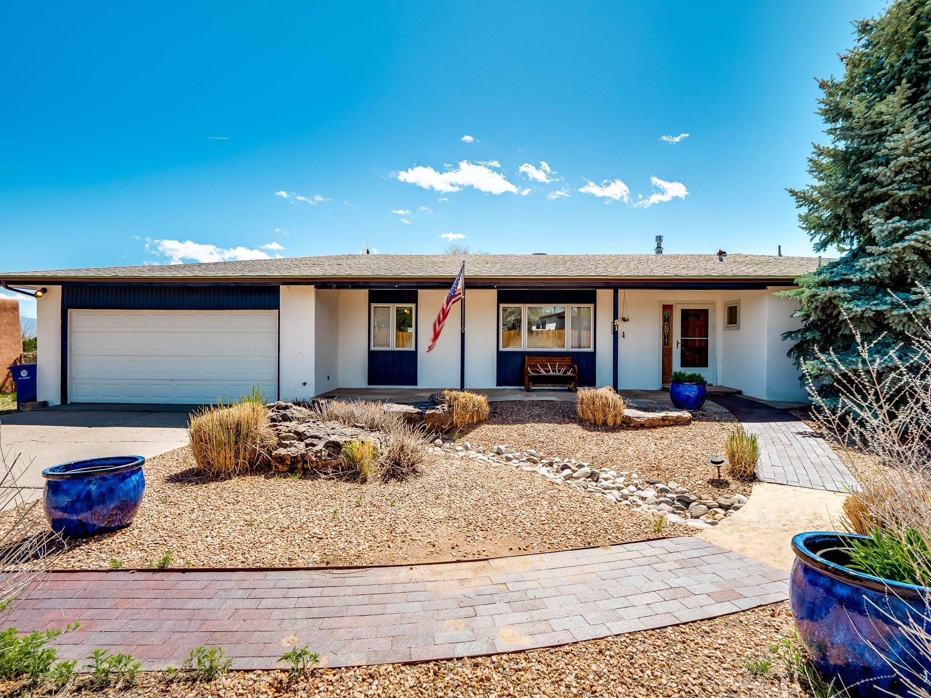 Welcome to this charming single-story ranch home in White Rock, where comfort, functionality, and outdoor living all come together. The inviting curb appeal begins with a large xeriscaped front yard that offers low-maintenance beauty year-round, complemented by a welcoming covered front porch. Step inside to a spacious living and dining area, highlighted by warm wood floors and abundant natural light--an ideal setting for everyday living and entertaining. The large kitchen features ample wood cabinetry, solid-surface counters, generous workspace, and it opens seamlessly to the cozy family room. Here you'll find a wood-burning fireplace for cool evenings and sliding glass doors that lead directly to the backyard and elevated stone patio, creating an easy indoor-outdoor flow. Just off the kitchen is a convenient laundry room access to the backyard, as well as direct entry to the two-car garage. Down the hallway are two bright guest bedrooms with plantation shutters, a dedicated office with built-in storage and a desk, and a full guest bathroom featuring a single-sink vanity and a tiled tub/shower combination. At the end of the hall, the nicely sized primary en-suite offers a peaceful retreat, complete with plantation shutters and a walk-in closet. The primary bathroom includes a single-sink vanity with ample storage, an additional closet, and a tiled walk-in shower. The true crown jewel of this home is the expansive backyard, with no homes directly behind, offering a wonderful sense of privacy and space. An elevated stone patio with a boulder water feature and a covered pergola creates a stunning outdoor living and entertaining area--perfect for gatherings, quiet evenings, or dining al fresco. There is plenty of room for the avid gardener to create garden beds or landscaping projects, all set beneath wide open skies with beautiful mountain views. Come experience this beautiful home in person and see all it has to offer!