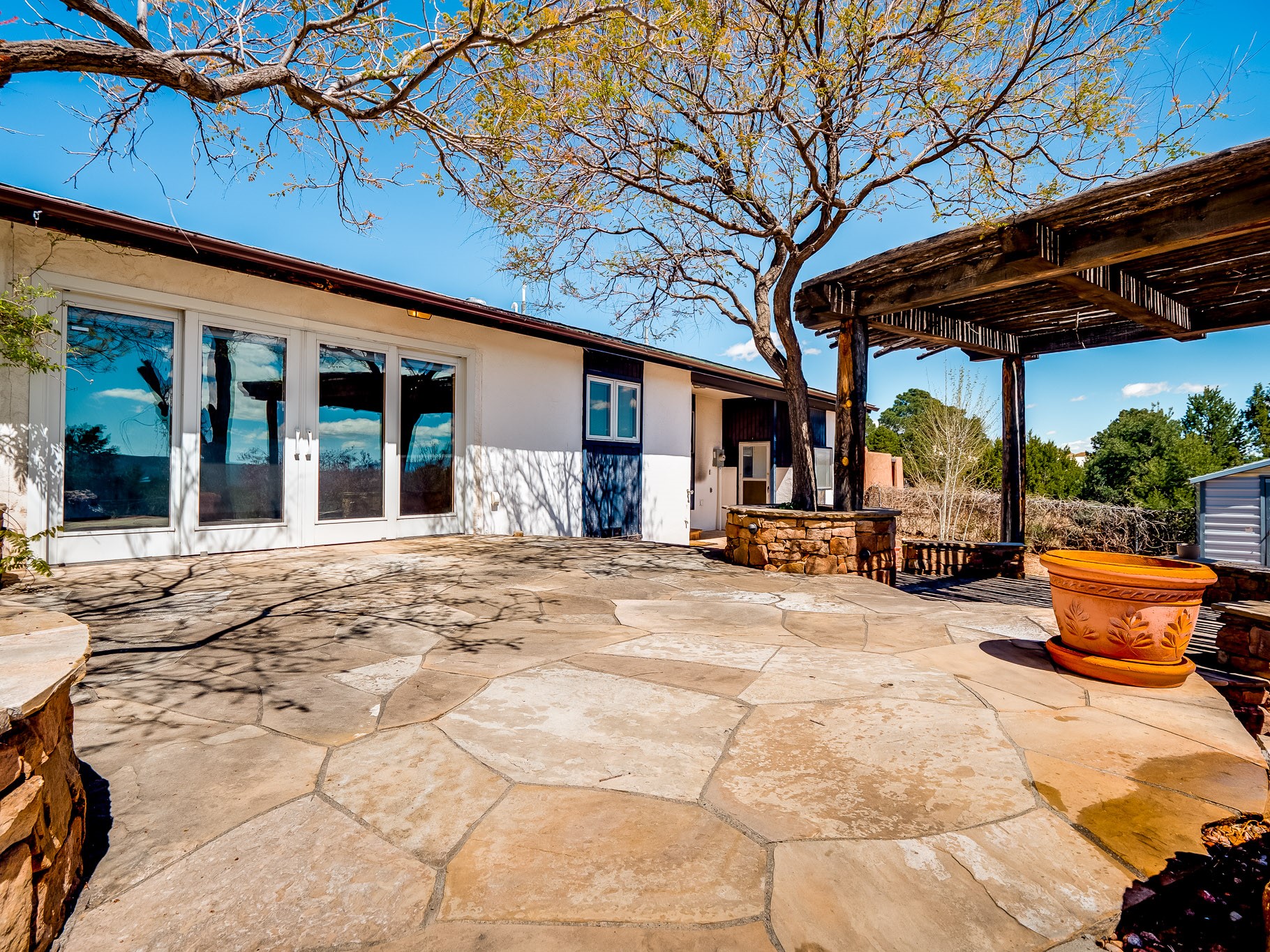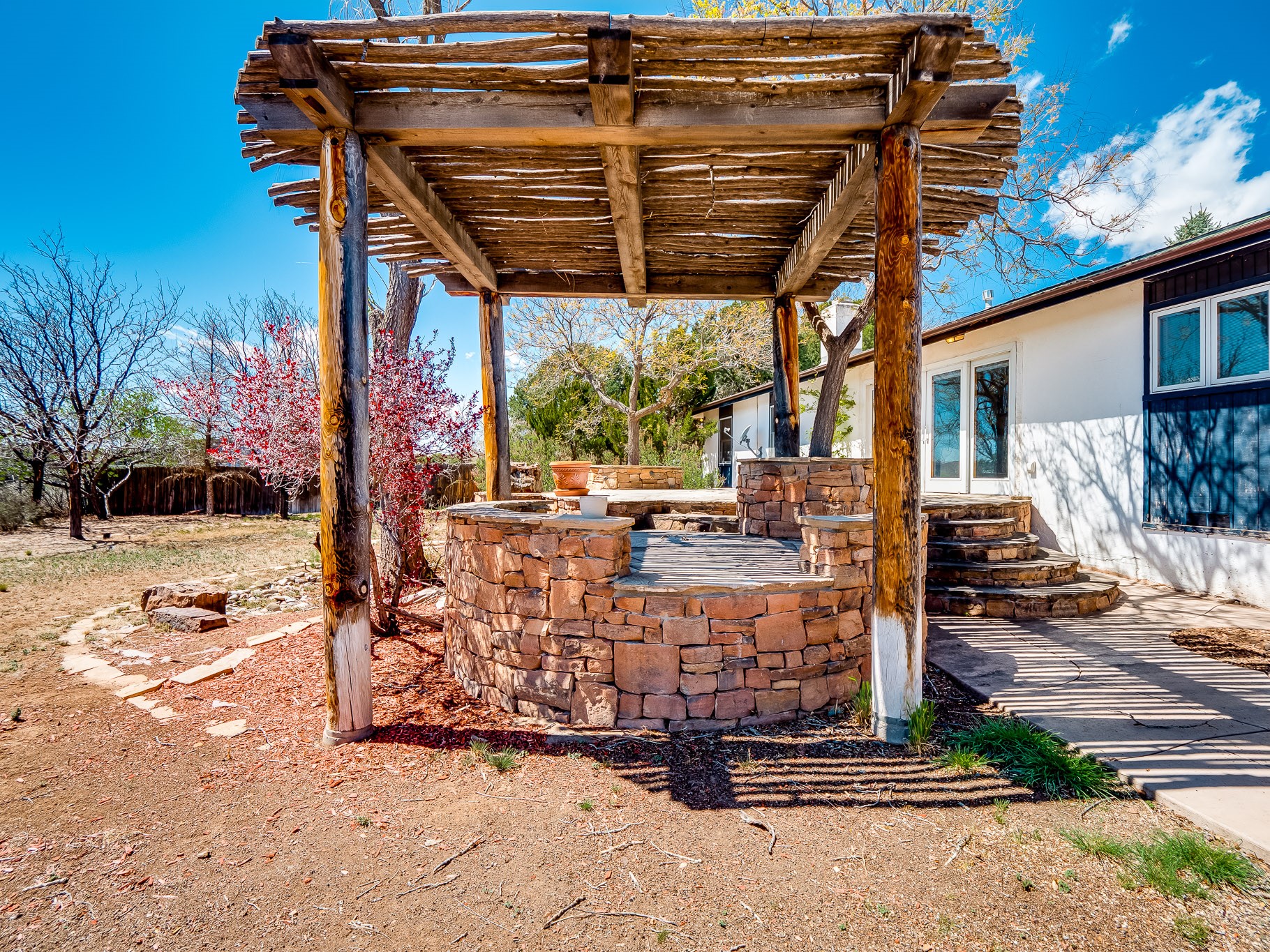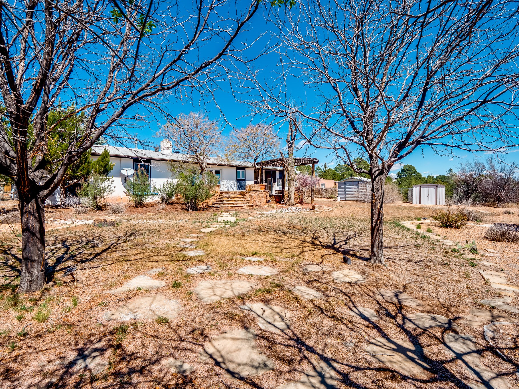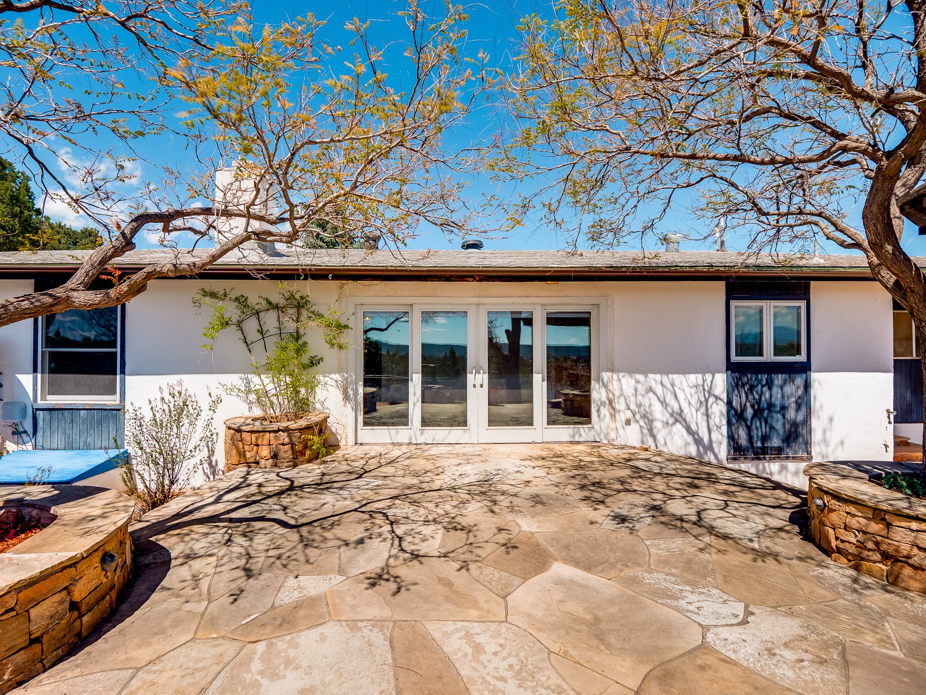 Welcome to this charming single-story ranch home in White Rock, where comfort, functionality, and outdoor living all come together. The inviting curb appeal begins with a large xeriscaped front yard that offers low-maintenance beauty year-round, complemented by a welcoming covered front porch. Step inside to a spacious living and dining area, highlighted by warm wood floors and abundant natural light--an ideal setting for everyday living and entertaining. The large kitchen features ample wood cabinetry, solid-surface counters, generous workspace, and it opens seamlessly to the cozy family room. Here you'll find a wood-burning fireplace for cool evenings and sliding glass doors that lead directly to the backyard and elevated stone patio, creating an easy indoor-outdoor flow. Just off the kitchen is a convenient laundry room access to the backyard, as well as direct entry to the two-car garage. Down the hallway are two bright guest bedrooms with plantation shutters, a dedicated office with built-in storage and a desk, and a full guest bathroom featuring a single-sink vanity and a tiled tub/shower combination. At the end of the hall, the nicely sized primary en-suite offers a peaceful retreat, complete with plantation shutters and a walk-in closet. The primary bathroom includes a single-sink vanity with ample storage, an additional closet, and a tiled walk-in shower. The true crown jewel of this home is the expansive backyard, with no homes directly behind, offering a wonderful sense of privacy and space. An elevated stone patio with a boulder water feature and a covered pergola creates a stunning outdoor living and entertaining area--perfect for gatherings, quiet evenings, or dining al fresco. There is plenty of room for the avid gardener to create garden beds or landscaping projects, all set beneath wide open skies with beautiful mountain views. Come experience this beautiful home in person and see all it has to offer!