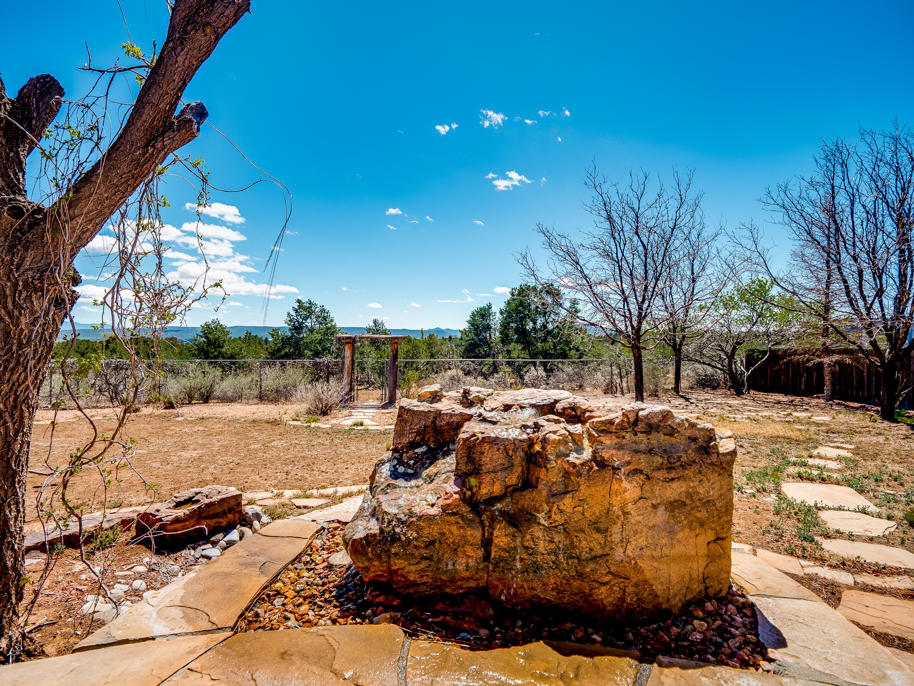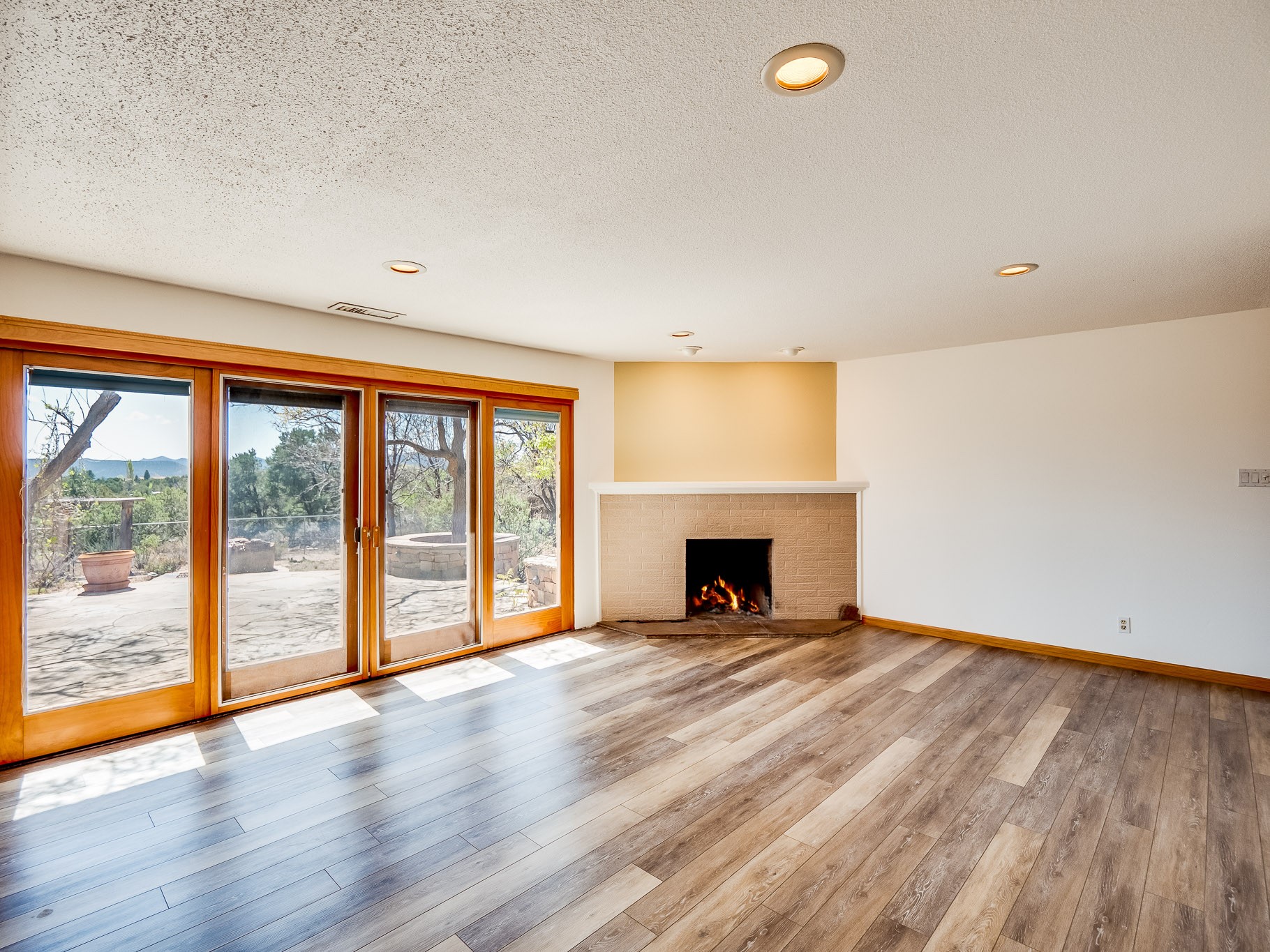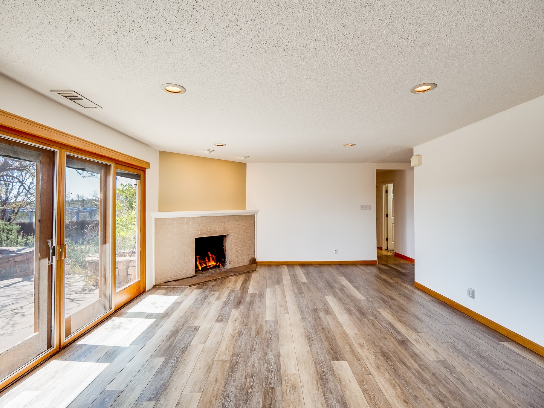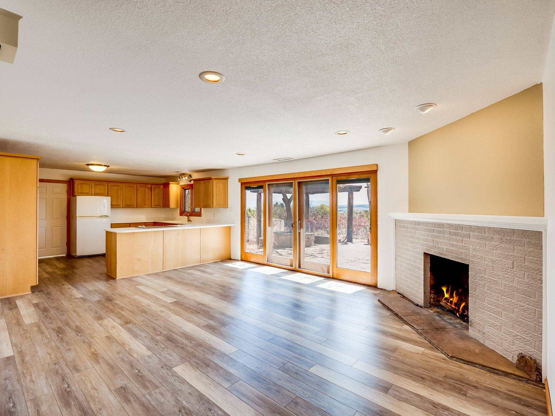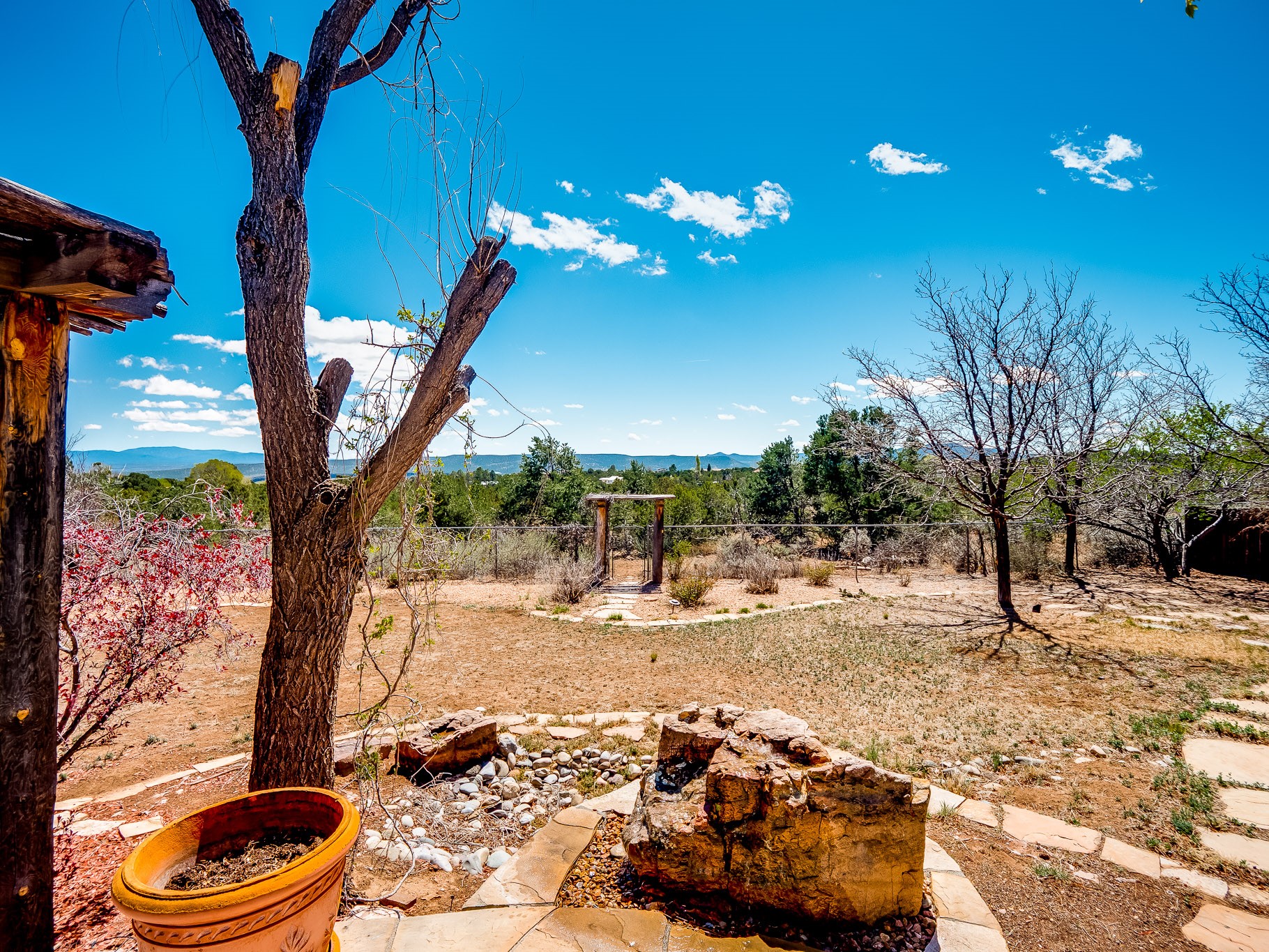 Welcome to this charming single-story ranch home in White Rock, where comfort, functionality, and outdoor living all come together. The inviting curb appeal begins with a large xeriscaped front yard that offers low-maintenance beauty year-round, complemented by a welcoming covered front porch. Step inside to a spacious living and dining area, highlighted by warm wood floors and abundant natural light--an ideal setting for everyday living and entertaining. The large kitchen features ample wood cabinetry, solid-surface counters, generous workspace, and it opens seamlessly to the cozy family room. Here you'll find a wood-burning fireplace for cool evenings and sliding glass doors that lead directly to the backyard and elevated stone patio, creating an easy indoor-outdoor flow. Just off the kitchen is a convenient laundry room access to the backyard, as well as direct entry to the two-car garage. Down the hallway are two bright guest bedrooms with plantation shutters, a dedicated office with built-in storage and a desk, and a full guest bathroom featuring a single-sink vanity and a tiled tub/shower combination. At the end of the hall, the nicely sized primary en-suite offers a peaceful retreat, complete with plantation shutters and a walk-in closet. The primary bathroom includes a single-sink vanity with ample storage, an additional closet, and a tiled walk-in shower. The true crown jewel of this home is the expansive backyard, with no homes directly behind, offering a wonderful sense of privacy and space. An elevated stone patio with a boulder water feature and a covered pergola creates a stunning outdoor living and entertaining area--perfect for gatherings, quiet evenings, or dining al fresco. There is plenty of room for the avid gardener to create garden beds or landscaping projects, all set beneath wide open skies with beautiful mountain views. Come experience this beautiful home in person and see all it has to offer!
