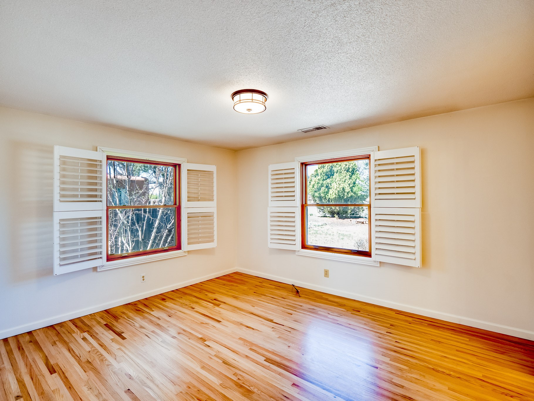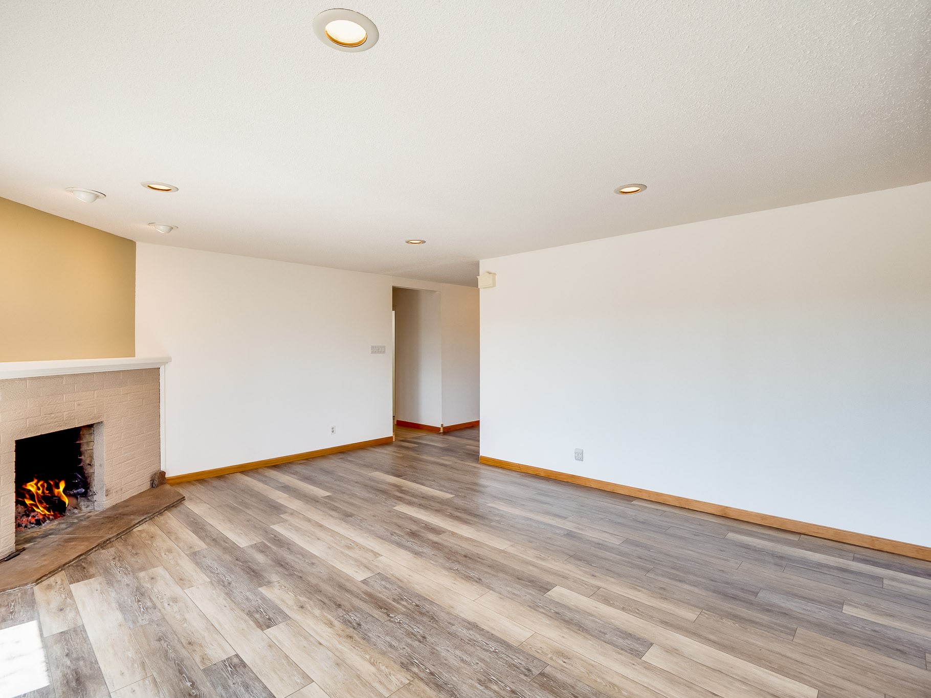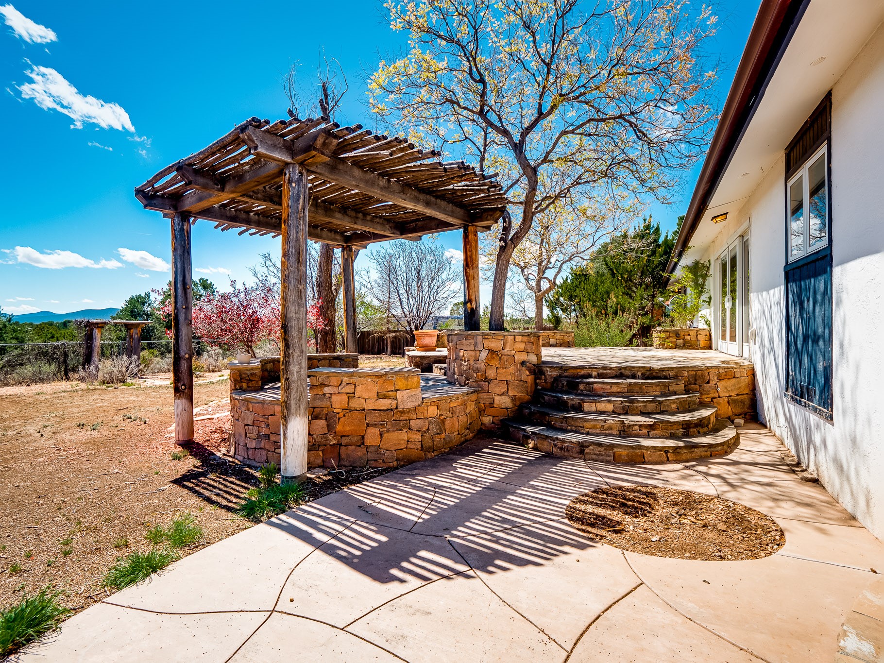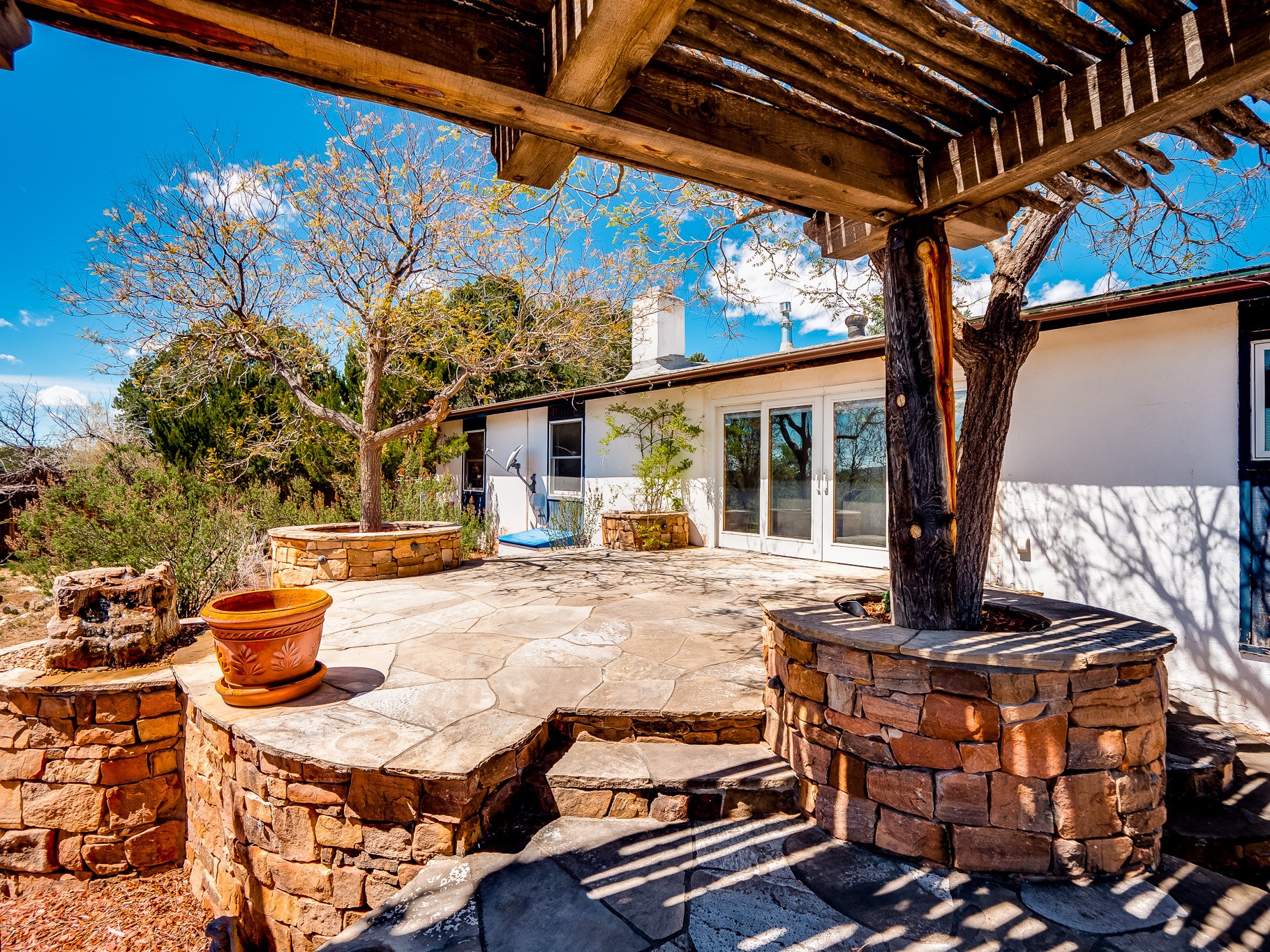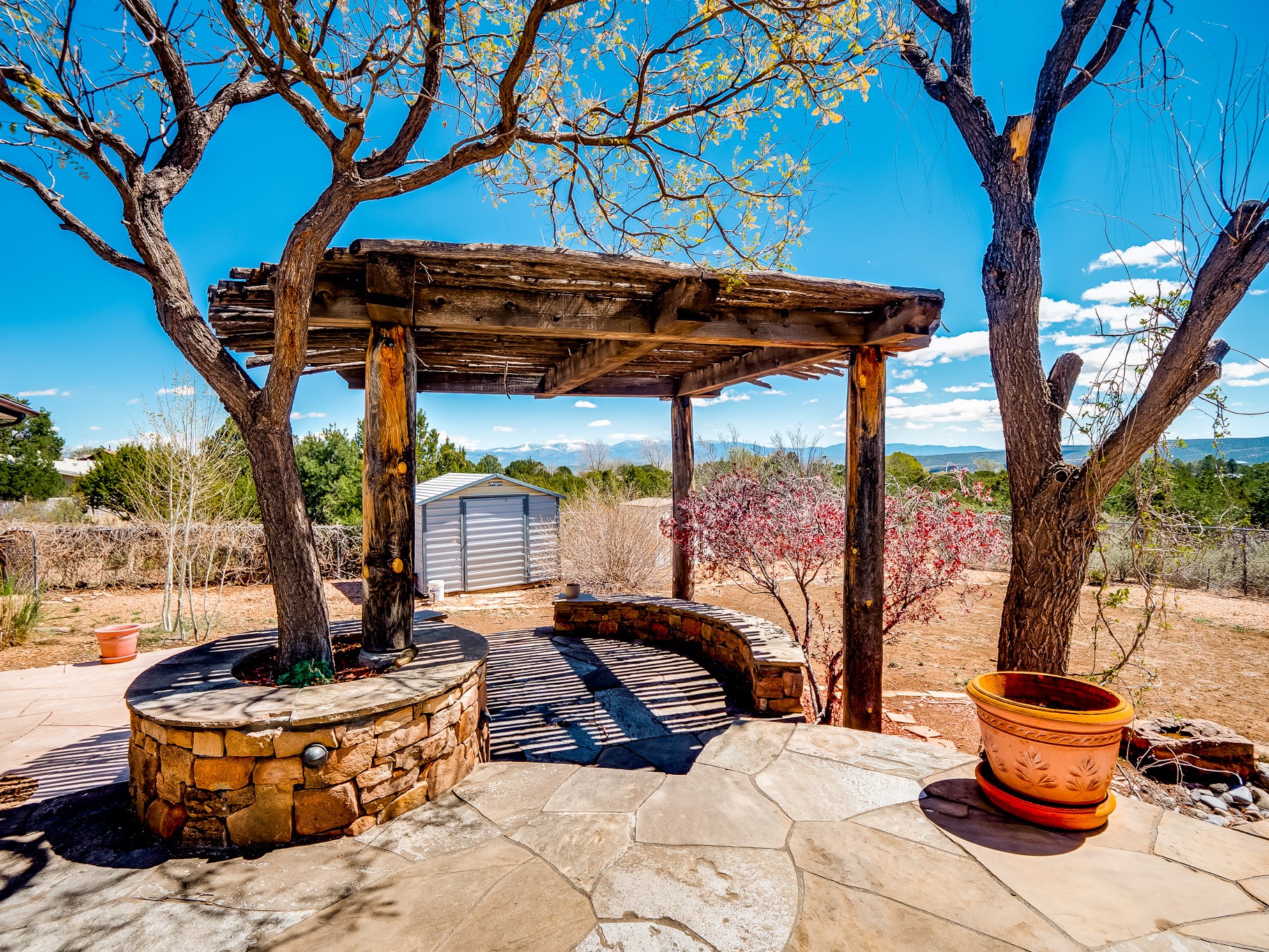 Welcome to this charming single-story ranch home in White Rock, where comfort, functionality, and outdoor living all come together. The inviting curb appeal begins with a large xeriscaped front yard that offers low-maintenance beauty year-round, complemented by a welcoming covered front porch. Step inside to a spacious living and dining area, highlighted by warm wood floors and abundant natural light--an ideal setting for everyday living and entertaining. The large kitchen features ample wood cabinetry, solid-surface counters, generous workspace, and it opens seamlessly to the cozy family room. Here you'll find a wood-burning fireplace for cool evenings and sliding glass doors that lead directly to the backyard and elevated stone patio, creating an easy indoor-outdoor flow. Just off the kitchen is a convenient laundry room access to the backyard, as well as direct entry to the two-car garage. Down the hallway are two bright guest bedrooms with plantation shutters, a dedicated office with built-in storage and a desk, and a full guest bathroom featuring a single-sink vanity and a tiled tub/shower combination. At the end of the hall, the nicely sized primary en-suite offers a peaceful retreat, complete with plantation shutters and a walk-in closet. The primary bathroom includes a single-sink vanity with ample storage, an additional closet, and a tiled walk-in shower. The true crown jewel of this home is the expansive backyard, with no homes directly behind, offering a wonderful sense of privacy and space. An elevated stone patio with a boulder water feature and a covered pergola creates a stunning outdoor living and entertaining area--perfect for gatherings, quiet evenings, or dining al fresco. There is plenty of room for the avid gardener to create garden beds or landscaping projects, all set beneath wide open skies with beautiful mountain views. Come experience this beautiful home in person and see all it has to offer!