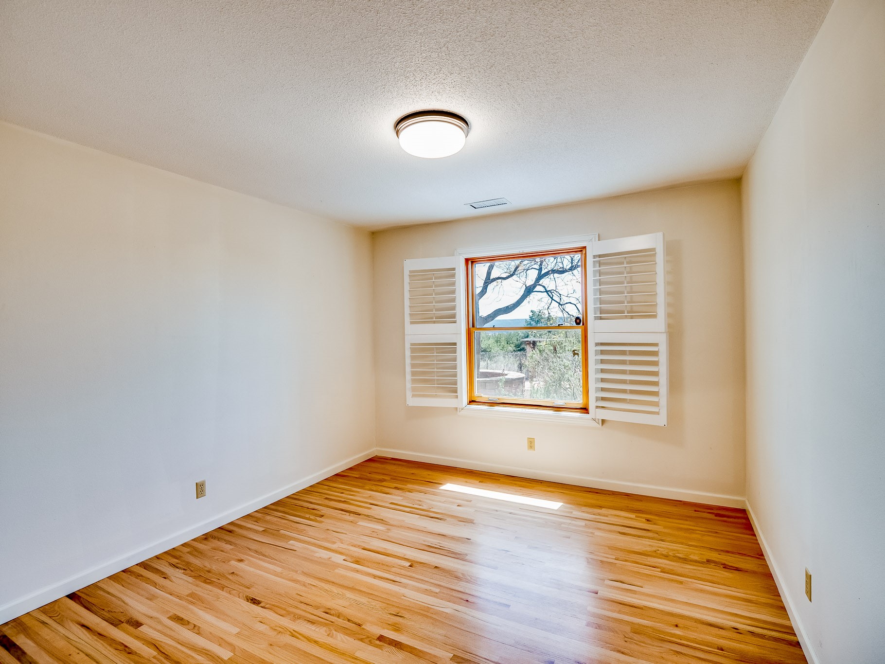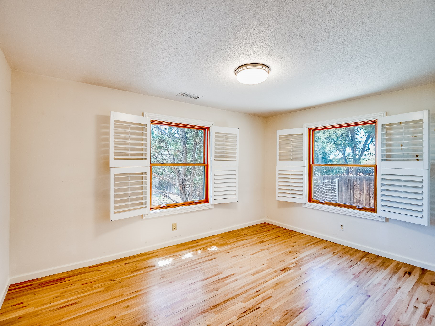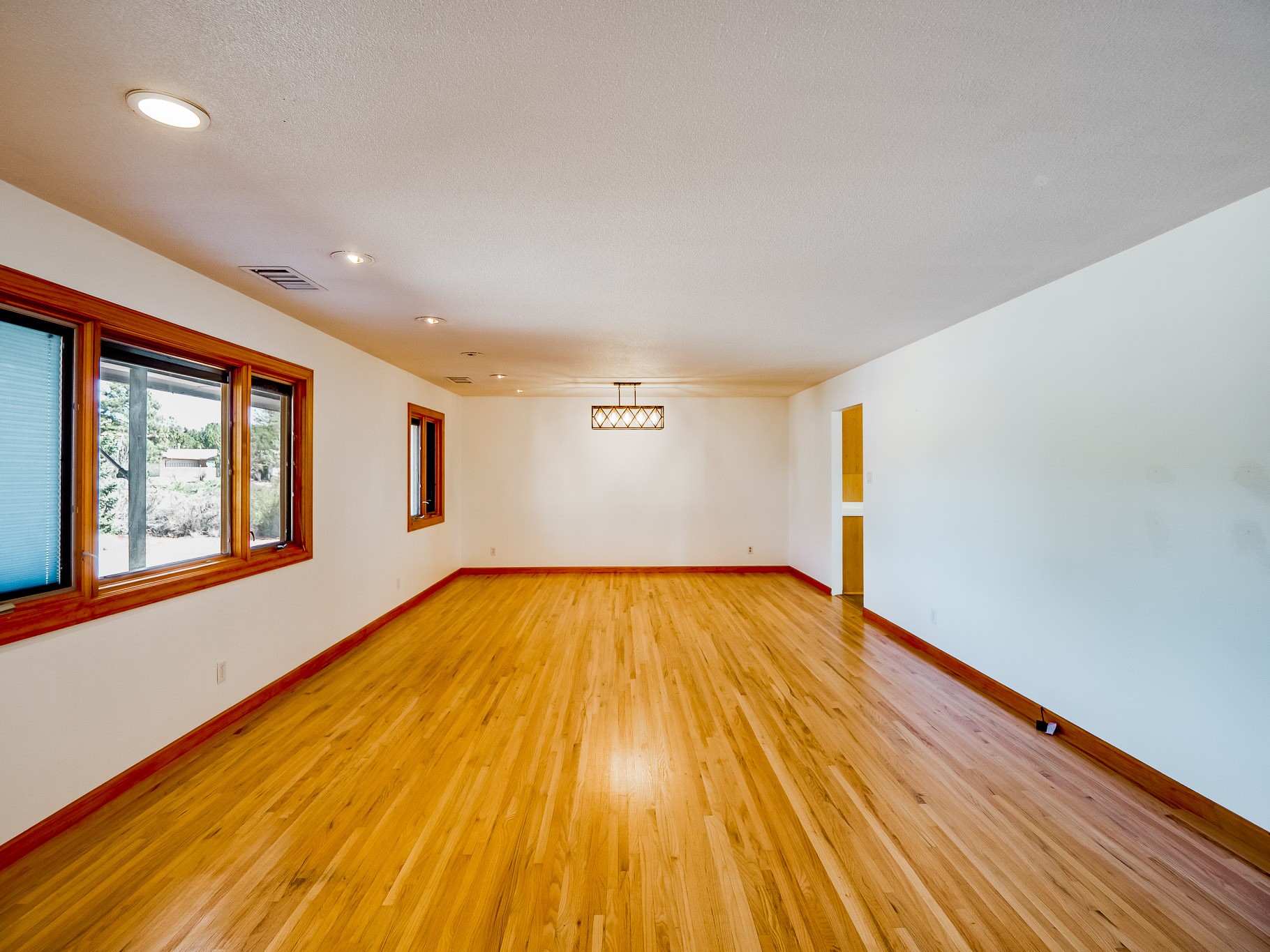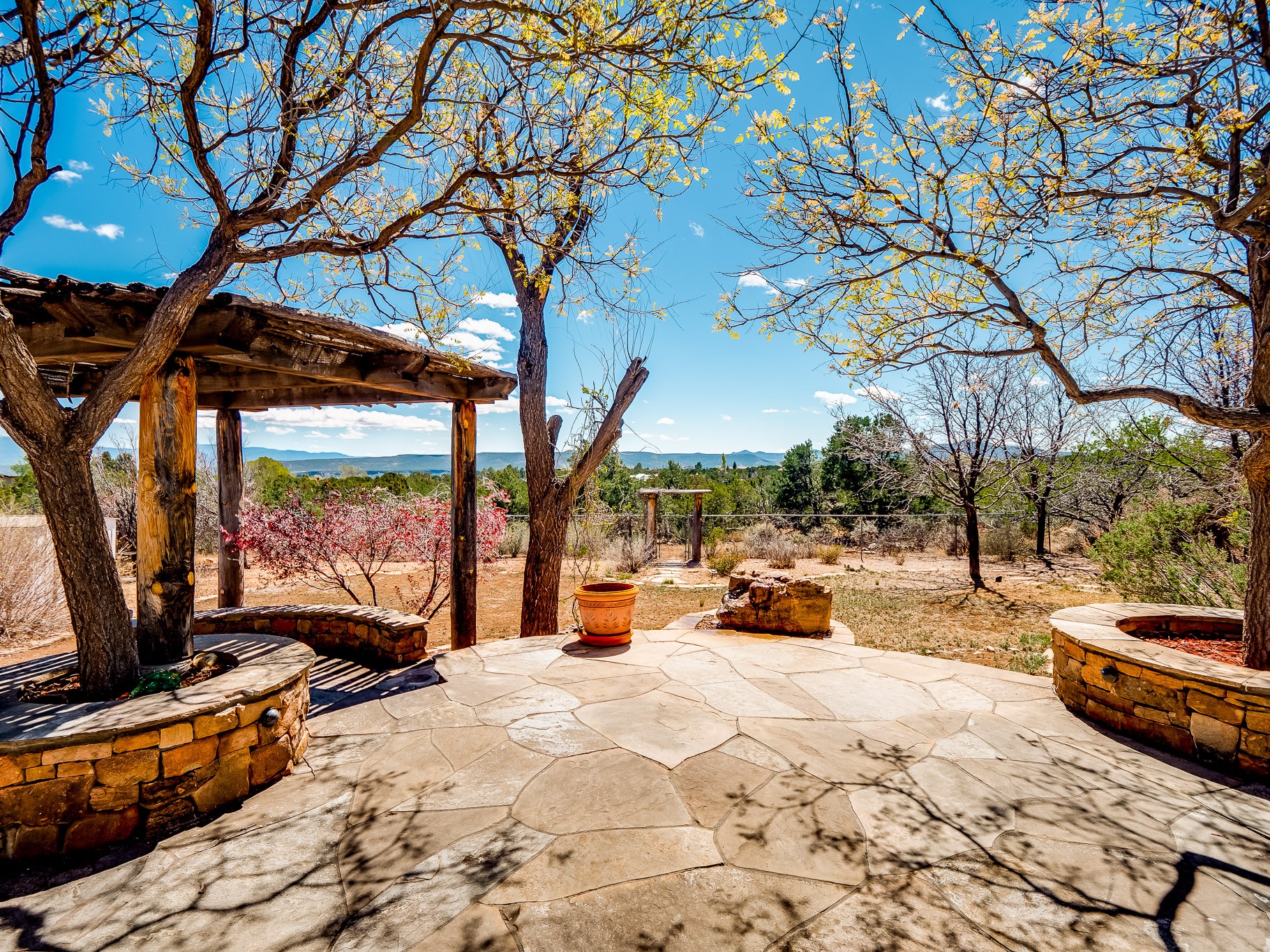 Welcome to this charming single-story ranch home in White Rock, where comfort, functionality, and outdoor living all come together. The inviting curb appeal begins with a large xeriscaped front yard that offers low-maintenance beauty year-round, complemented by a welcoming covered front porch. Step inside to a spacious living and dining area, highlighted by warm wood floors and abundant natural light--an ideal setting for everyday living and entertaining. The large kitchen features ample wood cabinetry, solid-surface counters, generous workspace, and it opens seamlessly to the cozy family room. Here you'll find a wood-burning fireplace for cool evenings and sliding glass doors that lead directly to the backyard and elevated stone patio, creating an easy indoor-outdoor flow. Just off the kitchen is a convenient laundry room access to the backyard, as well as direct entry to the two-car garage. Down the hallway are two bright guest bedrooms with plantation shutters, a dedicated office with built-in storage and a desk, and a full guest bathroom featuring a single-sink vanity and a tiled tub/shower combination. At the end of the hall, the nicely sized primary en-suite offers a peaceful retreat, complete with plantation shutters and a walk-in closet. The primary bathroom includes a single-sink vanity with ample storage, an additional closet, and a tiled walk-in shower. The true crown jewel of this home is the expansive backyard, with no homes directly behind, offering a wonderful sense of privacy and space. An elevated stone patio with a boulder water feature and a covered pergola creates a stunning outdoor living and entertaining area--perfect for gatherings, quiet evenings, or dining al fresco. There is plenty of room for the avid gardener to create garden beds or landscaping projects, all set beneath wide open skies with beautiful mountain views. Come experience this beautiful home in person and see all it has to offer!