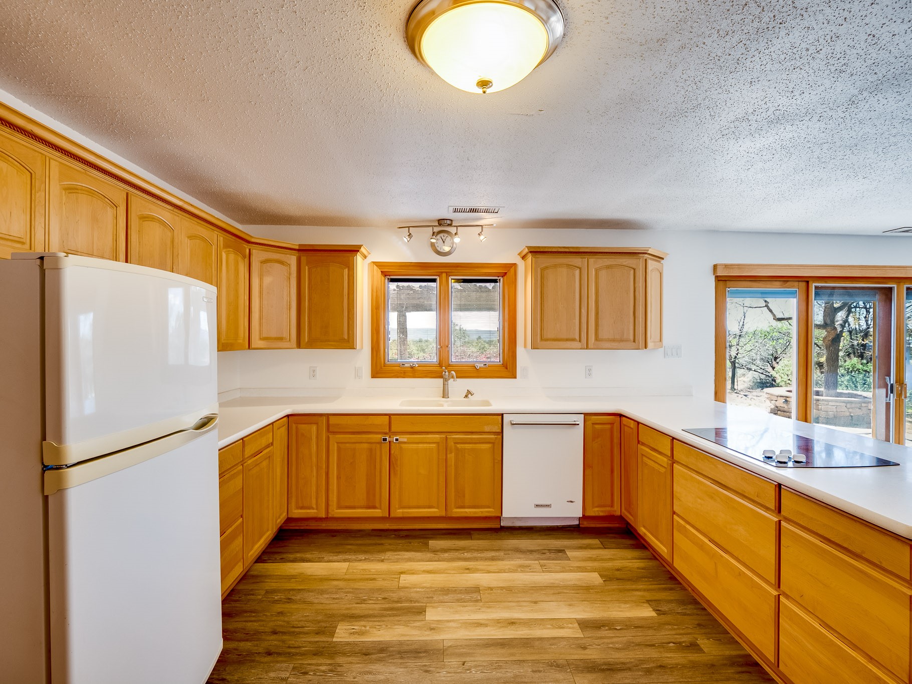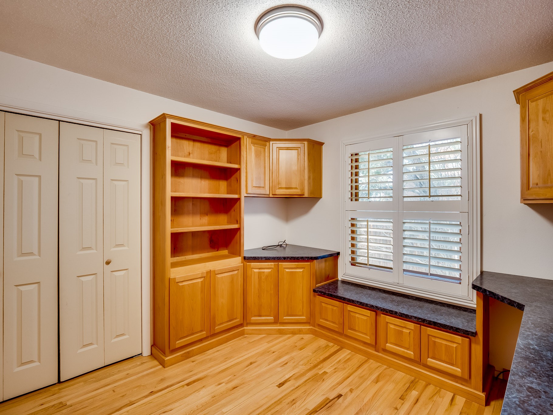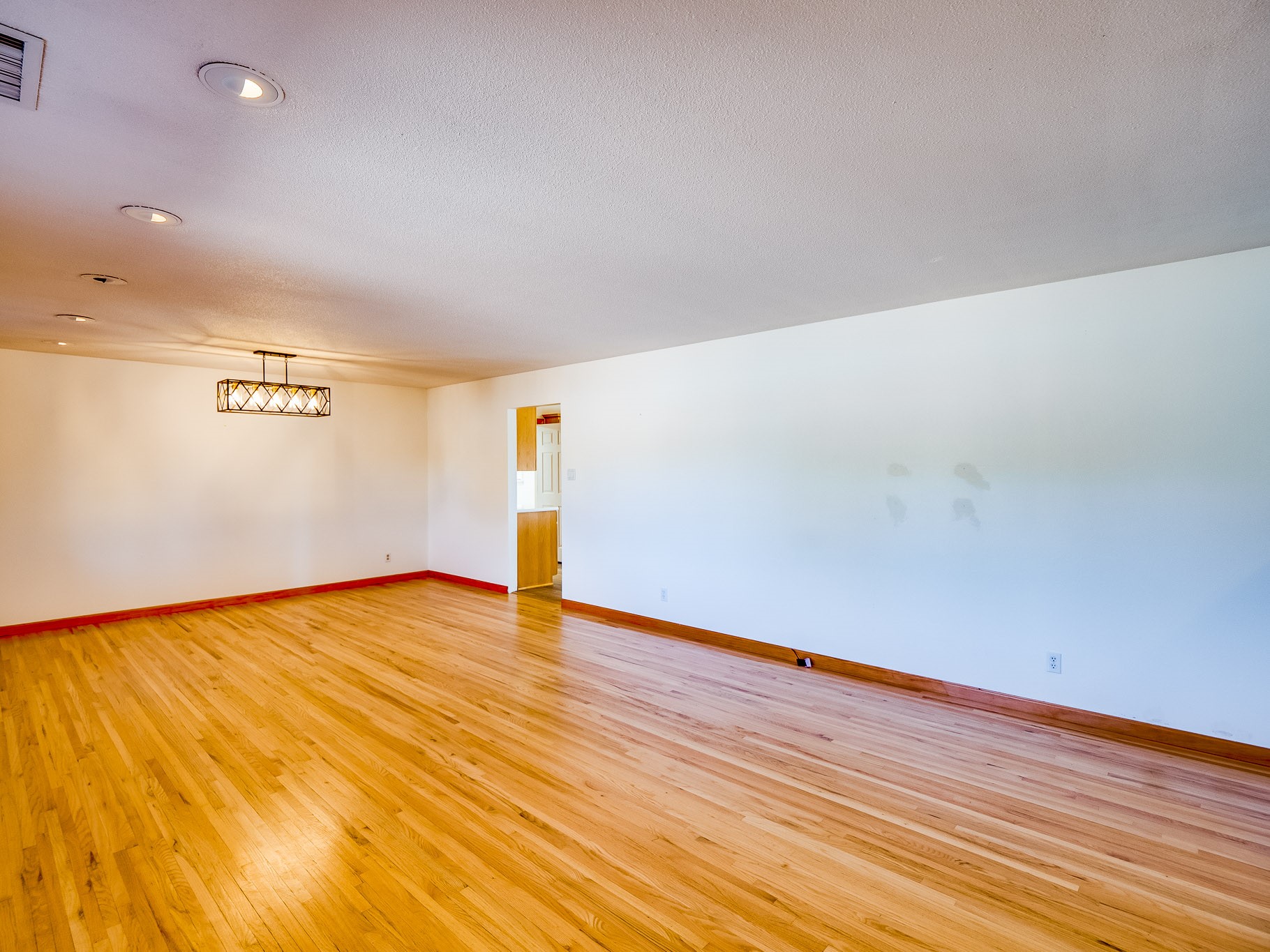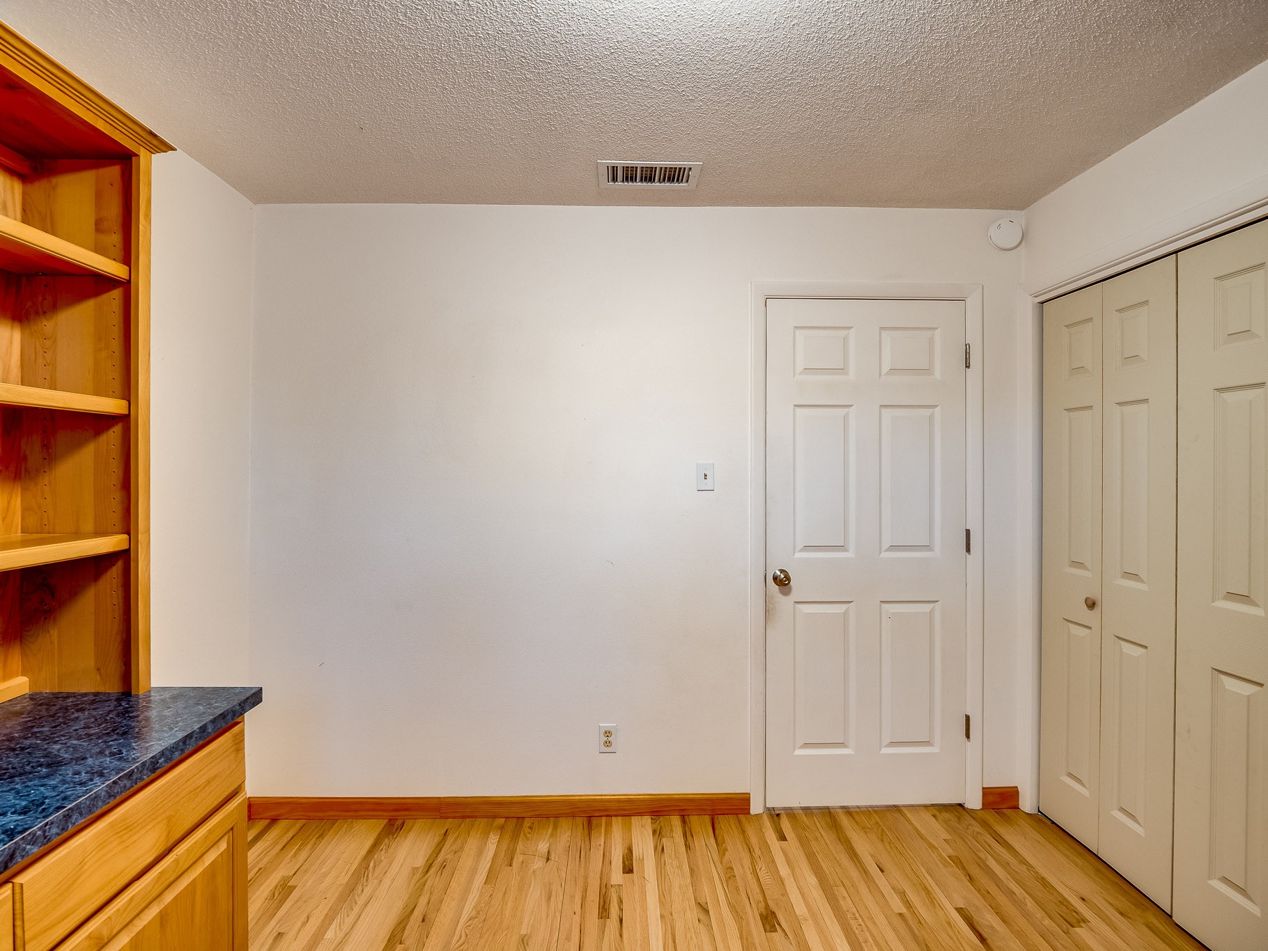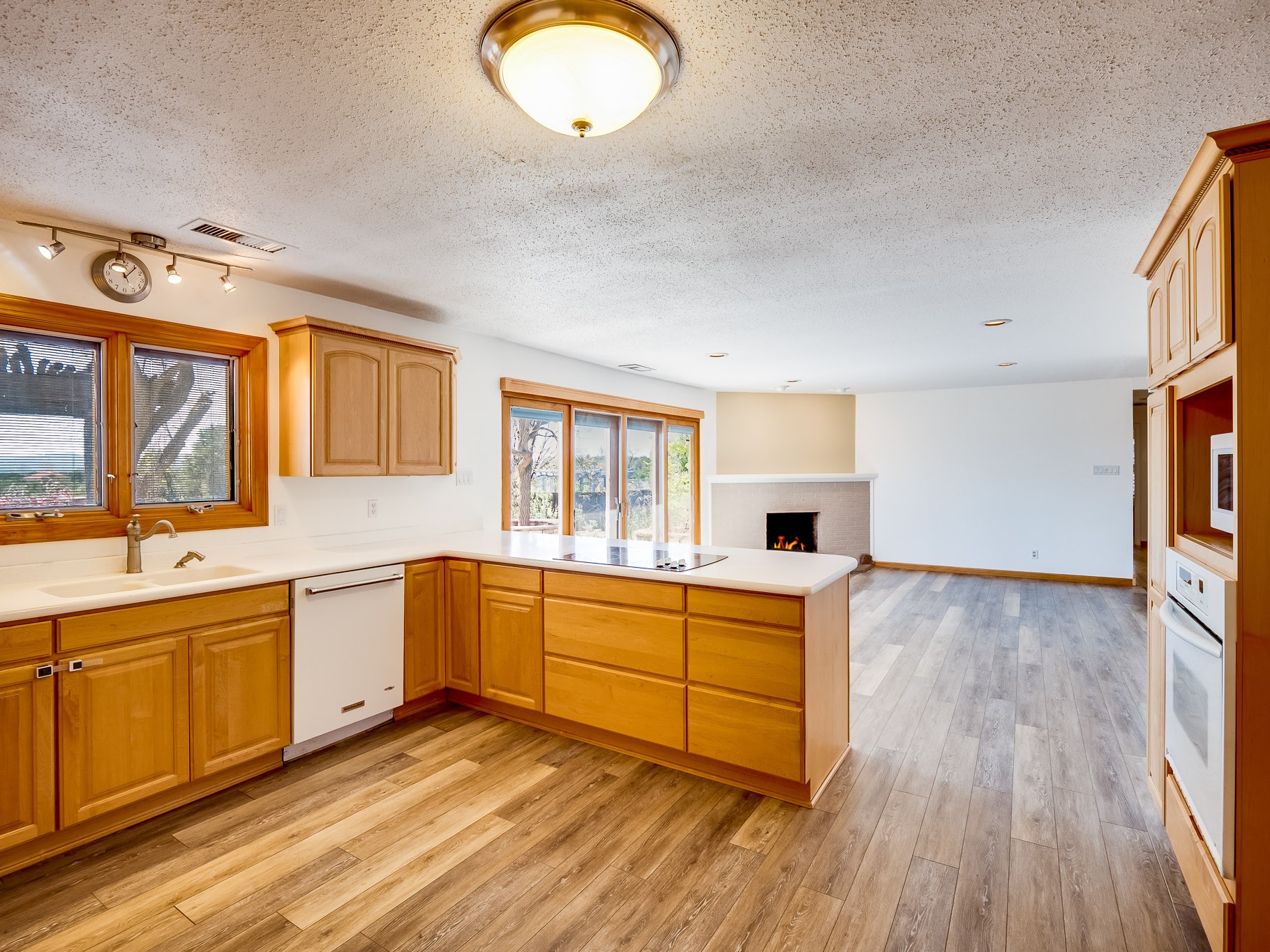 Welcome to this charming single-story ranch home in White Rock, where comfort, functionality, and outdoor living all come together. The inviting curb appeal begins with a large xeriscaped front yard that offers low-maintenance beauty year-round, complemented by a welcoming covered front porch. Step inside to a spacious living and dining area, highlighted by warm wood floors and abundant natural light--an ideal setting for everyday living and entertaining. The large kitchen features ample wood cabinetry, solid-surface counters, generous workspace, and it opens seamlessly to the cozy family room. Here you'll find a wood-burning fireplace for cool evenings and sliding glass doors that lead directly to the backyard and elevated stone patio, creating an easy indoor-outdoor flow. Just off the kitchen is a convenient laundry room access to the backyard, as well as direct entry to the two-car garage. Down the hallway are two bright guest bedrooms with plantation shutters, a dedicated office with built-in storage and a desk, and a full guest bathroom featuring a single-sink vanity and a tiled tub/shower combination. At the end of the hall, the nicely sized primary en-suite offers a peaceful retreat, complete with plantation shutters and a walk-in closet. The primary bathroom includes a single-sink vanity with ample storage, an additional closet, and a tiled walk-in shower. The true crown jewel of this home is the expansive backyard, with no homes directly behind, offering a wonderful sense of privacy and space. An elevated stone patio with a boulder water feature and a covered pergola creates a stunning outdoor living and entertaining area--perfect for gatherings, quiet evenings, or dining al fresco. There is plenty of room for the avid gardener to create garden beds or landscaping projects, all set beneath wide open skies with beautiful mountain views. Come experience this beautiful home in person and see all it has to offer!