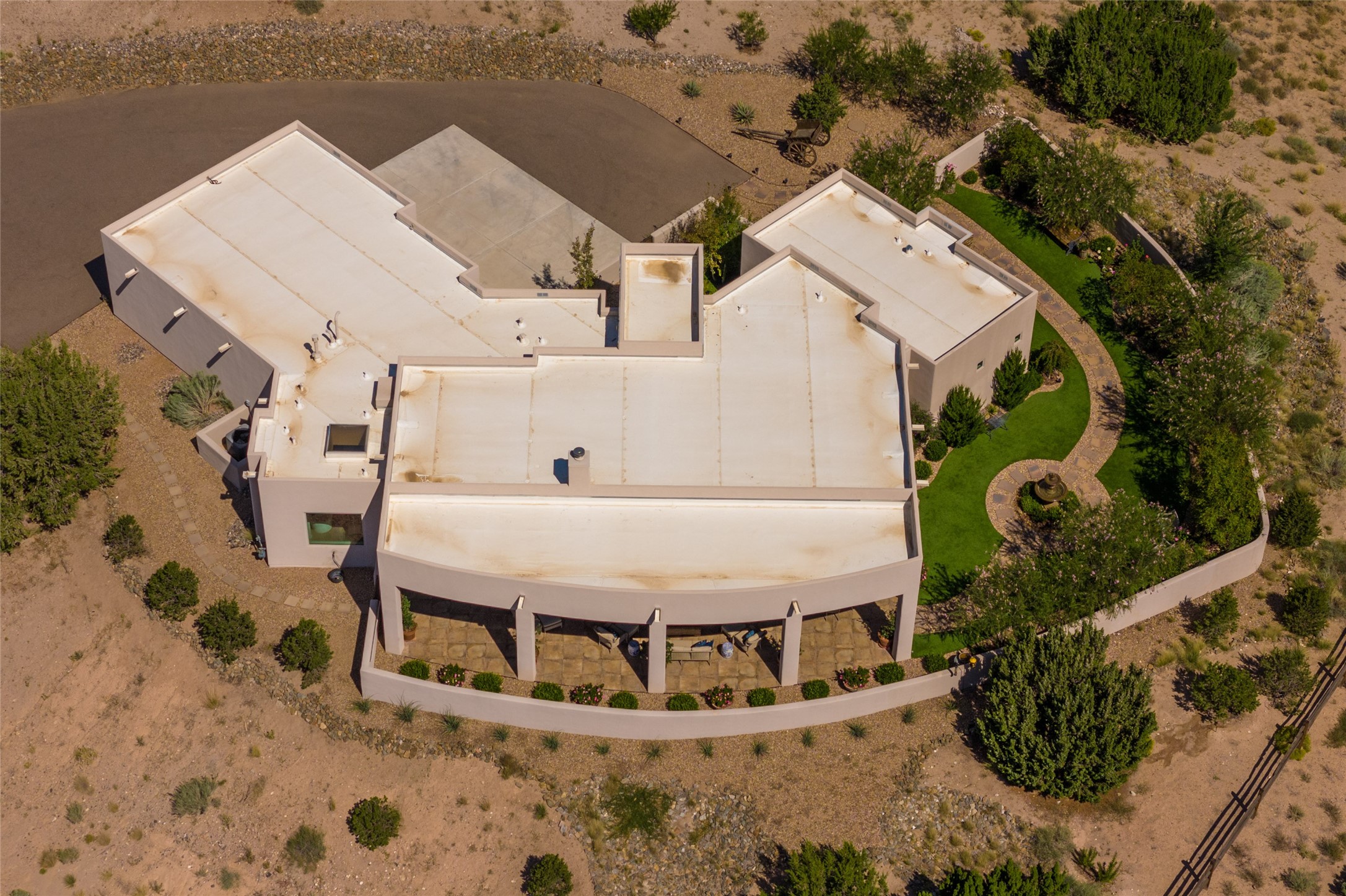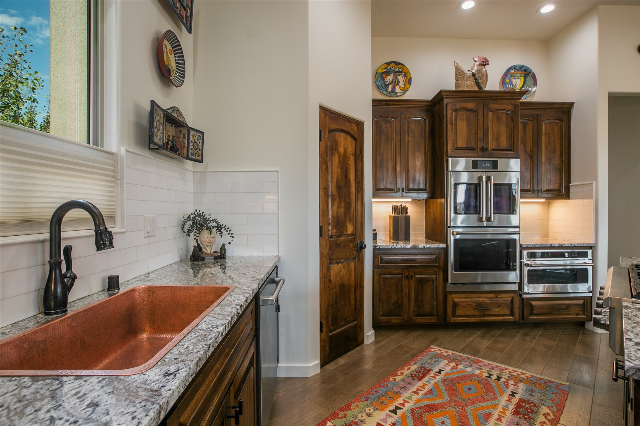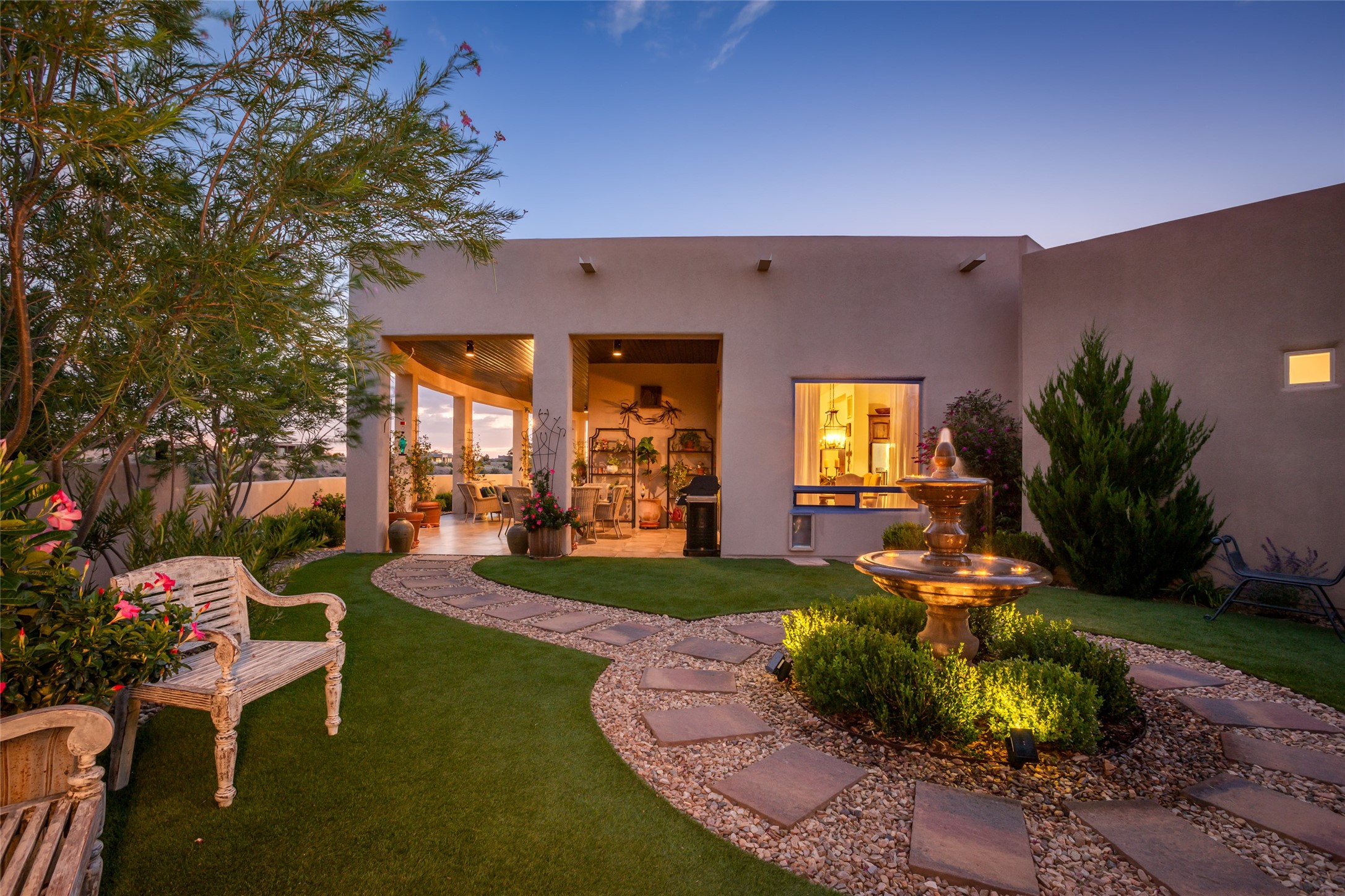 One-level Placitas home built in 2020, perfect for downsizing without sacrificing quality. The bright kitchen features high-end appliances, double ovens, a copper sink, a large pantry, and marble backsplashes. The great room and dining room overlook the Sandia Mountains and open onto an east-facing wraparound patio ideal for outdoor enjoyment. The large primary suite also has mountain views and a door to the covered patio; its spa-like bath includes double sinks, a luxurious tub, and a walk-in shower. Two additional bedrooms on the opposite side of the house share a full bath. Gorgeous outdoor spaces, easy-care landscaping, and an immaculate three-car finished garage with epoxy floors and storage complete this perfect Placitas perch.