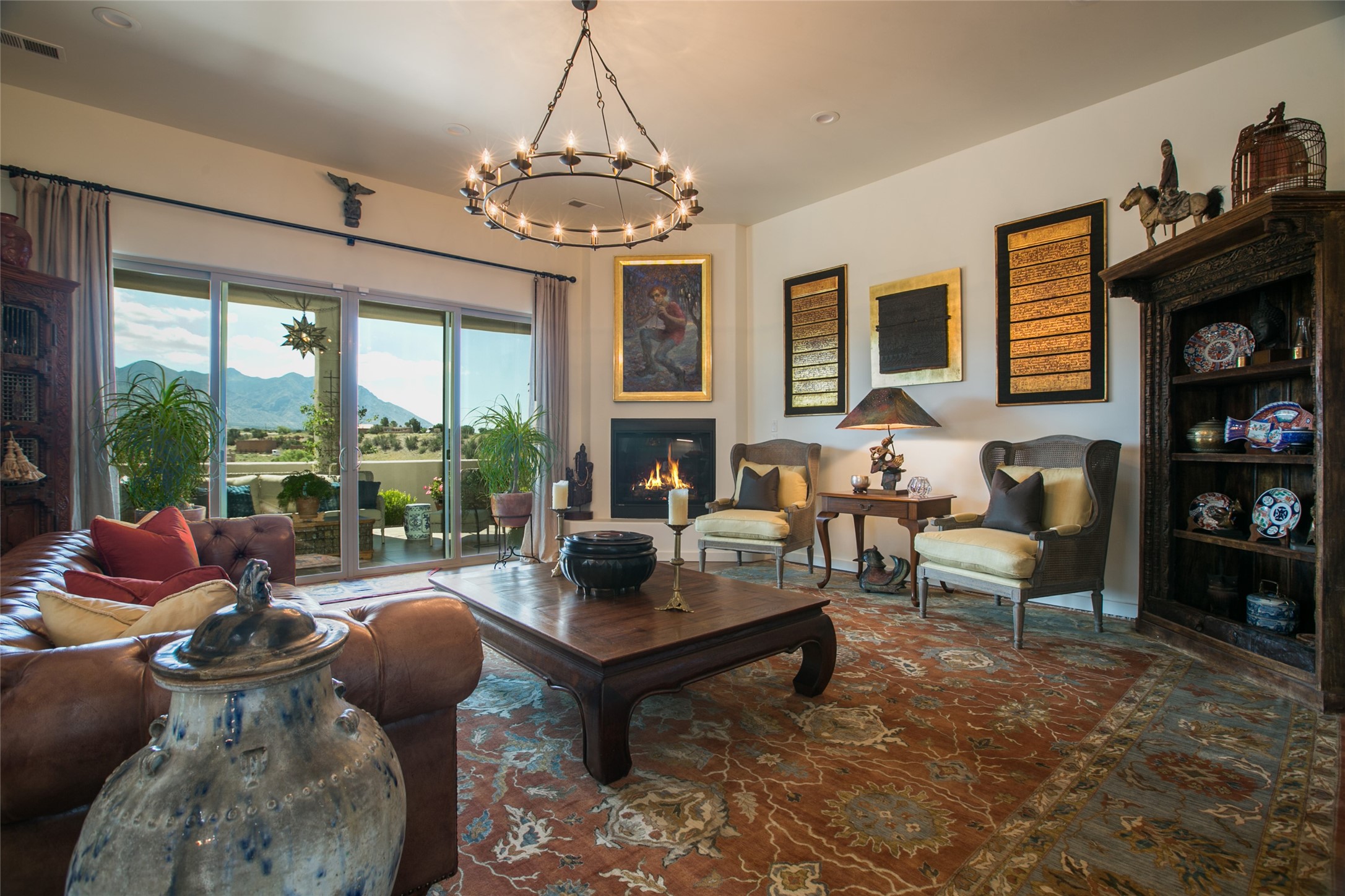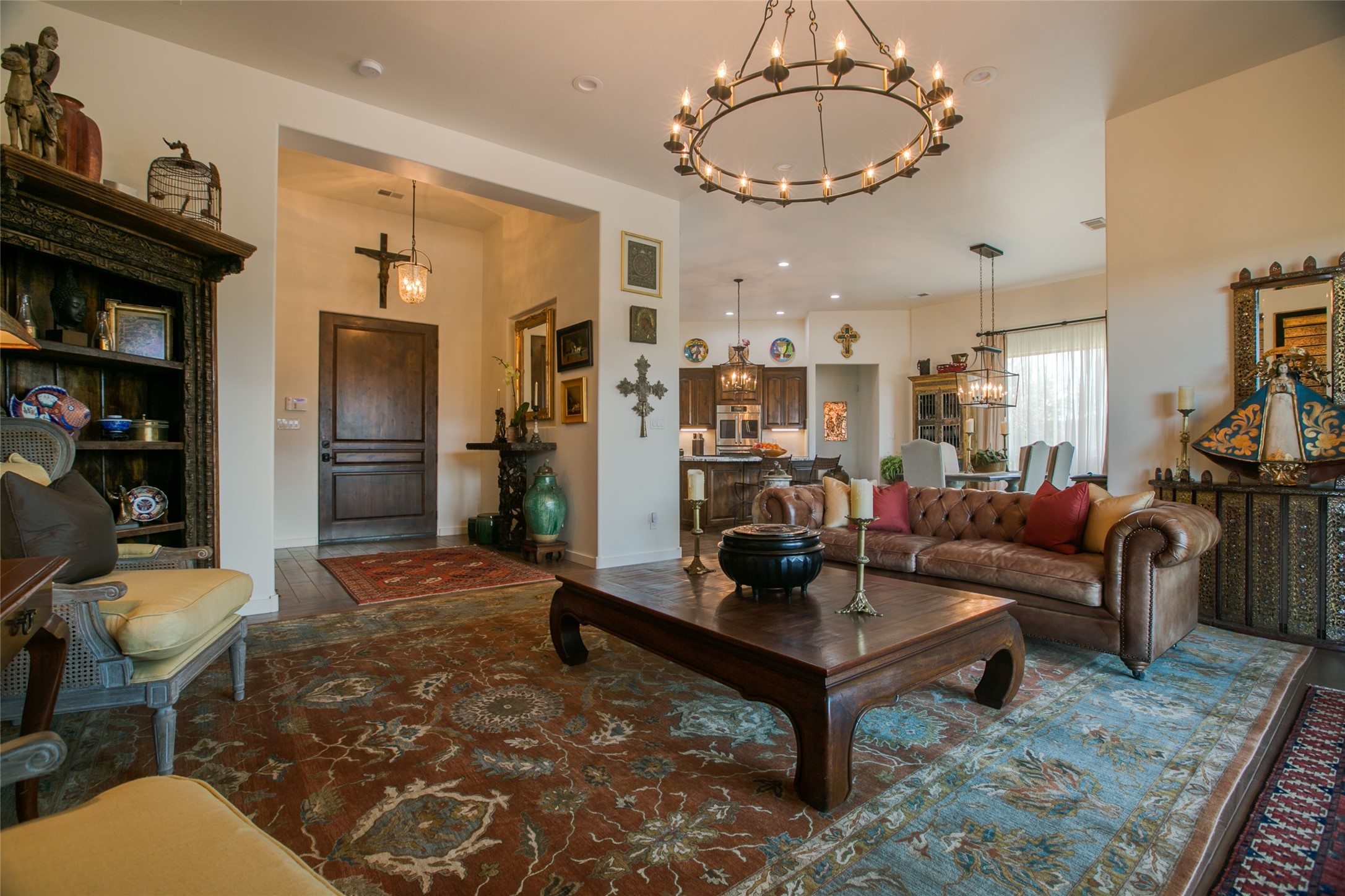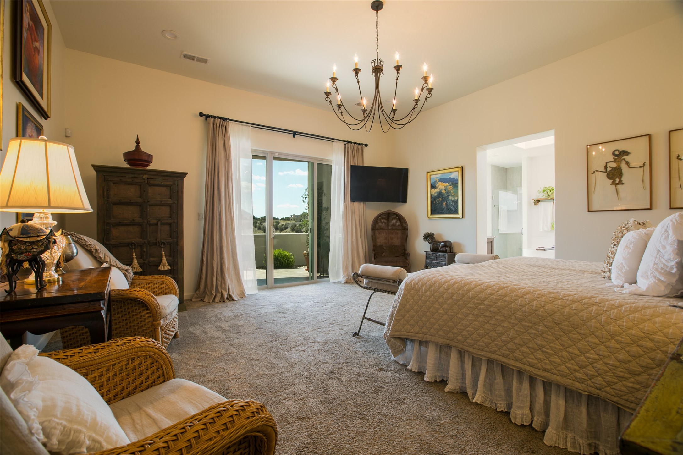 One-level Placitas home built in 2020, perfect for downsizing without sacrificing quality. The bright kitchen features high-end appliances, double ovens, a copper sink, a large pantry, and marble backsplashes. The great room and dining room overlook the Sandia Mountains and open onto an east-facing wraparound patio ideal for outdoor enjoyment. The large primary suite also has mountain views and a door to the covered patio; its spa-like bath includes double sinks, a luxurious tub, and a walk-in shower. Two additional bedrooms on the opposite side of the house share a full bath. Gorgeous outdoor spaces, easy-care landscaping, and an immaculate three-car finished garage with epoxy floors and storage complete this perfect Placitas perch.