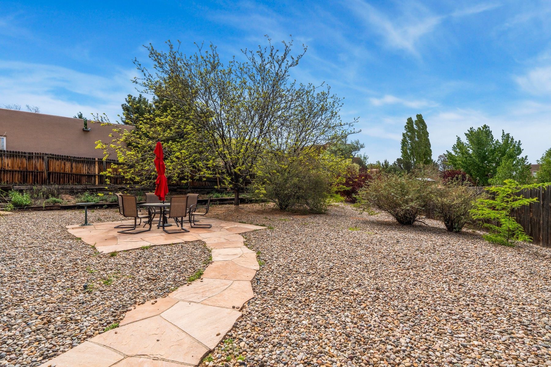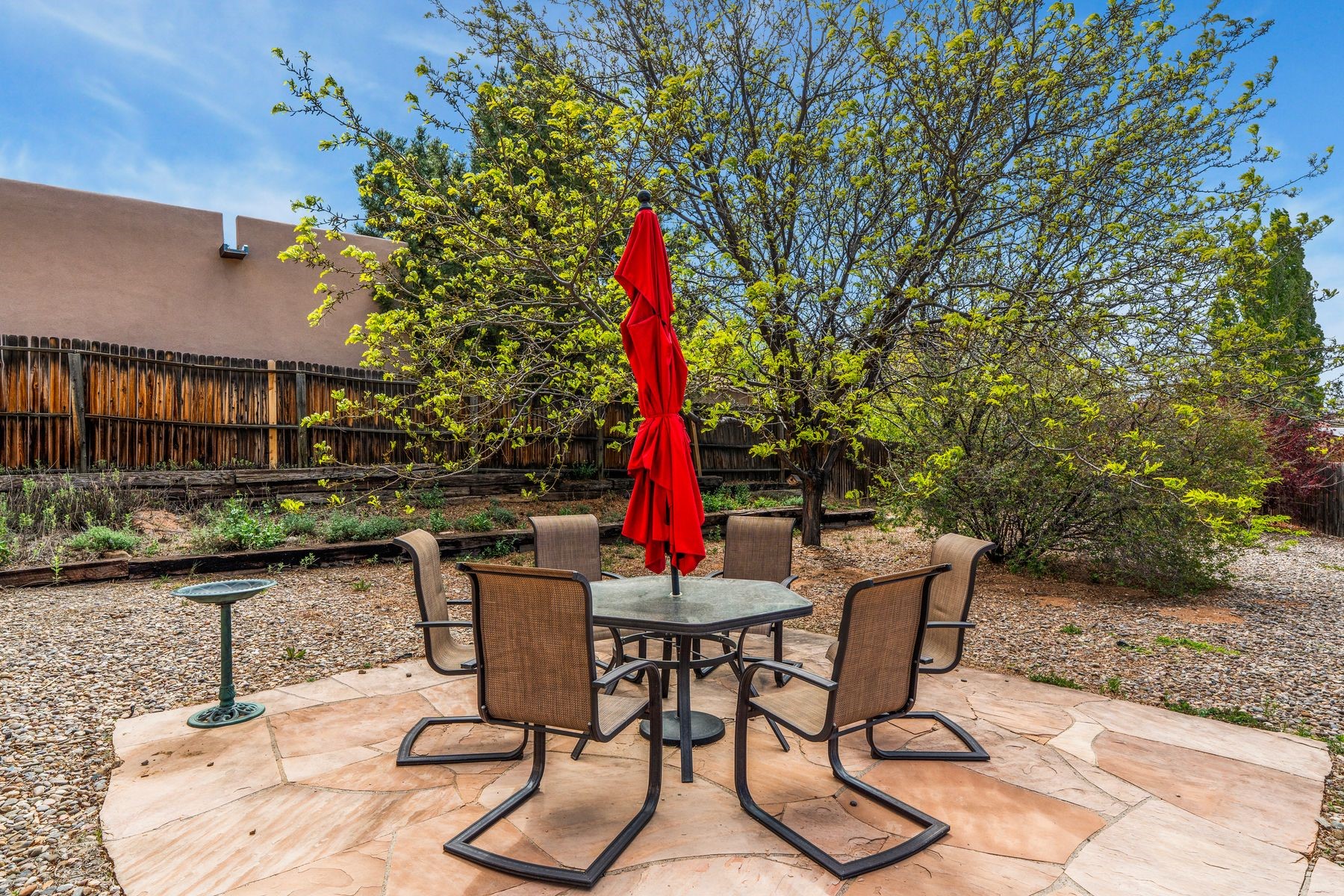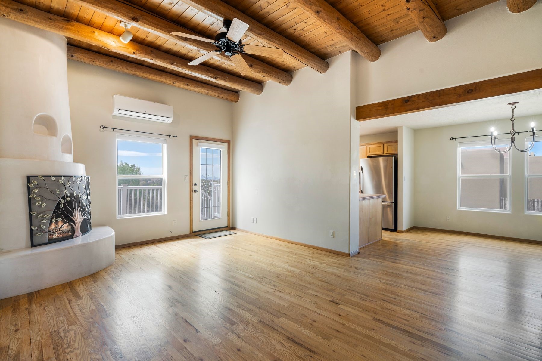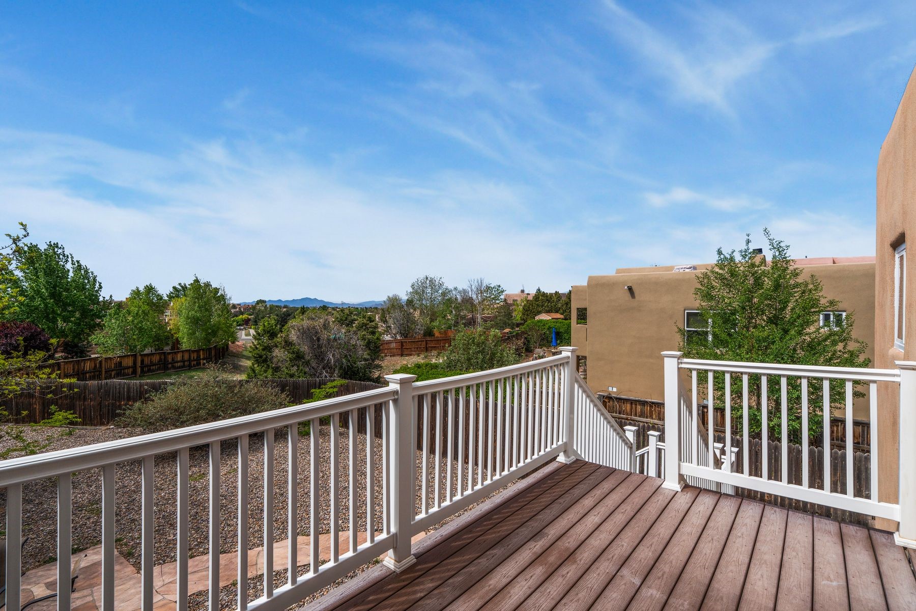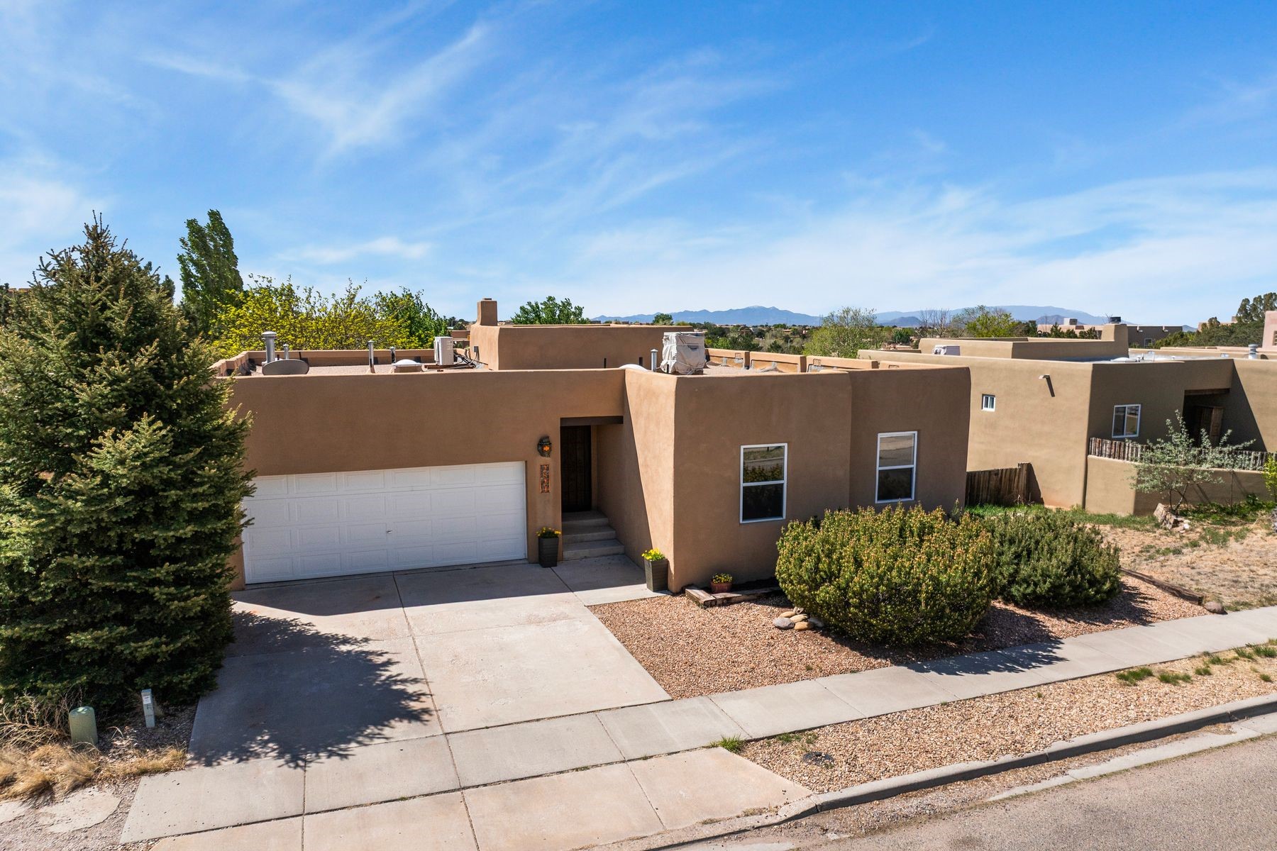 Single-level home in Pueblos del Sol with Ortiz and Sandia mountain views, located just 10 minutes from downtown Santa Fe and 5 minutes to I-25. This 3 bedroom, 2 bath residence offers 1,336 square feet on a .17-acre lot with no interior steps, good bedroom separation, and a functional layout designed for comfortable everyday living. The home features wood flooring throughout with no carpet, along with high ceilings, exposed vigas, and nichos that reflect classic Santa Fe architectural character. The living room opens to a deck with direct access from both the main living area and the primary bedroom, creating a seamless connection to outdoor space. The kitchen and dining areas flow easily into the living room, supporting both daily living and gathering. The primary bedroom is en-suite and positioned separately from the guest bedrooms, offering privacy and flexibility. Two additional bedrooms and a second bathroom accommodate guests, workspace, or additional living needs. Comfort systems include forced air heating and ductless mini-split systems in the living room and primary bedroom for supplemental heating and cooling. A new water heater was installed in 2025. Outdoor features include a large, fully fenced backyard with ample space for outdoor living, pets, or gardening. A spacious basement provides additional storage. Additional highlights include a two-car garage and low HOA dues. The Pueblos del Sol community offers walking paths, parks, and playgrounds, with a coffee shop and nearby amenities within walking distance. This property combines single-level living, outdoor space, and proximity to Santa Fe's amenities in a well-established and desirable neighborhood.