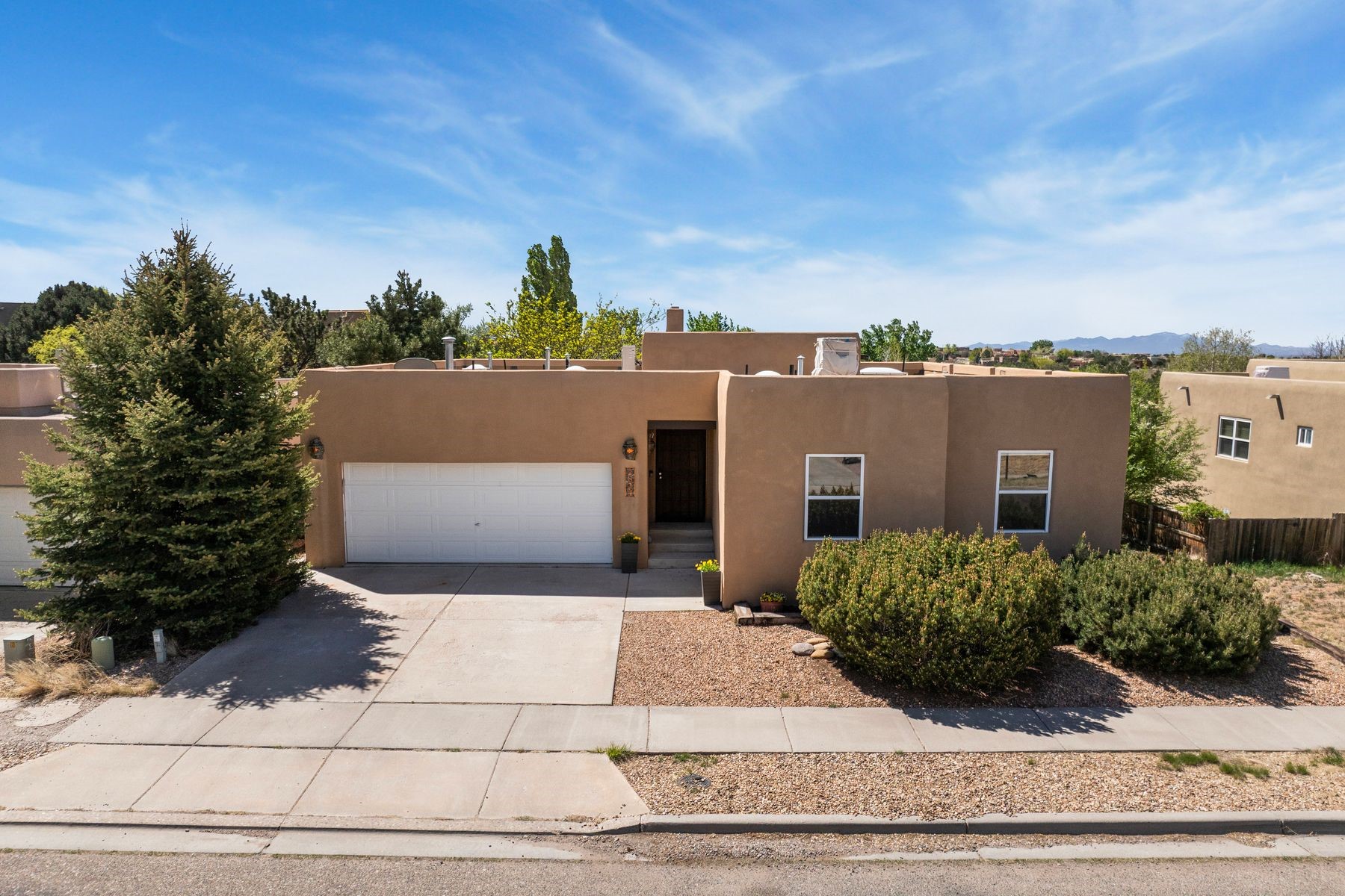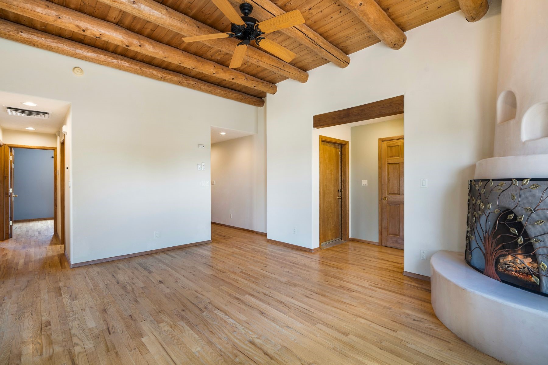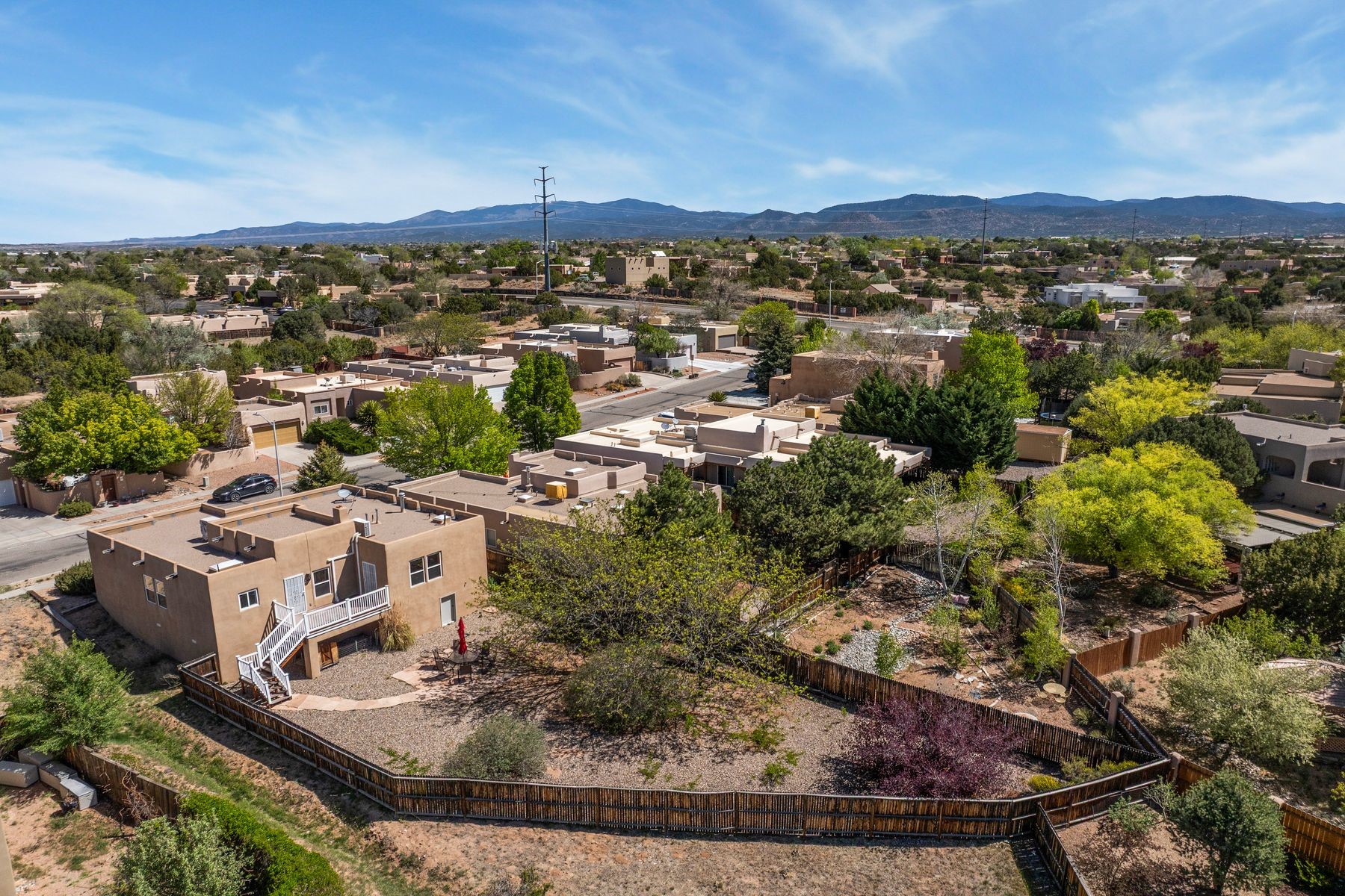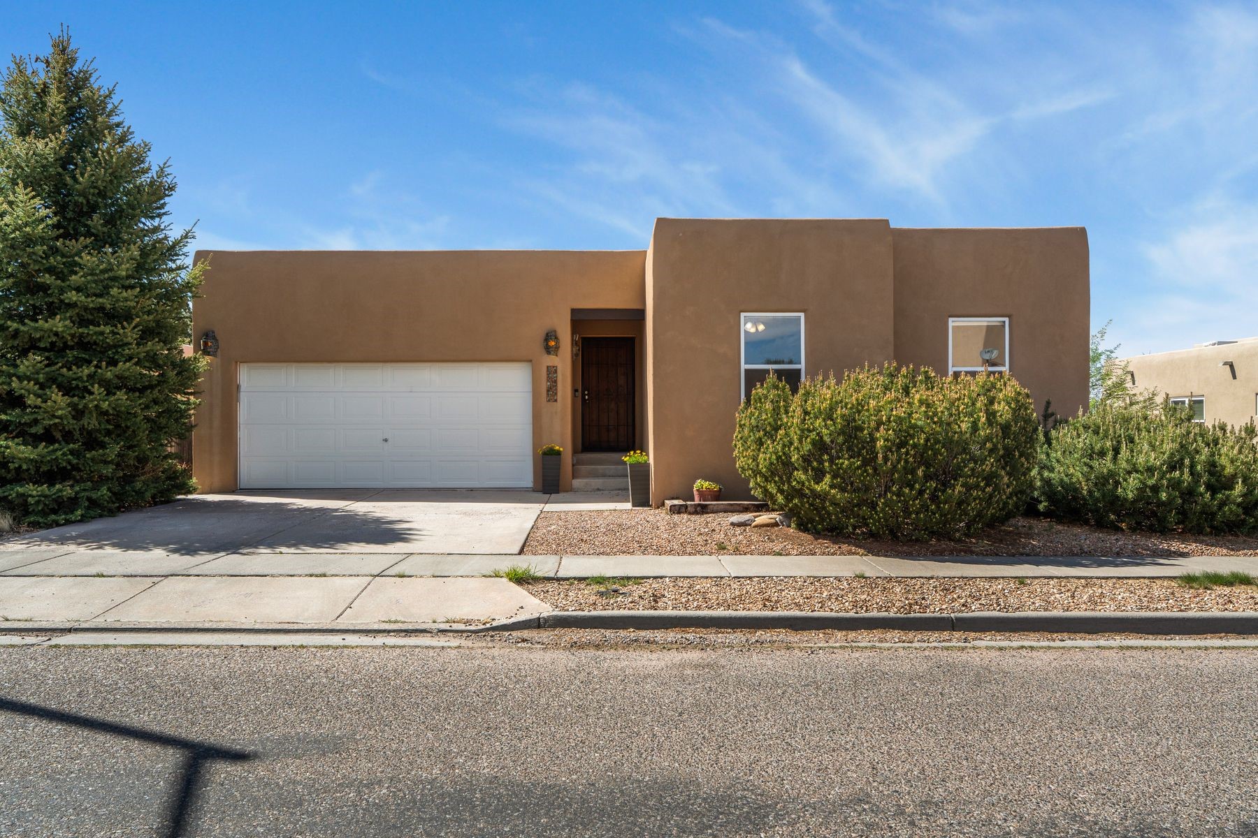 Single-level home in Pueblos del Sol with Ortiz and Sandia mountain views, located just 10 minutes from downtown Santa Fe and 5 minutes to I-25. This 3 bedroom, 2 bath residence offers 1,336 square feet on a .17-acre lot with no interior steps, good bedroom separation, and a functional layout designed for comfortable everyday living. The home features wood flooring throughout with no carpet, along with high ceilings, exposed vigas, and nichos that reflect classic Santa Fe architectural character. The living room opens to a deck with direct access from both the main living area and the primary bedroom, creating a seamless connection to outdoor space. The kitchen and dining areas flow easily into the living room, supporting both daily living and gathering. The primary bedroom is en-suite and positioned separately from the guest bedrooms, offering privacy and flexibility. Two additional bedrooms and a second bathroom accommodate guests, workspace, or additional living needs. Comfort systems include forced air heating and ductless mini-split systems in the living room and primary bedroom for supplemental heating and cooling. A new water heater was installed in 2025. Outdoor features include a large, fully fenced backyard with ample space for outdoor living, pets, or gardening. A spacious basement provides additional storage. Additional highlights include a two-car garage and low HOA dues. The Pueblos del Sol community offers walking paths, parks, and playgrounds, with a coffee shop and nearby amenities within walking distance. This property combines single-level living, outdoor space, and proximity to Santa Fe's amenities in a well-established and desirable neighborhood.
