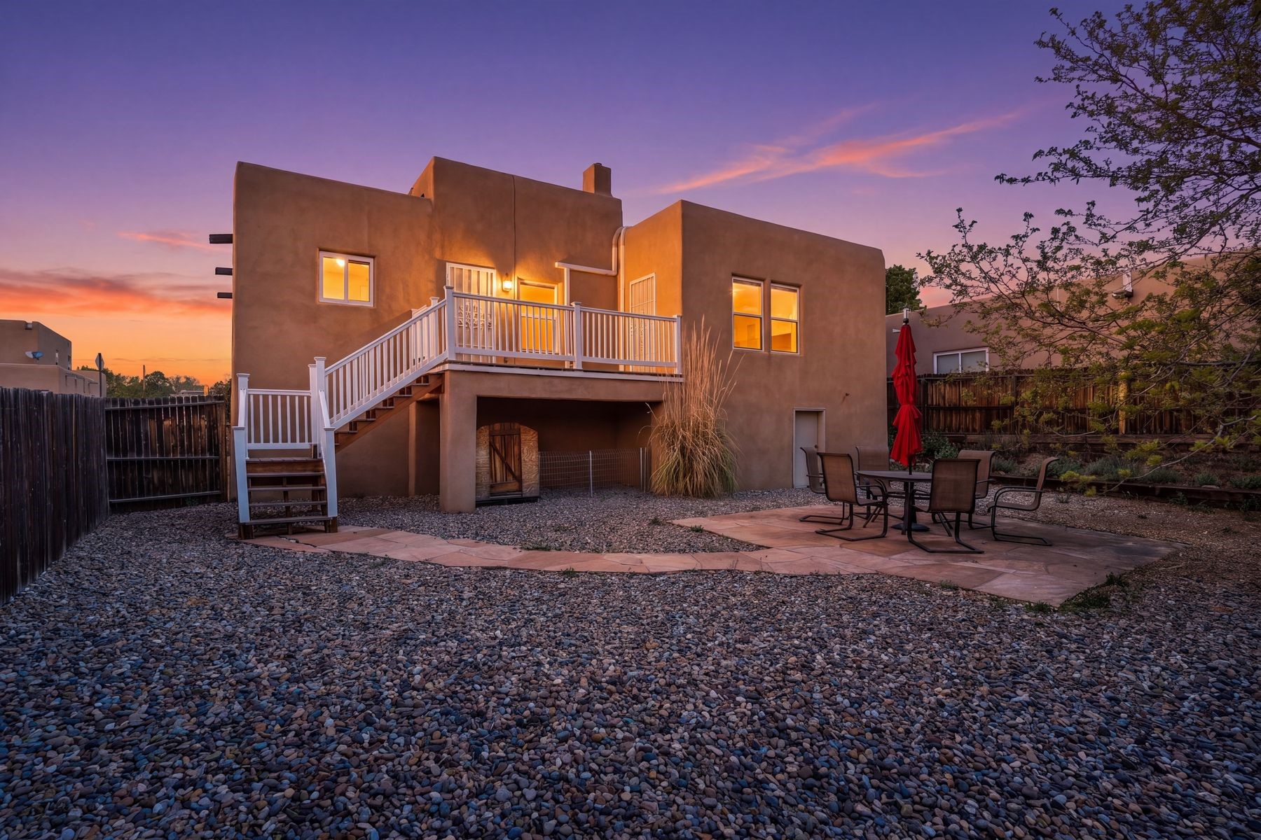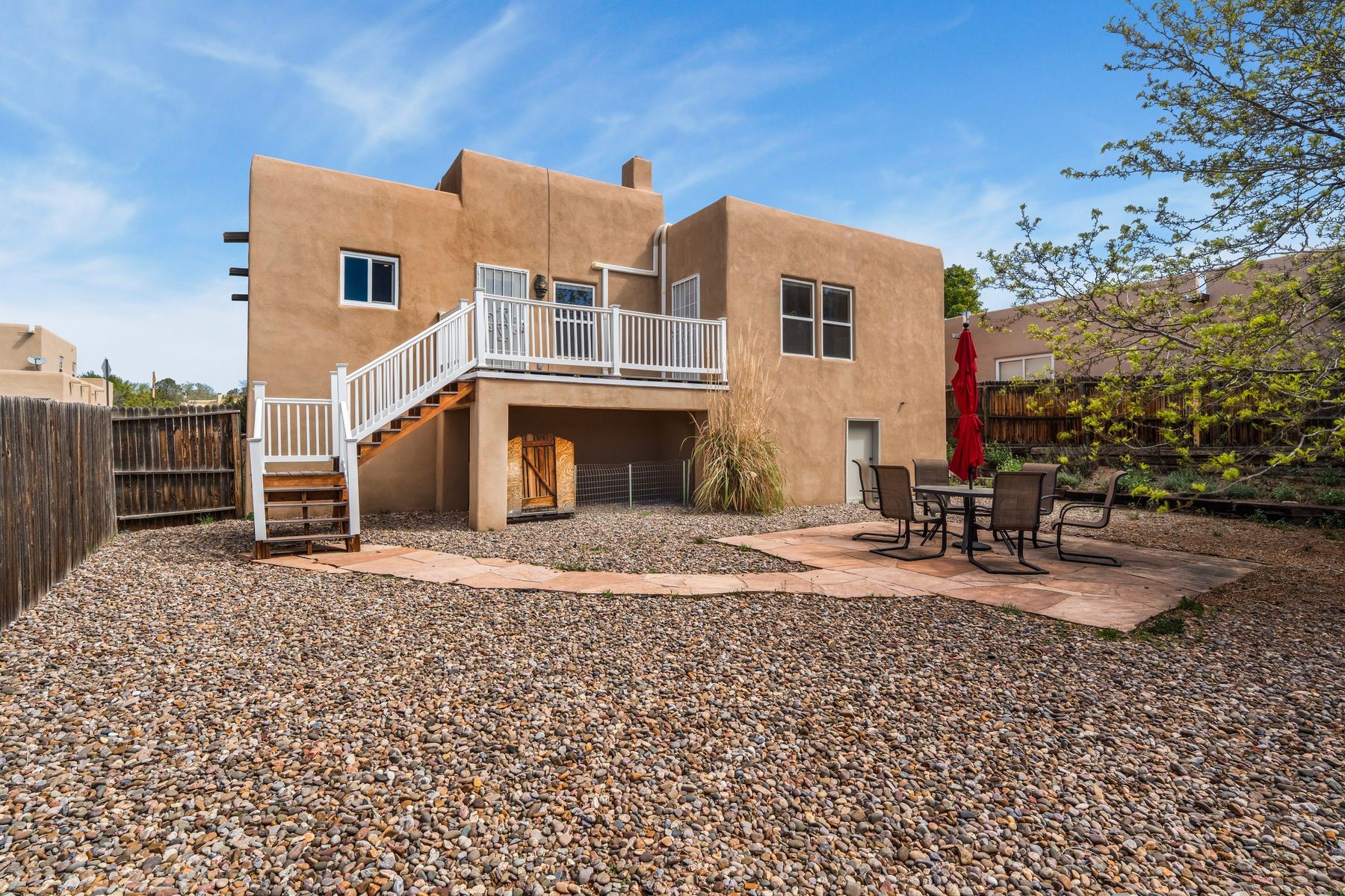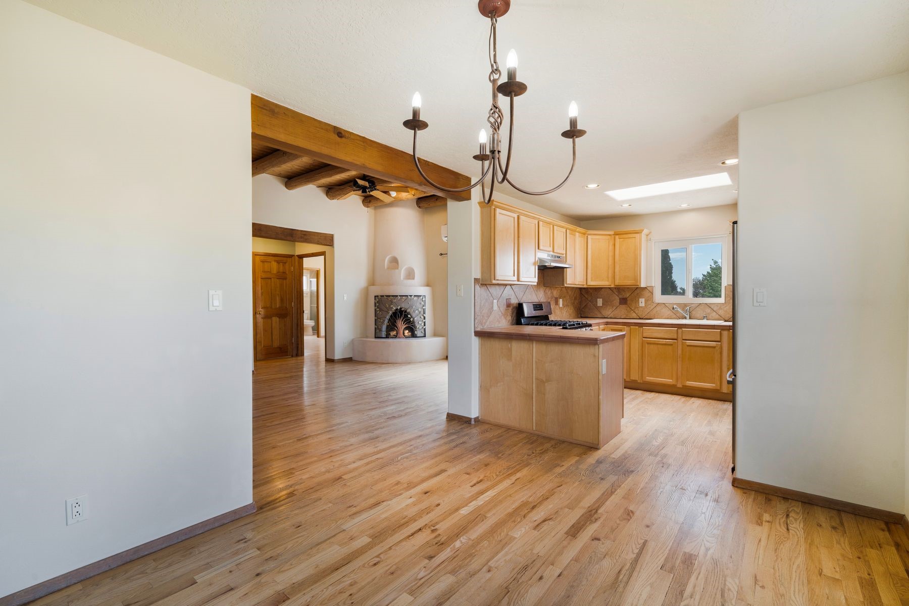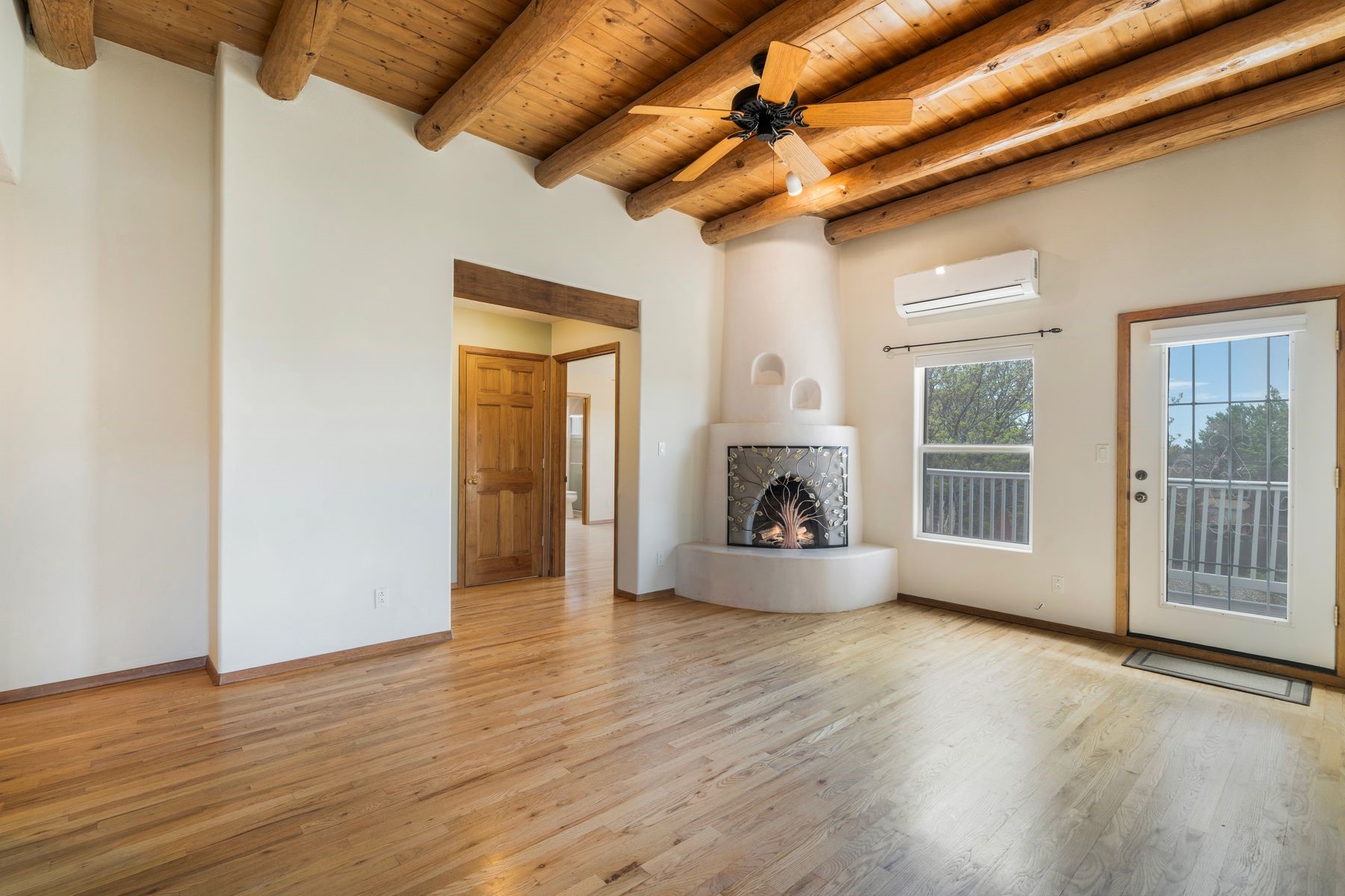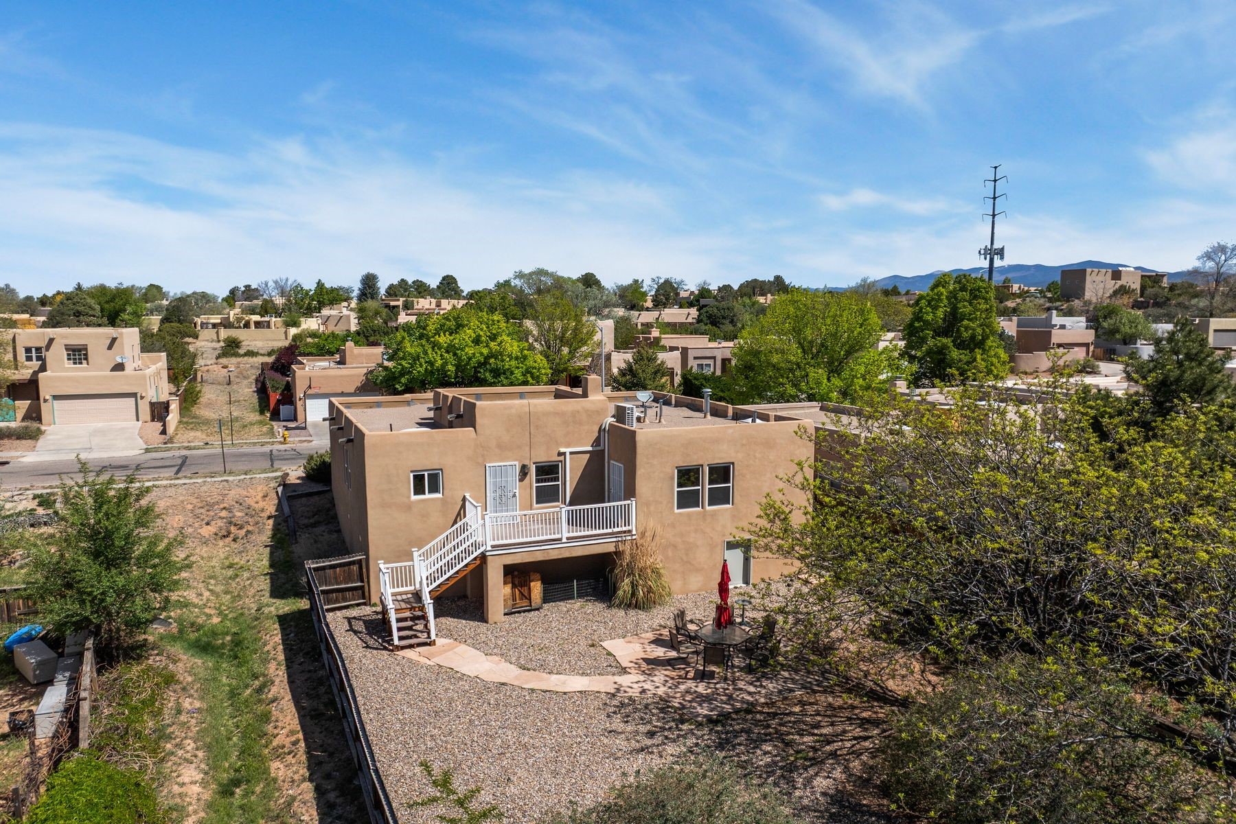 Single-level home in Pueblos del Sol with Ortiz and Sandia mountain views, located just 10 minutes from downtown Santa Fe and 5 minutes to I-25. This 3 bedroom, 2 bath residence offers 1,336 square feet on a .17-acre lot with no interior steps, good bedroom separation, and a functional layout designed for comfortable everyday living. The home features wood flooring throughout with no carpet, along with high ceilings, exposed vigas, and nichos that reflect classic Santa Fe architectural character. The living room opens to a deck with direct access from both the main living area and the primary bedroom, creating a seamless connection to outdoor space. The kitchen and dining areas flow easily into the living room, supporting both daily living and gathering. The primary bedroom is en-suite and positioned separately from the guest bedrooms, offering privacy and flexibility. Two additional bedrooms and a second bathroom accommodate guests, workspace, or additional living needs. Comfort systems include forced air heating and ductless mini-split systems in the living room and primary bedroom for supplemental heating and cooling. A new water heater was installed in 2025. Outdoor features include a large, fully fenced backyard with ample space for outdoor living, pets, or gardening. A spacious basement provides additional storage. Additional highlights include a two-car garage and low HOA dues. The Pueblos del Sol community offers walking paths, parks, and playgrounds, with a coffee shop and nearby amenities within walking distance. This property combines single-level living, outdoor space, and proximity to Santa Fe's amenities in a well-established and desirable neighborhood.