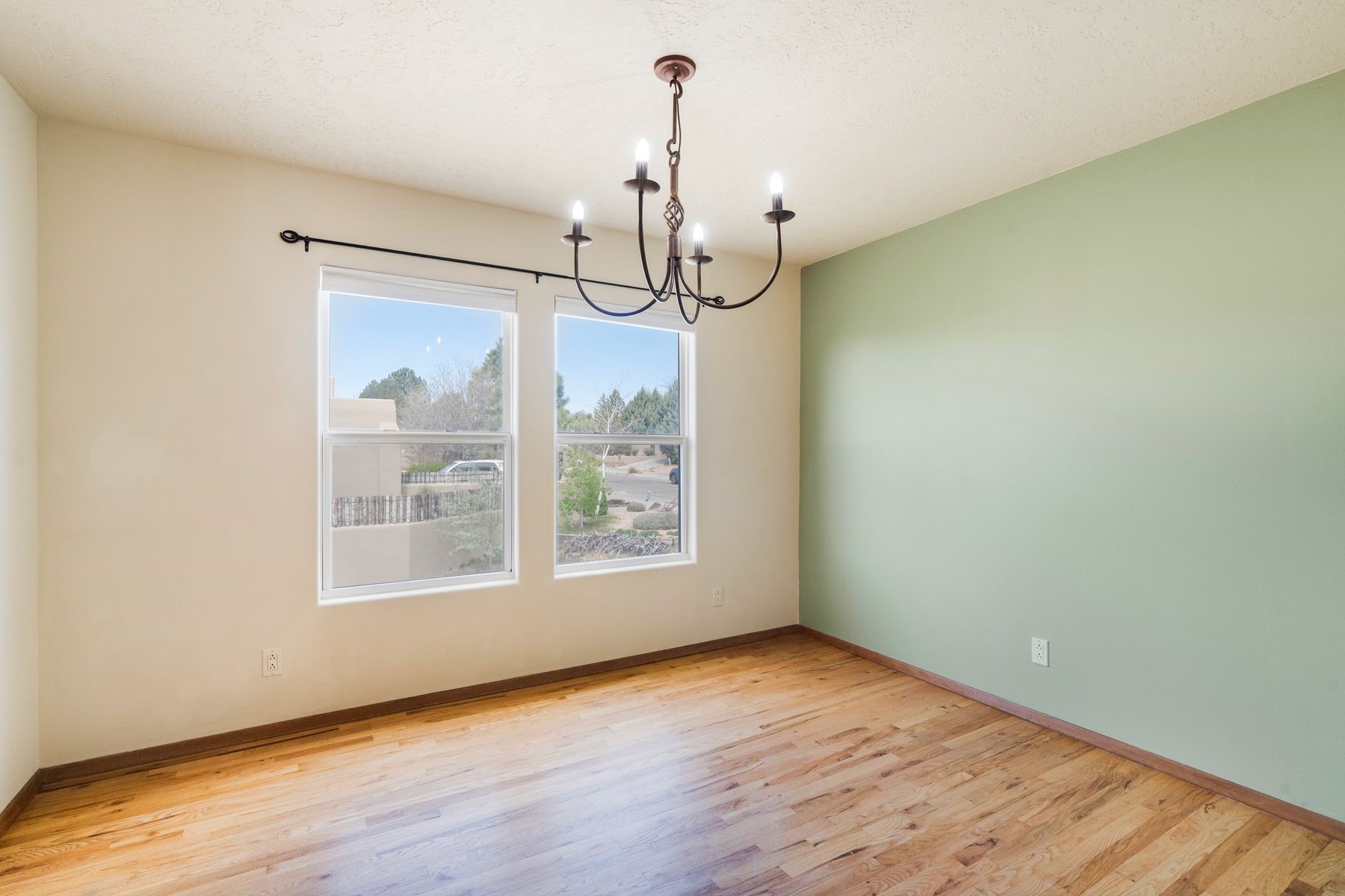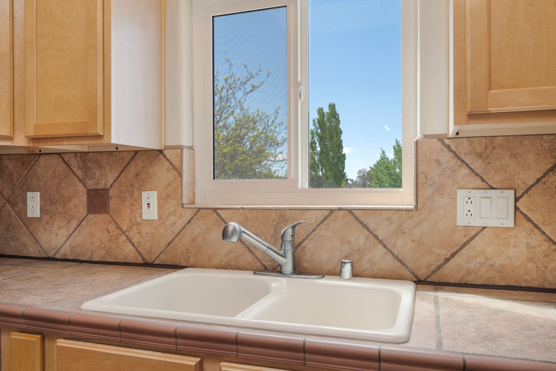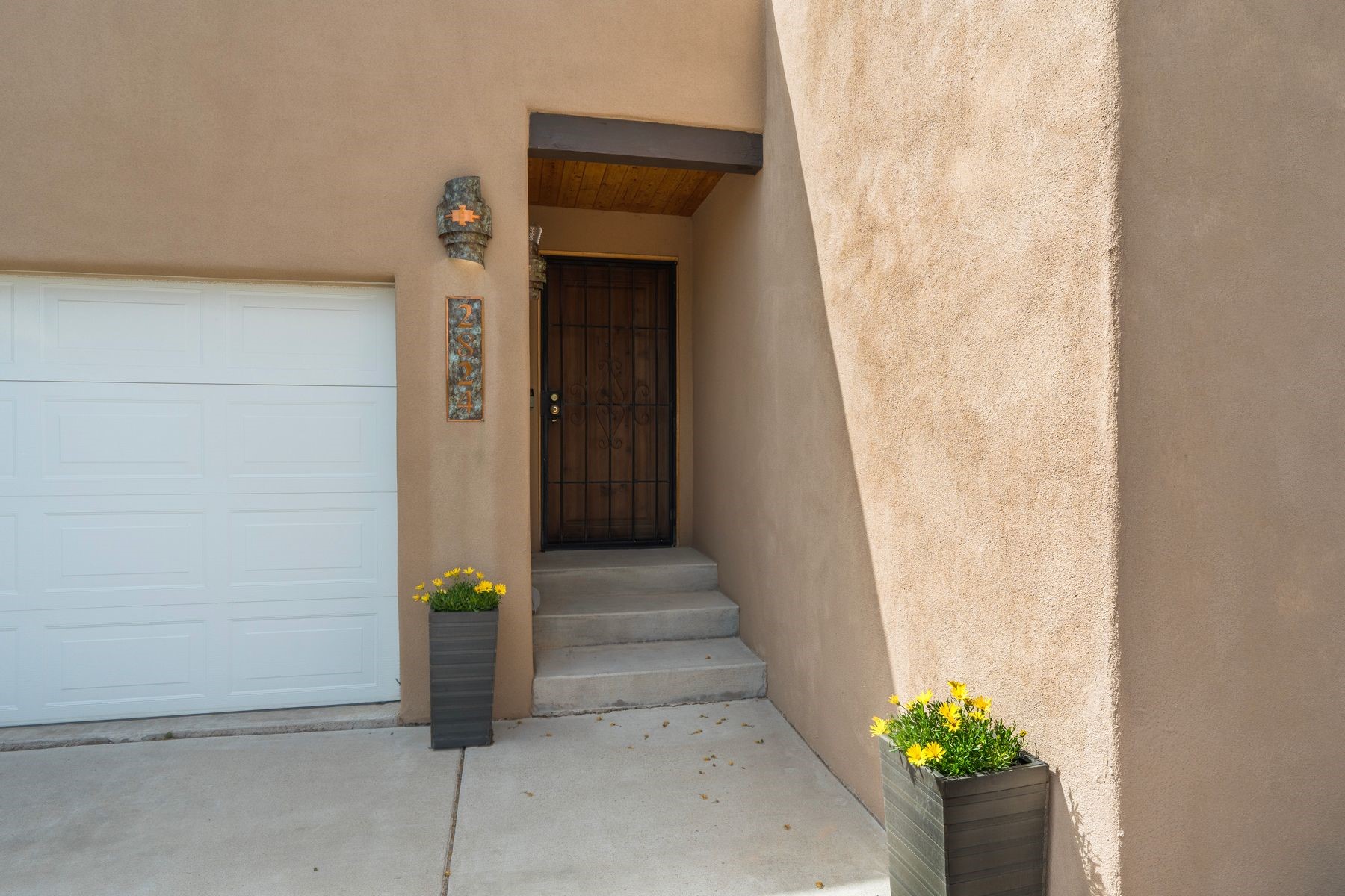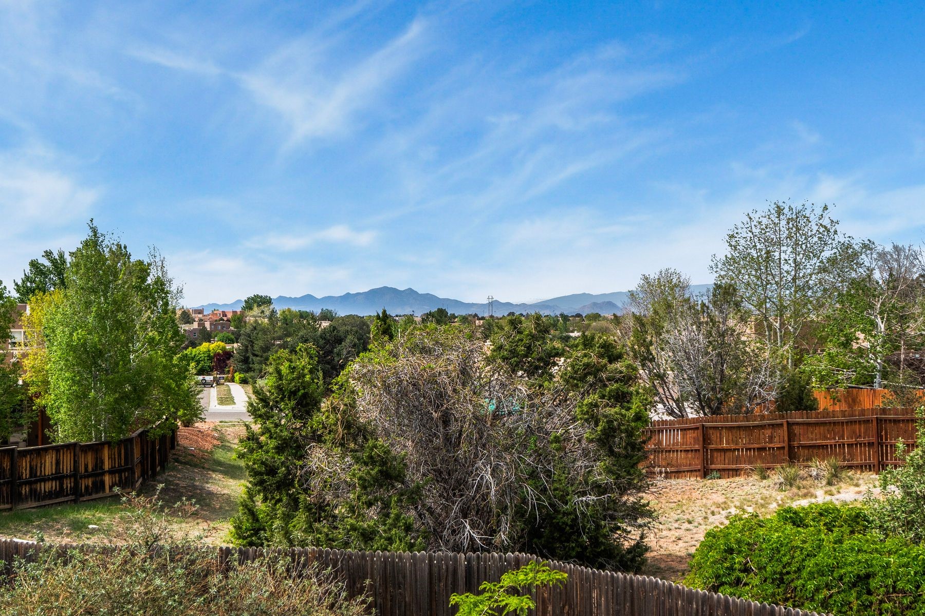 Single-level home in Pueblos del Sol with Ortiz and Sandia mountain views, located just 10 minutes from downtown Santa Fe and 5 minutes to I-25. This 3 bedroom, 2 bath residence offers 1,336 square feet on a .17-acre lot with no interior steps, good bedroom separation, and a functional layout designed for comfortable everyday living. The home features wood flooring throughout with no carpet, along with high ceilings, exposed vigas, and nichos that reflect classic Santa Fe architectural character. The living room opens to a deck with direct access from both the main living area and the primary bedroom, creating a seamless connection to outdoor space. The kitchen and dining areas flow easily into the living room, supporting both daily living and gathering. The primary bedroom is en-suite and positioned separately from the guest bedrooms, offering privacy and flexibility. Two additional bedrooms and a second bathroom accommodate guests, workspace, or additional living needs. Comfort systems include forced air heating and ductless mini-split systems in the living room and primary bedroom for supplemental heating and cooling. A new water heater was installed in 2025. Outdoor features include a large, fully fenced backyard with ample space for outdoor living, pets, or gardening. A spacious basement provides additional storage. Additional highlights include a two-car garage and low HOA dues. The Pueblos del Sol community offers walking paths, parks, and playgrounds, with a coffee shop and nearby amenities within walking distance. This property combines single-level living, outdoor space, and proximity to Santa Fe's amenities in a well-established and desirable neighborhood.
