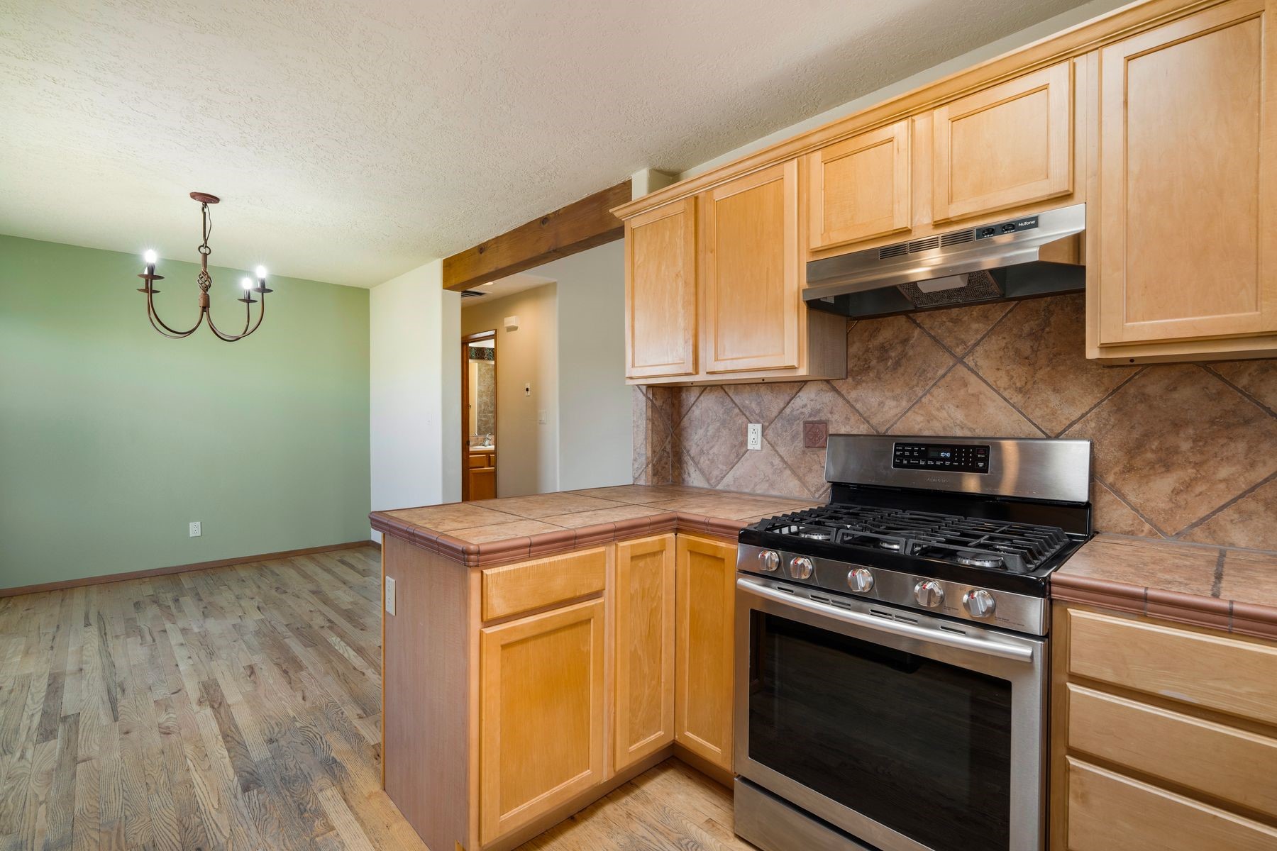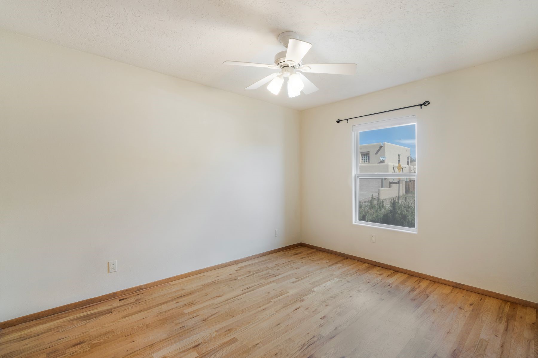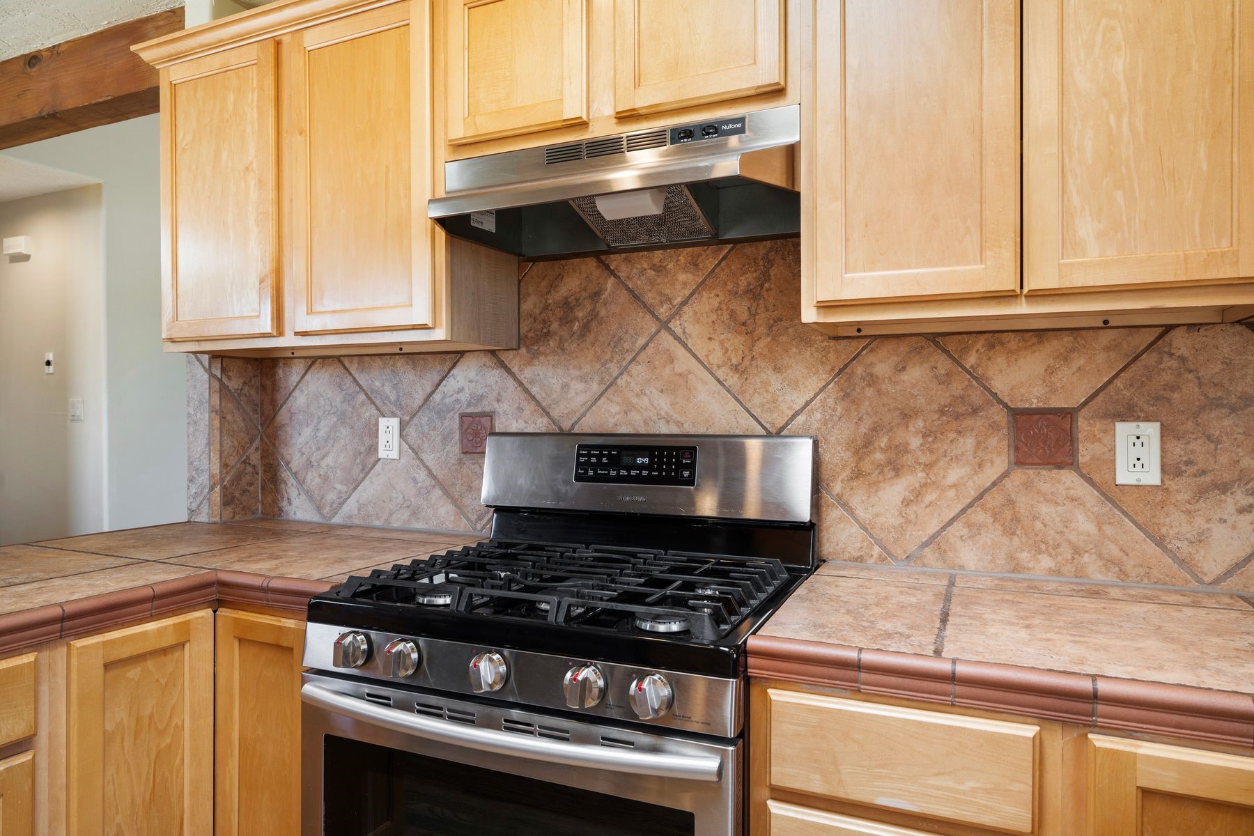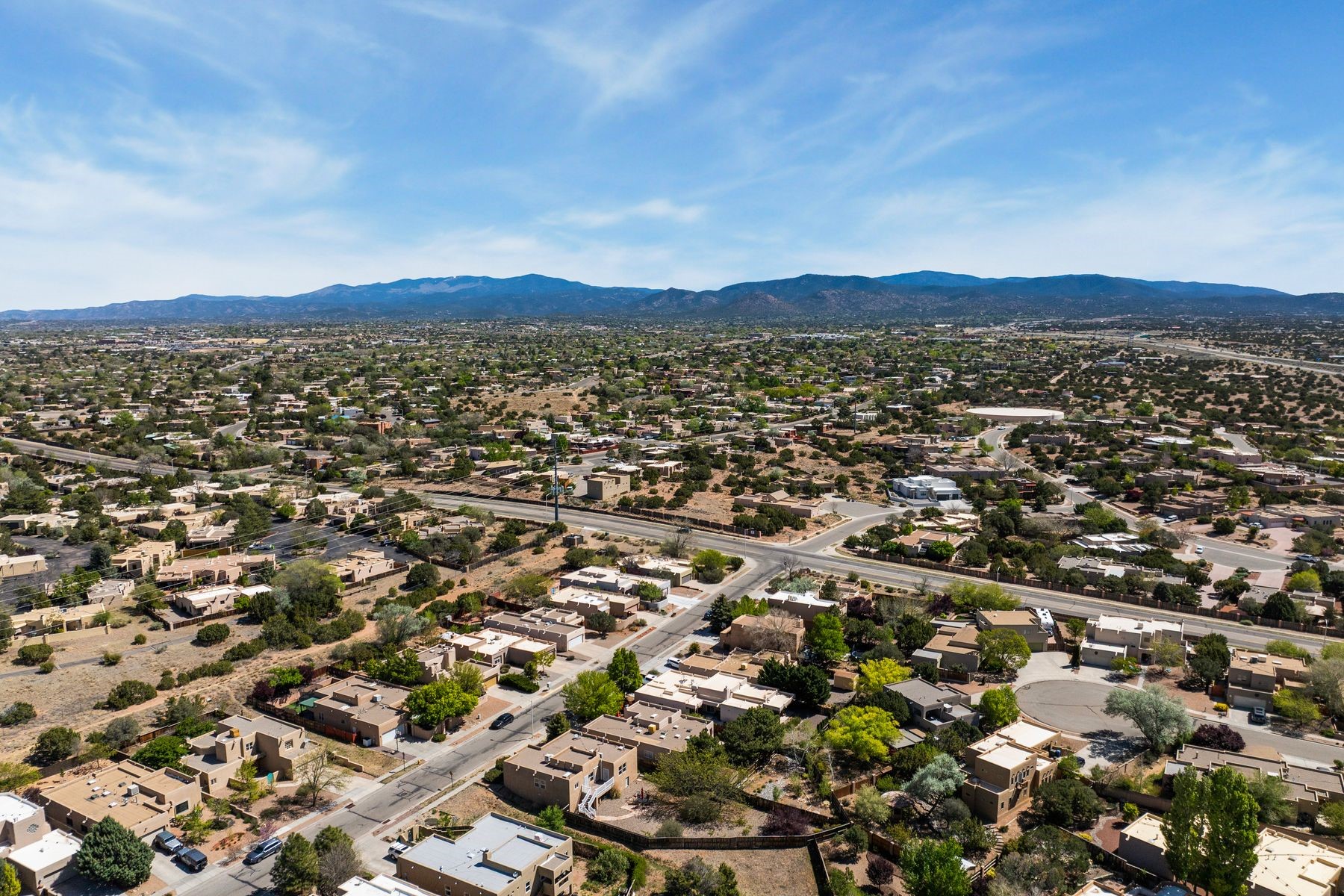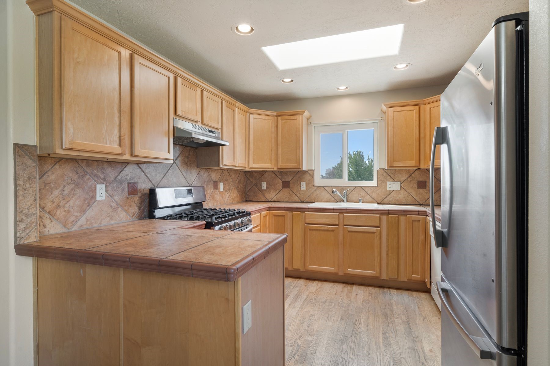 Single-level home in Pueblos del Sol with Ortiz and Sandia mountain views, located just 10 minutes from downtown Santa Fe and 5 minutes to I-25. This 3 bedroom, 2 bath residence offers 1,336 square feet on a .17-acre lot with no interior steps, good bedroom separation, and a functional layout designed for comfortable everyday living. The home features wood flooring throughout with no carpet, along with high ceilings, exposed vigas, and nichos that reflect classic Santa Fe architectural character. The living room opens to a deck with direct access from both the main living area and the primary bedroom, creating a seamless connection to outdoor space. The kitchen and dining areas flow easily into the living room, supporting both daily living and gathering. The primary bedroom is en-suite and positioned separately from the guest bedrooms, offering privacy and flexibility. Two additional bedrooms and a second bathroom accommodate guests, workspace, or additional living needs. Comfort systems include forced air heating and ductless mini-split systems in the living room and primary bedroom for supplemental heating and cooling. A new water heater was installed in 2025. Outdoor features include a large, fully fenced backyard with ample space for outdoor living, pets, or gardening. A spacious basement provides additional storage. Additional highlights include a two-car garage and low HOA dues. The Pueblos del Sol community offers walking paths, parks, and playgrounds, with a coffee shop and nearby amenities within walking distance. This property combines single-level living, outdoor space, and proximity to Santa Fe's amenities in a well-established and desirable neighborhood.