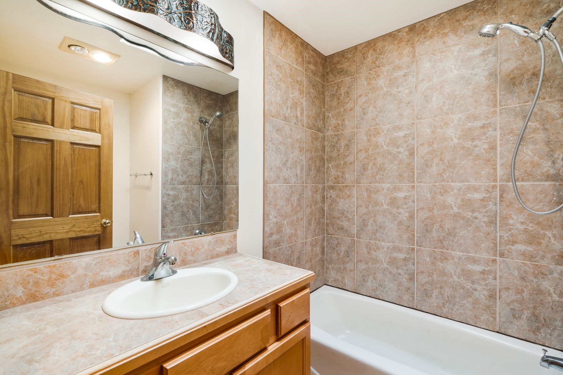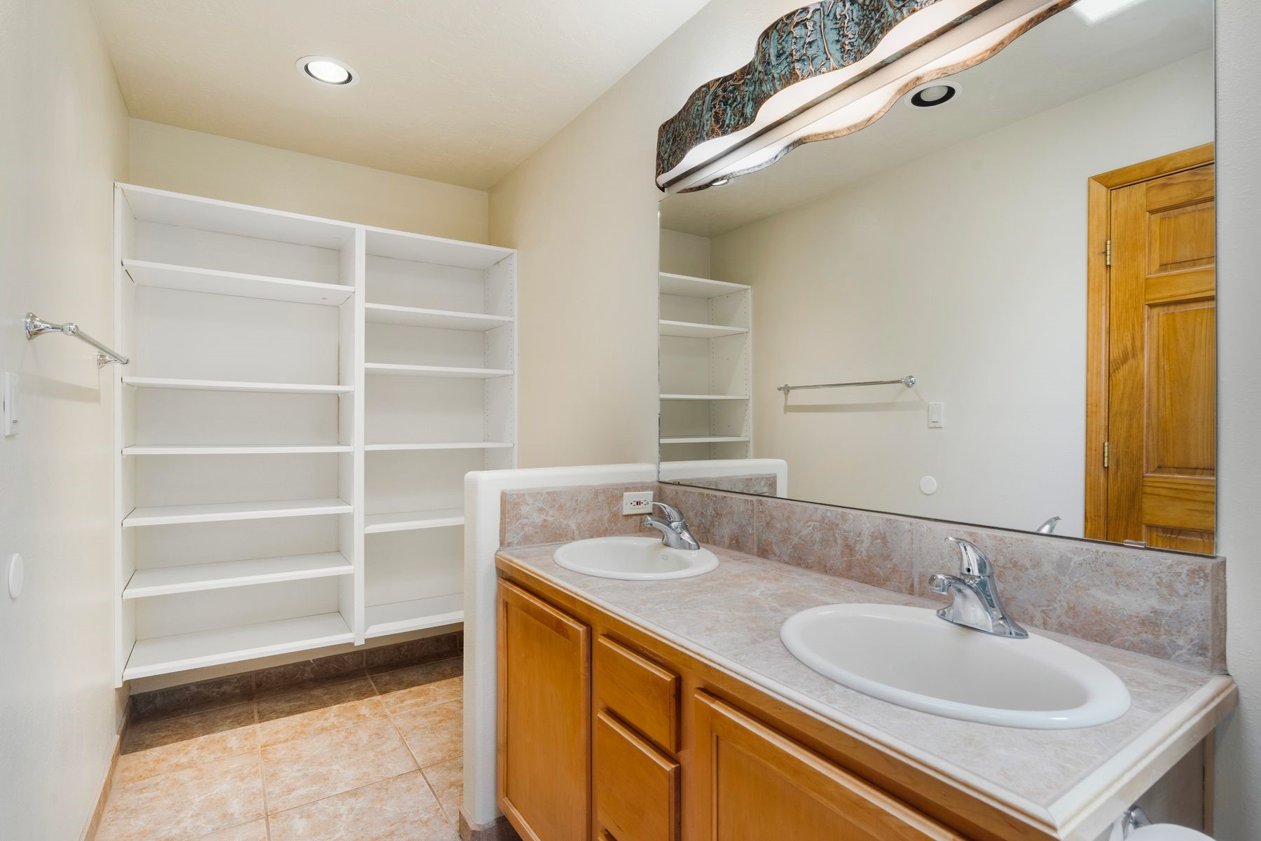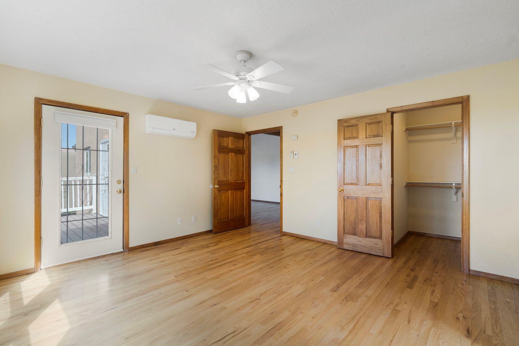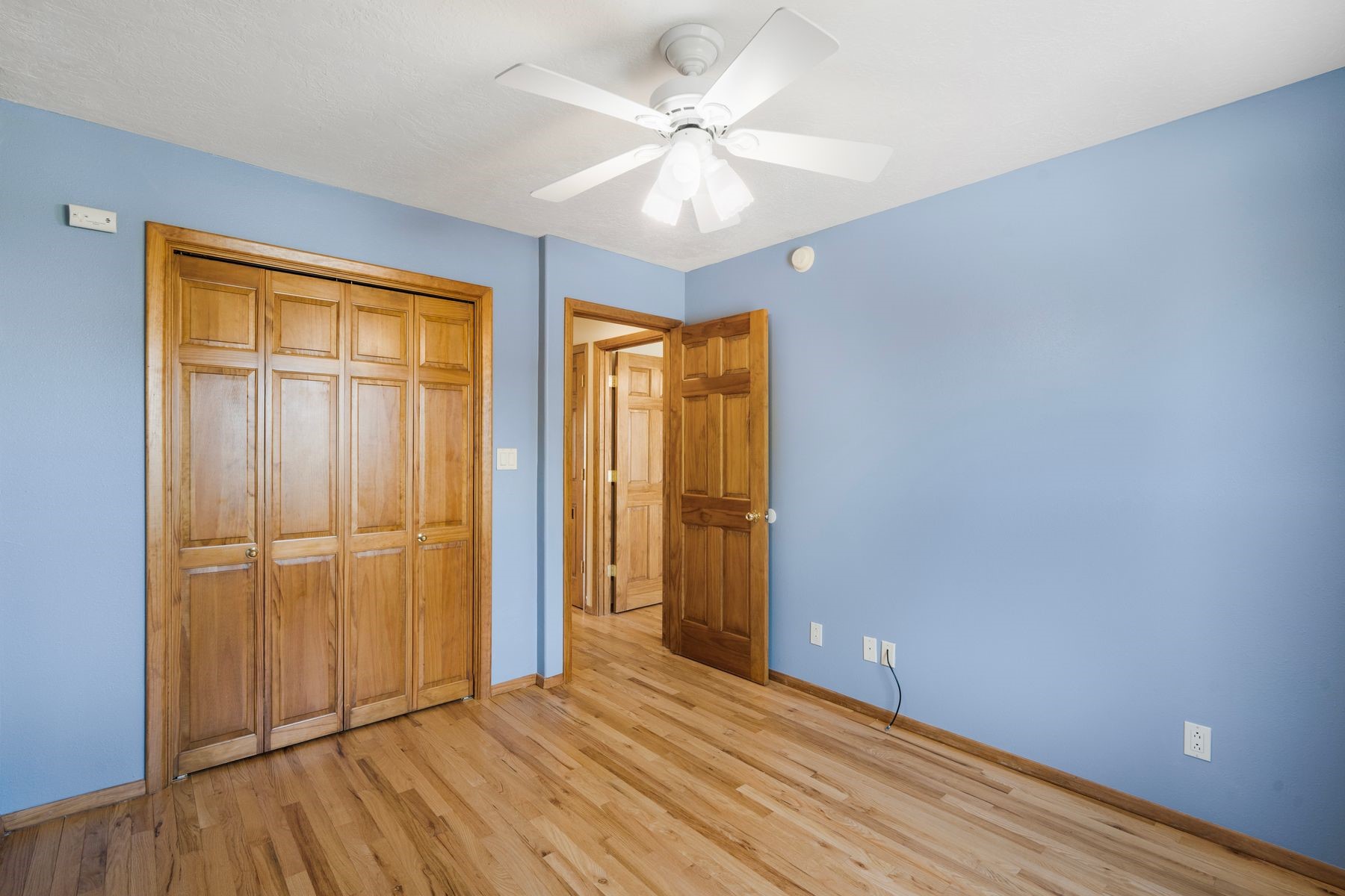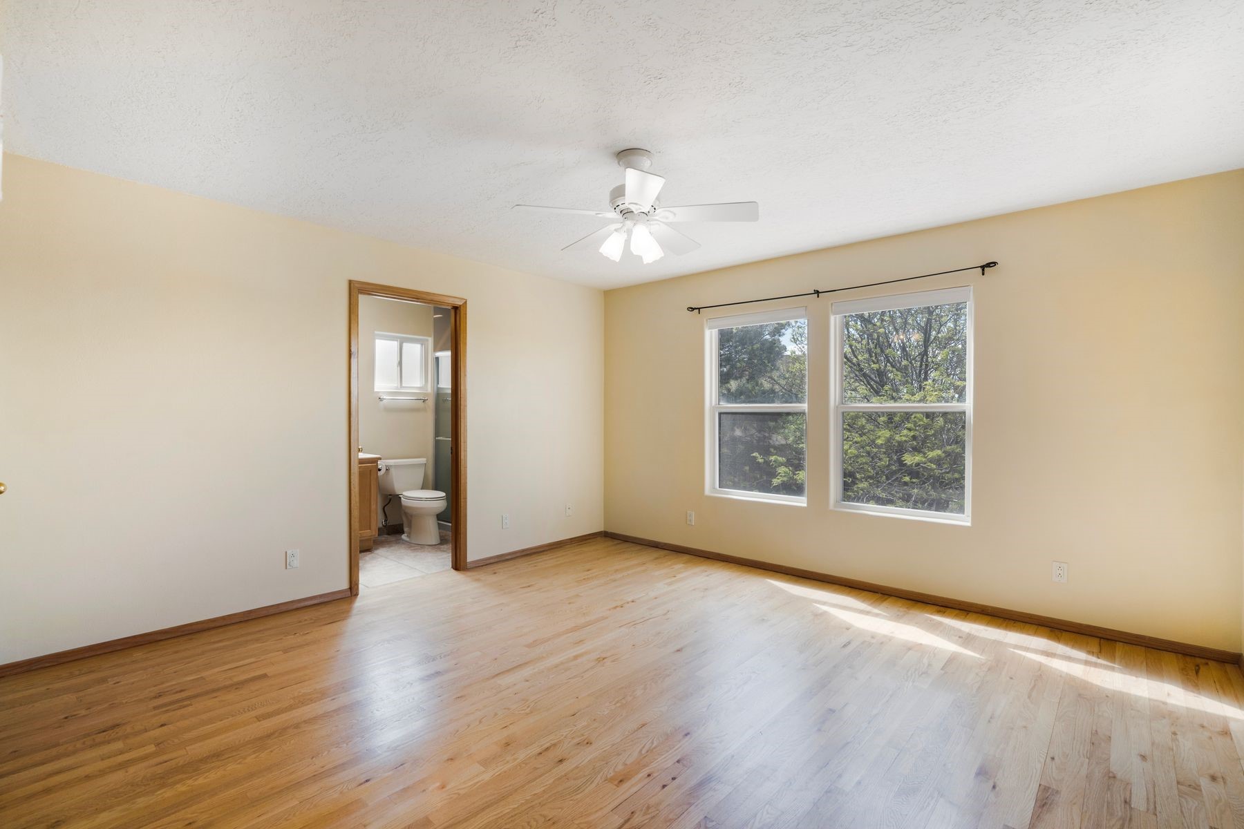 Single-level home in Pueblos del Sol with Ortiz and Sandia mountain views, located just 10 minutes from downtown Santa Fe and 5 minutes to I-25. This 3 bedroom, 2 bath residence offers 1,336 square feet on a .17-acre lot with no interior steps, good bedroom separation, and a functional layout designed for comfortable everyday living. The home features wood flooring throughout with no carpet, along with high ceilings, exposed vigas, and nichos that reflect classic Santa Fe architectural character. The living room opens to a deck with direct access from both the main living area and the primary bedroom, creating a seamless connection to outdoor space. The kitchen and dining areas flow easily into the living room, supporting both daily living and gathering. The primary bedroom is en-suite and positioned separately from the guest bedrooms, offering privacy and flexibility. Two additional bedrooms and a second bathroom accommodate guests, workspace, or additional living needs. Comfort systems include forced air heating and ductless mini-split systems in the living room and primary bedroom for supplemental heating and cooling. A new water heater was installed in 2025. Outdoor features include a large, fully fenced backyard with ample space for outdoor living, pets, or gardening. A spacious basement provides additional storage. Additional highlights include a two-car garage and low HOA dues. The Pueblos del Sol community offers walking paths, parks, and playgrounds, with a coffee shop and nearby amenities within walking distance. This property combines single-level living, outdoor space, and proximity to Santa Fe's amenities in a well-established and desirable neighborhood.