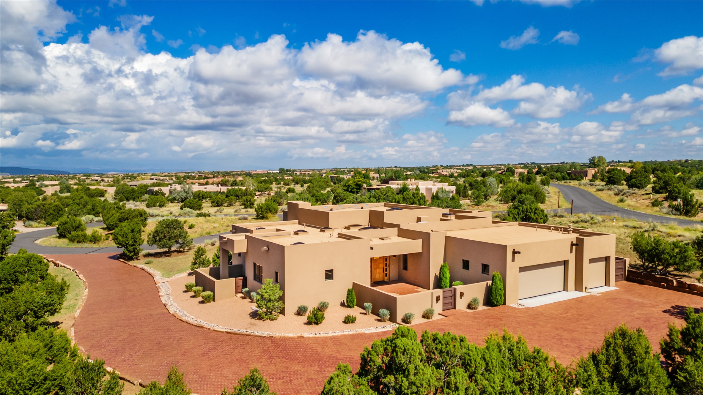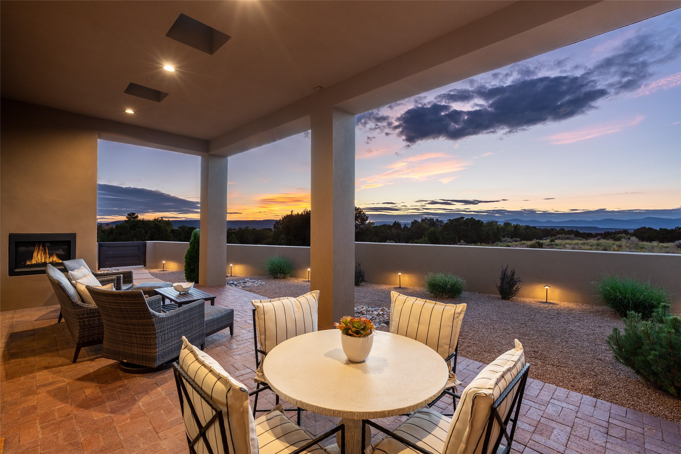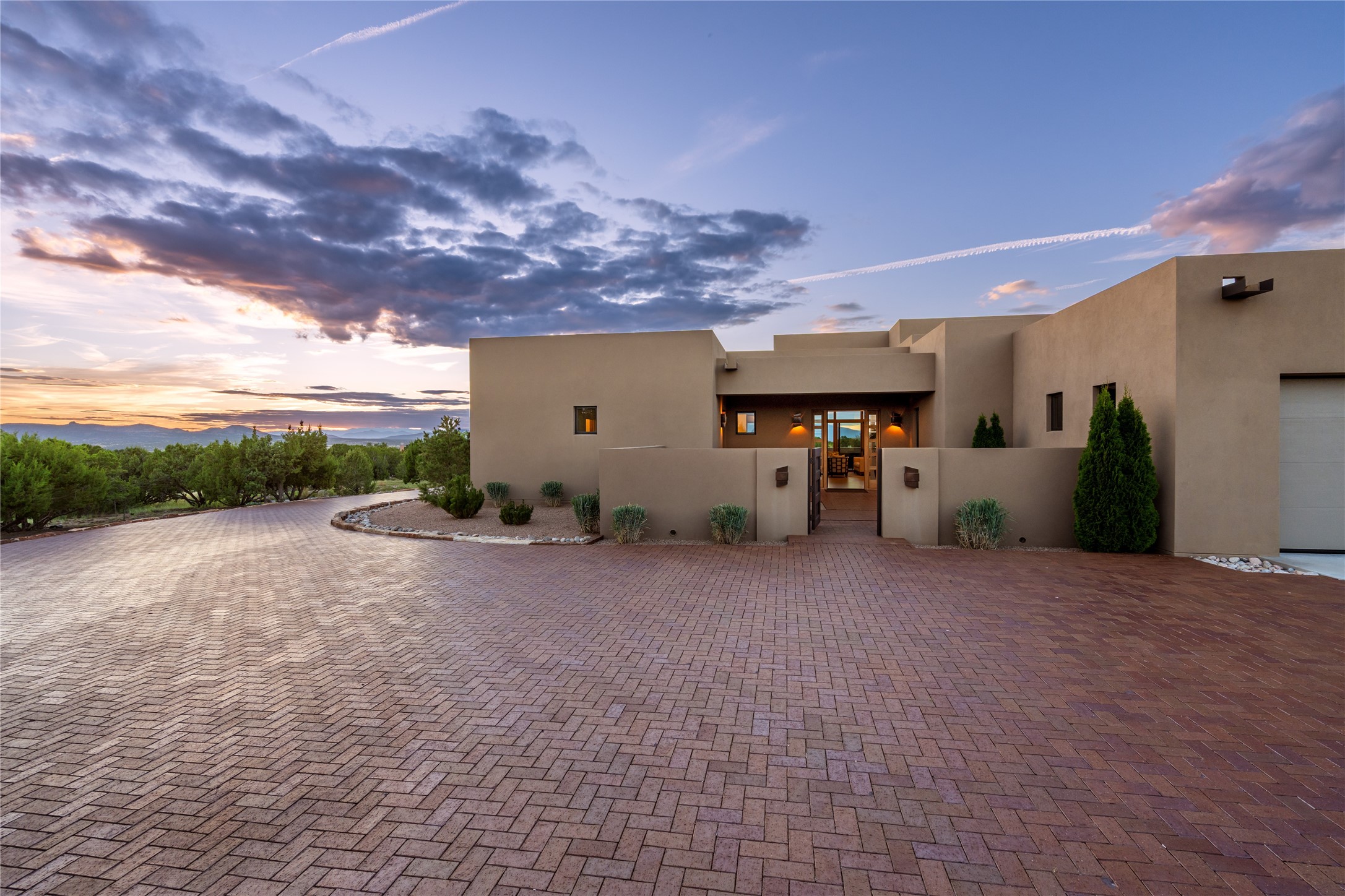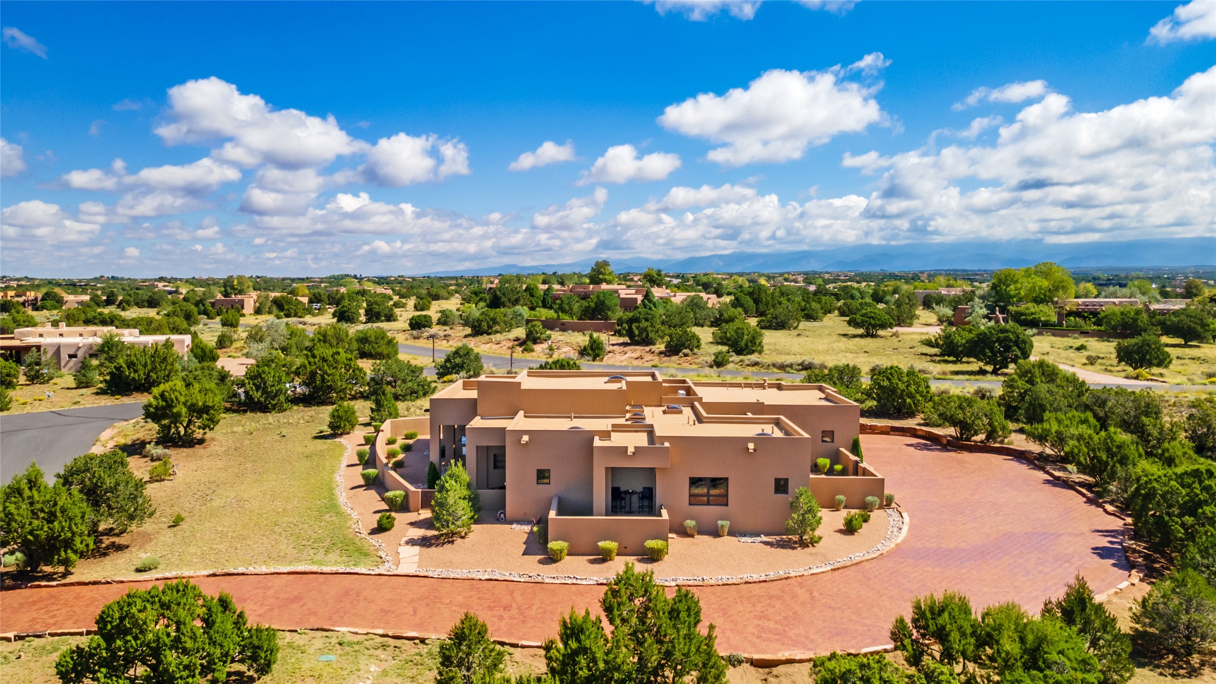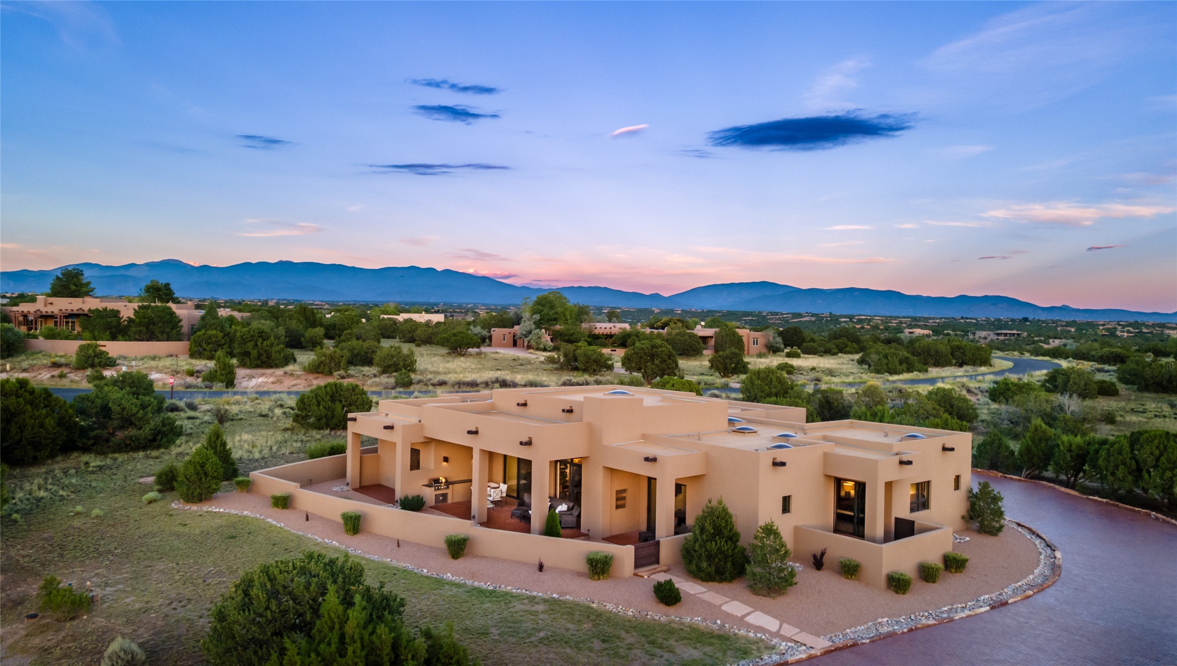 This nearly new soft contemporary home captures the essence of modern Southwest living. Set on 1.7 acres with unobstructed views of the Jemez, Sandia, and Sangre de Cristo mountains offering unforgettable sunsets and a seamless blend of indoor and outdoor spaces. Clean lines, soaring ceilings, three fireplaces, top of the line appointments, including Wolf dual ovens, and Sub-Zero refrigerator define the spacious open floor plan, making this the perfect dream home for the most discerning buyer. Built by award-winning builder Rick Driscoll, the residence offers an owner's retreat with fireplace, a second ensuite bedroom, and an attached casita with its own entrance and mini kitchen. A fourth room for media/office provides added flexibility. All rooms have their own private portals offering sweeping views. The oversized three-car garage includes an attached artist studio, a separate workshop area with new built-in cabinetry and a separate storage area. Modern systems recently installed to enhance everyday living include a water softening system, dual reverse osmosis systems, humidification system, motorized/retractable Hunter Douglas blinds, and a Sonos audio-visual system throughout the home. Updated landscaping and a newly paved brick driveway complete the exterior to welcome you to the home. The sale includes the washer and dryer, two refrigerators, and a separate freezer, making this extraordinary home ready to enjoy from day one. Private, thoughtfully designed, and surrounded by panoramic mountain views, it is a rare find in Northern New Mexico. Beautiful!!!
