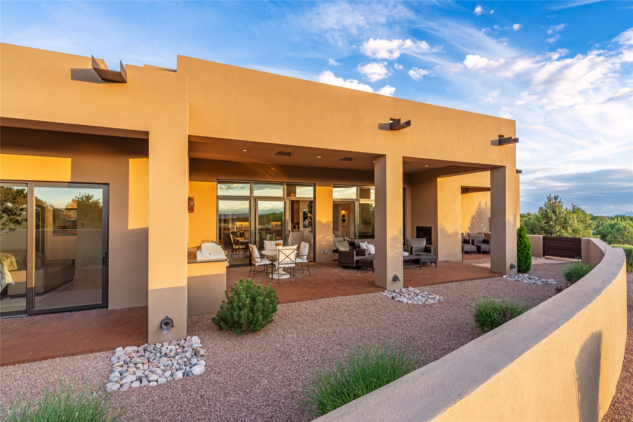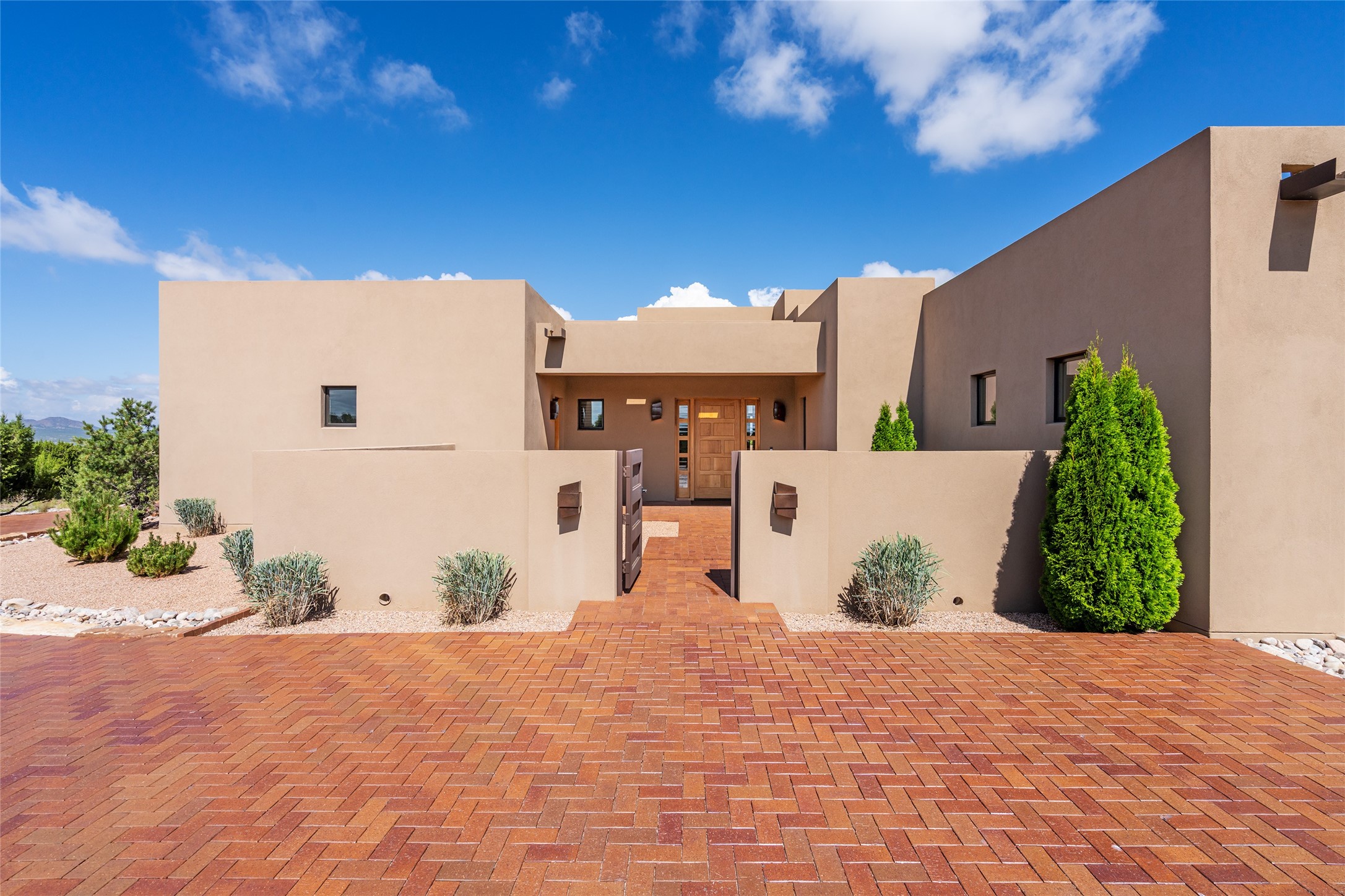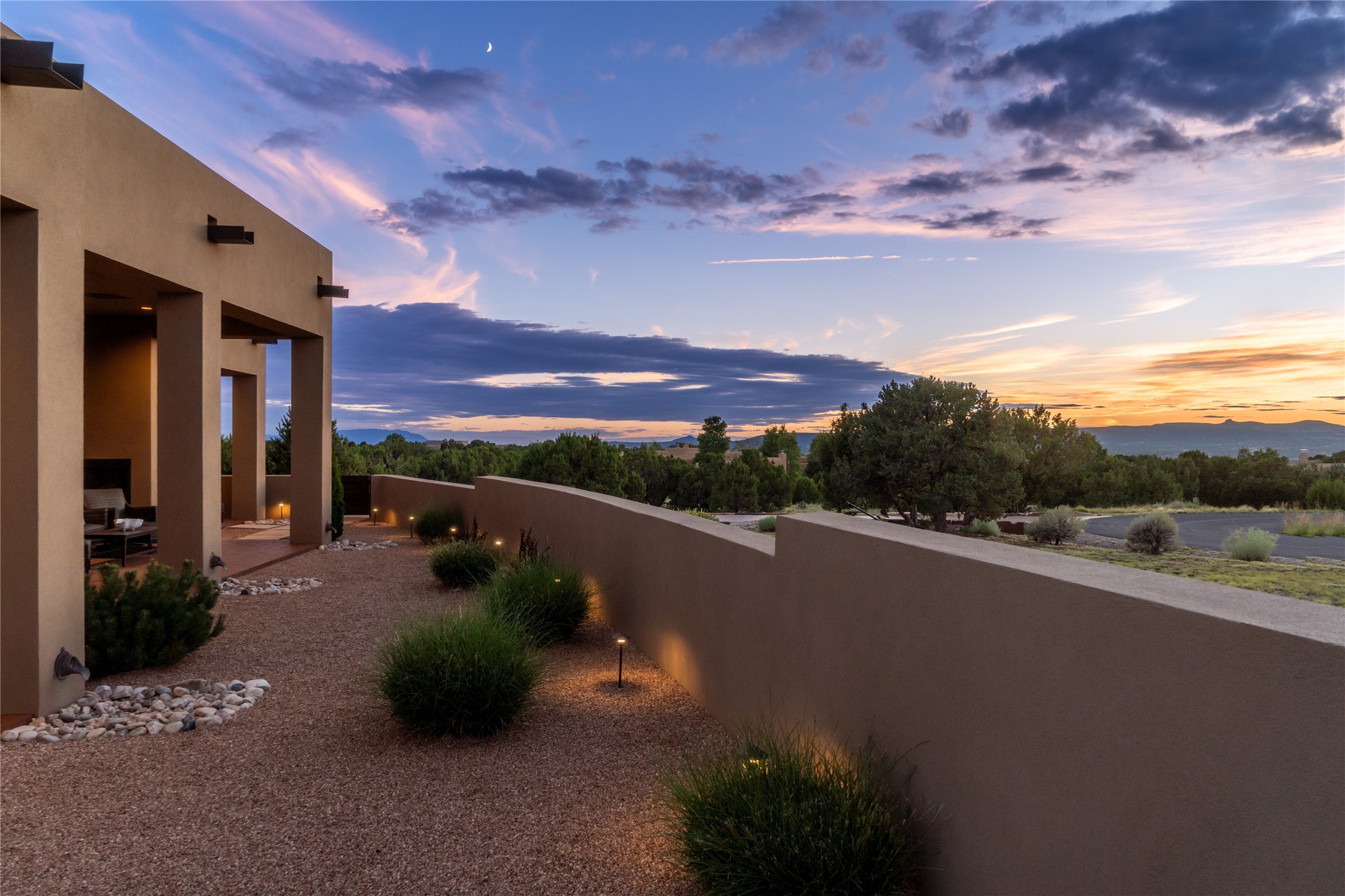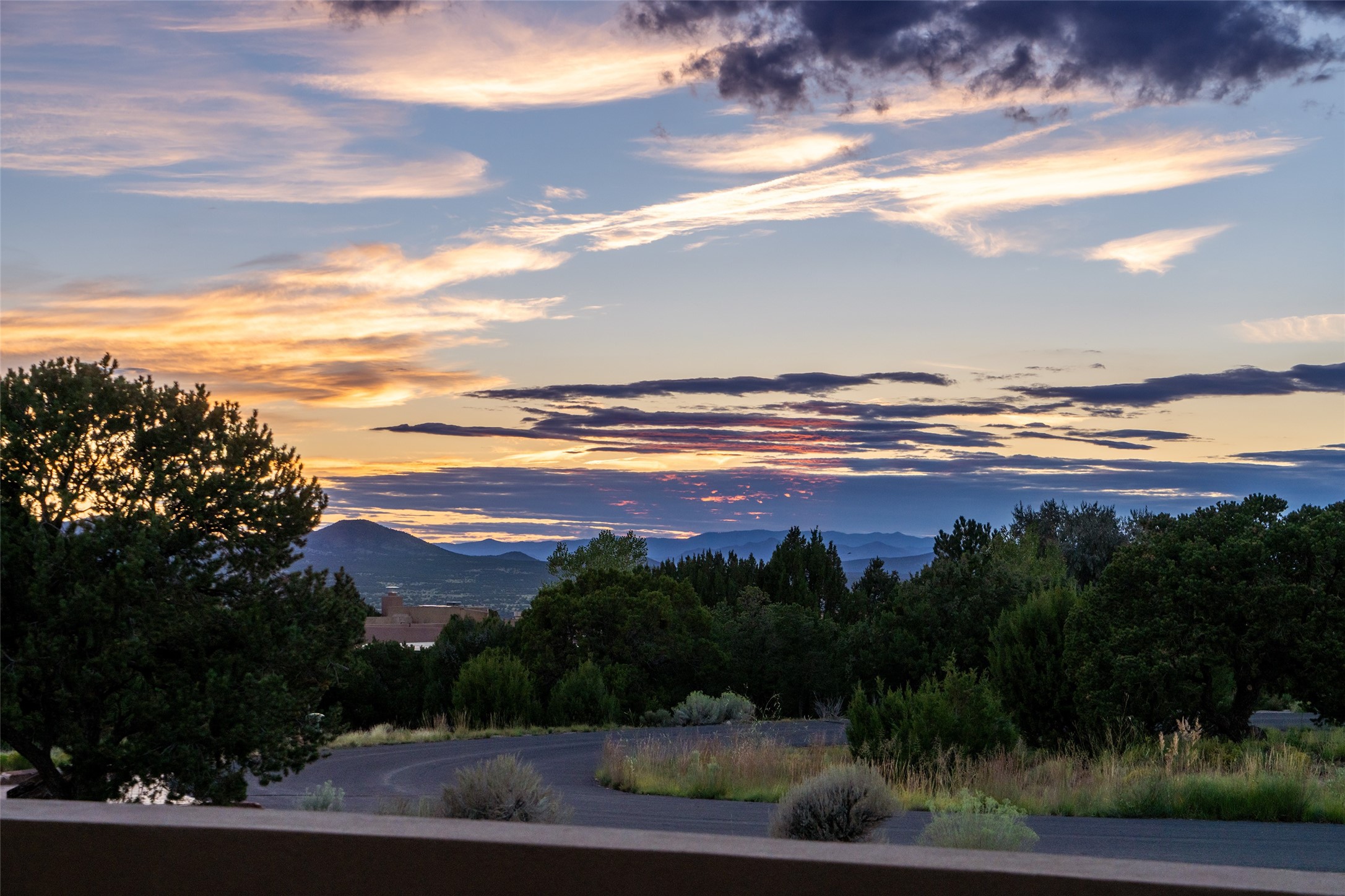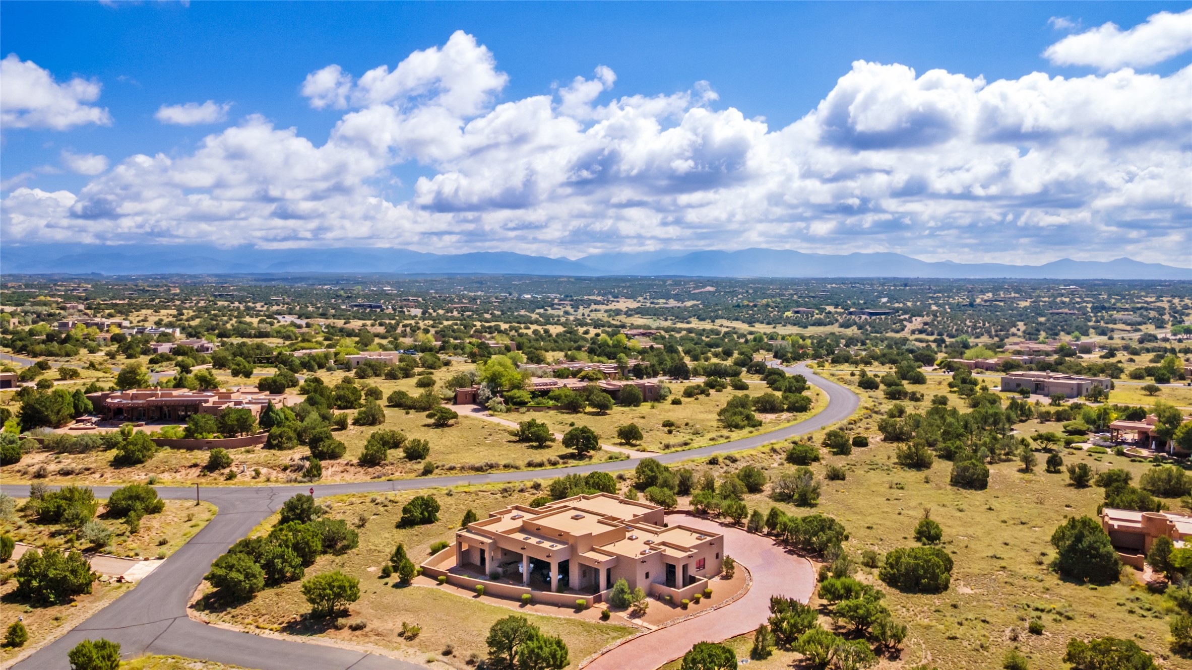 This nearly new soft contemporary home captures the essence of modern Southwest living. Set on 1.7 acres with unobstructed views of the Jemez, Sandia, and Sangre de Cristo mountains offering unforgettable sunsets and a seamless blend of indoor and outdoor spaces. Clean lines, soaring ceilings, three fireplaces, top of the line appointments, including Wolf dual ovens, and Sub-Zero refrigerator define the spacious open floor plan, making this the perfect dream home for the most discerning buyer. Built by award-winning builder Rick Driscoll, the residence offers an owner's retreat with fireplace, a second ensuite bedroom, and an attached casita with its own entrance and mini kitchen. A fourth room for media/office provides added flexibility. All rooms have their own private portals offering sweeping views. The oversized three-car garage includes an attached artist studio, a separate workshop area with new built-in cabinetry and a separate storage area. Modern systems recently installed to enhance everyday living include a water softening system, dual reverse osmosis systems, humidification system, motorized/retractable Hunter Douglas blinds, and a Sonos audio-visual system throughout the home. Updated landscaping and a newly paved brick driveway complete the exterior to welcome you to the home. The sale includes the washer and dryer, two refrigerators, and a separate freezer, making this extraordinary home ready to enjoy from day one. Private, thoughtfully designed, and surrounded by panoramic mountain views, it is a rare find in Northern New Mexico. Beautiful!!!