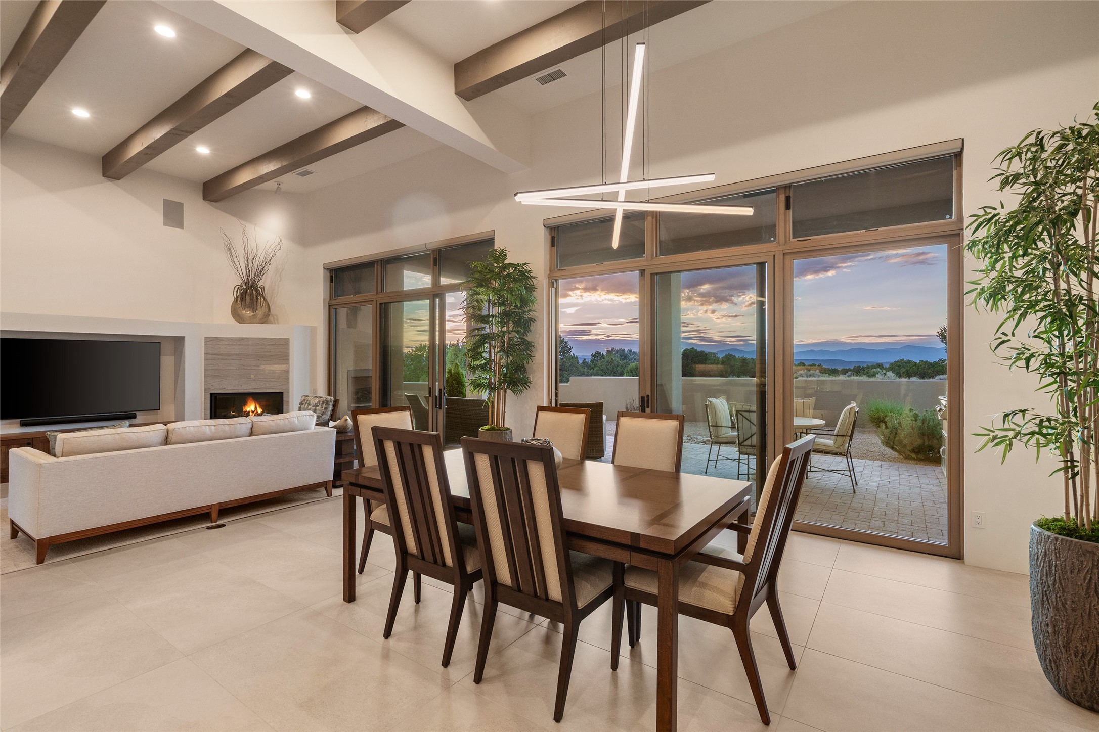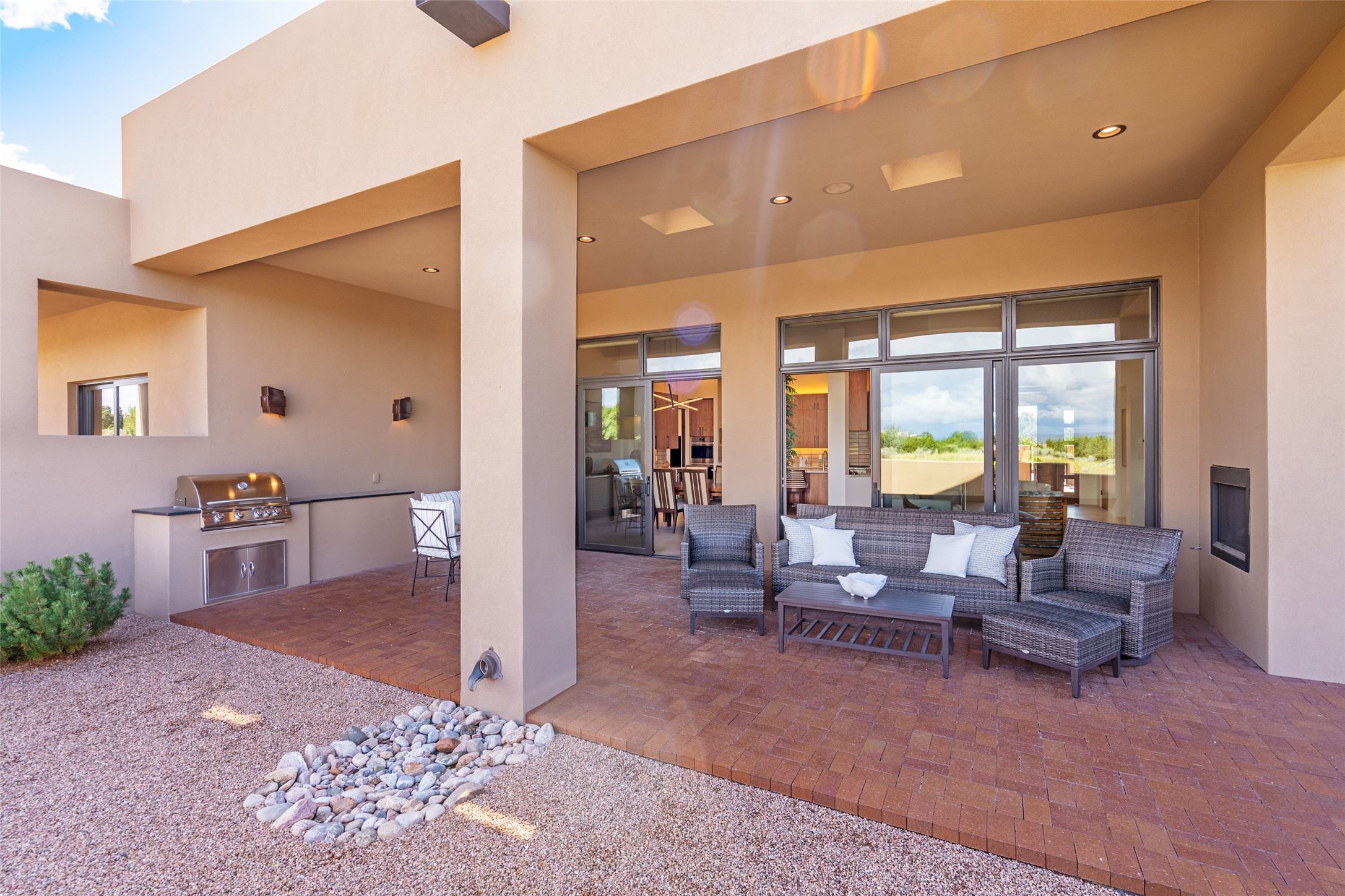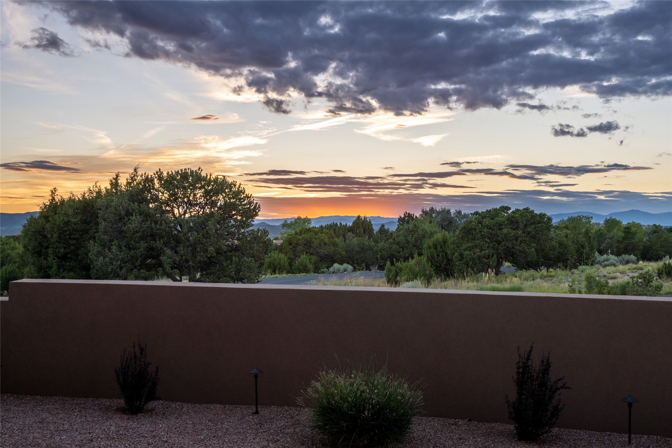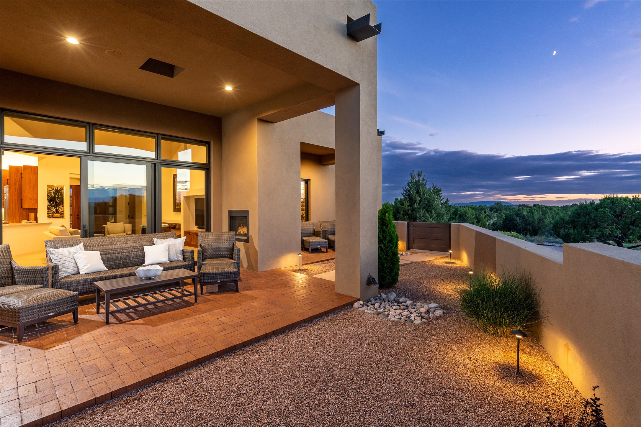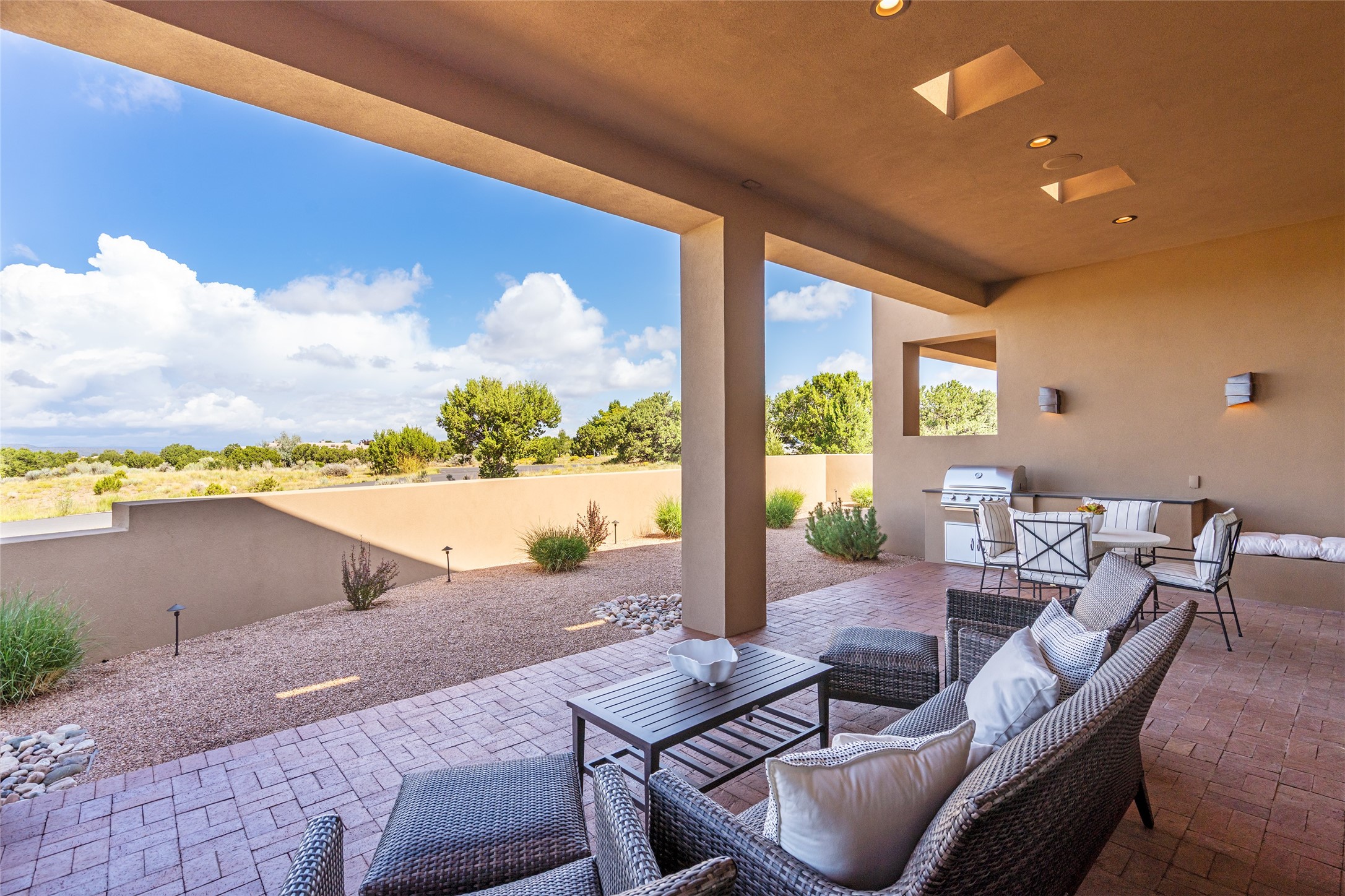 This nearly new soft contemporary home captures the essence of modern Southwest living. Set on 1.7 acres with unobstructed views of the Jemez, Sandia, and Sangre de Cristo mountains offering unforgettable sunsets and a seamless blend of indoor and outdoor spaces. Clean lines, soaring ceilings, three fireplaces, top of the line appointments, including Wolf dual ovens, and Sub-Zero refrigerator define the spacious open floor plan, making this the perfect dream home for the most discerning buyer. Built by award-winning builder Rick Driscoll, the residence offers an owner's retreat with fireplace, a second ensuite bedroom, and an attached casita with its own entrance and mini kitchen. A fourth room for media/office provides added flexibility. All rooms have their own private portals offering sweeping views. The oversized three-car garage includes an attached artist studio, a separate workshop area with new built-in cabinetry and a separate storage area. Modern systems recently installed to enhance everyday living include a water softening system, dual reverse osmosis systems, humidification system, motorized/retractable Hunter Douglas blinds, and a Sonos audio-visual system throughout the home. Updated landscaping and a newly paved brick driveway complete the exterior to welcome you to the home. The sale includes the washer and dryer, two refrigerators, and a separate freezer, making this extraordinary home ready to enjoy from day one. Private, thoughtfully designed, and surrounded by panoramic mountain views, it is a rare find in Northern New Mexico. Beautiful!!!
