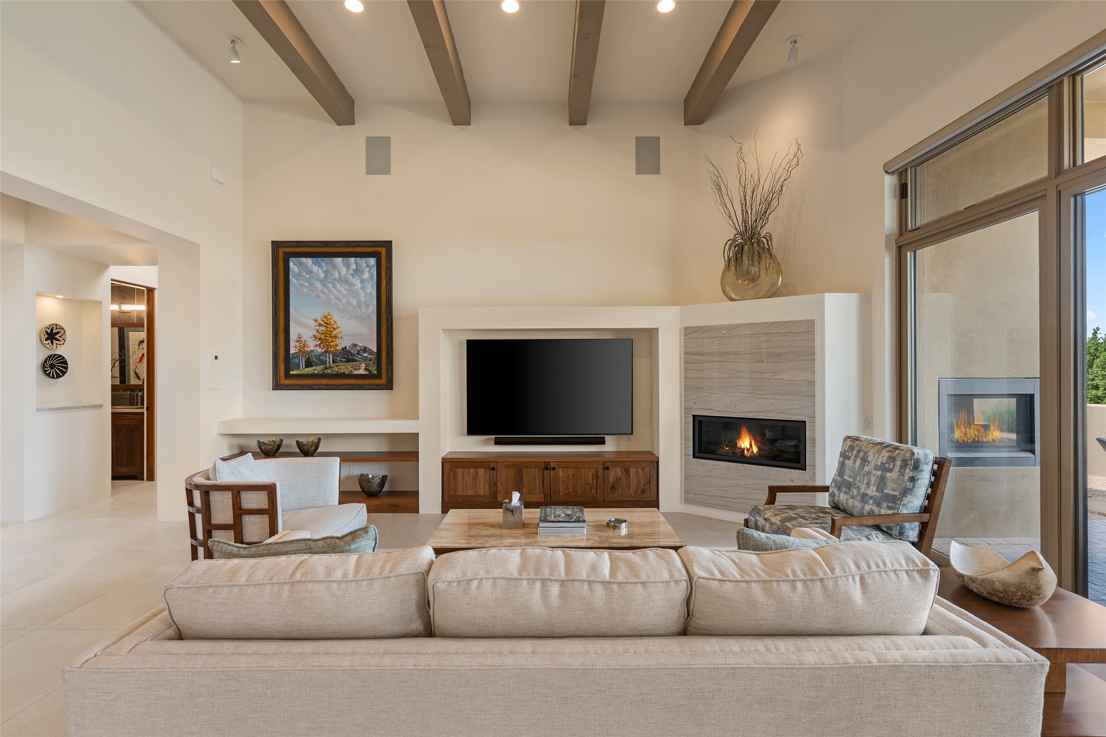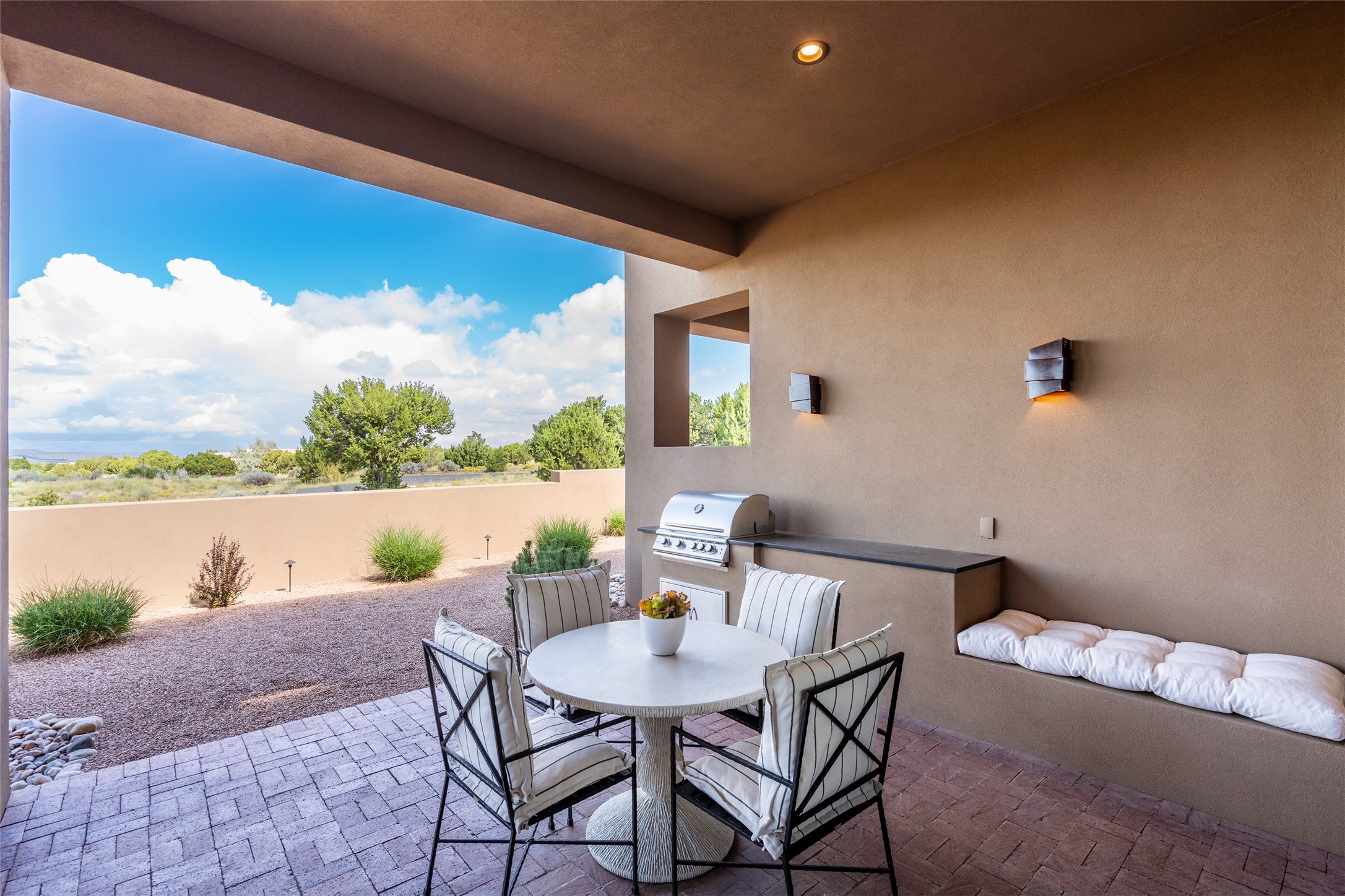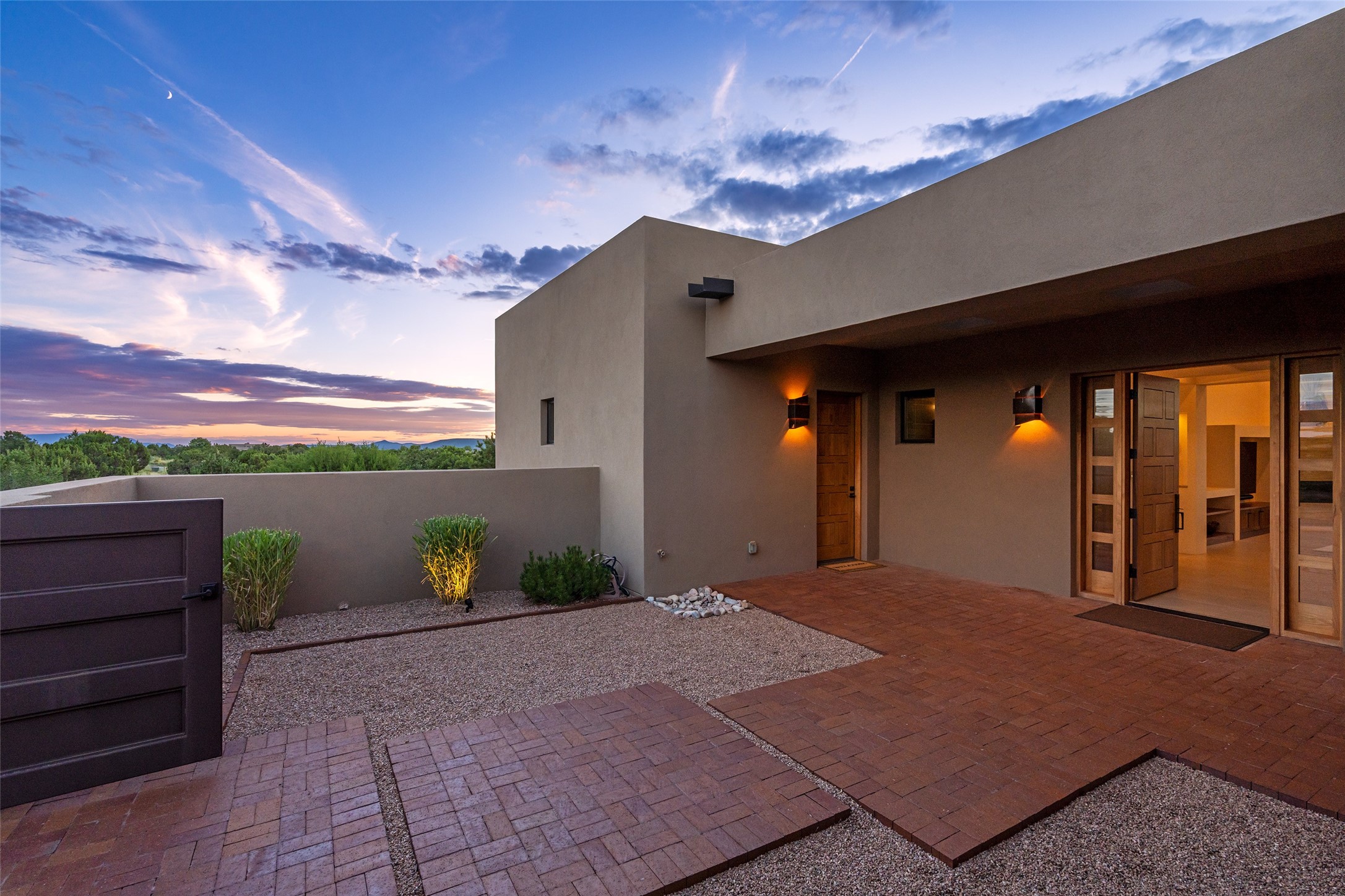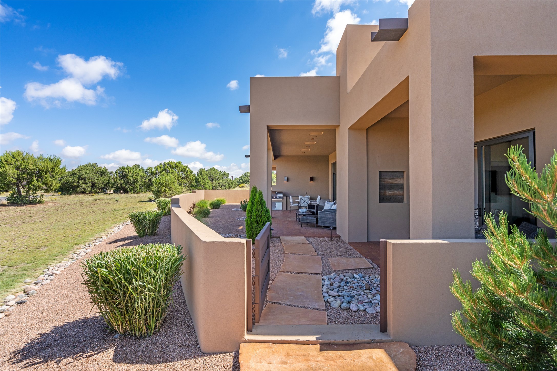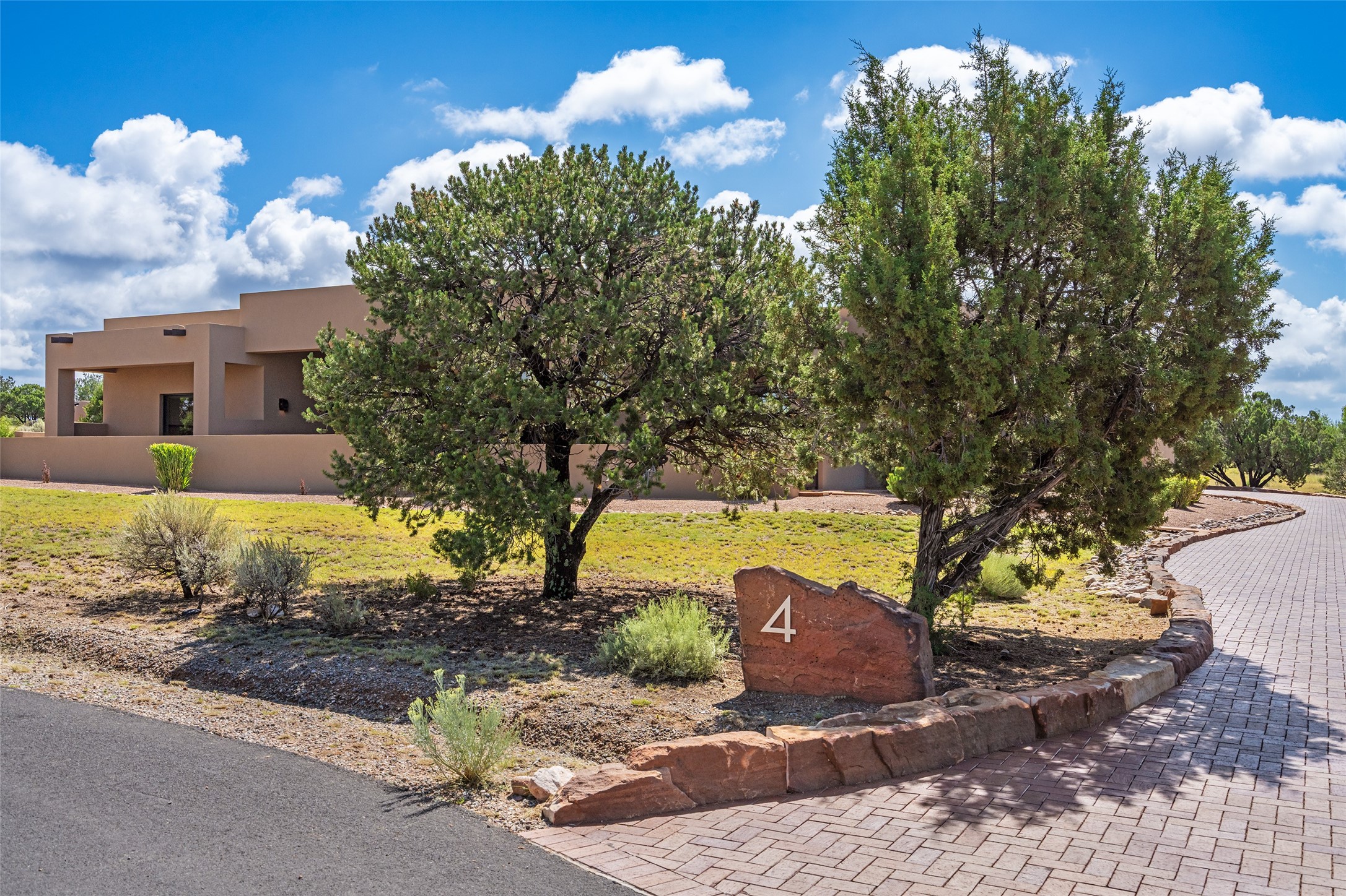 This nearly new soft contemporary home captures the essence of modern Southwest living. Set on 1.7 acres with unobstructed views of the Jemez, Sandia, and Sangre de Cristo mountains offering unforgettable sunsets and a seamless blend of indoor and outdoor spaces. Clean lines, soaring ceilings, three fireplaces, top of the line appointments, including Wolf dual ovens, and Sub-Zero refrigerator define the spacious open floor plan, making this the perfect dream home for the most discerning buyer. Built by award-winning builder Rick Driscoll, the residence offers an owner's retreat with fireplace, a second ensuite bedroom, and an attached casita with its own entrance and mini kitchen. A fourth room for media/office provides added flexibility. All rooms have their own private portals offering sweeping views. The oversized three-car garage includes an attached artist studio, a separate workshop area with new built-in cabinetry and a separate storage area. Modern systems recently installed to enhance everyday living include a water softening system, dual reverse osmosis systems, humidification system, motorized/retractable Hunter Douglas blinds, and a Sonos audio-visual system throughout the home. Updated landscaping and a newly paved brick driveway complete the exterior to welcome you to the home. The sale includes the washer and dryer, two refrigerators, and a separate freezer, making this extraordinary home ready to enjoy from day one. Private, thoughtfully designed, and surrounded by panoramic mountain views, it is a rare find in Northern New Mexico. Beautiful!!!