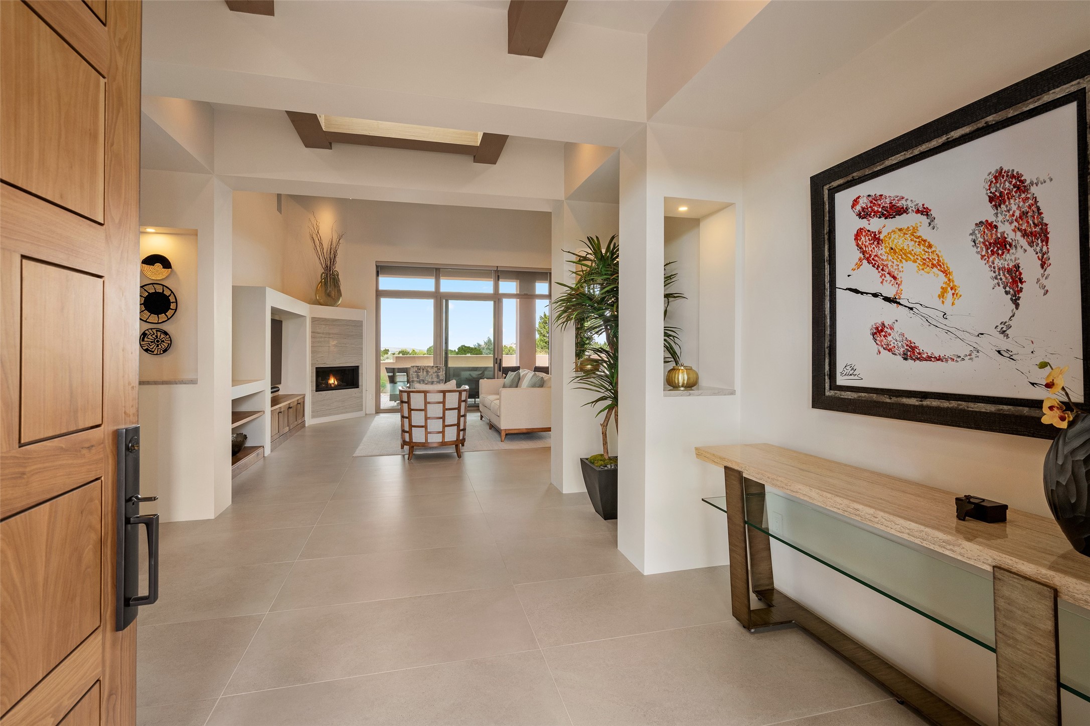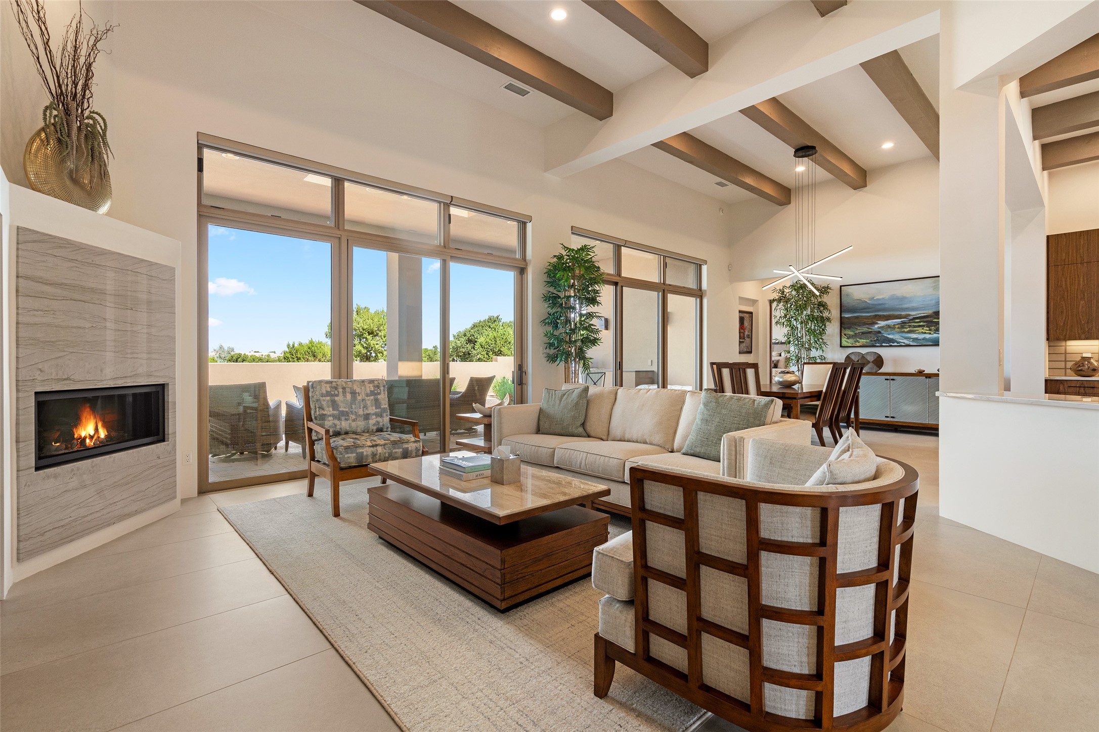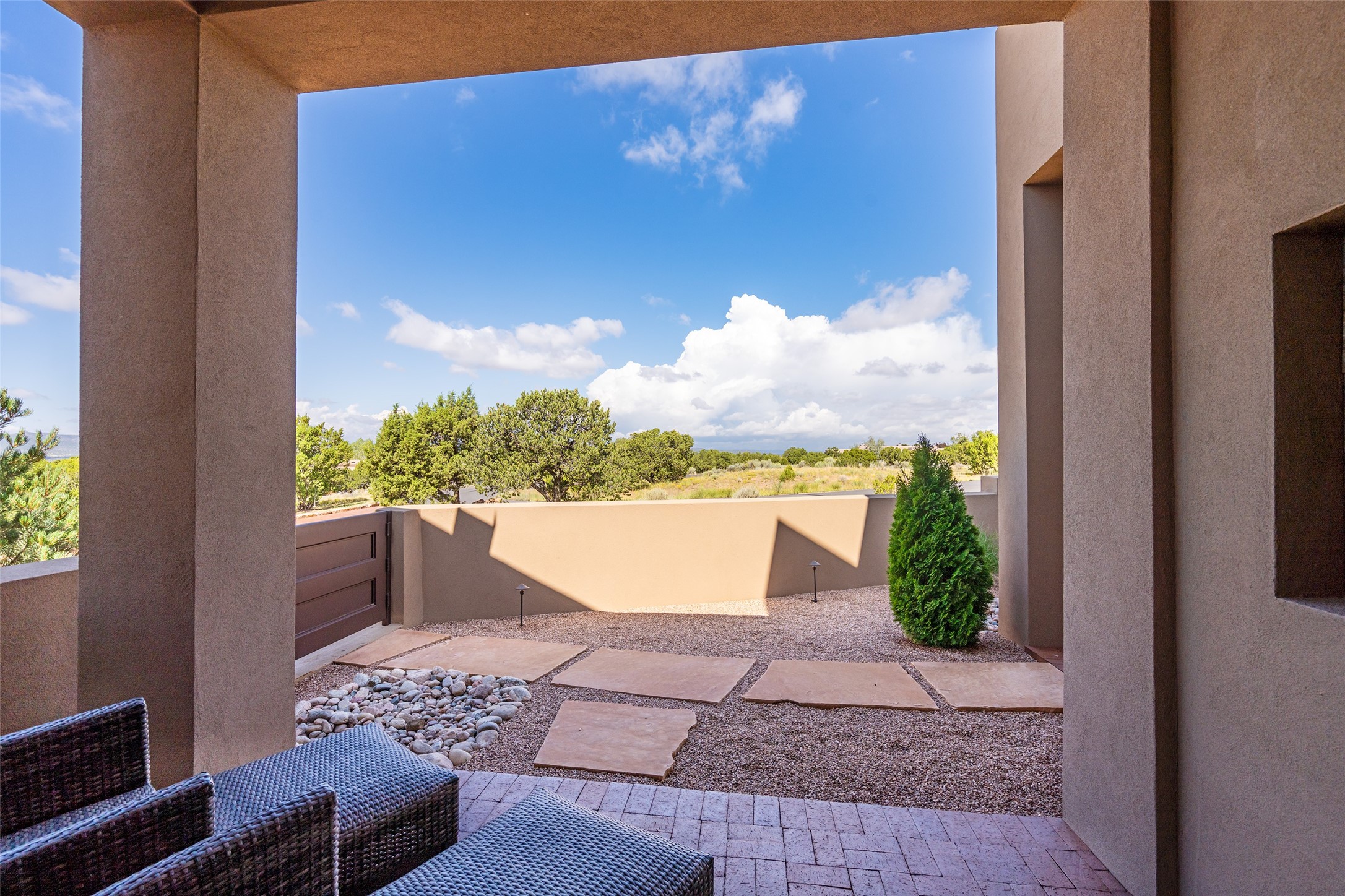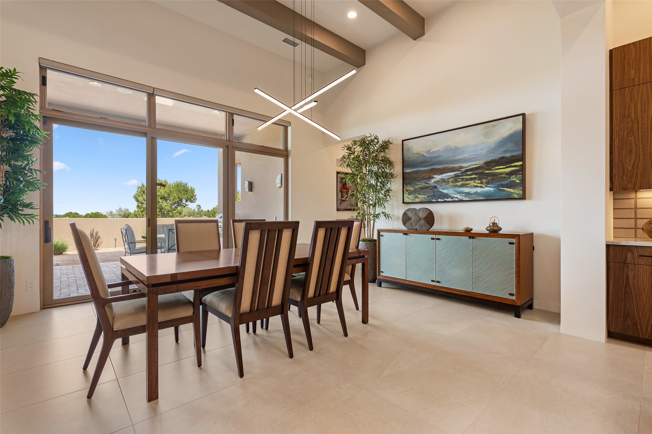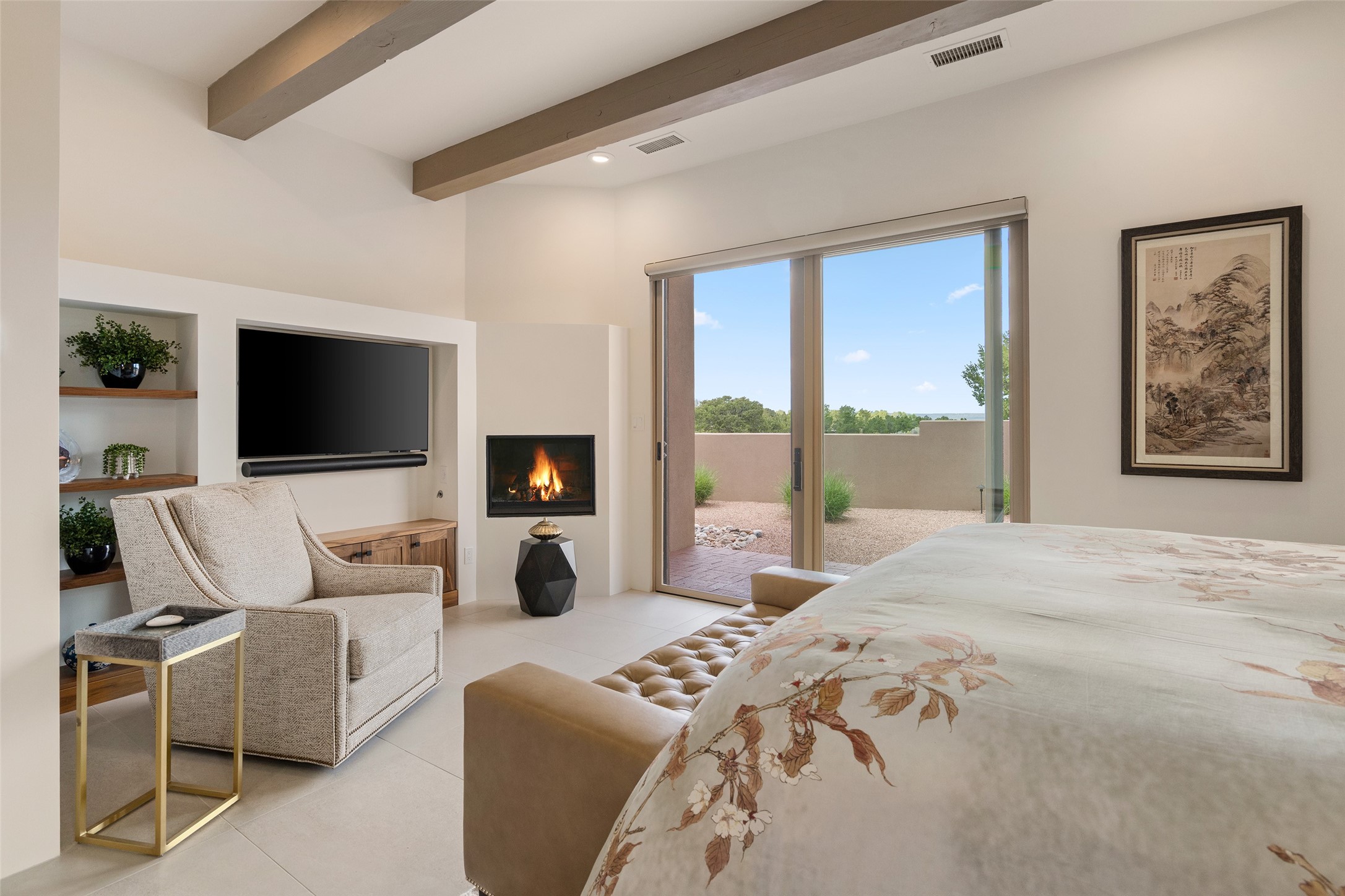 This nearly new soft contemporary home captures the essence of modern Southwest living. Set on 1.7 acres with unobstructed views of the Jemez, Sandia, and Sangre de Cristo mountains offering unforgettable sunsets and a seamless blend of indoor and outdoor spaces. Clean lines, soaring ceilings, three fireplaces, top of the line appointments, including Wolf dual ovens, and Sub-Zero refrigerator define the spacious open floor plan, making this the perfect dream home for the most discerning buyer. Built by award-winning builder Rick Driscoll, the residence offers an owner's retreat with fireplace, a second ensuite bedroom, and an attached casita with its own entrance and mini kitchen. A fourth room for media/office provides added flexibility. All rooms have their own private portals offering sweeping views. The oversized three-car garage includes an attached artist studio, a separate workshop area with new built-in cabinetry and a separate storage area. Modern systems recently installed to enhance everyday living include a water softening system, dual reverse osmosis systems, humidification system, motorized/retractable Hunter Douglas blinds, and a Sonos audio-visual system throughout the home. Updated landscaping and a newly paved brick driveway complete the exterior to welcome you to the home. The sale includes the washer and dryer, two refrigerators, and a separate freezer, making this extraordinary home ready to enjoy from day one. Private, thoughtfully designed, and surrounded by panoramic mountain views, it is a rare find in Northern New Mexico. Beautiful!!!