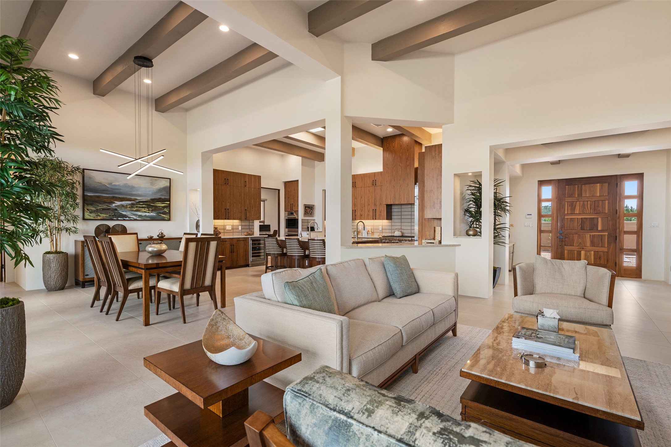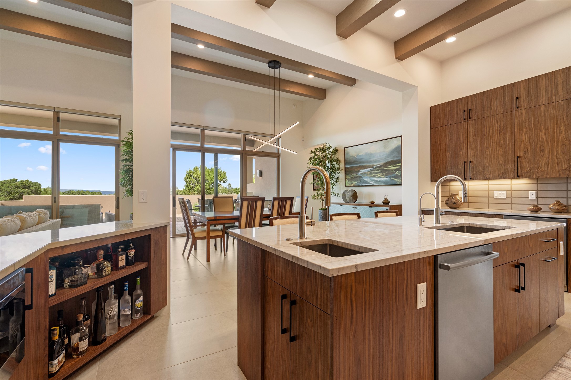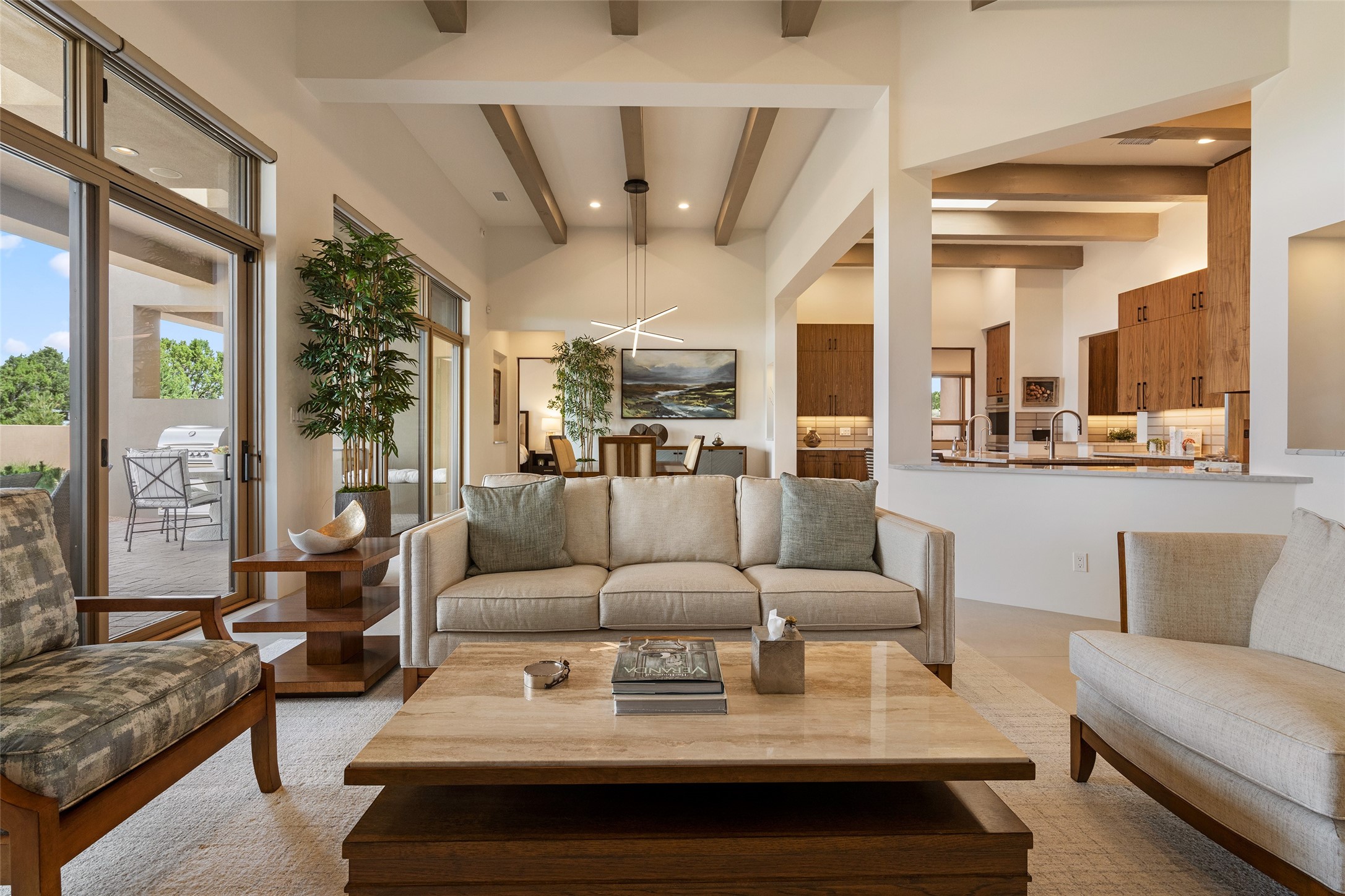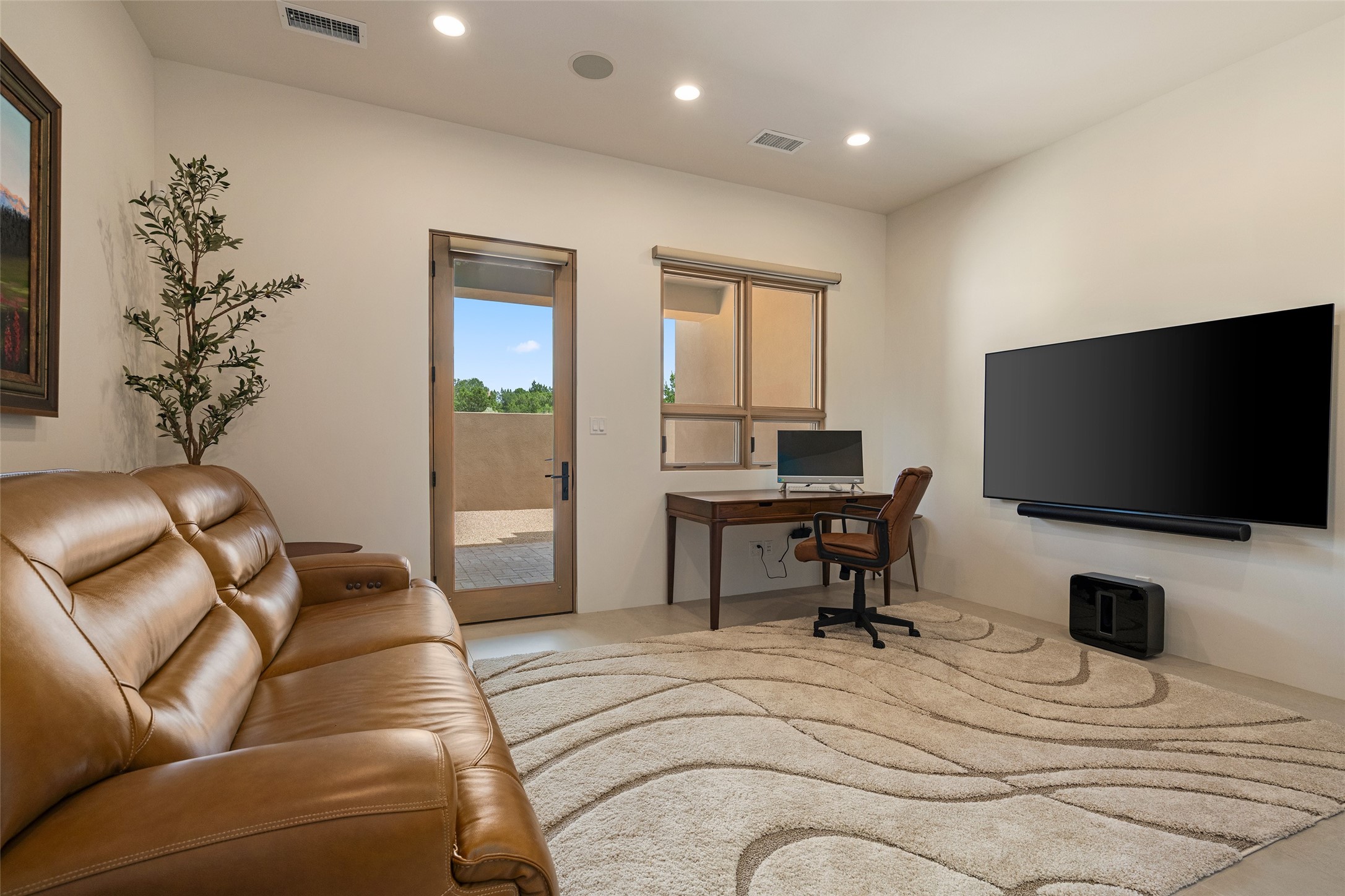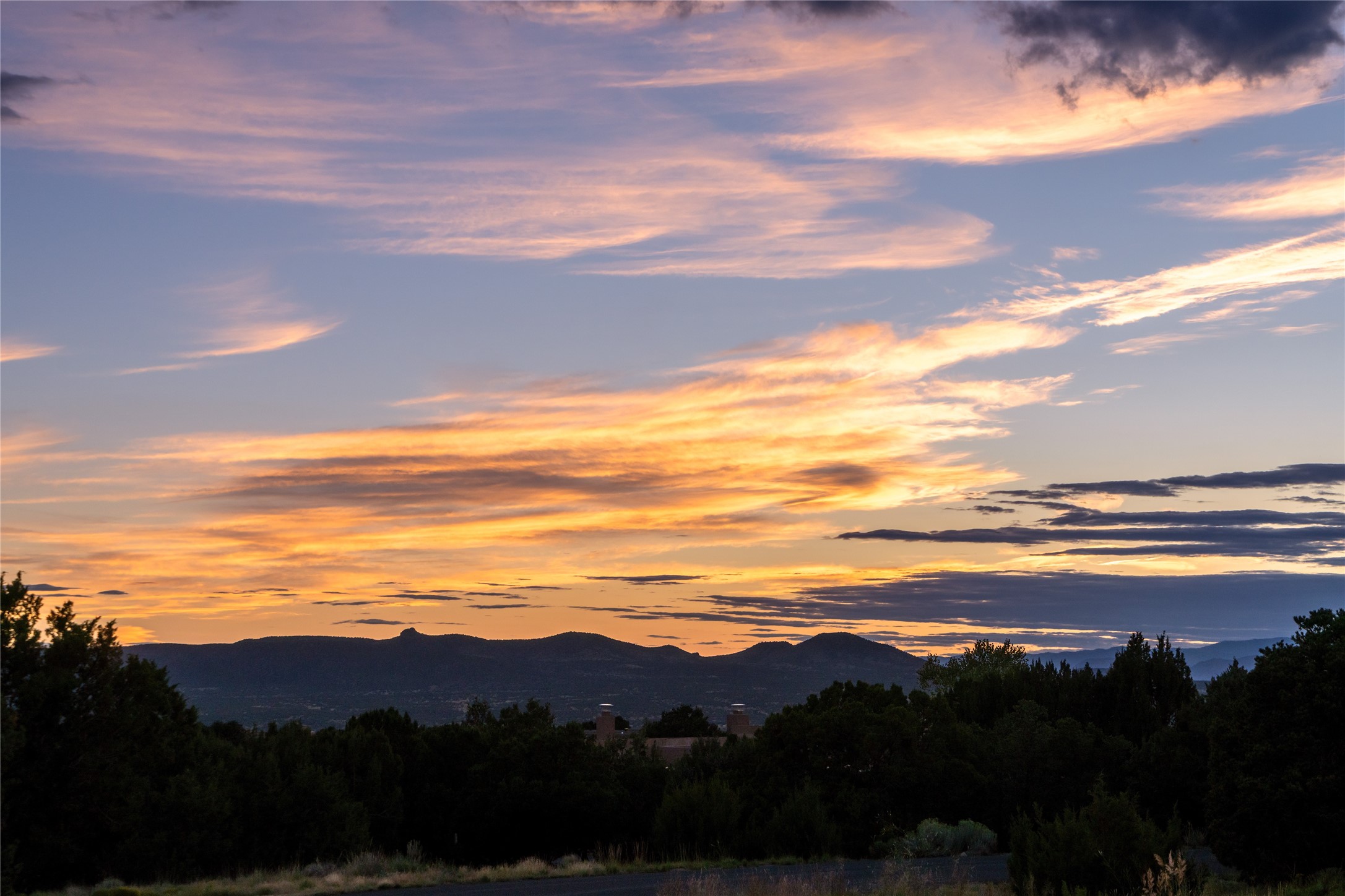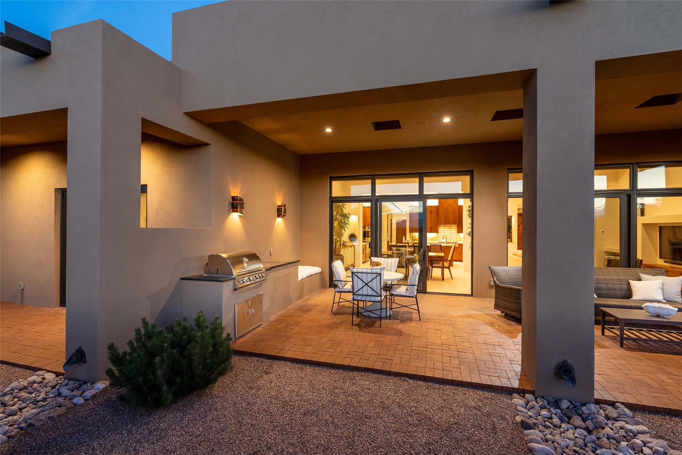 This nearly new soft contemporary home captures the essence of modern Southwest living. Set on 1.7 acres with unobstructed views of the Jemez, Sandia, and Sangre de Cristo mountains offering unforgettable sunsets and a seamless blend of indoor and outdoor spaces. Clean lines, soaring ceilings, three fireplaces, top of the line appointments, including Wolf dual ovens, and Sub-Zero refrigerator define the spacious open floor plan, making this the perfect dream home for the most discerning buyer. Built by award-winning builder Rick Driscoll, the residence offers an owner's retreat with fireplace, a second ensuite bedroom, and an attached casita with its own entrance and mini kitchen. A fourth room for media/office provides added flexibility. All rooms have their own private portals offering sweeping views. The oversized three-car garage includes an attached artist studio, a separate workshop area with new built-in cabinetry and a separate storage area. Modern systems recently installed to enhance everyday living include a water softening system, dual reverse osmosis systems, humidification system, motorized/retractable Hunter Douglas blinds, and a Sonos audio-visual system throughout the home. Updated landscaping and a newly paved brick driveway complete the exterior to welcome you to the home. The sale includes the washer and dryer, two refrigerators, and a separate freezer, making this extraordinary home ready to enjoy from day one. Private, thoughtfully designed, and surrounded by panoramic mountain views, it is a rare find in Northern New Mexico. Beautiful!!!