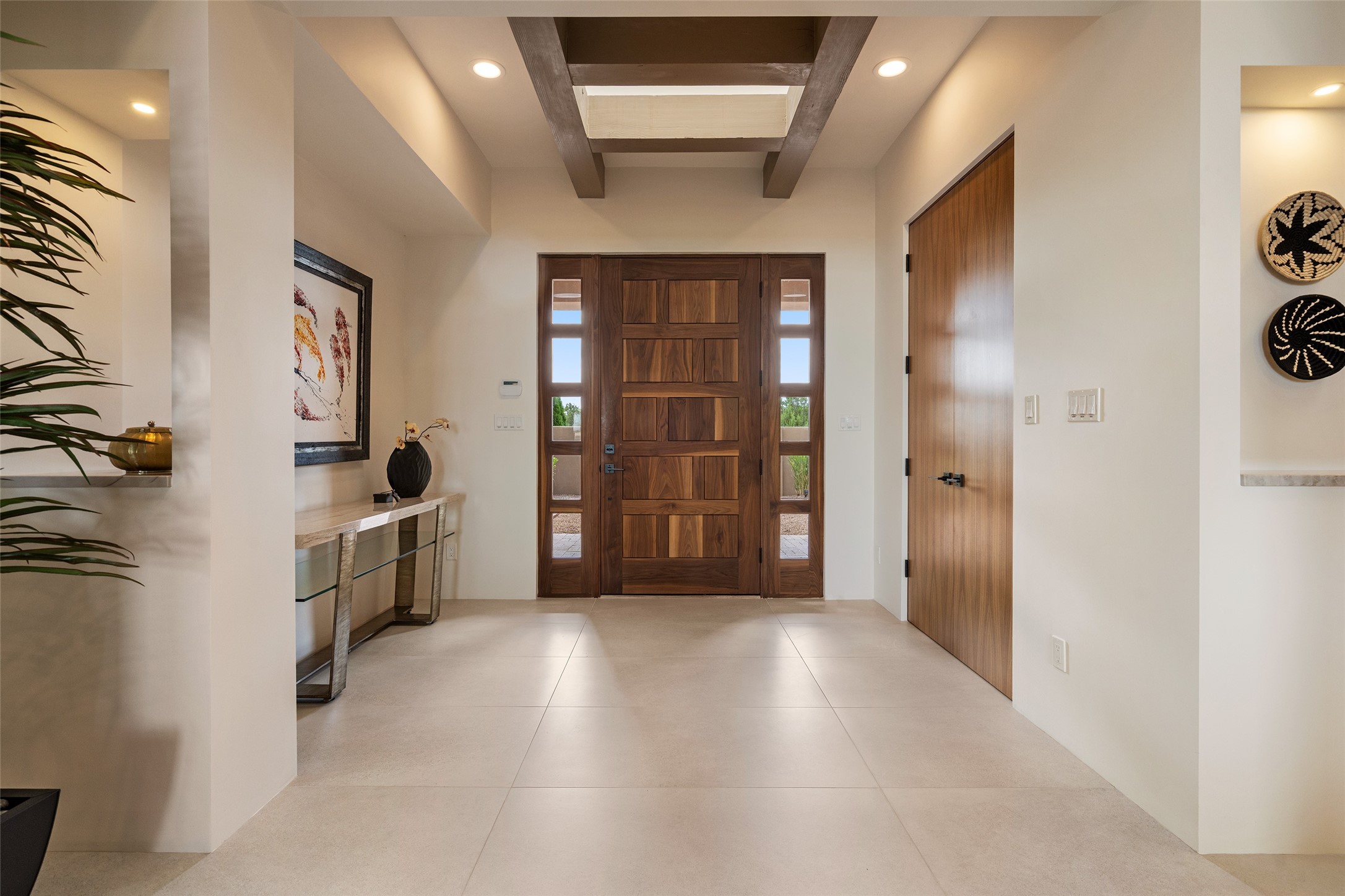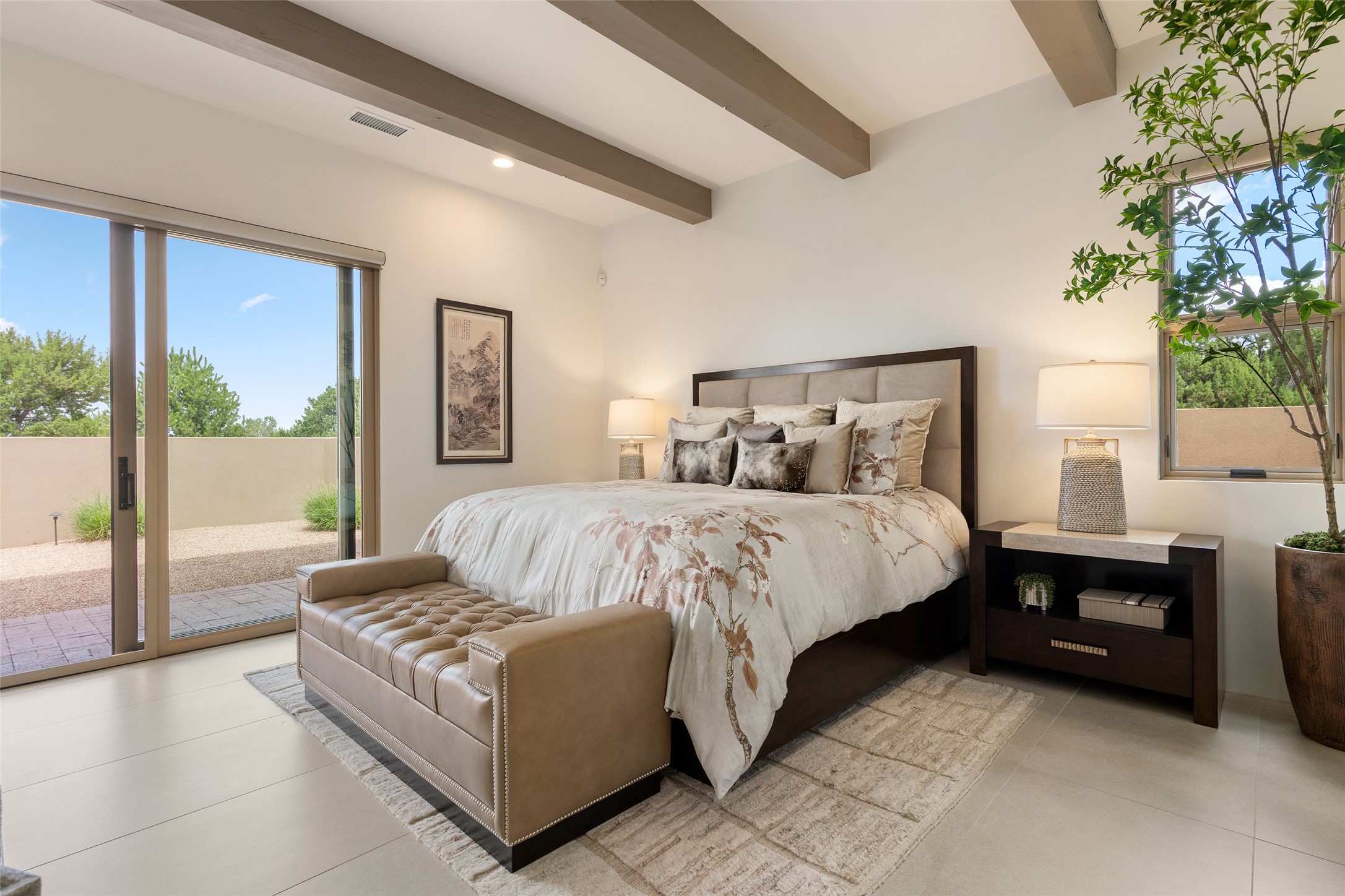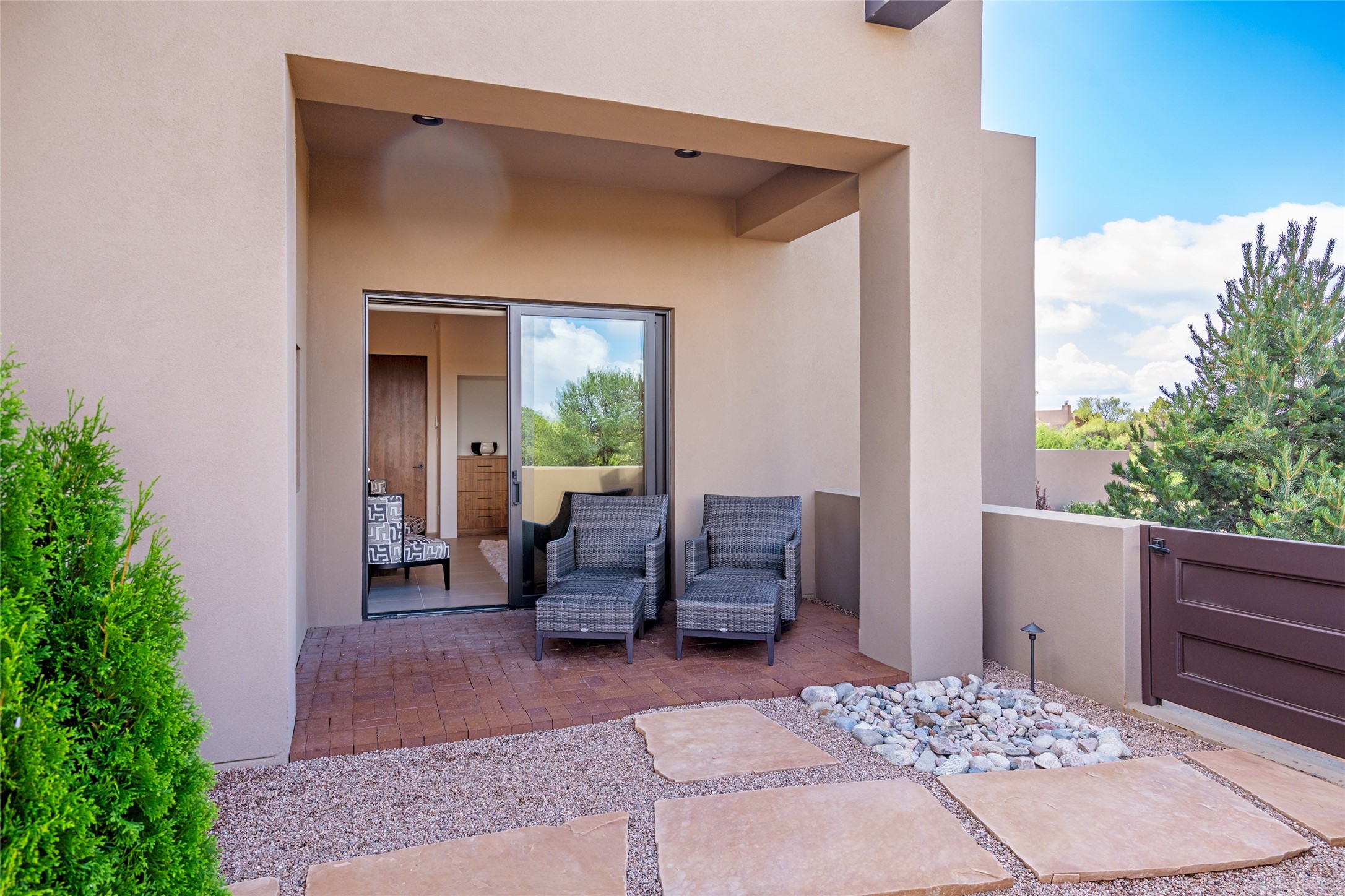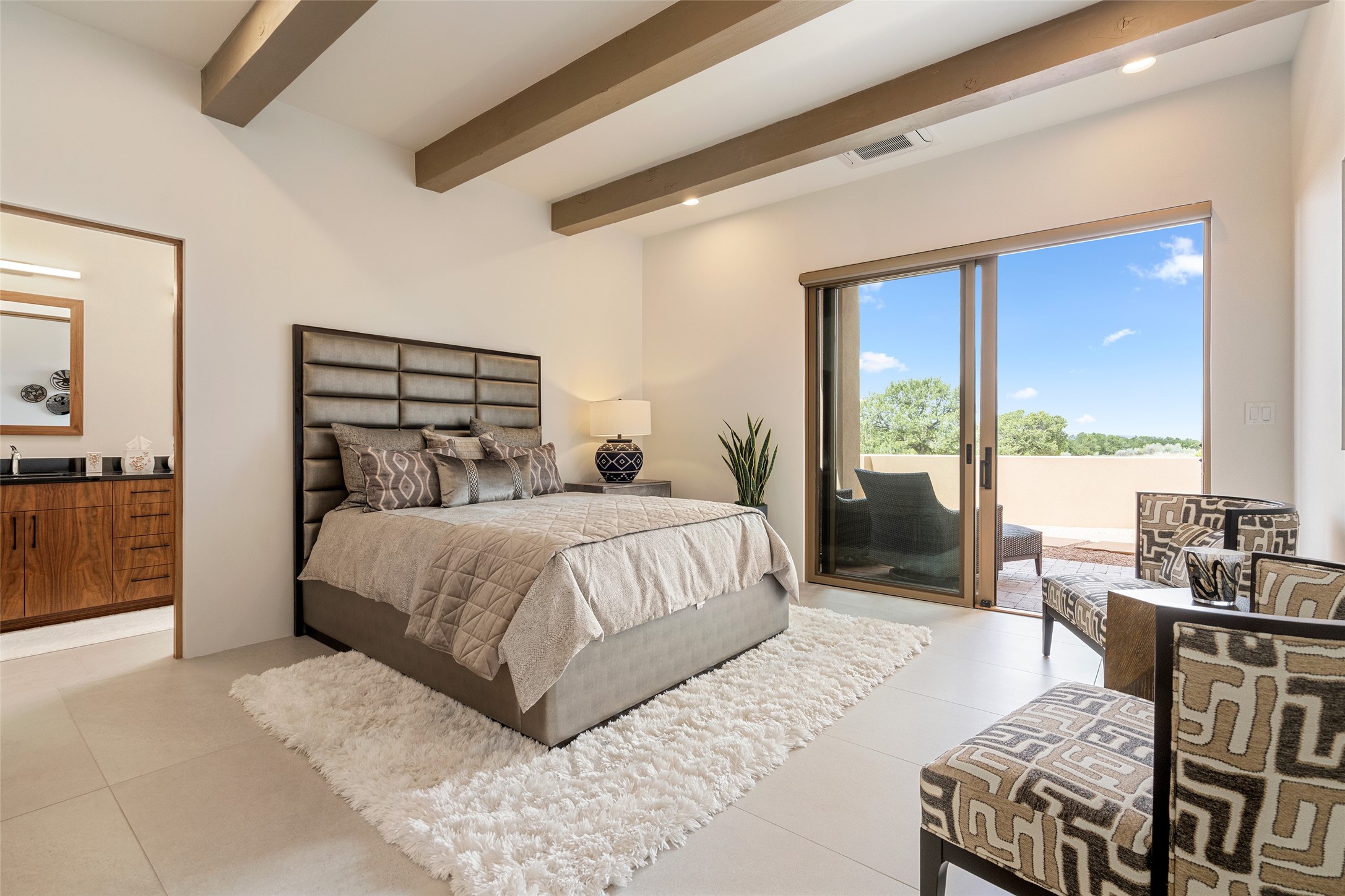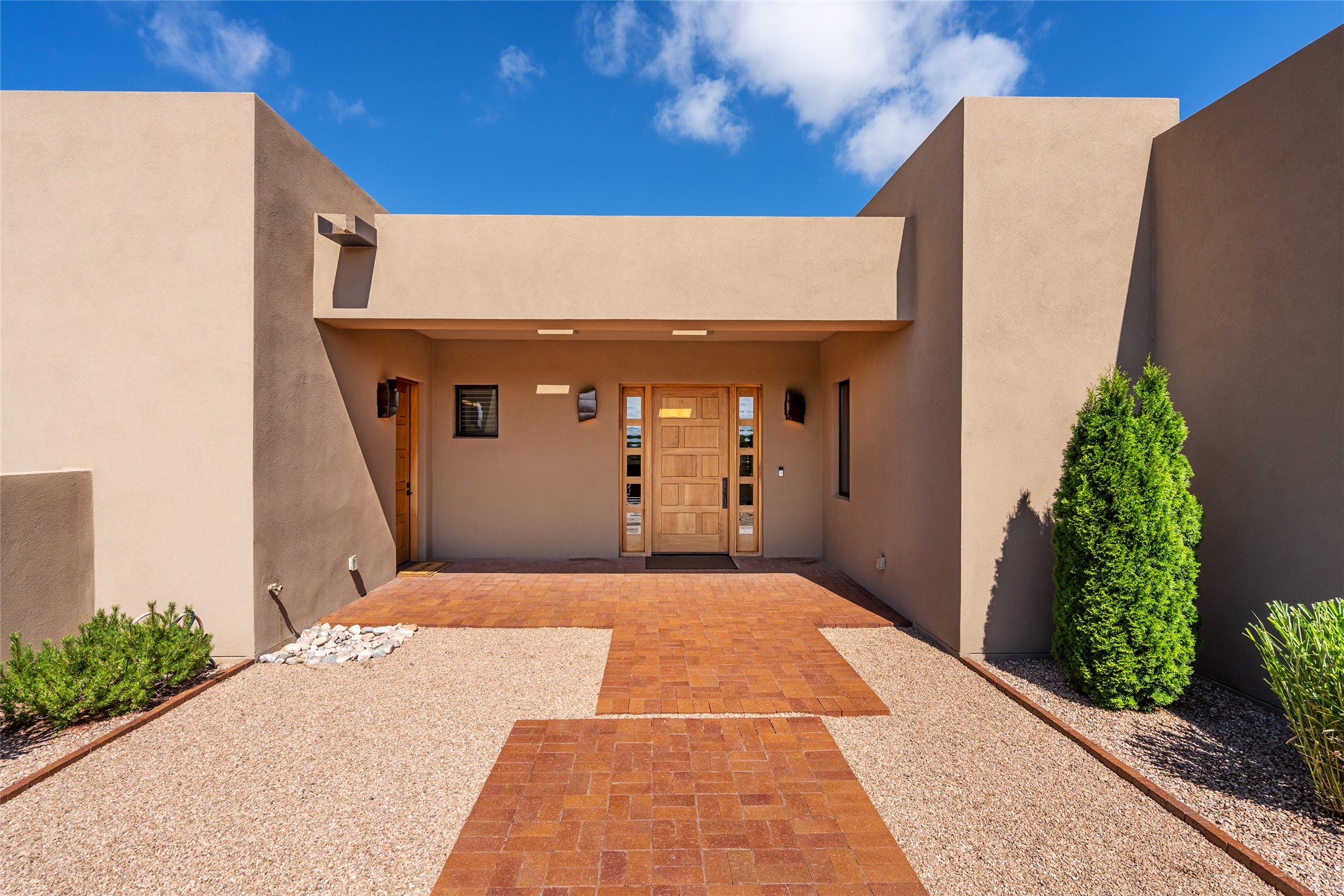 This nearly new soft contemporary home captures the essence of modern Southwest living. Set on 1.7 acres with unobstructed views of the Jemez, Sandia, and Sangre de Cristo mountains offering unforgettable sunsets and a seamless blend of indoor and outdoor spaces. Clean lines, soaring ceilings, three fireplaces, top of the line appointments, including Wolf dual ovens, and Sub-Zero refrigerator define the spacious open floor plan, making this the perfect dream home for the most discerning buyer. Built by award-winning builder Rick Driscoll, the residence offers an owner's retreat with fireplace, a second ensuite bedroom, and an attached casita with its own entrance and mini kitchen. A fourth room for media/office provides added flexibility. All rooms have their own private portals offering sweeping views. The oversized three-car garage includes an attached artist studio, a separate workshop area with new built-in cabinetry and a separate storage area. Modern systems recently installed to enhance everyday living include a water softening system, dual reverse osmosis systems, humidification system, motorized/retractable Hunter Douglas blinds, and a Sonos audio-visual system throughout the home. Updated landscaping and a newly paved brick driveway complete the exterior to welcome you to the home. The sale includes the washer and dryer, two refrigerators, and a separate freezer, making this extraordinary home ready to enjoy from day one. Private, thoughtfully designed, and surrounded by panoramic mountain views, it is a rare find in Northern New Mexico. Beautiful!!!