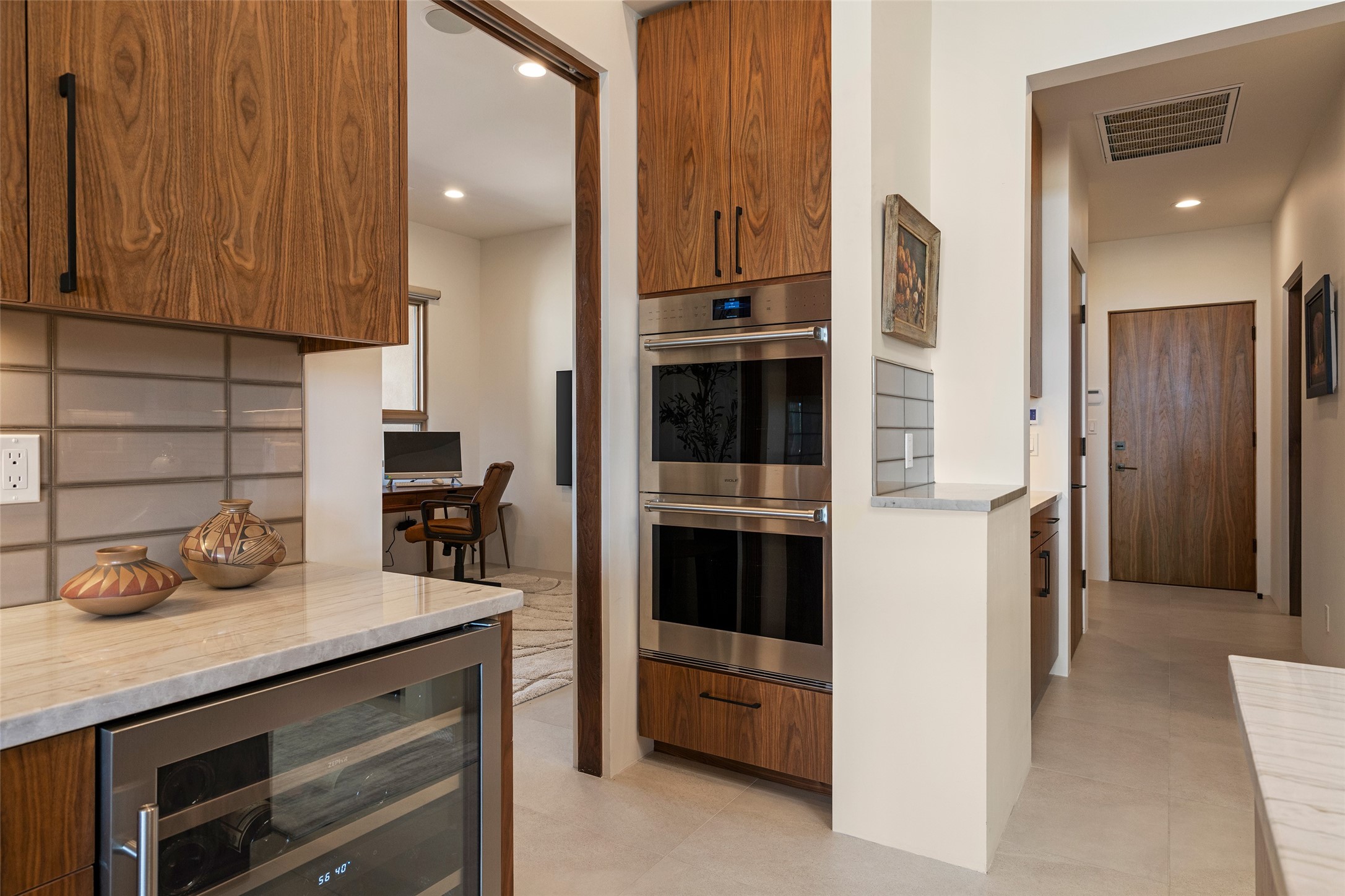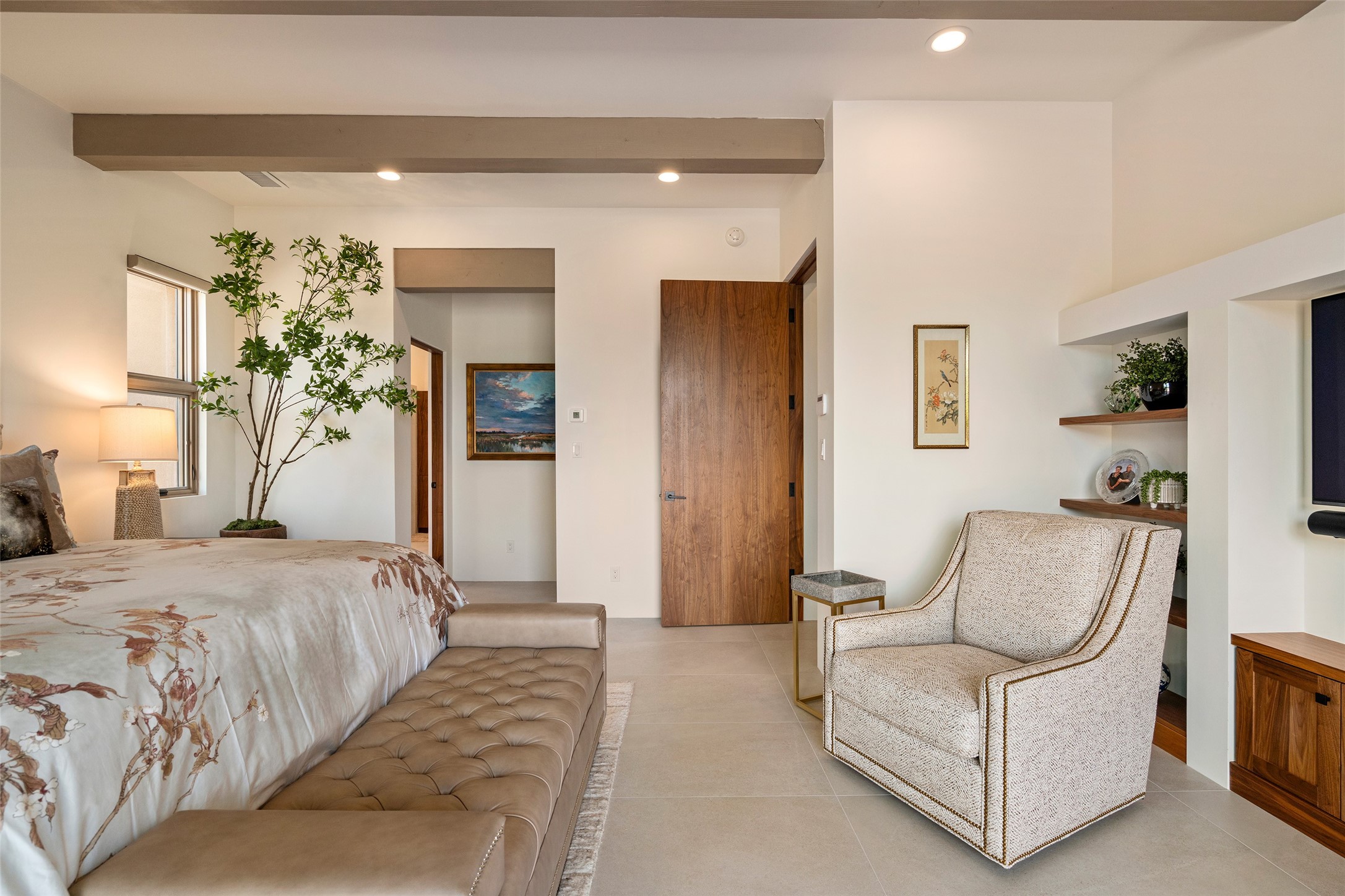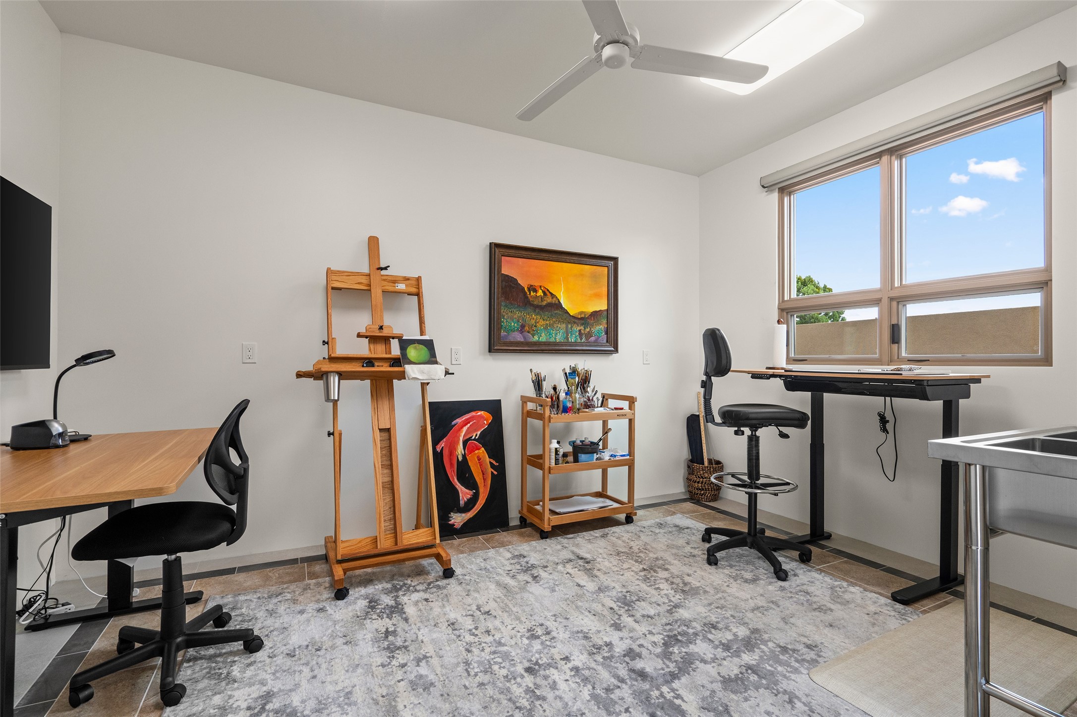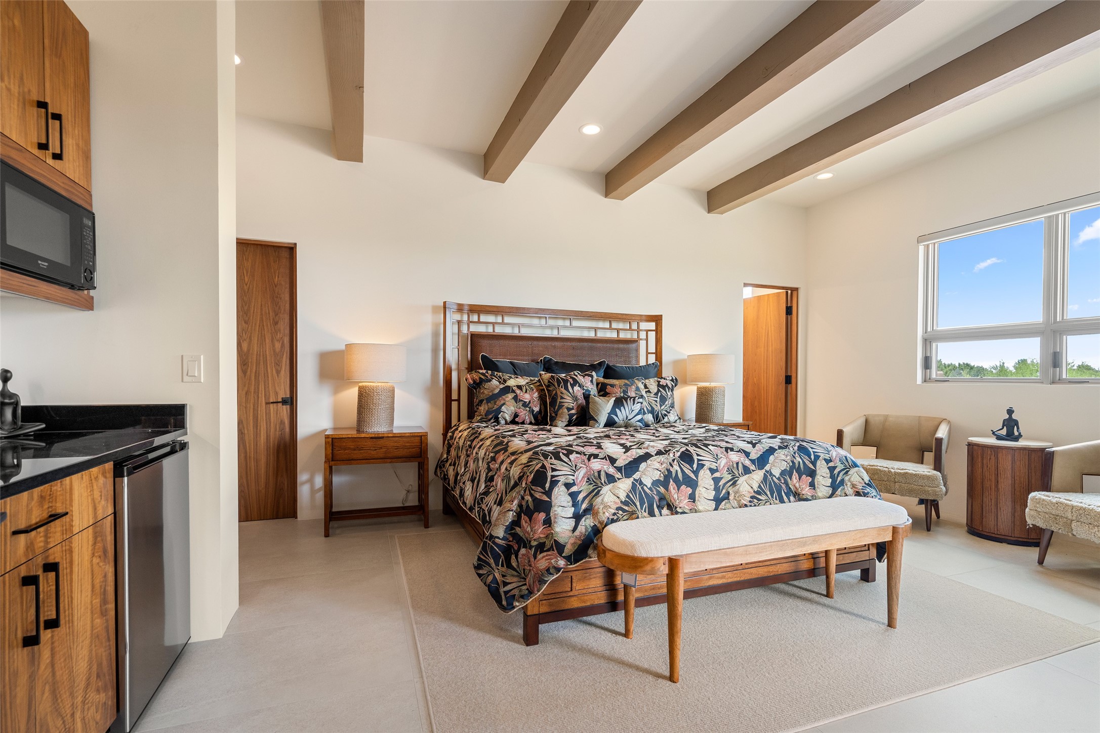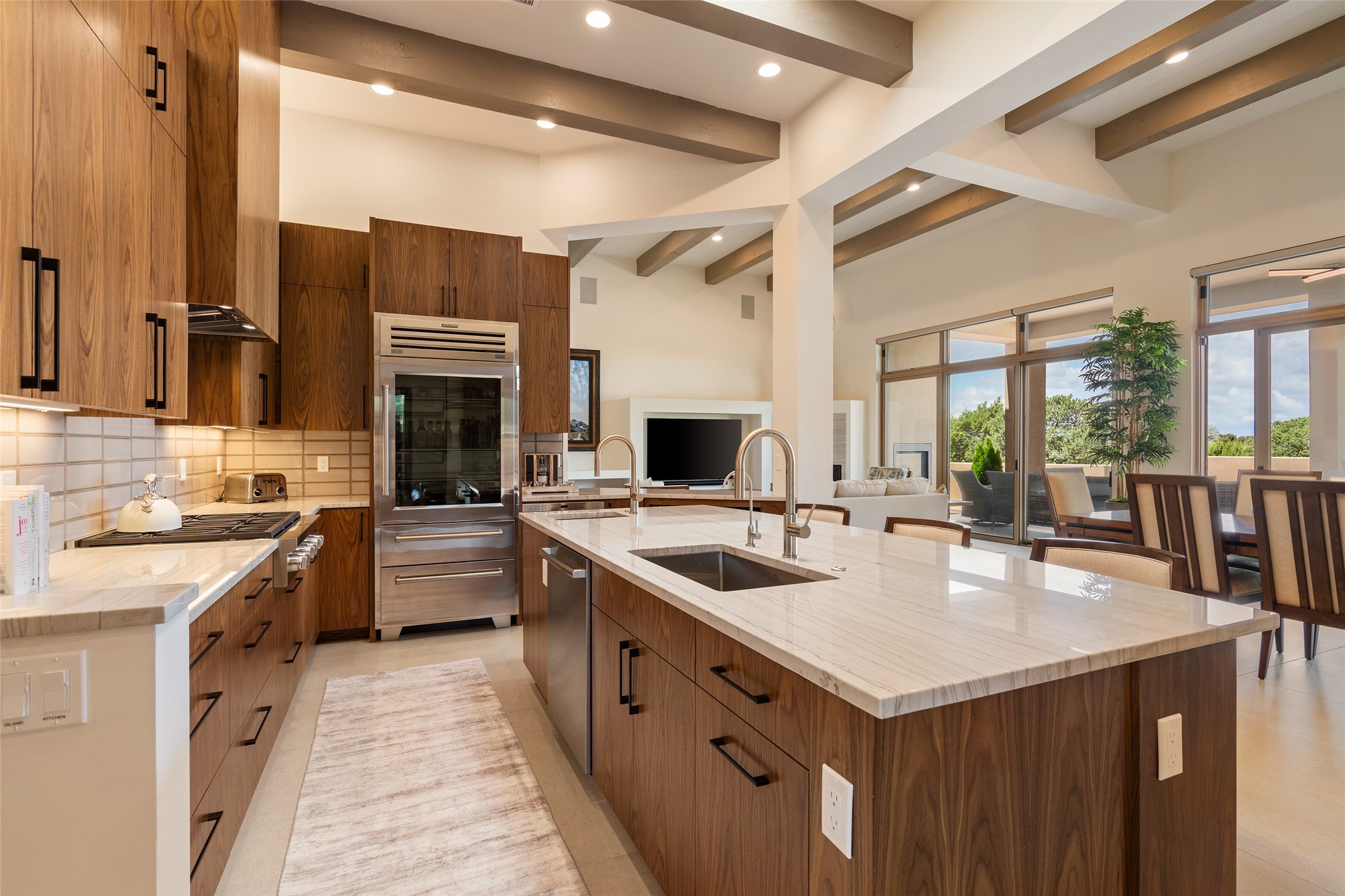 This nearly new soft contemporary home captures the essence of modern Southwest living. Set on 1.7 acres with unobstructed views of the Jemez, Sandia, and Sangre de Cristo mountains offering unforgettable sunsets and a seamless blend of indoor and outdoor spaces. Clean lines, soaring ceilings, three fireplaces, top of the line appointments, including Wolf dual ovens, and Sub-Zero refrigerator define the spacious open floor plan, making this the perfect dream home for the most discerning buyer. Built by award-winning builder Rick Driscoll, the residence offers an owner's retreat with fireplace, a second ensuite bedroom, and an attached casita with its own entrance and mini kitchen. A fourth room for media/office provides added flexibility. All rooms have their own private portals offering sweeping views. The oversized three-car garage includes an attached artist studio, a separate workshop area with new built-in cabinetry and a separate storage area. Modern systems recently installed to enhance everyday living include a water softening system, dual reverse osmosis systems, humidification system, motorized/retractable Hunter Douglas blinds, and a Sonos audio-visual system throughout the home. Updated landscaping and a newly paved brick driveway complete the exterior to welcome you to the home. The sale includes the washer and dryer, two refrigerators, and a separate freezer, making this extraordinary home ready to enjoy from day one. Private, thoughtfully designed, and surrounded by panoramic mountain views, it is a rare find in Northern New Mexico. Beautiful!!!