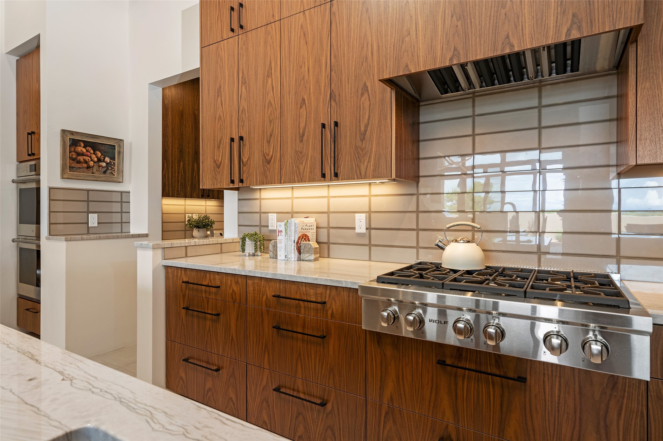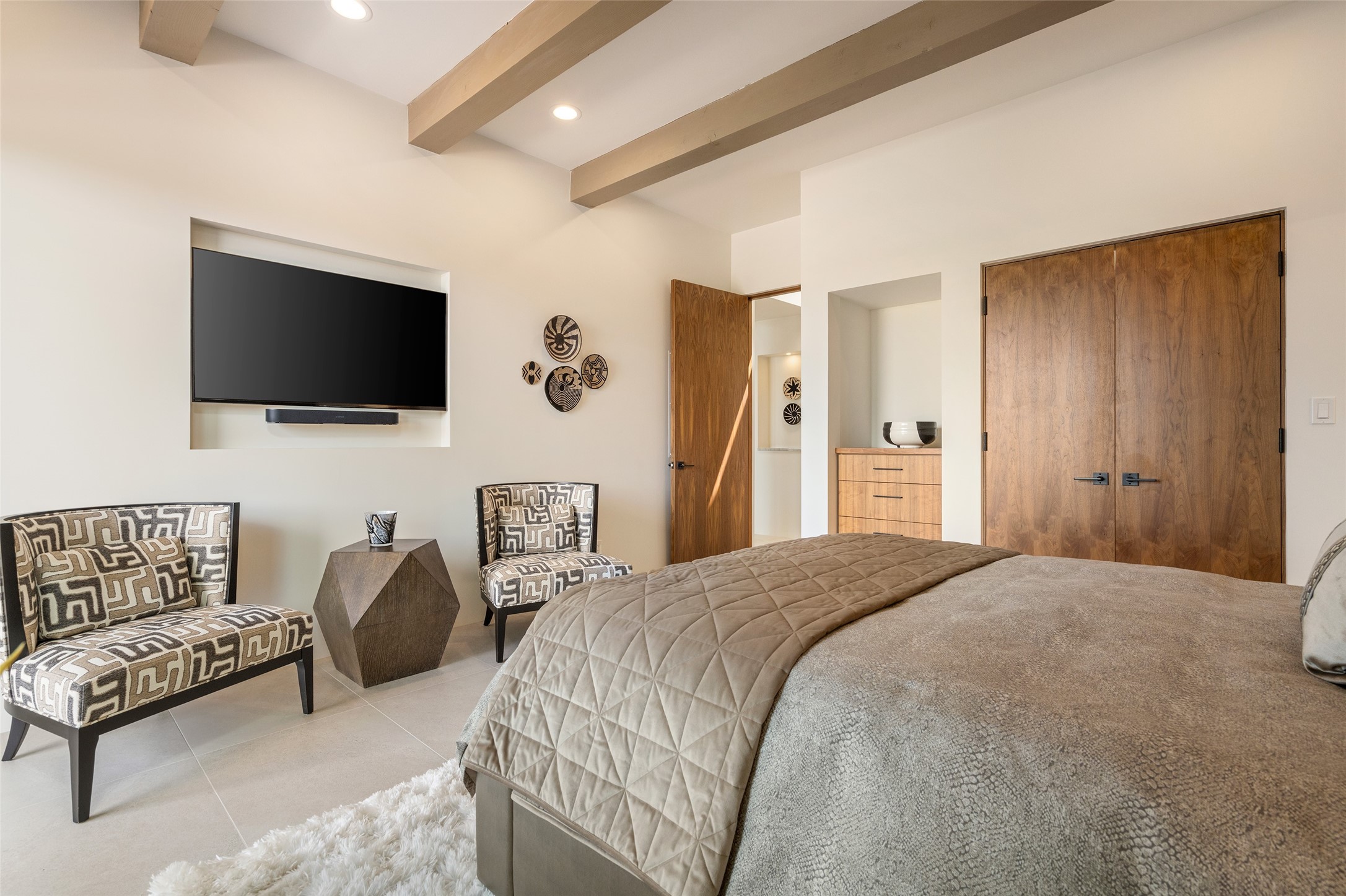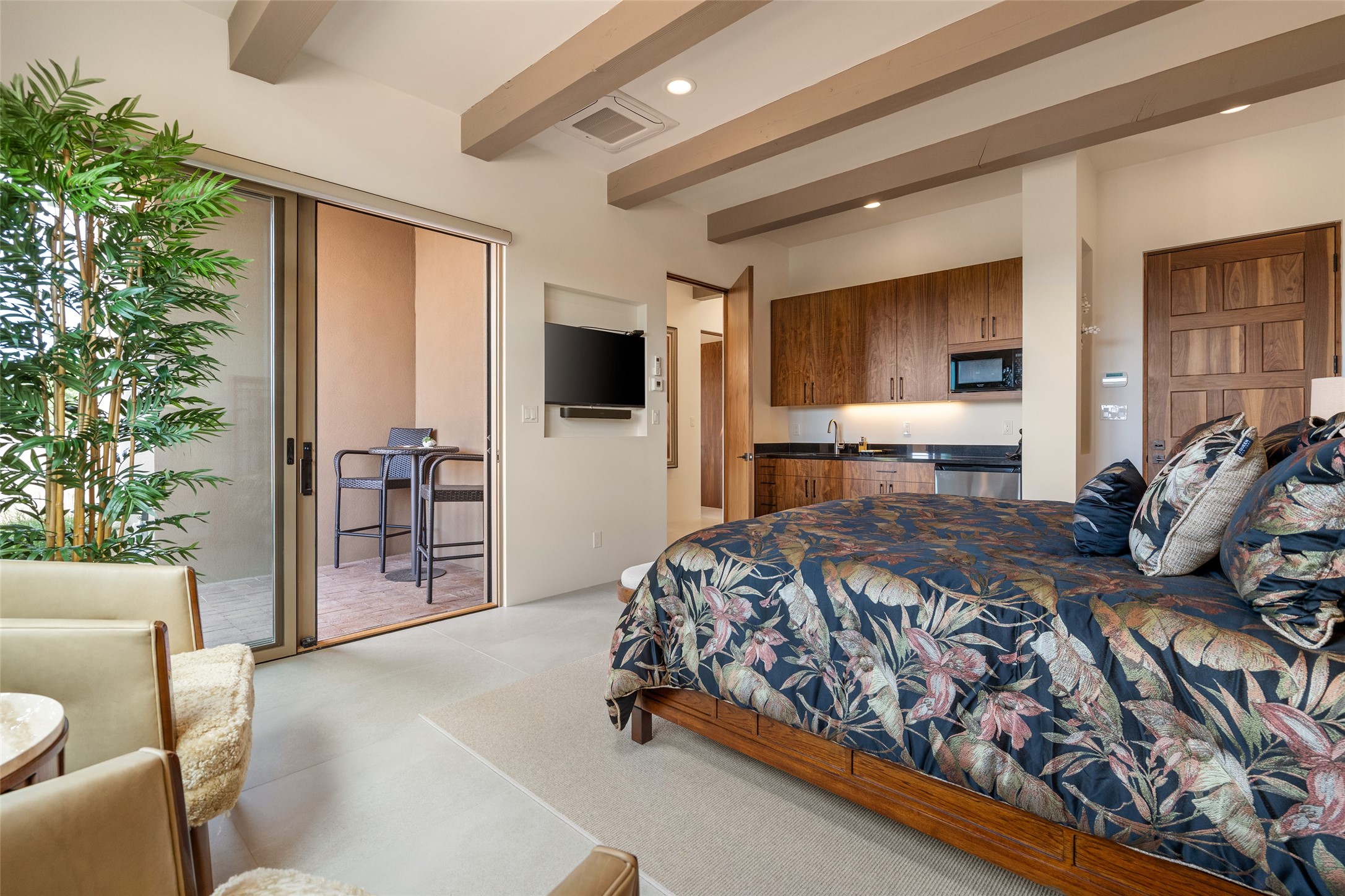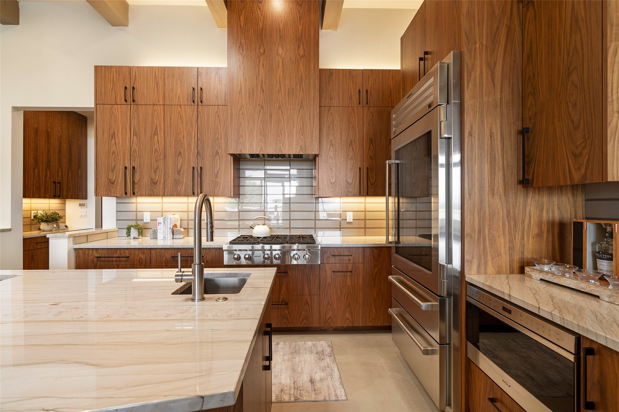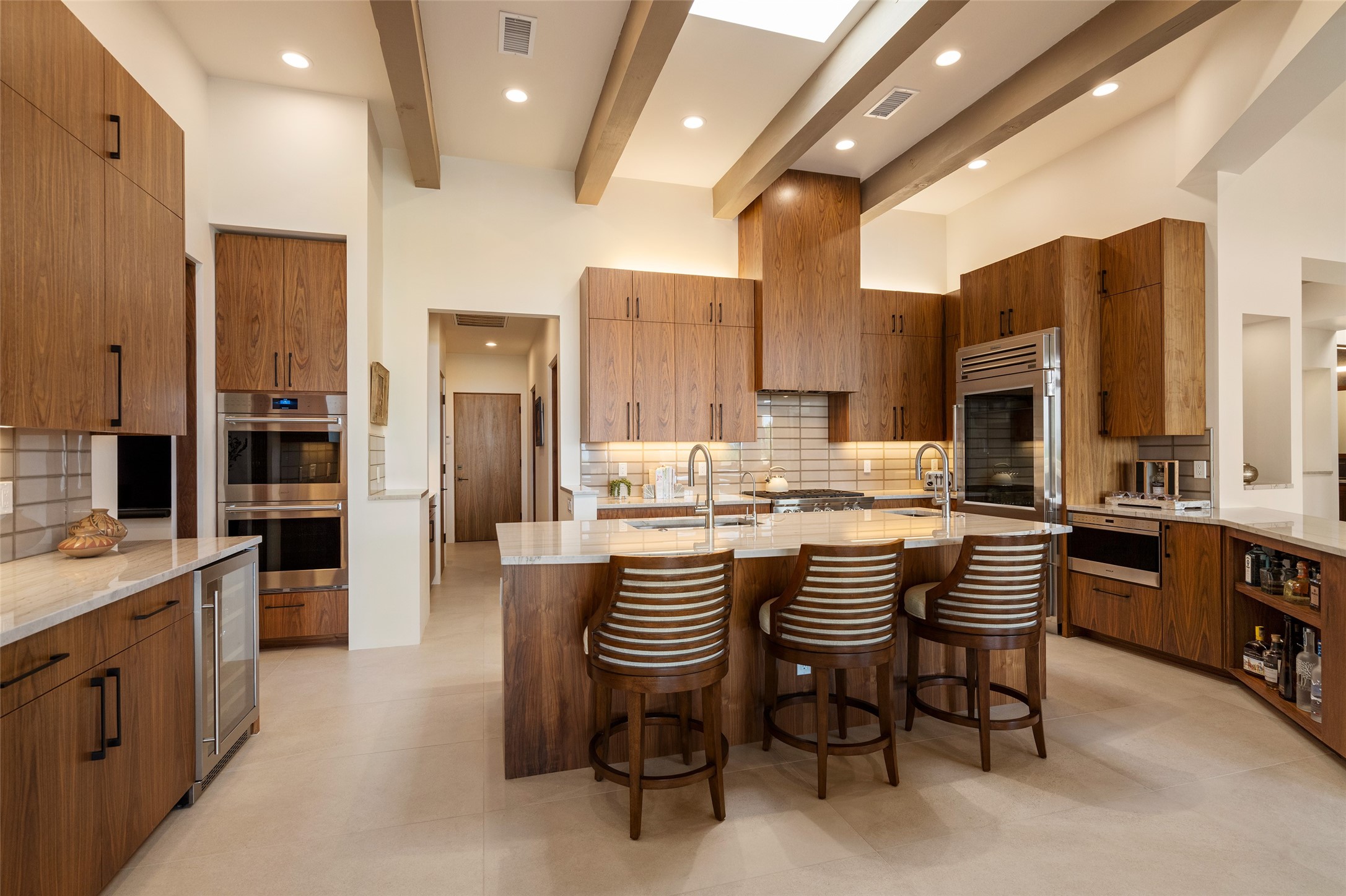 This nearly new soft contemporary home captures the essence of modern Southwest living. Set on 1.7 acres with unobstructed views of the Jemez, Sandia, and Sangre de Cristo mountains offering unforgettable sunsets and a seamless blend of indoor and outdoor spaces. Clean lines, soaring ceilings, three fireplaces, top of the line appointments, including Wolf dual ovens, and Sub-Zero refrigerator define the spacious open floor plan, making this the perfect dream home for the most discerning buyer. Built by award-winning builder Rick Driscoll, the residence offers an owner's retreat with fireplace, a second ensuite bedroom, and an attached casita with its own entrance and mini kitchen. A fourth room for media/office provides added flexibility. All rooms have their own private portals offering sweeping views. The oversized three-car garage includes an attached artist studio, a separate workshop area with new built-in cabinetry and a separate storage area. Modern systems recently installed to enhance everyday living include a water softening system, dual reverse osmosis systems, humidification system, motorized/retractable Hunter Douglas blinds, and a Sonos audio-visual system throughout the home. Updated landscaping and a newly paved brick driveway complete the exterior to welcome you to the home. The sale includes the washer and dryer, two refrigerators, and a separate freezer, making this extraordinary home ready to enjoy from day one. Private, thoughtfully designed, and surrounded by panoramic mountain views, it is a rare find in Northern New Mexico. Beautiful!!!