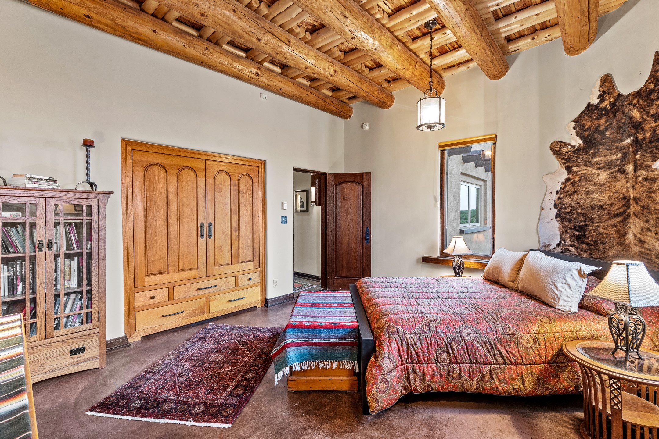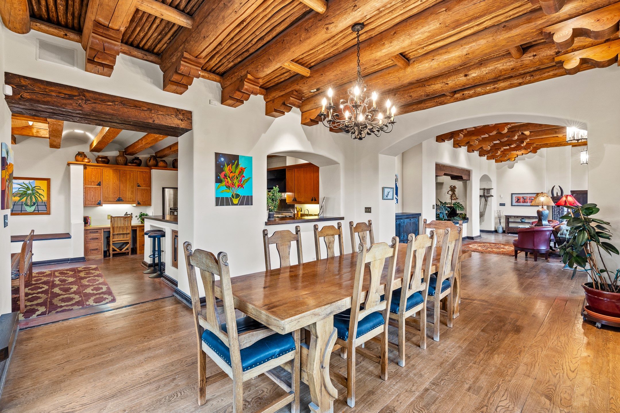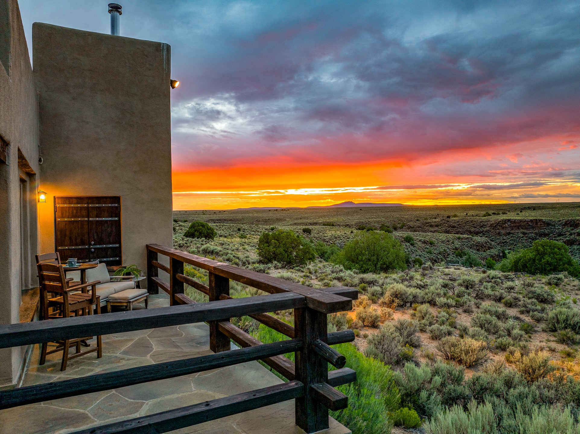 Welcome to 89 Riverbend, an extraordinary 4,233-square-foot Pueblo-style retreat on 8.89 private acres above the Ro Pueblo de Taos. This home artfully blends architectural authenticity with refined modern luxury, offering sweeping 360-degree views of Taos Mountain, the Ro Grande Gorge, and surrounding mesas--spectacular scenery that shifts with every season and hour, creating a landscape truly alive. Thoughtfully positioned to maximize privacy while staying connected to the land, it features a dramatic great room with soaring ceilings and floor-to-ceiling windows framing the river gorge--perfect for hosting gatherings or enjoying tranquil reflection. The formal dining room and cozy family area, complete with a wood-burning fireplace and built-in banco seating, create a warm ambiance that feels both grand and intimate. At the heart of the home is a chef's kitchen with Viking range, high-end appliances, walk-in pantry, and temperature-controlled wine cellar--an entertainer's dream. The expansive primary suite is a sanctuary, boasting two spa-like bathrooms and separate dressing rooms. Guest accommodations include a spacious secondary suite and a versatile third bedroom or office with built-in desk and mesa views. Outdoor living is seamlessly integrated with patios and gathering spaces--perfect for sunset dinners, morning coffee, or unwinding in the built-in hot tub beneath a starry sky. Whether watching the sunrise over Taos Mountain or exploring nearby trails, this home embodies the spirit of Taos--combining natural beauty, artistic inspiration, and cultural richness. A large workshop and greenhouse offer ideal spaces for projects or studio work. Though they need some updating, they present an incredible opportunity for creative pursuits. Located minutes from historic Taos Plaza yet worlds away in privacy, 89 Riverbend offers a rare chance to live in harmony where art, nature, and heritage meet.