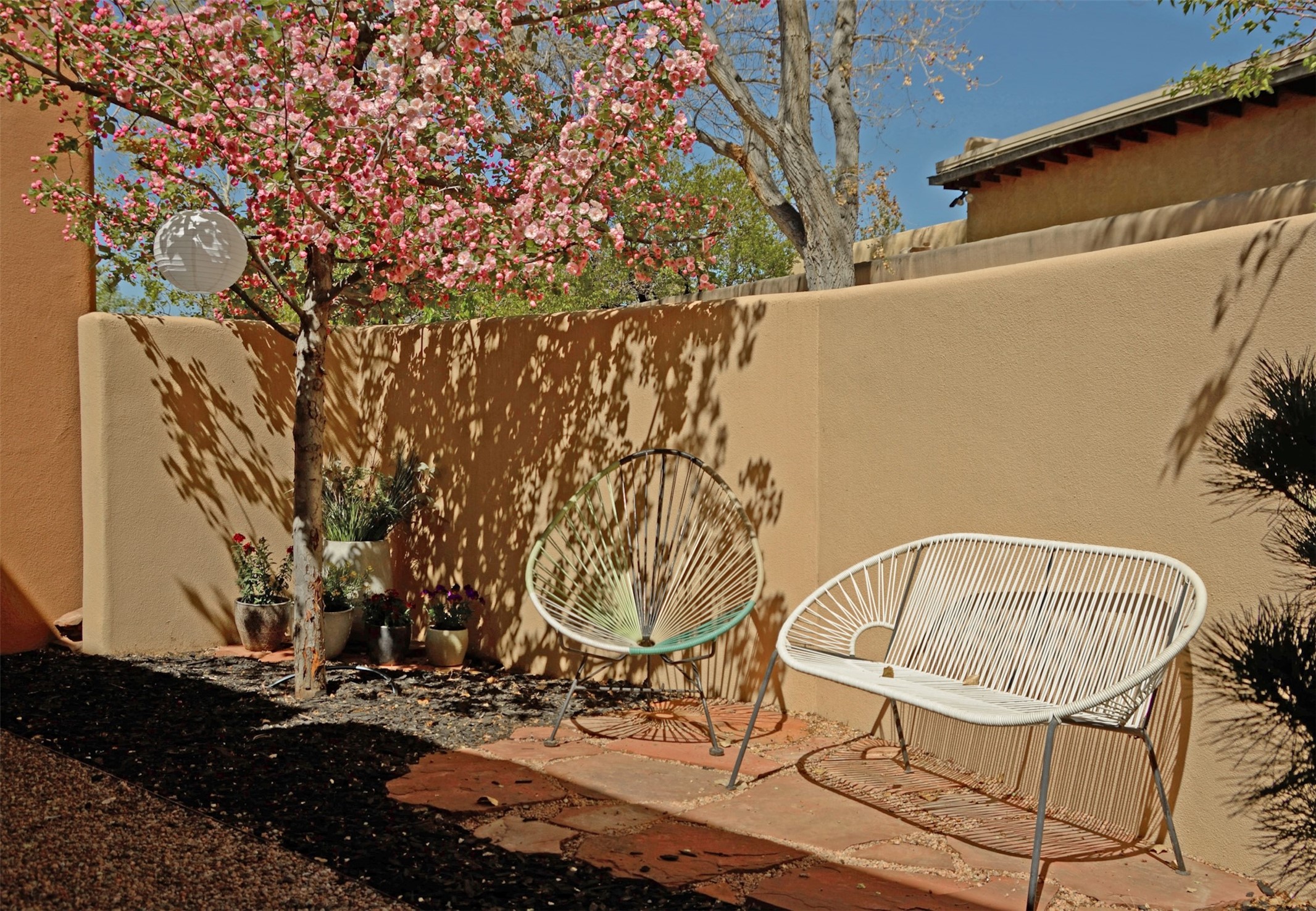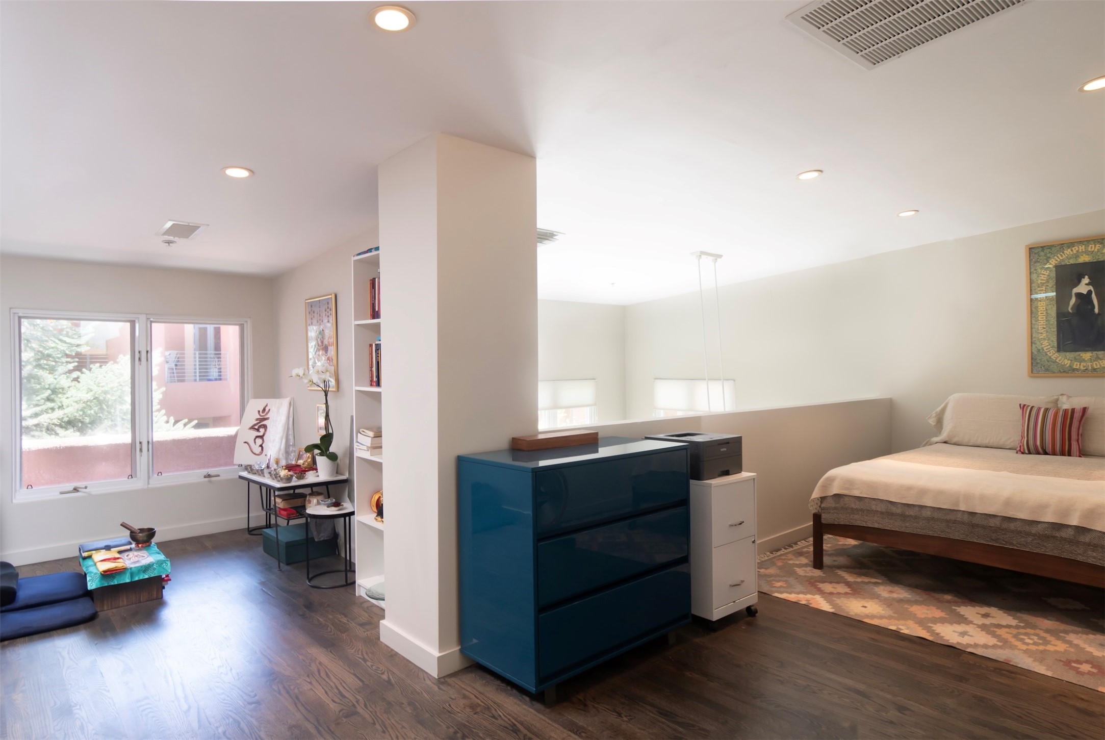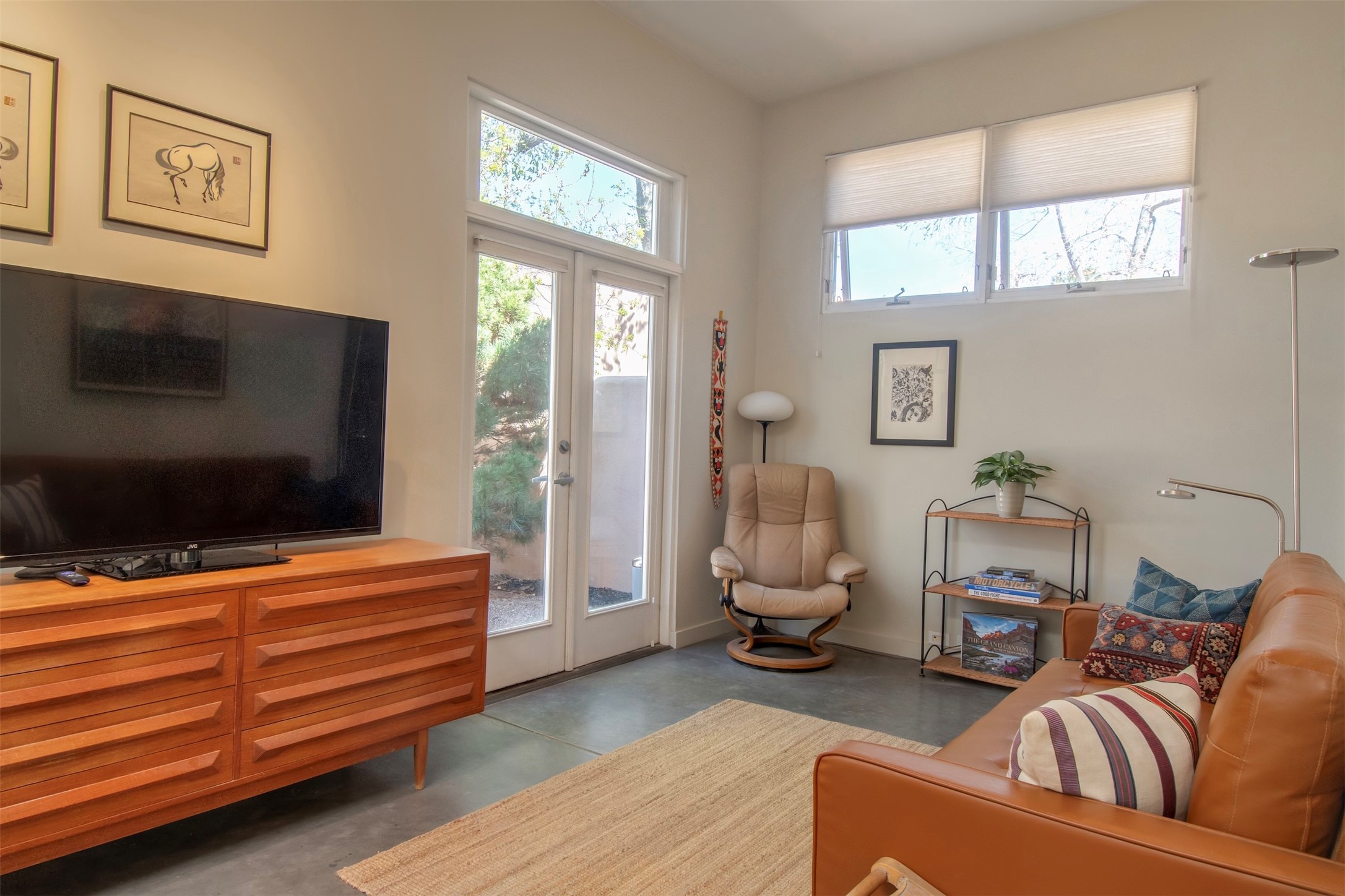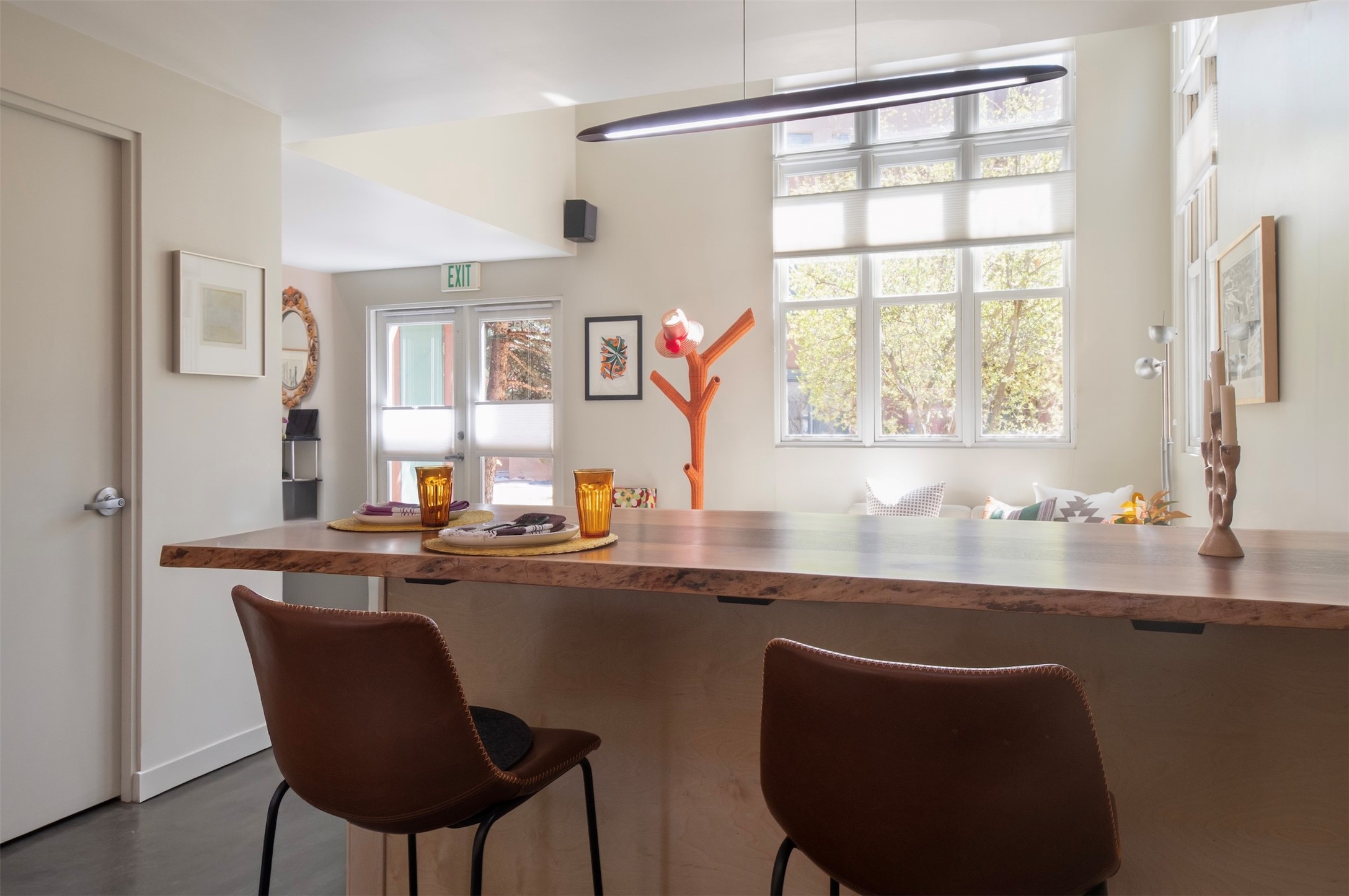 Located within the landscaped interior of the Lofts at Marquez Place, this bright and thoughtfully designed condo offers a unique blend of privacy, flexibility, and convenience. With a ground-level entrance and no unit above, the space lives quietly and comfortably. A rare highlight is the private, walled courtyard, ideal for outdoor living, pets, or a separate entrance for live/work use. Inside, the layout is both functional and distinctive. The kitchen is arranged in two connected areas, with additional storage and prep space tucked away, while a custom live-edge cherry and sapele wood counter by Boxcar Woody anchors the main living area. Stairs lead to the lofted sleeping space, with built-in storage below. The primary bedroom is located on the main level, with direct access to the courtyard and an adjacent bath. Zoned C-2, with short-term rentals permitted pursuant to the condominium declaration, the property offers flexibility for residential, creative, or professional use. All of this is just minutes from the Railyard, downtown, restaurants, and shopping, making it a well-located option for those seeking both convenience and versatility in Santa Fe.